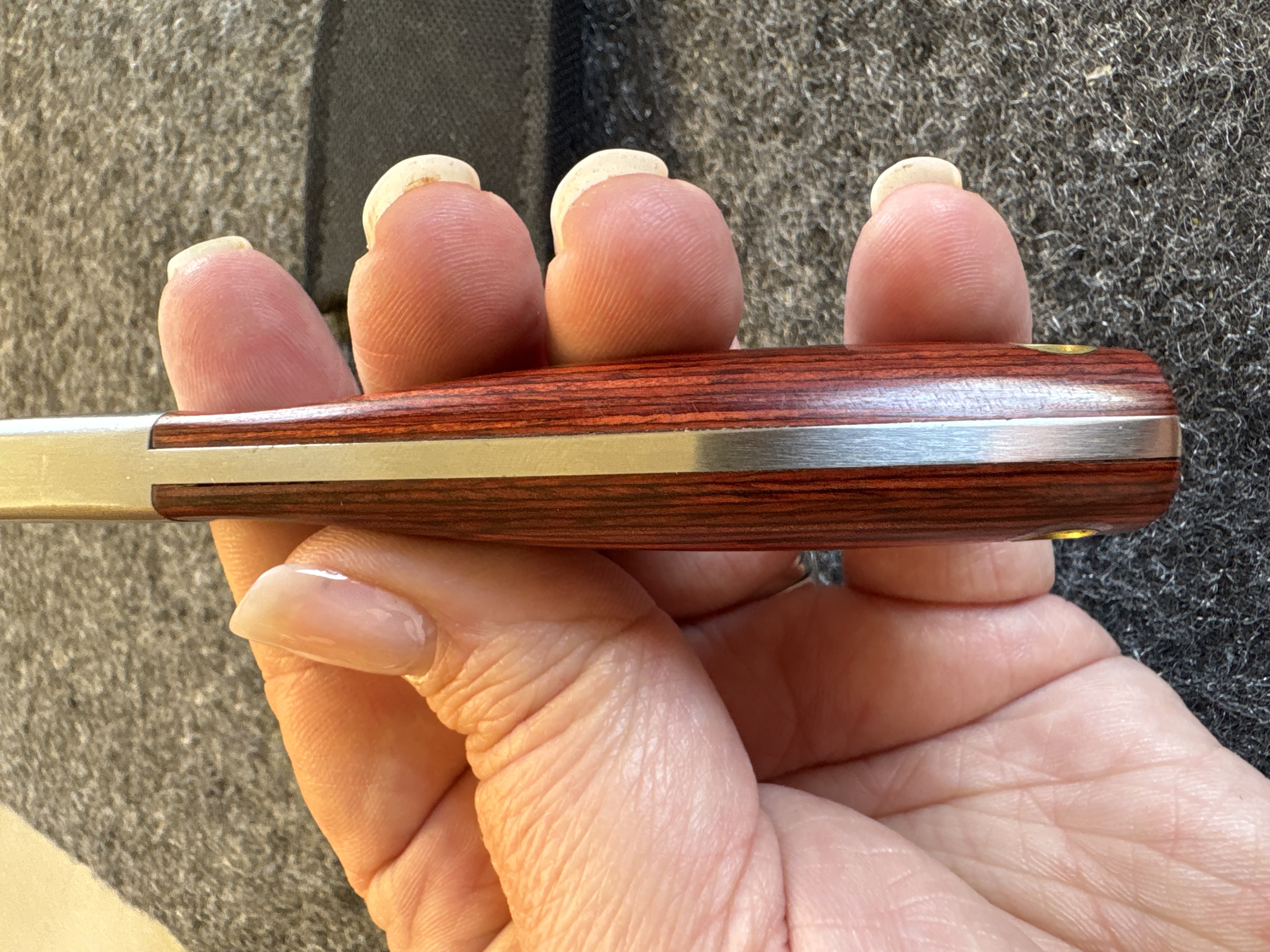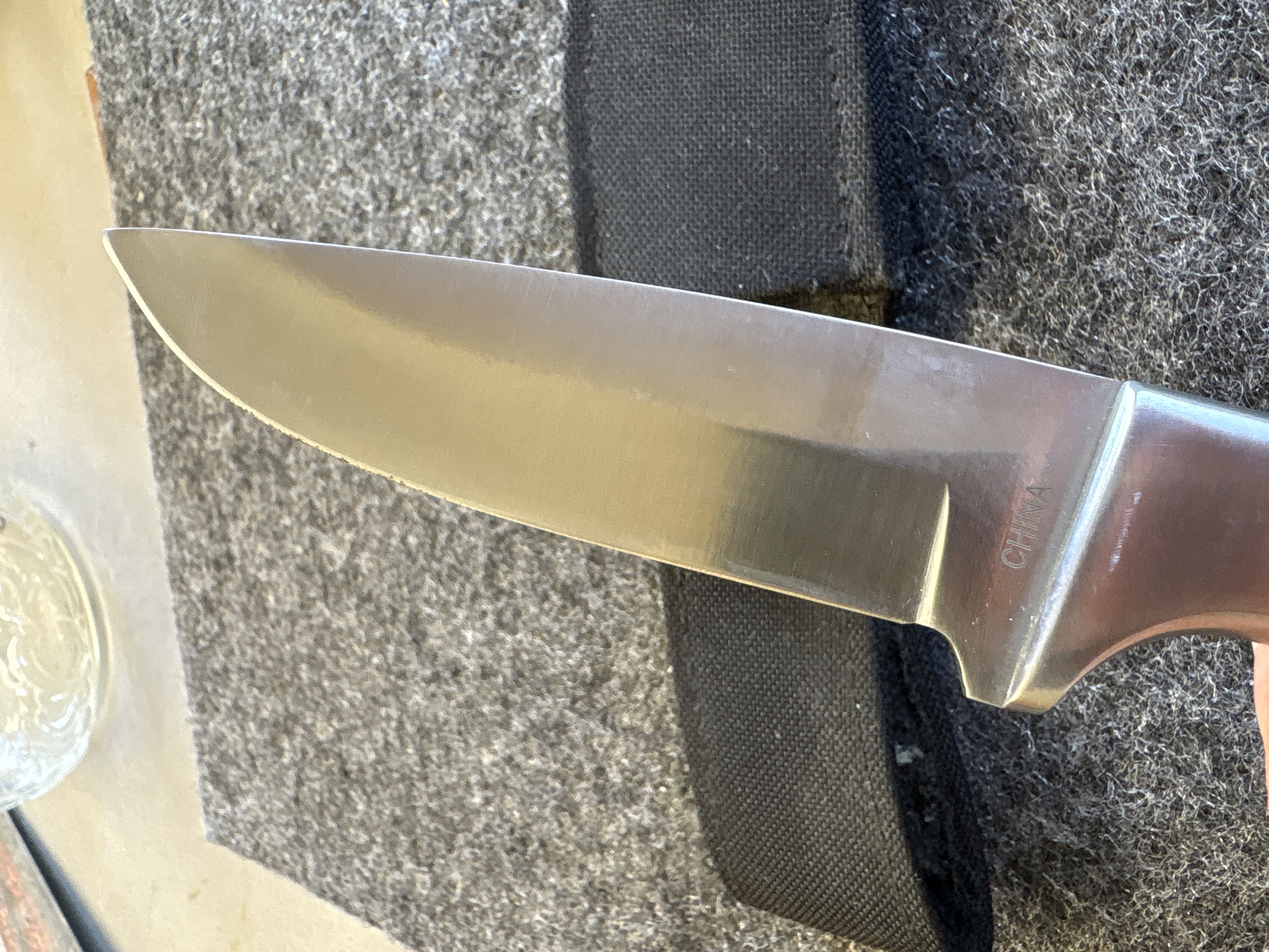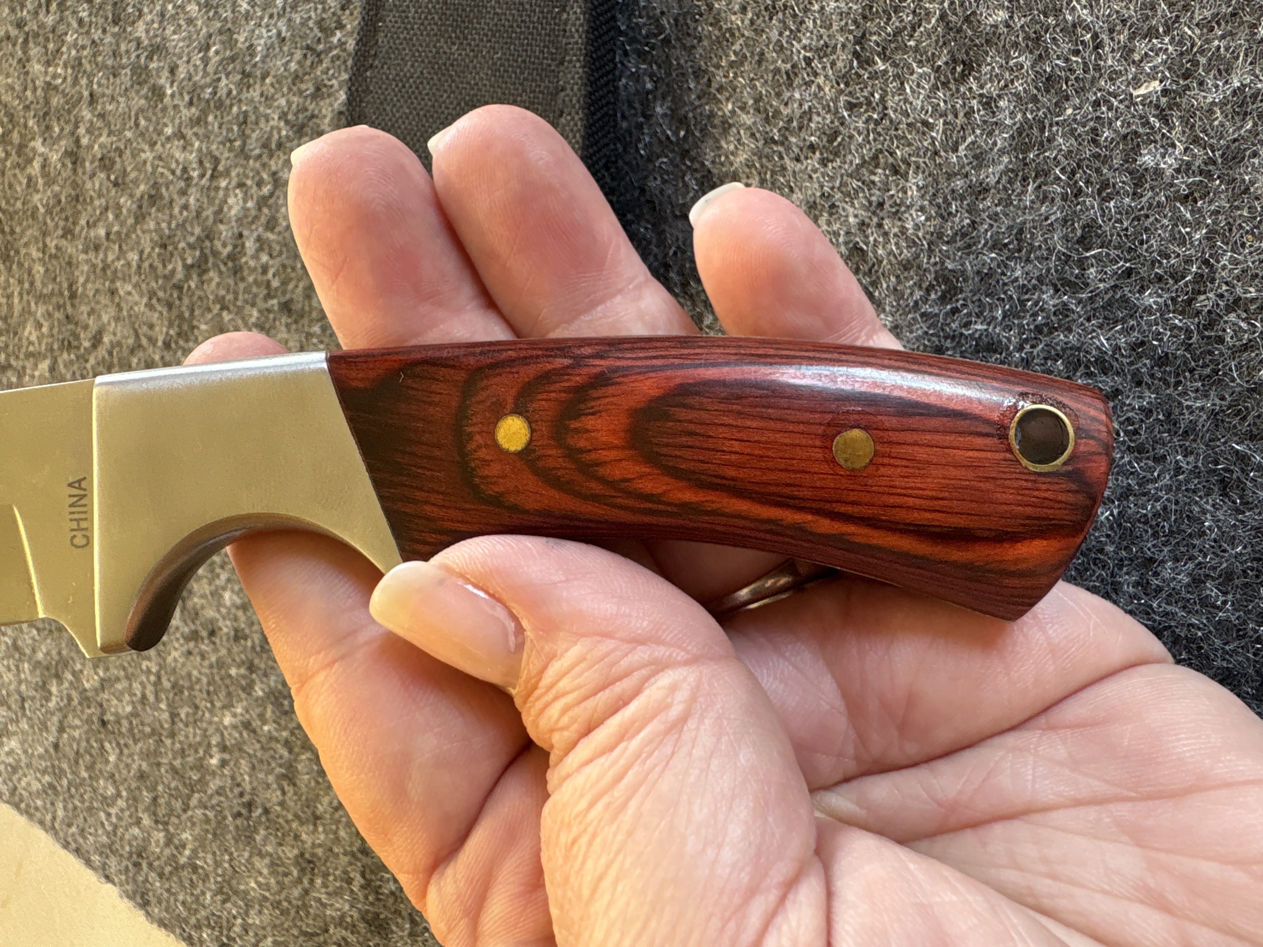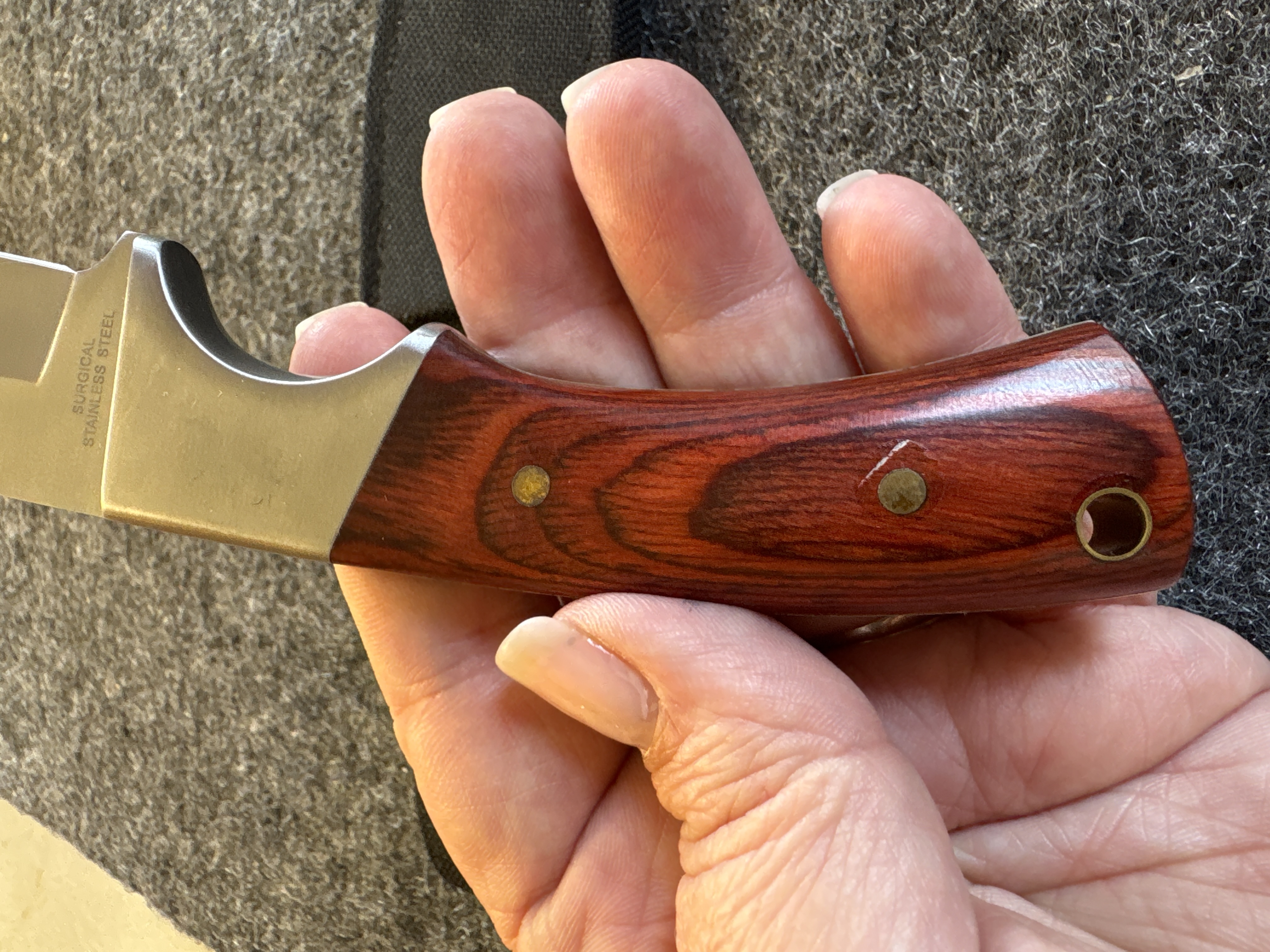 A Winchester G41340 Hunter fixed blade utility knife featuring full tang construction. The drop point blade is crafted from surgical stainless steel with a satin finish and a hollow grind. The blade design includes a deep finger choil for increased control. The face of the blade is etched with the Winchester brand name and registered trademark symbol. The ricasso is stamped Surgical Stainless Steel on the primary side and China on the reverse. The handle consists of contoured brown wood-grain laminate scales, identified as Pakkawood, secured to the tang with two brass pins. A brass-lined lanyard hole is located at the pommel. The knife is accompanied by its original black ballistic nylon belt sheath with a snap-fastener retaining strap.