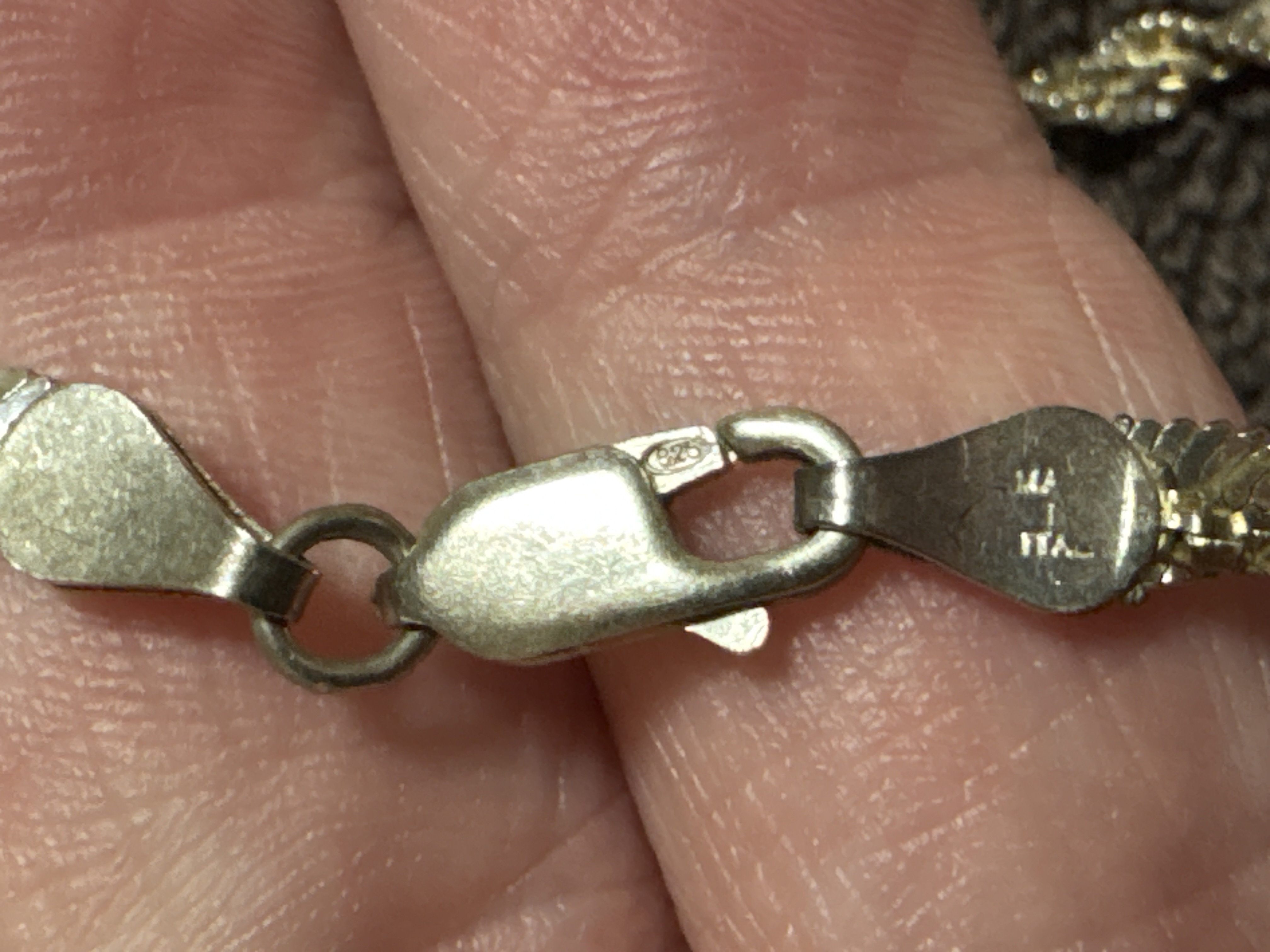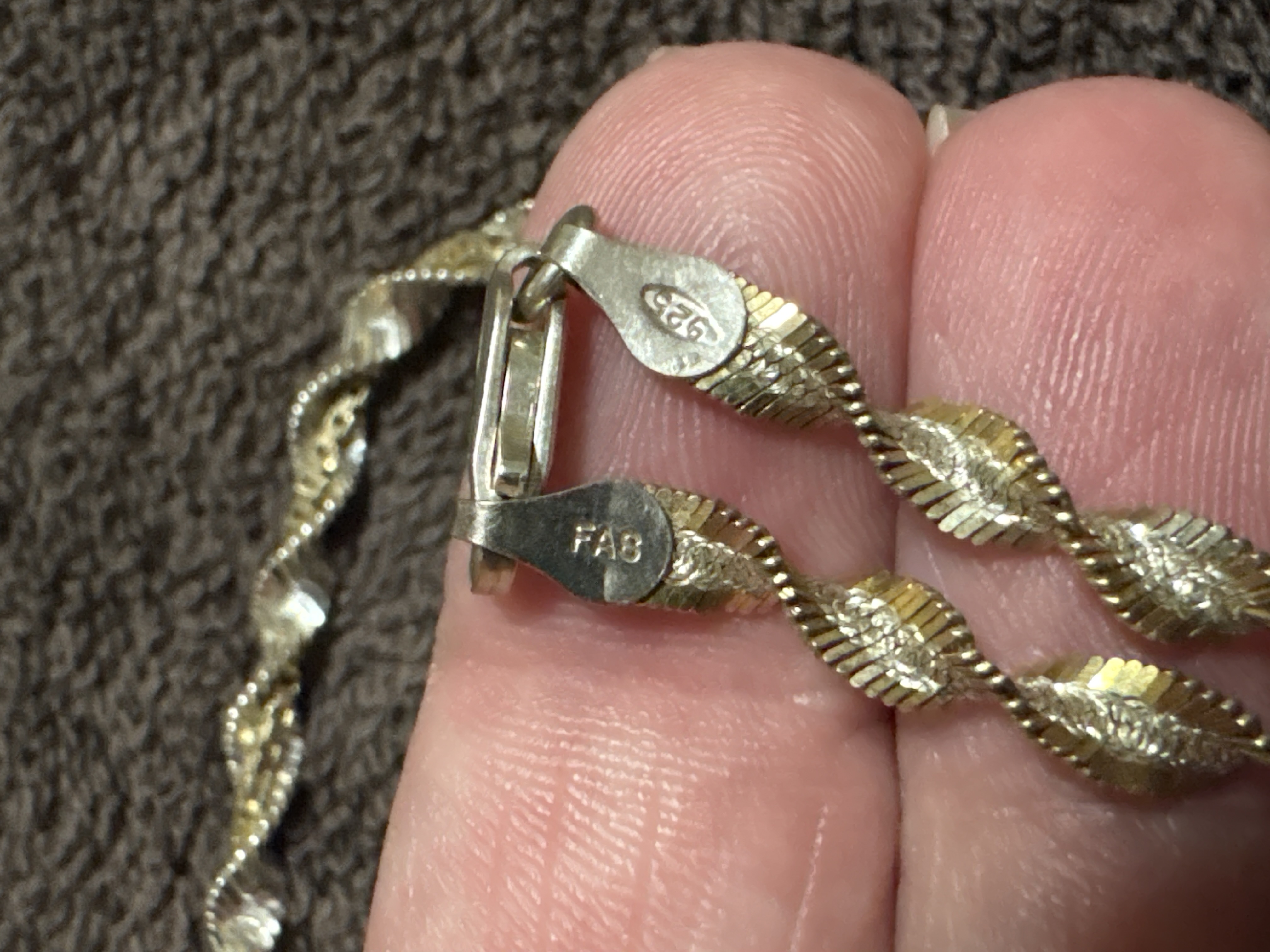 A jewelry collection comprising a matching necklace and bracelet, each crafted in sterling silver with a two-tone yellow and white metal finish. The items feature a twisted, flat ribbon-link construction with a textured, diamond-cut surface. The necklace is secured with a lobster claw clasp, with end caps stamped 925 and FAB. The bracelet is similarly secured with a lobster claw clasp; the clasp is stamped 925, and the end cap features the marks M A I I T A L, indicating Italian manufacture and sterling silver purity.