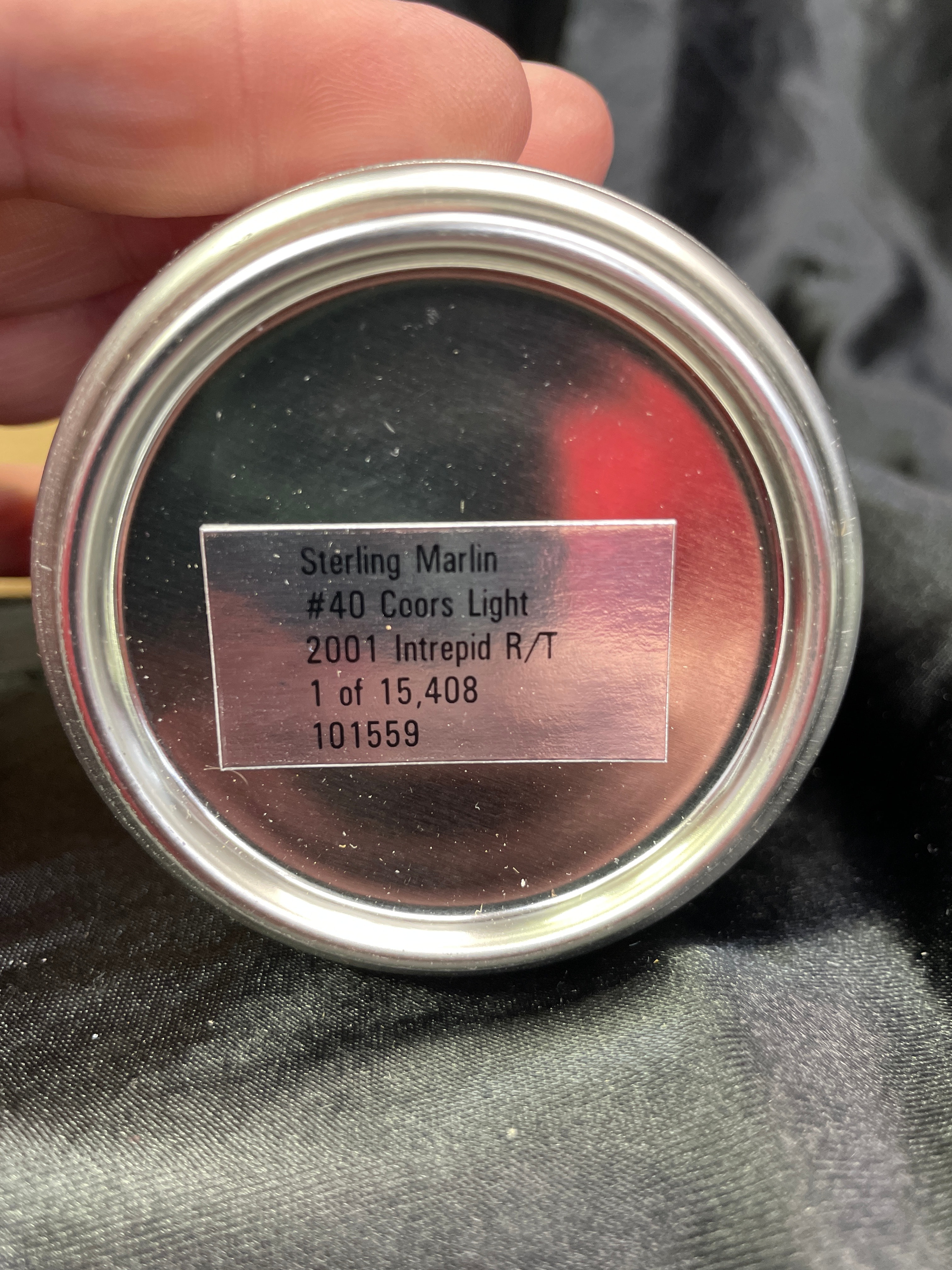 An Action Racing Collectables ‘EXACT SCALE REPLICA’ metal can, styled as a Coors Light beverage can, commemorating Sterling Marlin’s #40 Coors Light 2001 Intrepid R/T NASCAR vehicle. This adult collectible is part of a limited edition run, numbered 1 of 15,408, with serial number 101559. It features prominent ‘Coors Light’ and ‘NASCAR’ branding, acknowledging ‘2001 Chip Ganassi Racing’ and ‘Coors Brewing Company.’ The item is accompanied by its original cardboard box, which bears identical labeling.
