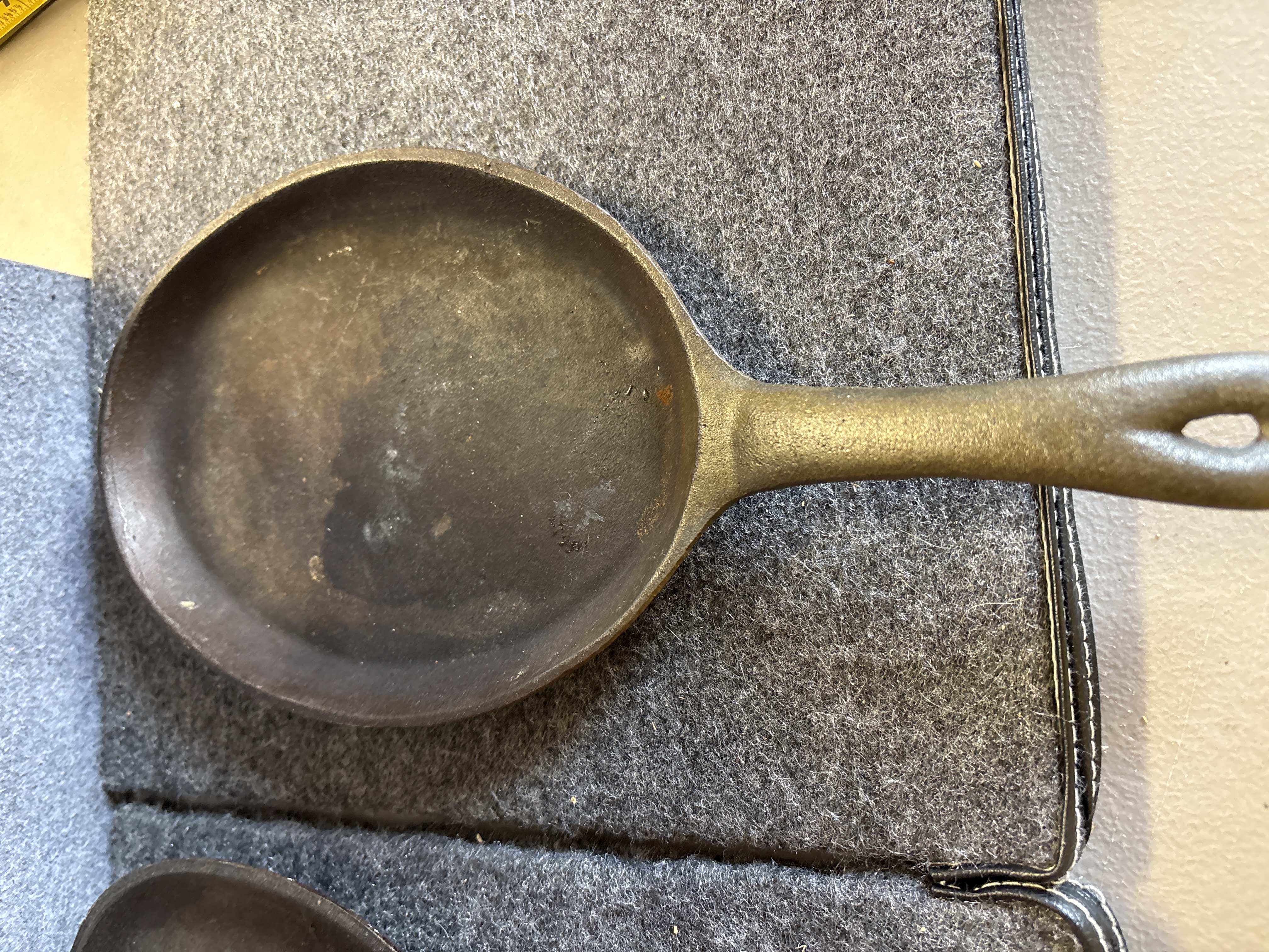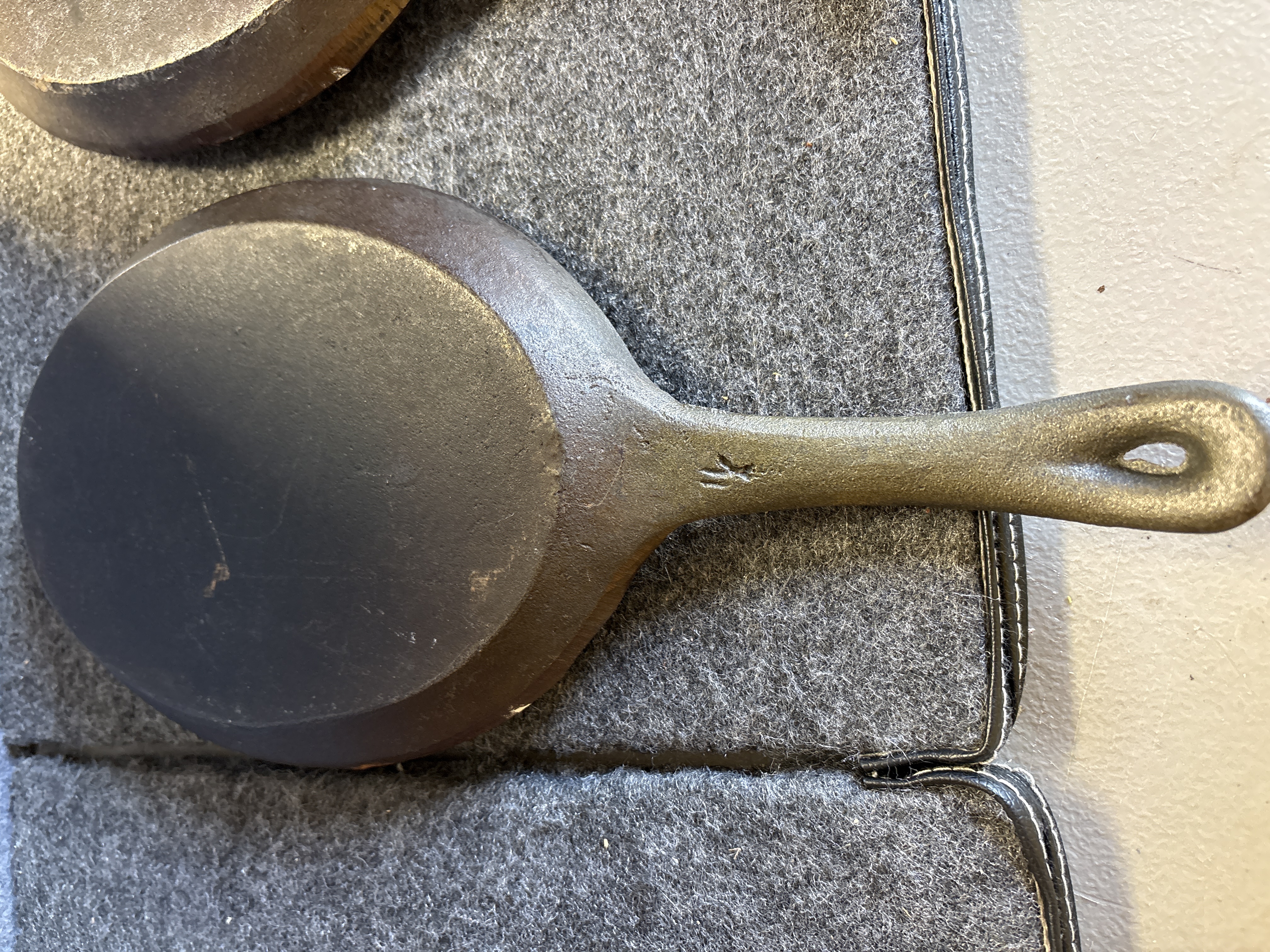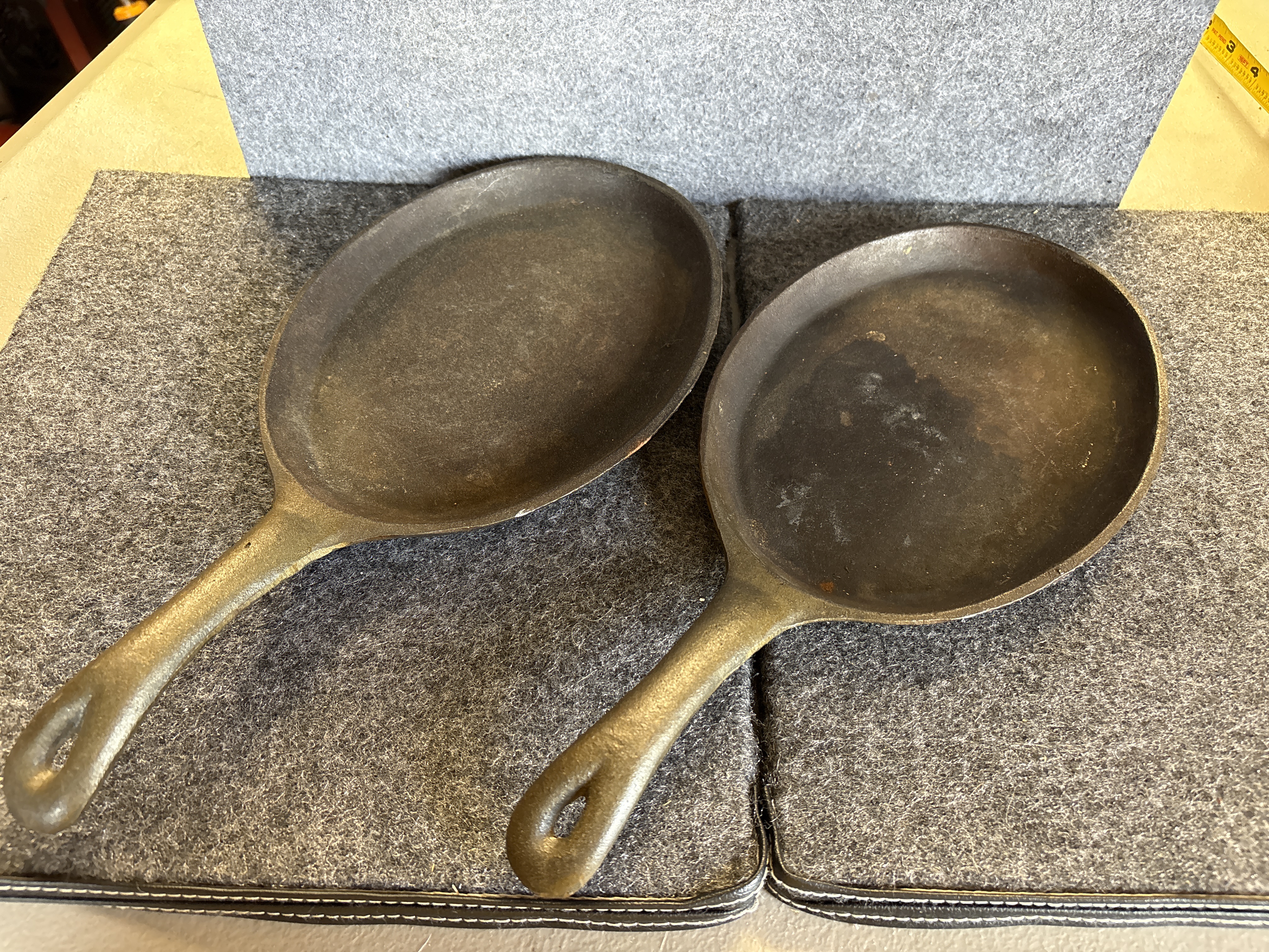 A pair of cast iron sizzling server pans of traditional oval form. Each pan is constructed with a shallow primary cooking surface and an integrated short handle featuring a teardrop-shaped hanging hole. The underside of the handles displays an embossed mark consisting of two vertical lines. These items are designed for high-heat culinary applications and tabletop service.