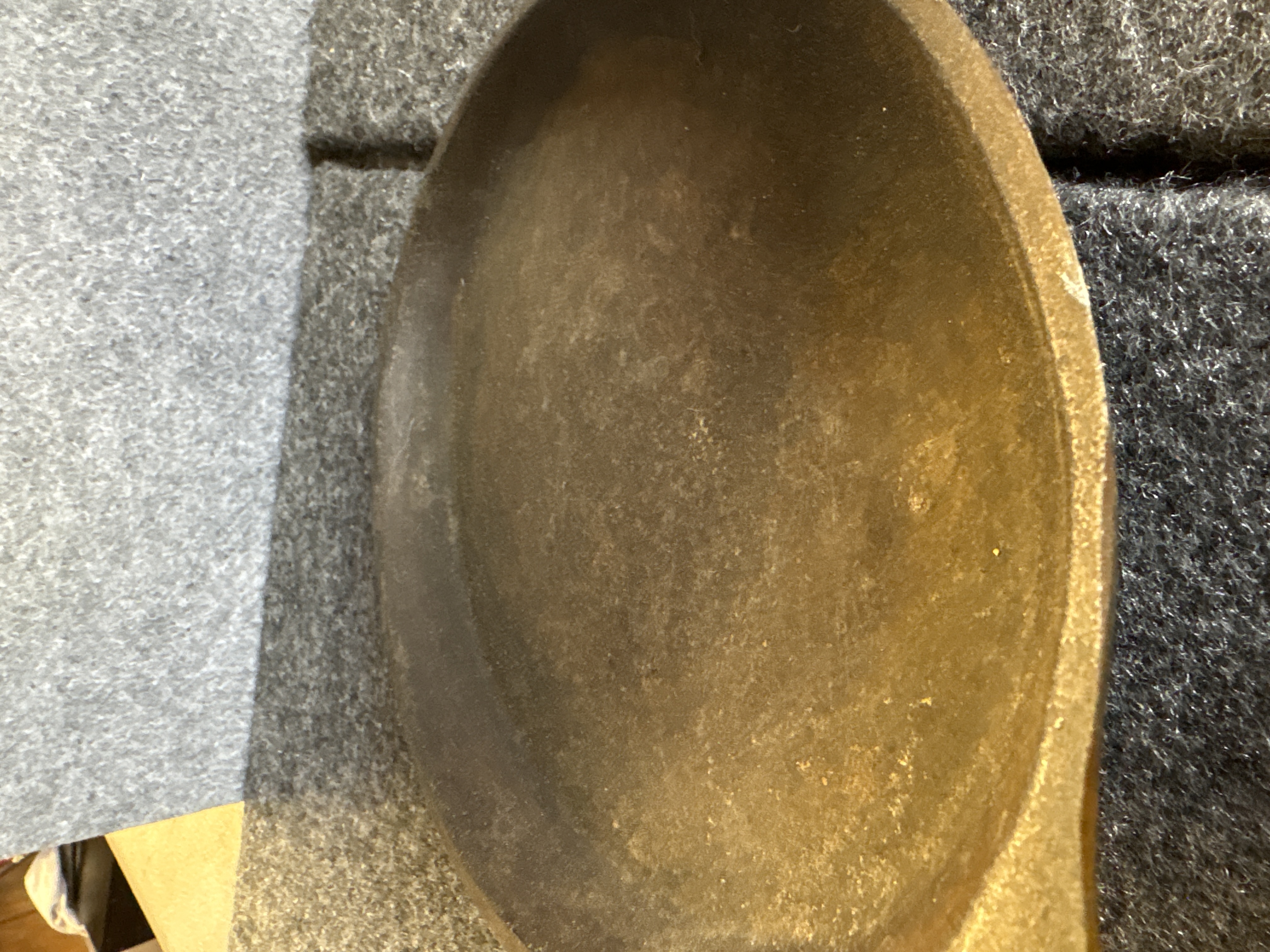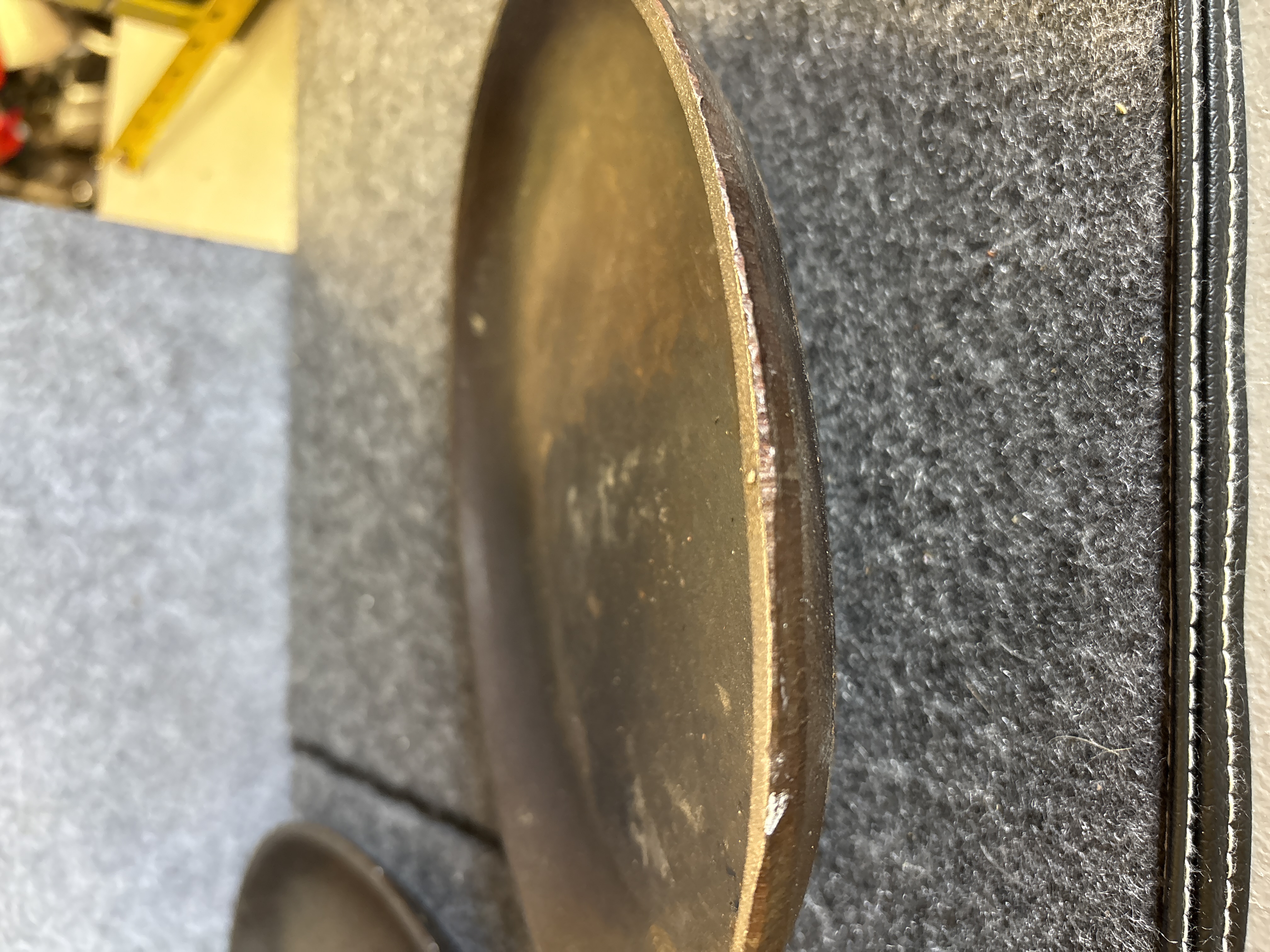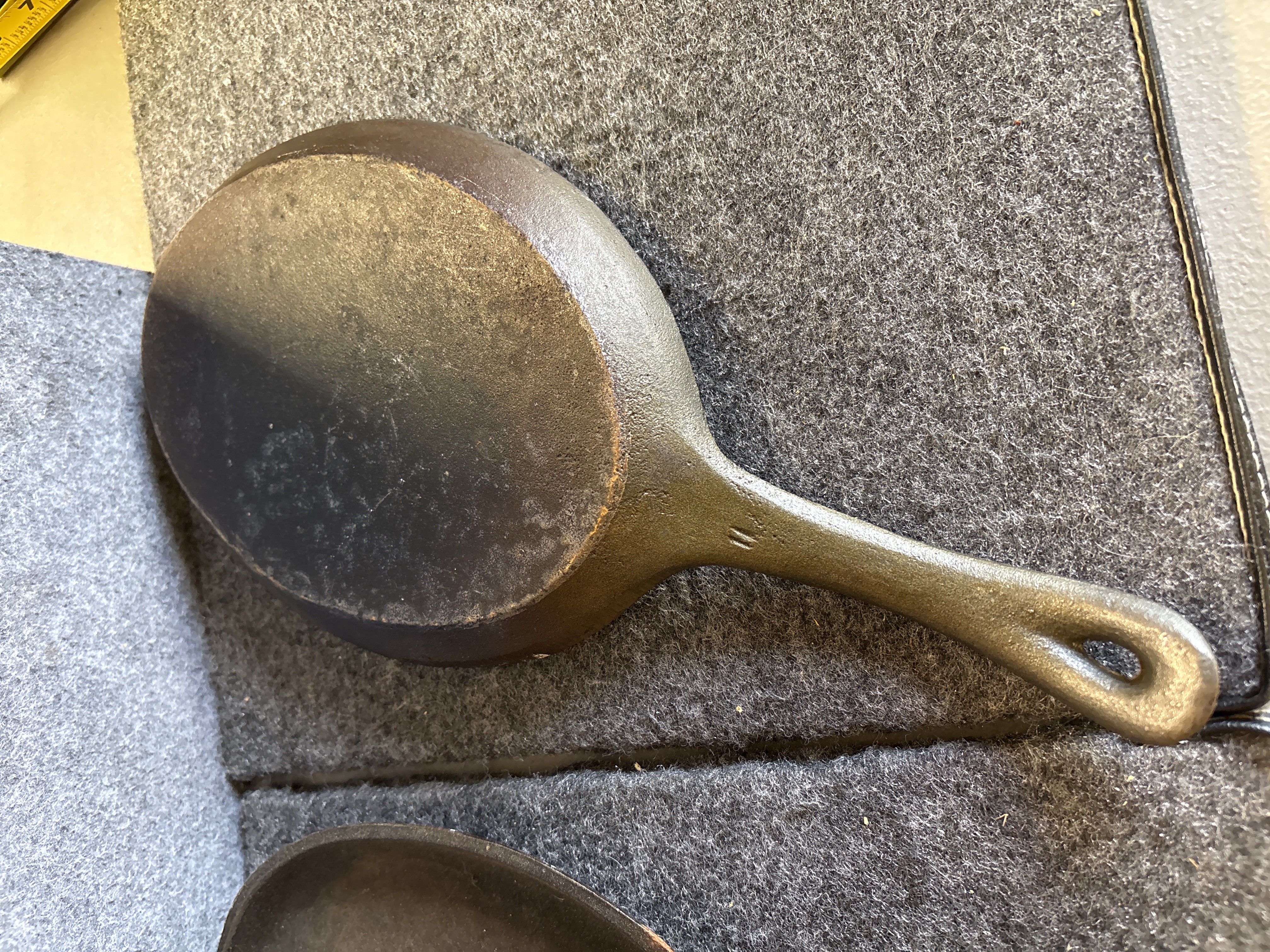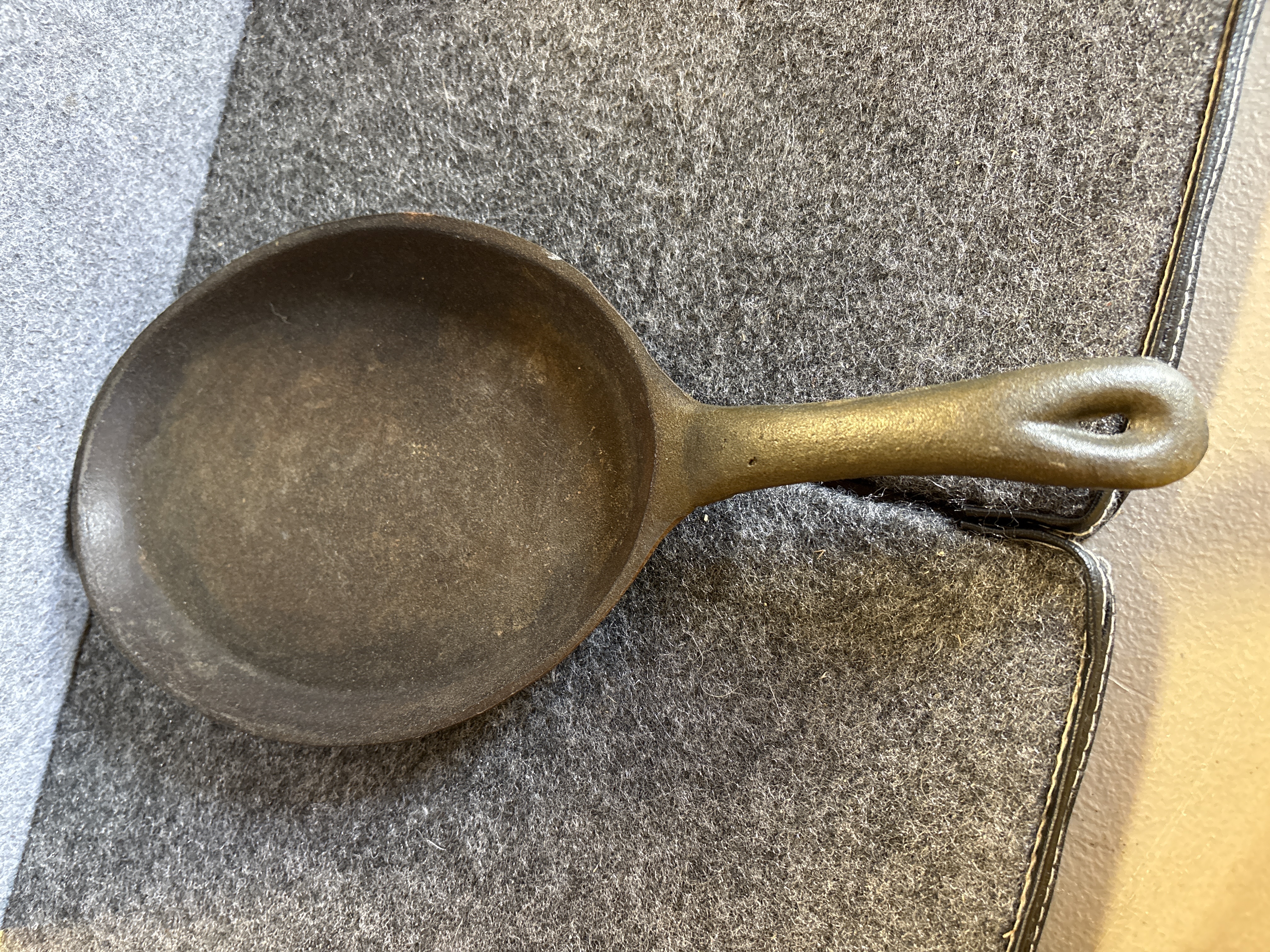 A pair of cast iron sizzling server pans of traditional oval form. Each pan is constructed with a shallow primary cooking surface and an integrated short handle featuring a teardrop-shaped hanging hole. The underside of the handles displays an embossed mark consisting of two vertical lines. These items are designed for high-heat culinary applications and tabletop service.