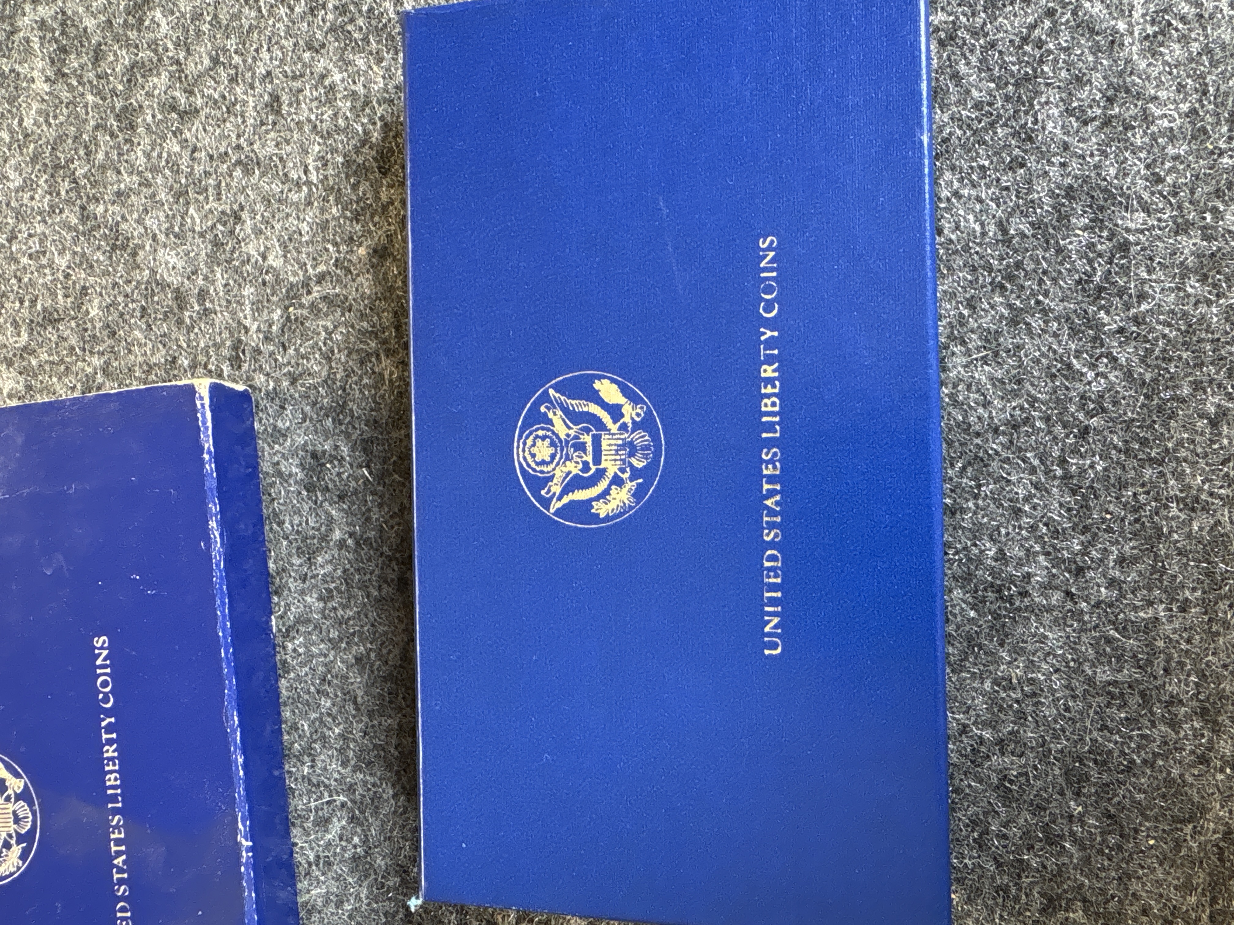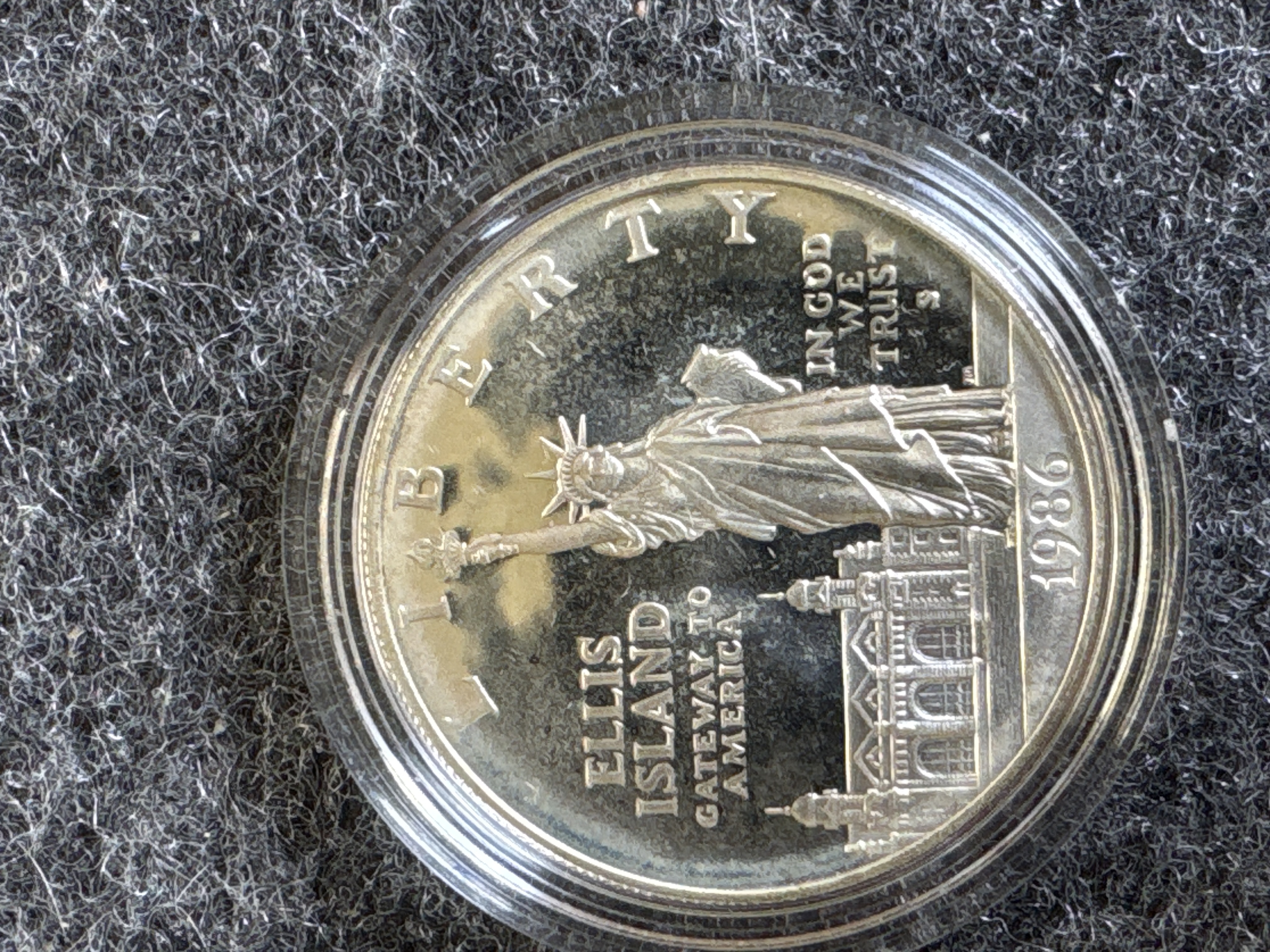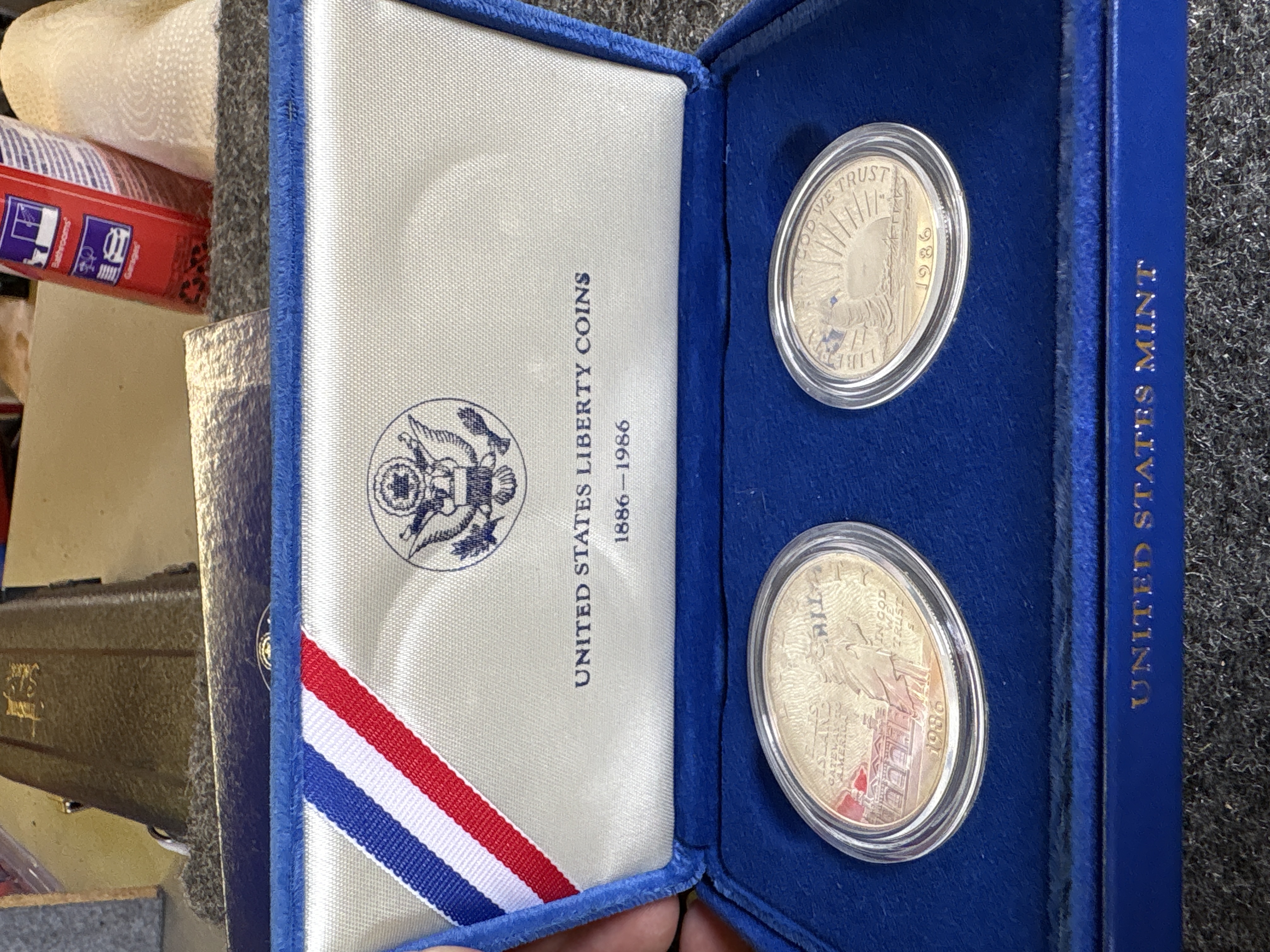 A pair of 1986 United States Liberty commemorative coins struck at the San Francisco Mint. The collection consists of one silver dollar90% and one clad half dollar. The silver dollar obverse features the Statue of Liberty with Ellis Island and the inscription Ellis Island Gateway to America, while the reverse depicts the torch with an excerpt from the Emma Lazarus poem. The half dollar obverse depicts the Statue of Liberty against a sunburst, and the reverse shows an immigrant family on a pier. Both coins exhibit the S mint mark and a proof finish. The items are housed in clear plastic capsules within a blue velvet-lined presentation case. The interior lid features the Great Seal of the United States on white silk with the text United States Liberty Coins 1886-1986. The exterior of the case features a gold-tone Great Seal. The set is accompanied by the original blue cardboard outer sleeve.
