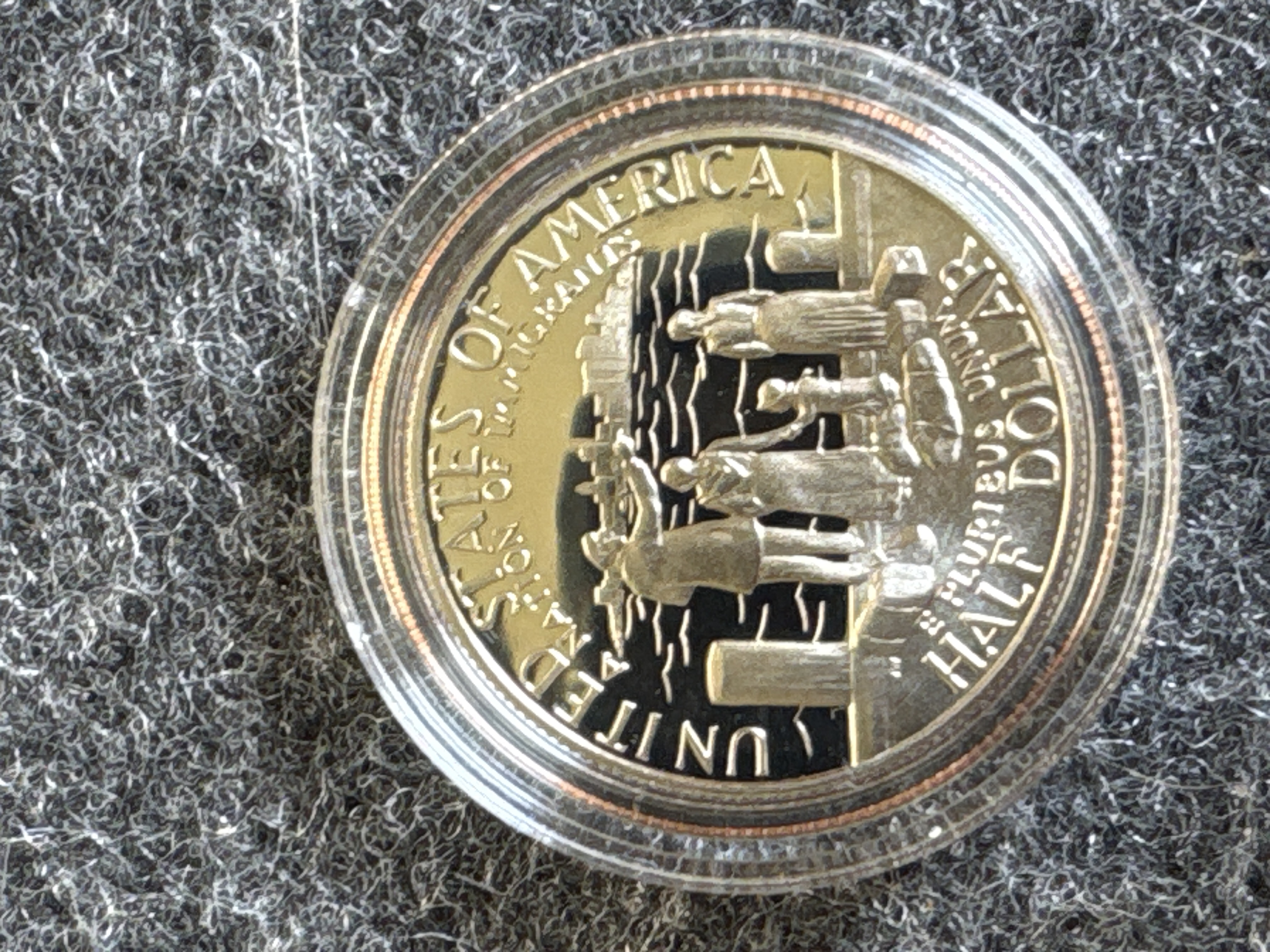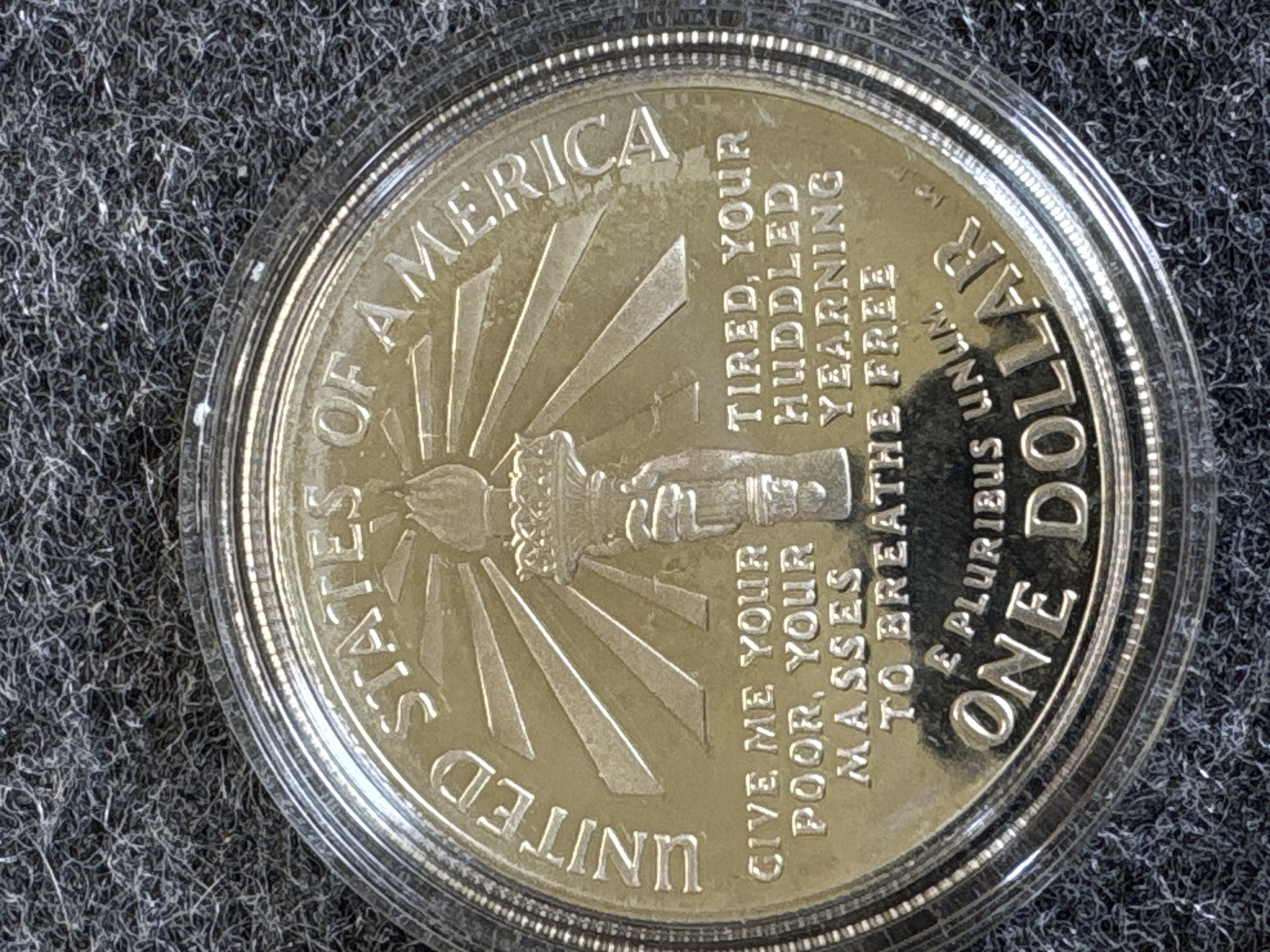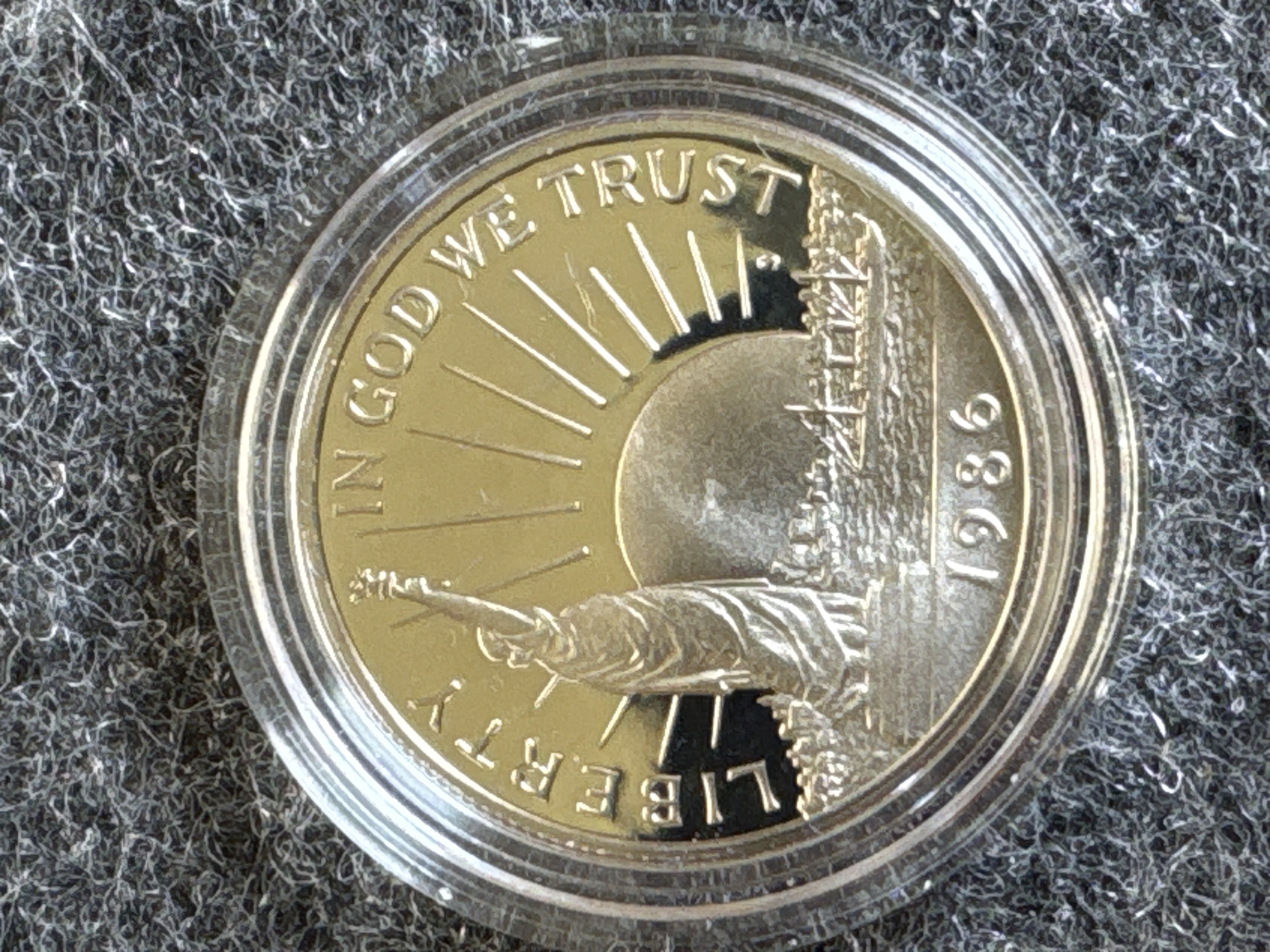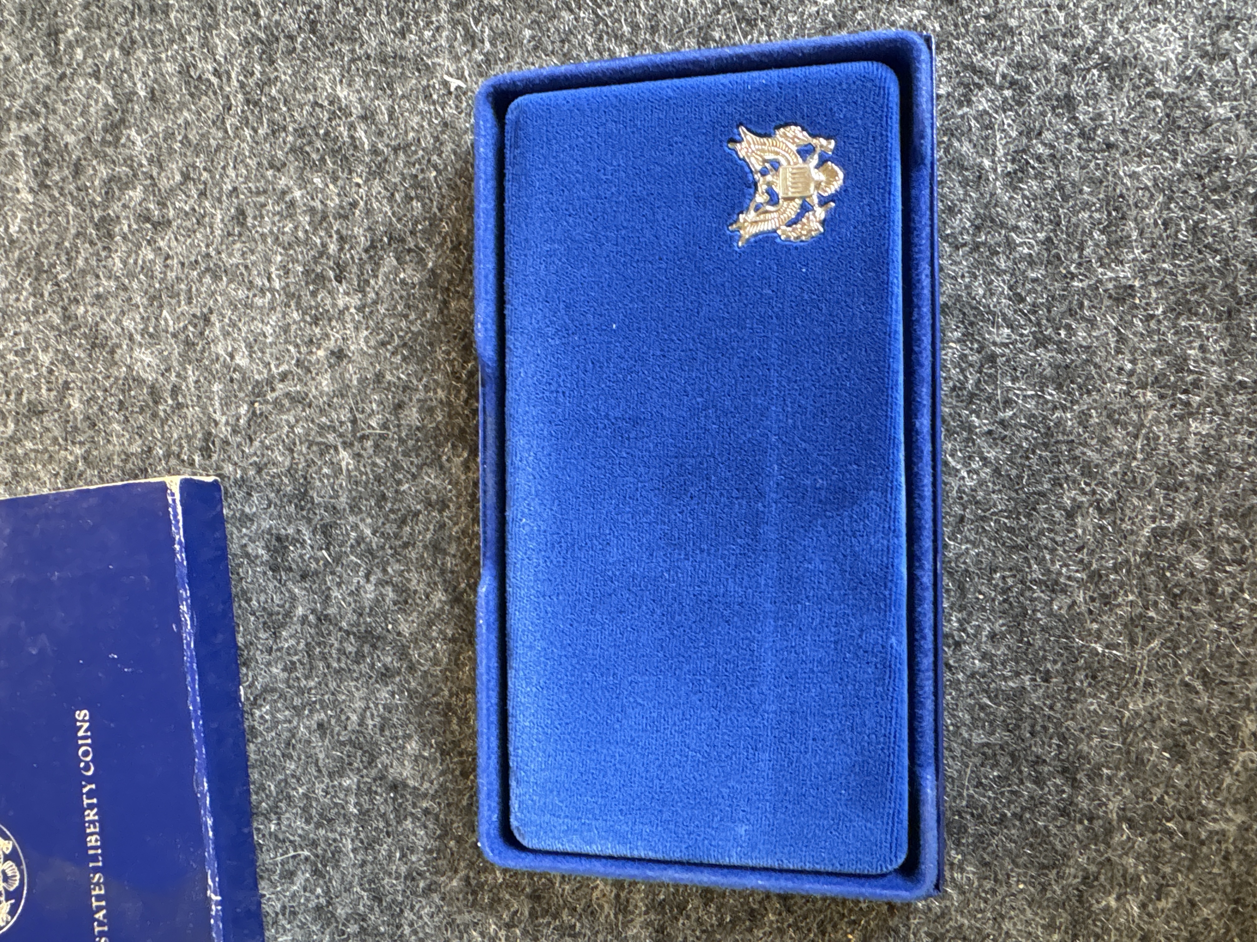 A pair of 1986 United States Liberty commemorative coins struck at the San Francisco Mint. The collection consists of one silver dollar90% and one clad half dollar. The silver dollar obverse features the Statue of Liberty with Ellis Island and the inscription Ellis Island Gateway to America, while the reverse depicts the torch with an excerpt from the Emma Lazarus poem. The half dollar obverse depicts the Statue of Liberty against a sunburst, and the reverse shows an immigrant family on a pier. Both coins exhibit the S mint mark and a proof finish. The items are housed in clear plastic capsules within a blue velvet-lined presentation case. The interior lid features the Great Seal of the United States on white silk with the text United States Liberty Coins 1886-1986. The exterior of the case features a gold-tone Great Seal. The set is accompanied by the original blue cardboard outer sleeve.