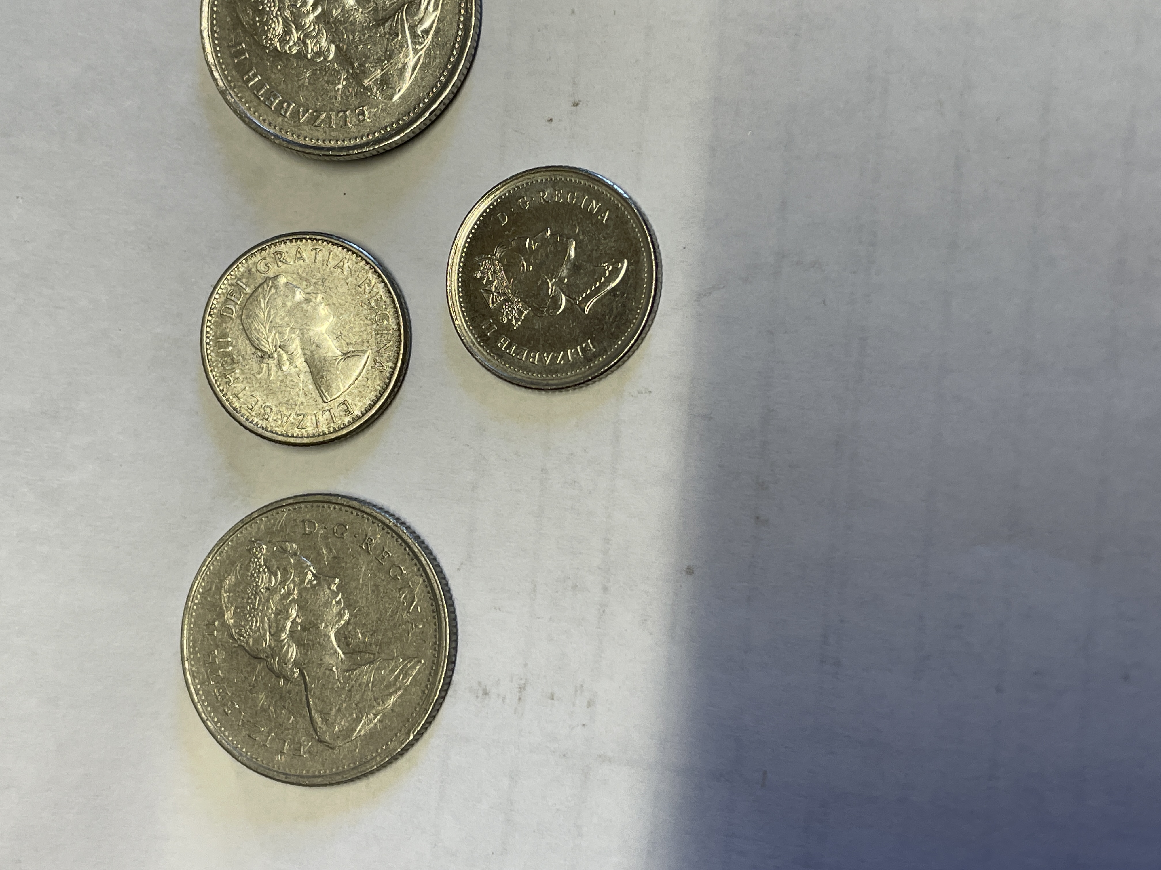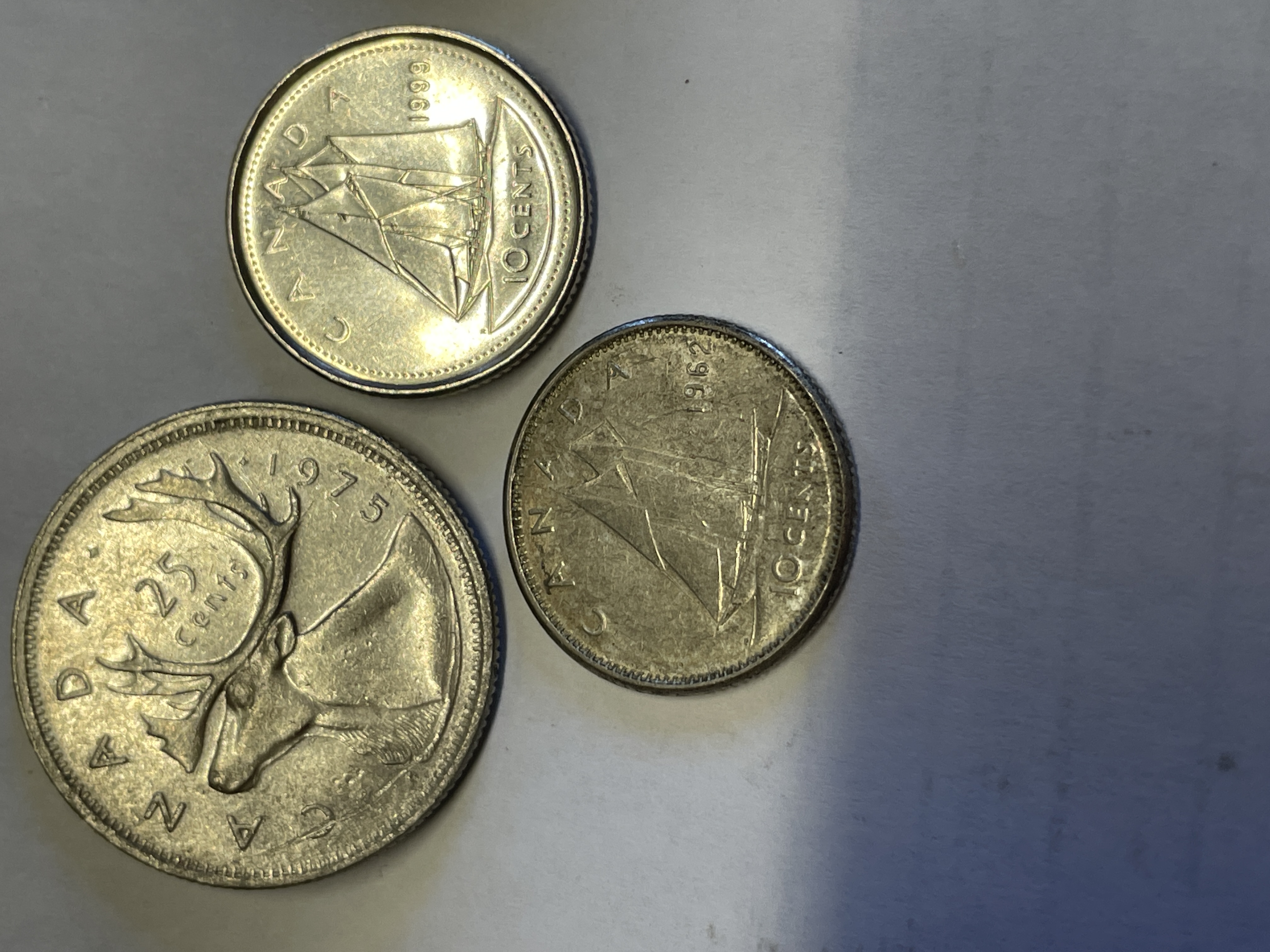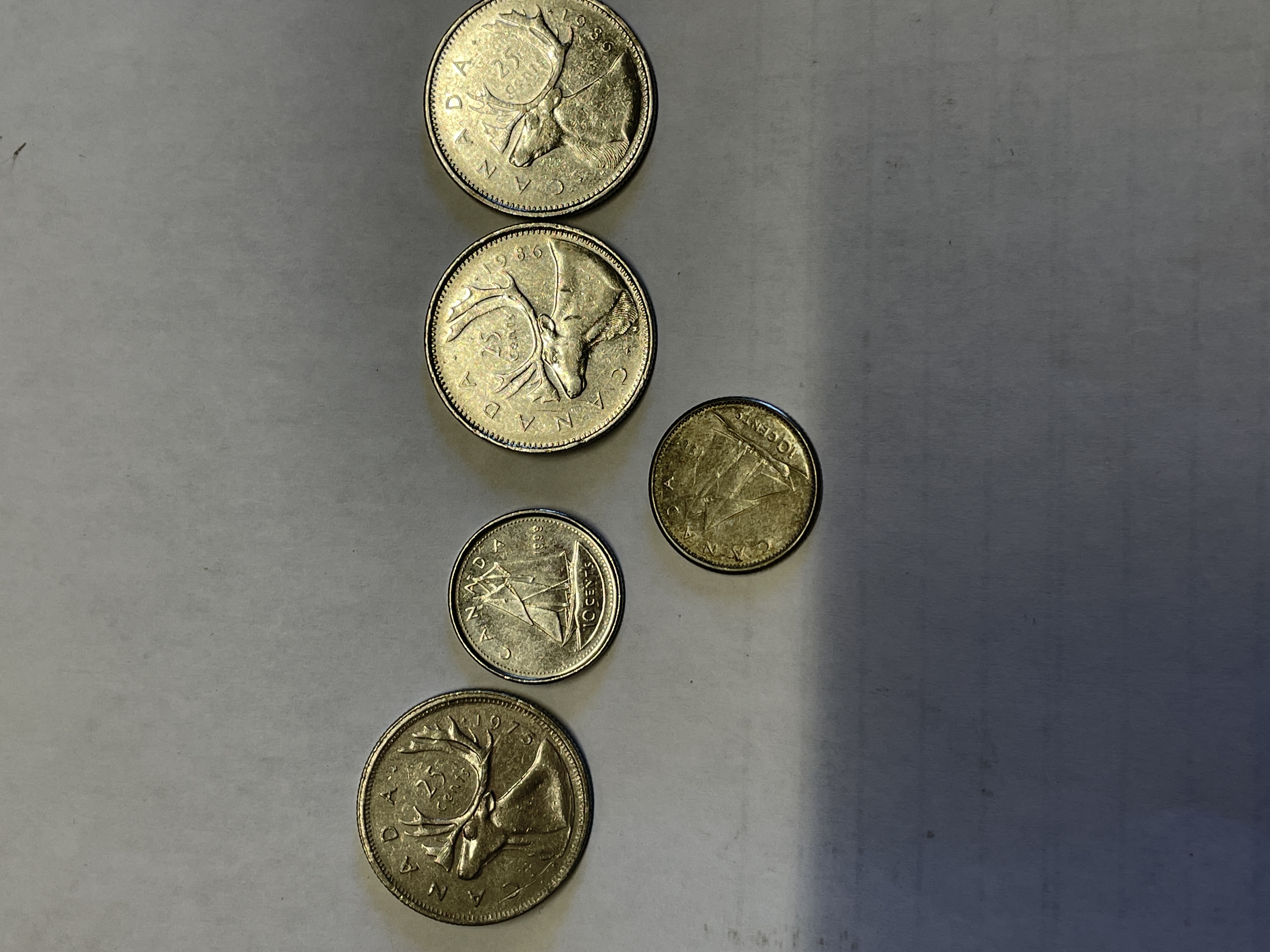 A collection of Canadian silver colored coins featuring Queen Elizabeth II on the obverse with caribou and sailboat reverse designs dated 1962, 1975, 1986, and 1999.
