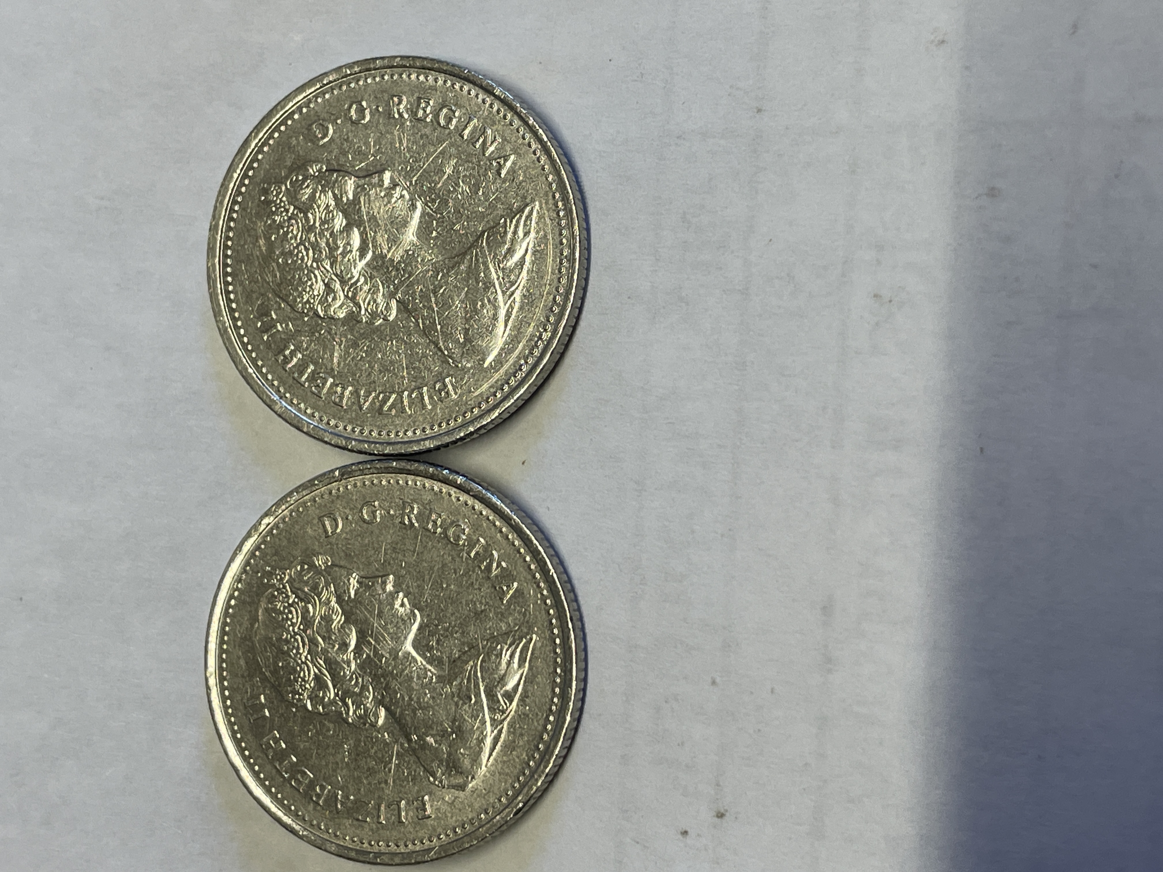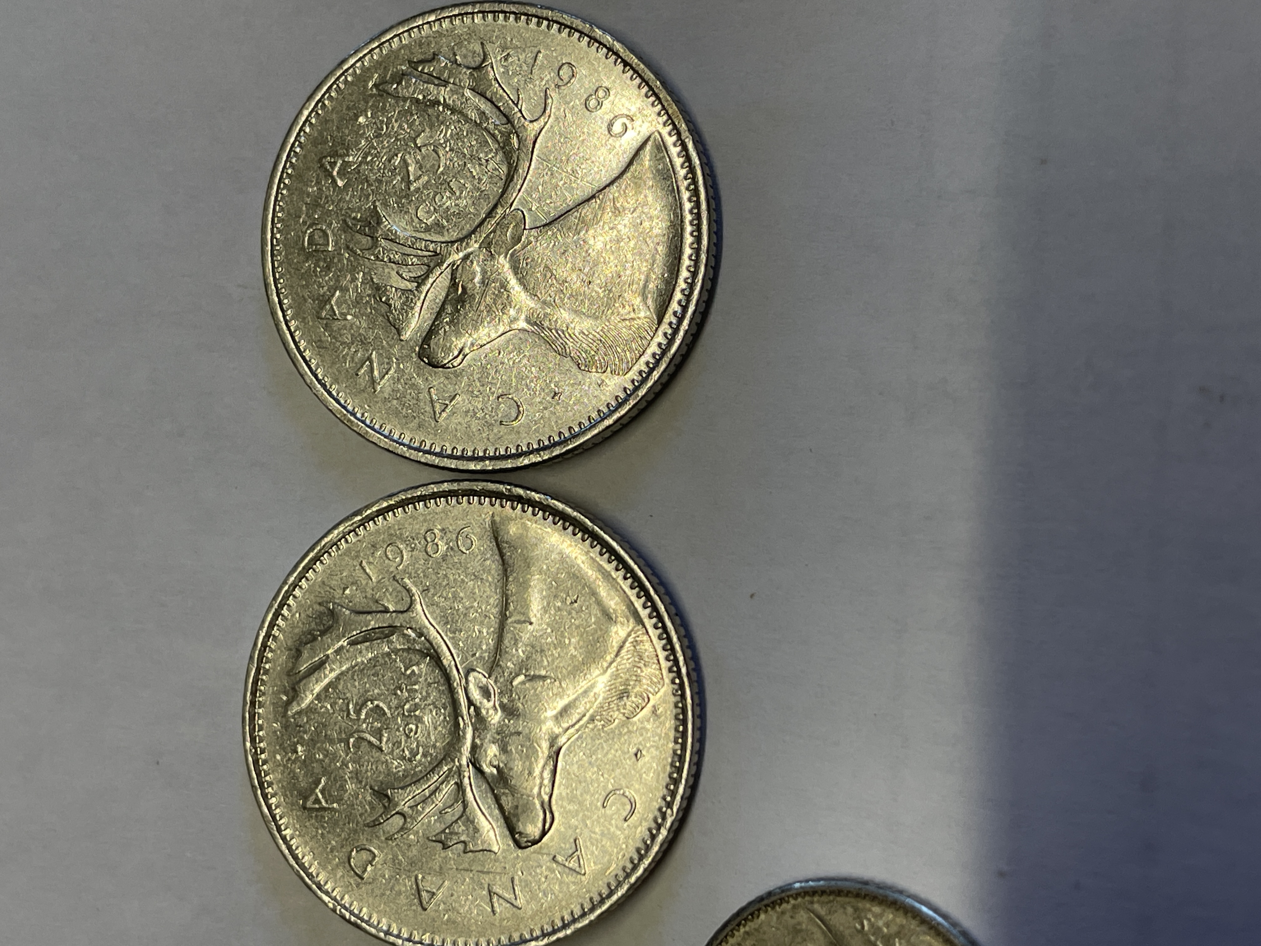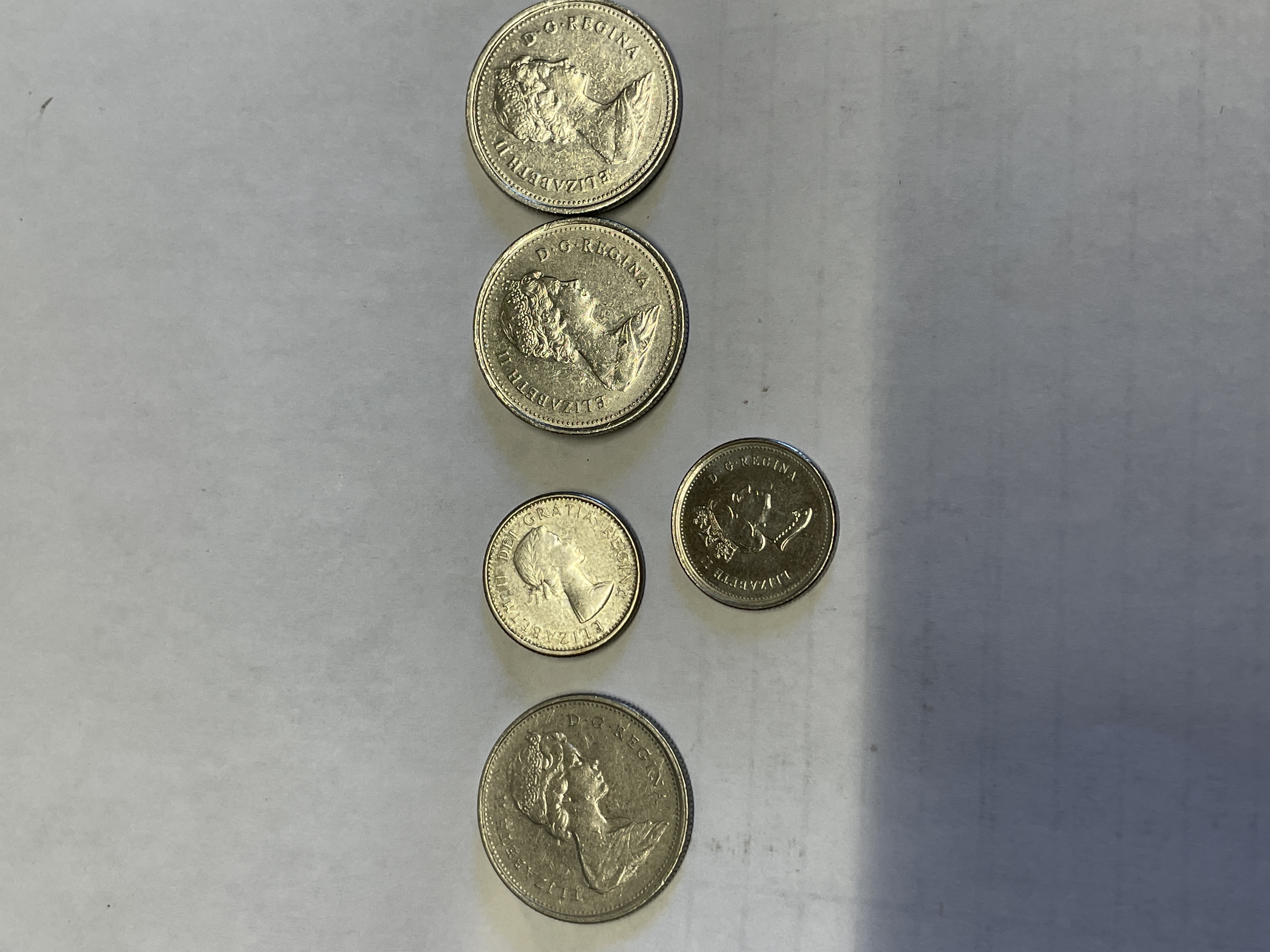 A collection of Canadian silver colored coins featuring Queen Elizabeth II on the obverse with caribou and sailboat reverse designs dated 1962, 1975, 1986, and 1999.