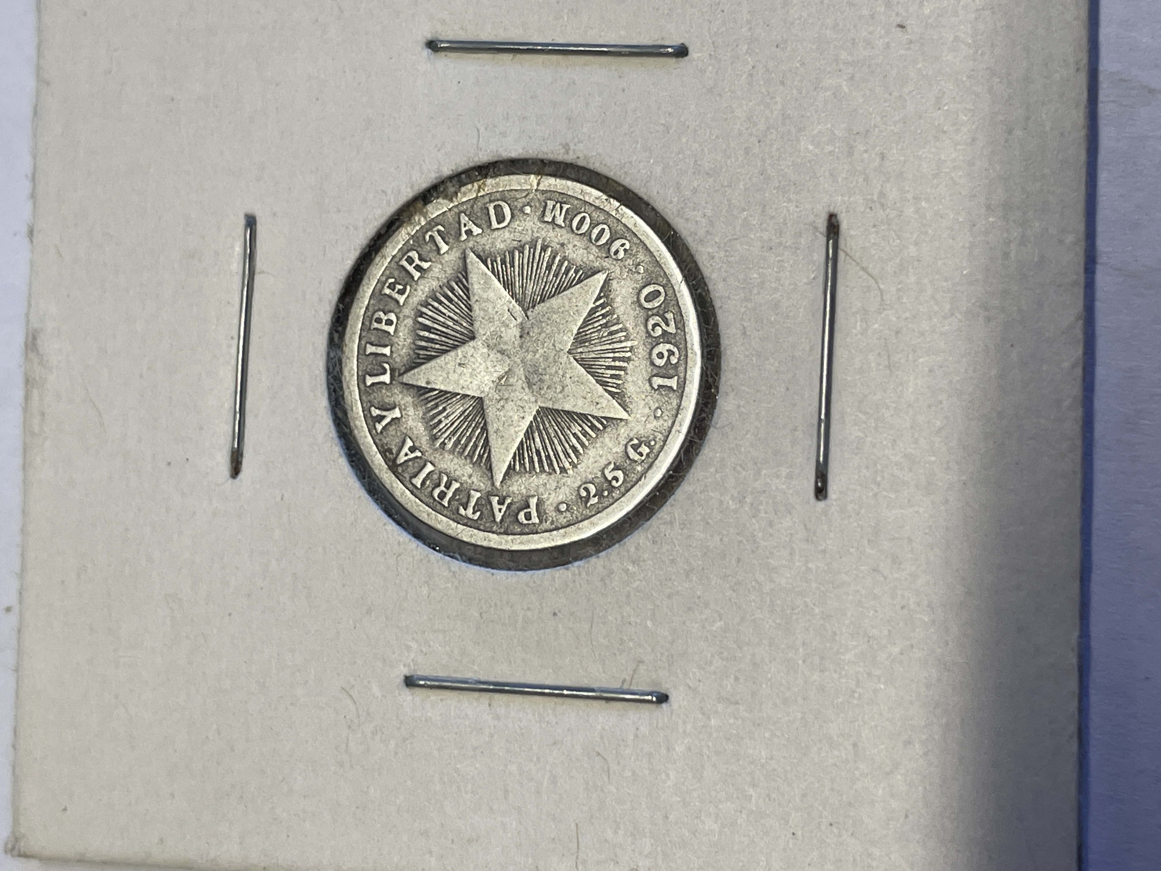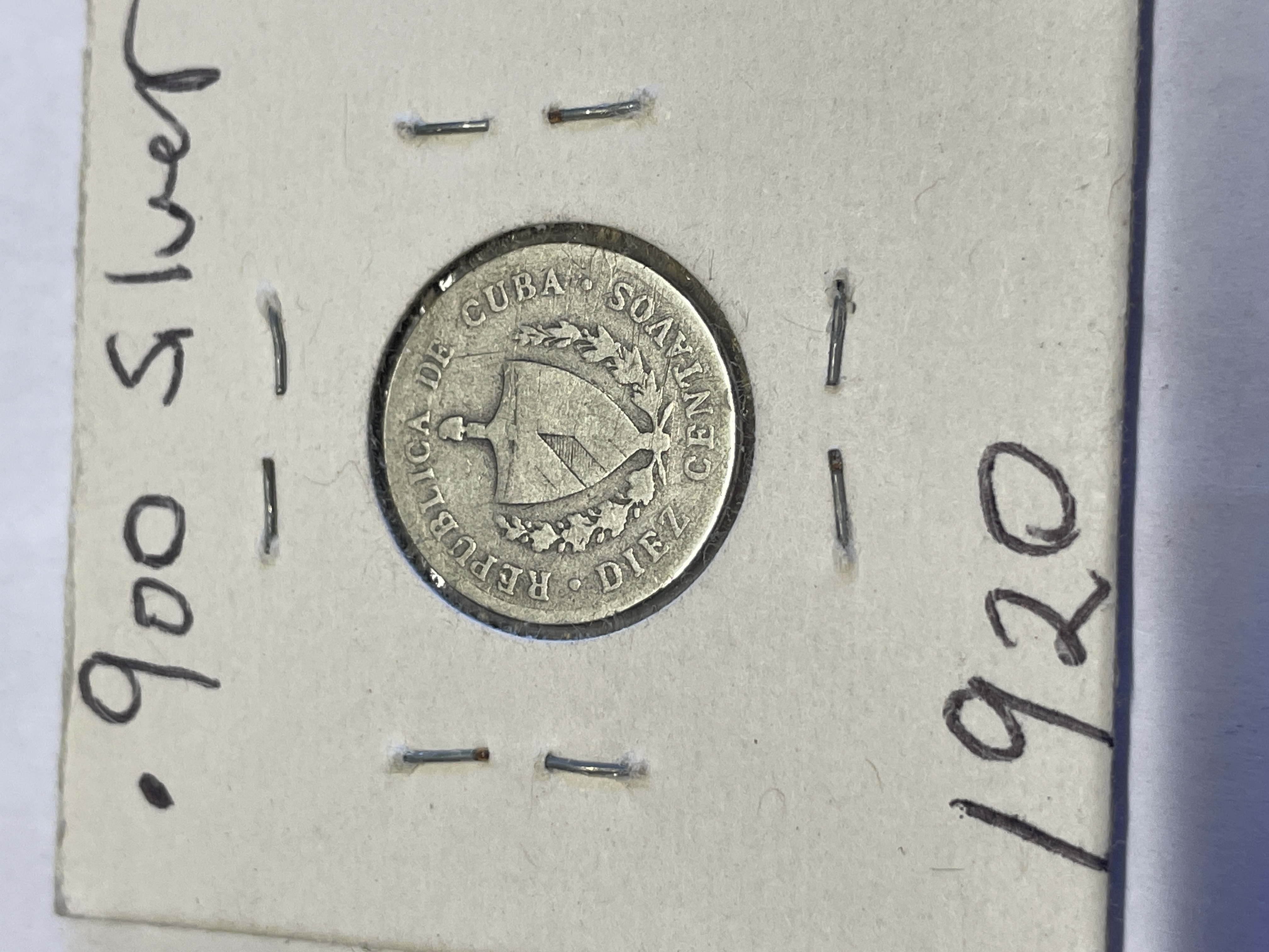 A 1920 Republic of Cuba ten centavos coin struck in .900 silver weighing 5 grams featuring the national coat of arms and a radiant star.