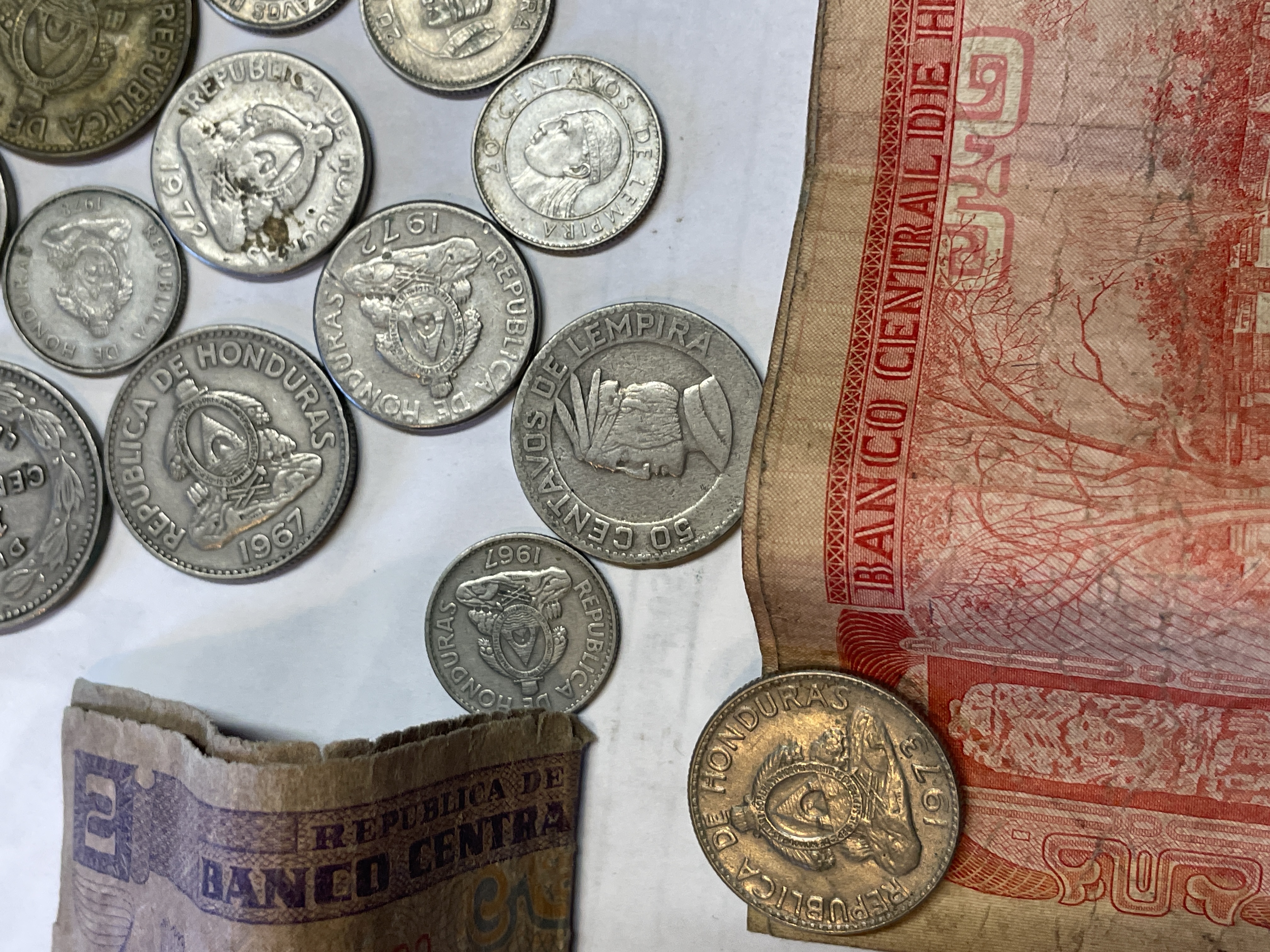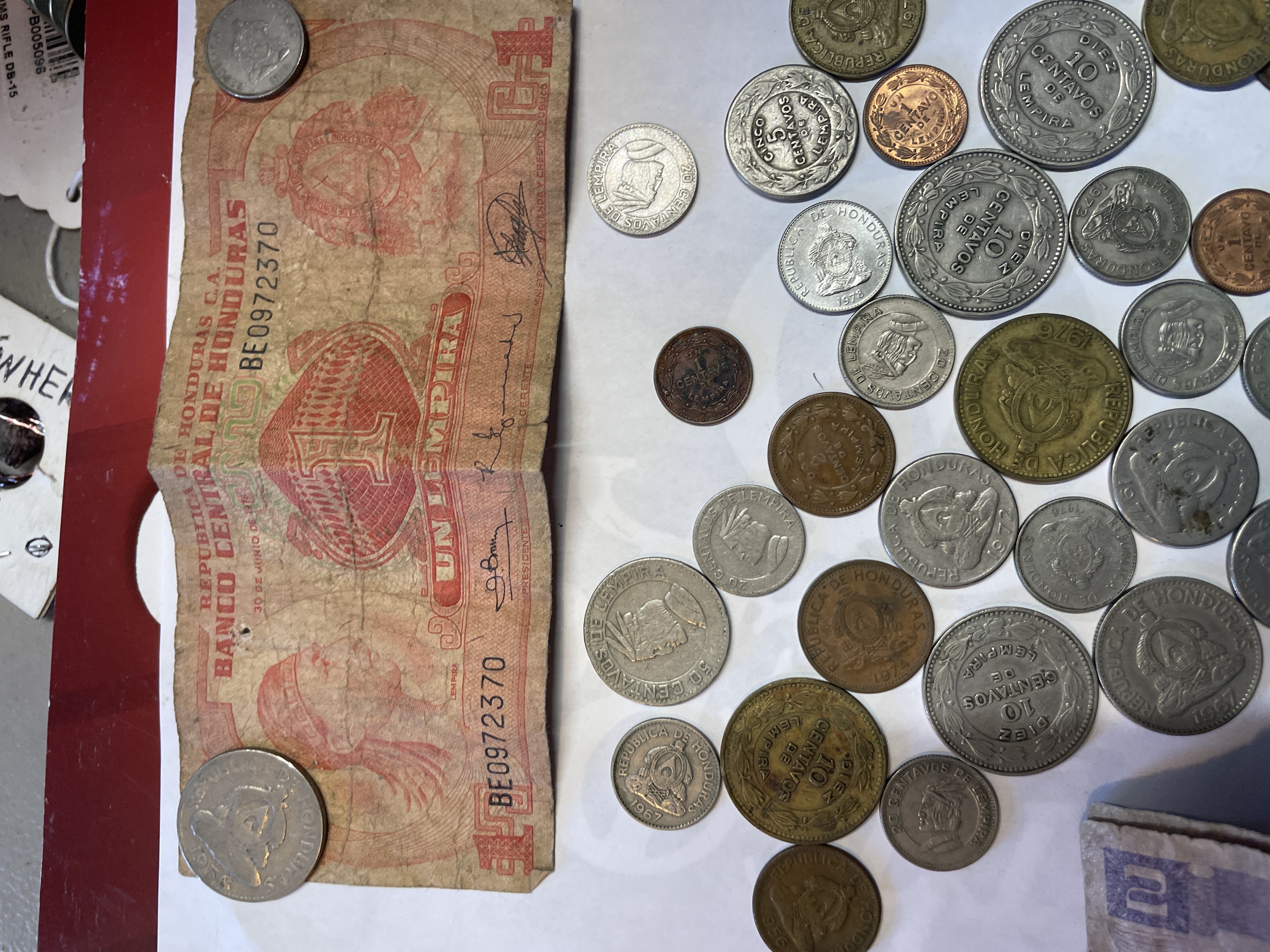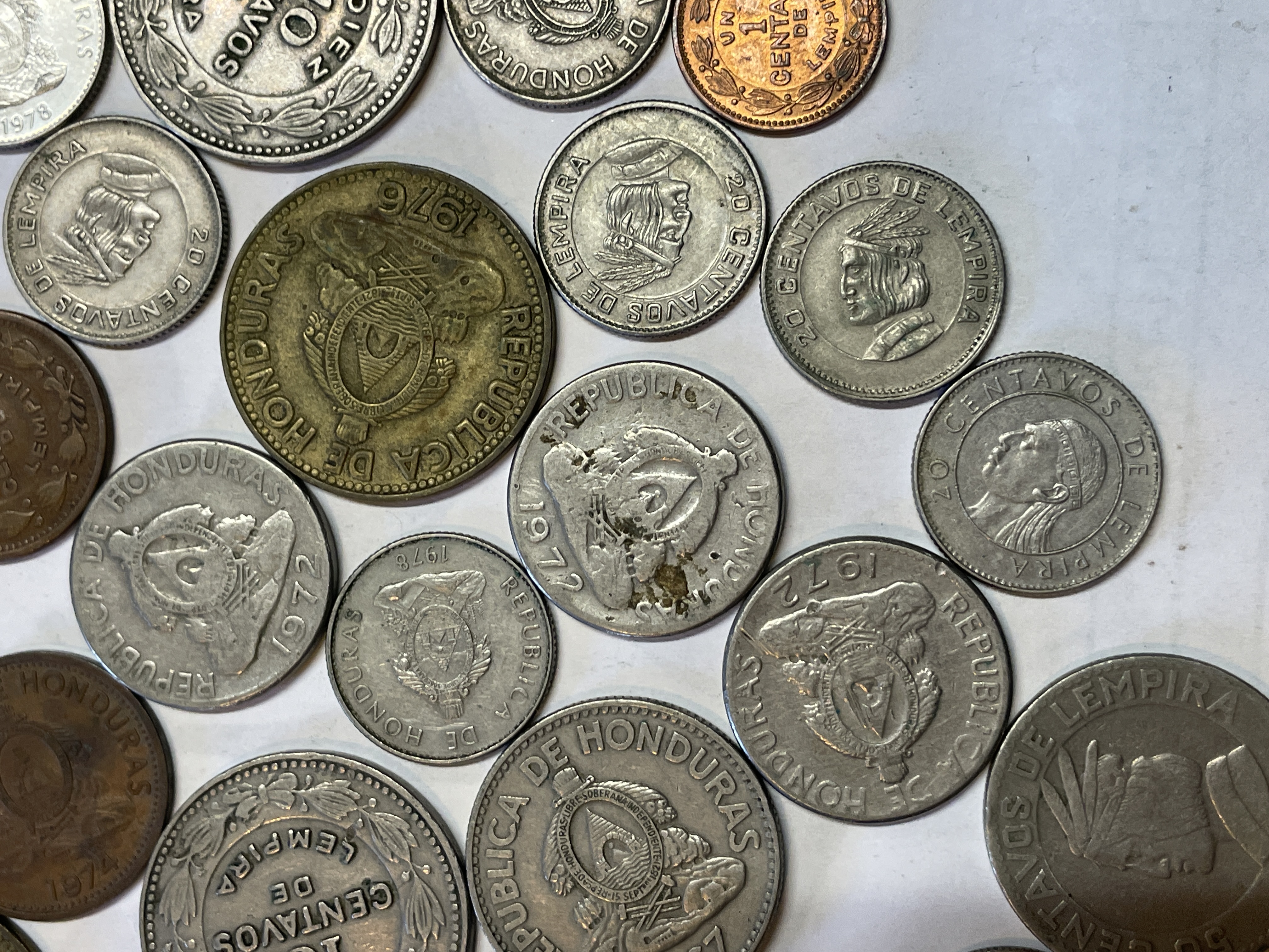 A collection of Republic of Honduras currency featuring 1 and 2 Lempira banknotes alongside various centavo coins in denominations of 1, 2, 5, 10, 20, and 50.