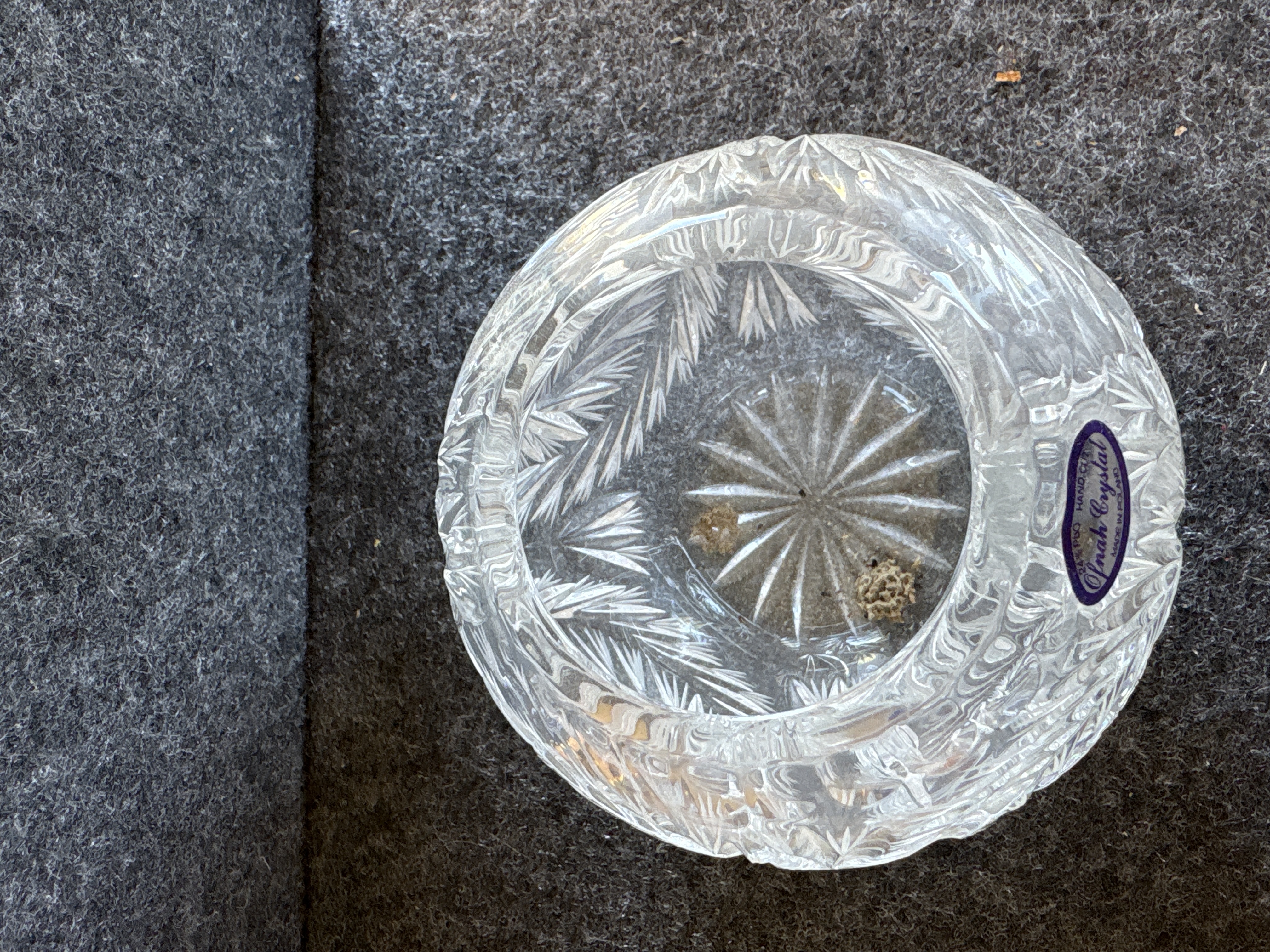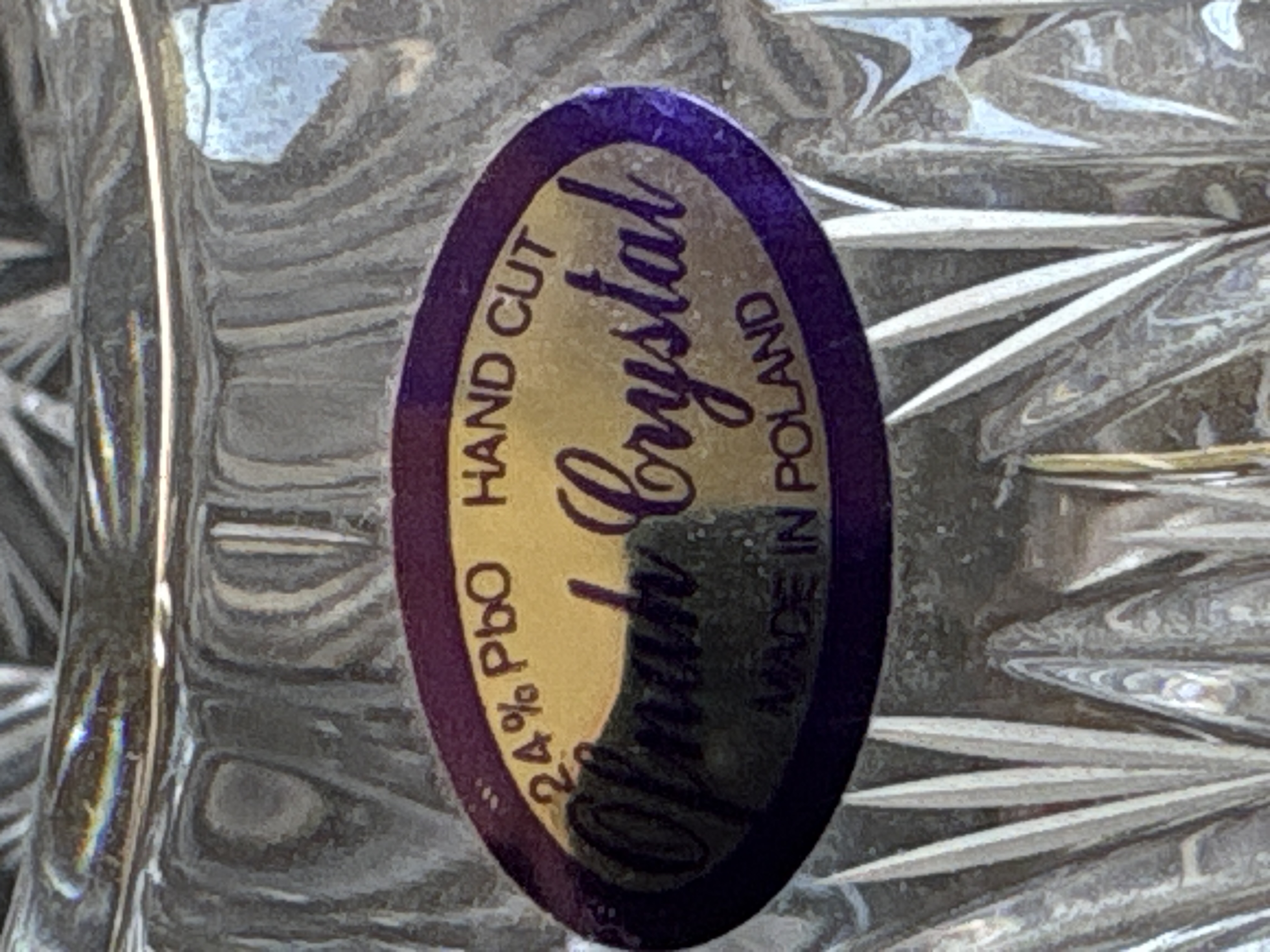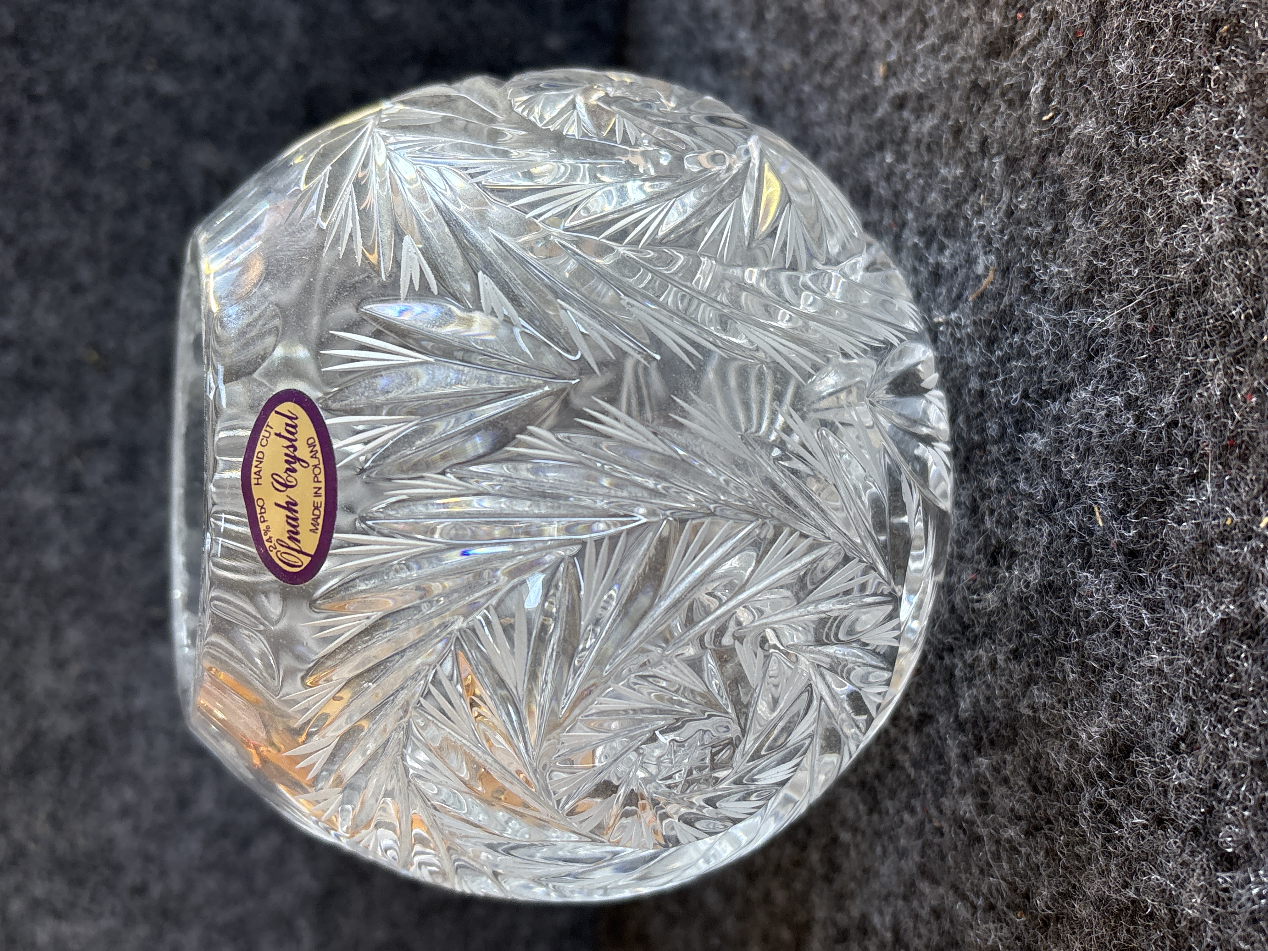 This hand-cut lead crystal bowl is manufactured by Olnah Crystal in Poland. The vessel is composed of 24 percent lead crystal, as indicated by the original manufacturer’s foil label. The bowl features a rounded, globular form with a constricted rim. The exterior is decorated with deep, overlapping hand-cut fan and starburst patterns. The base is finished with a large, multi-point radial star cut. The material exhibits high clarity and sharp mitre cuts. An oval purple and gold foil label is present on the side, reading 24 percent PbO, HAND CUT, Olnah Crystal, MADE IN POLAND.