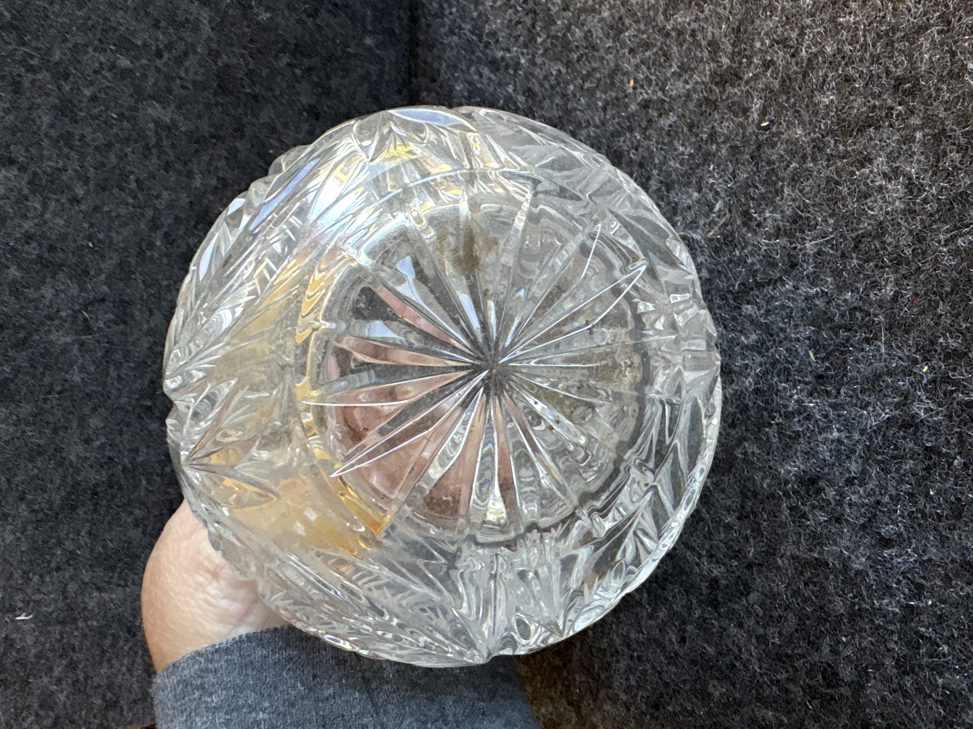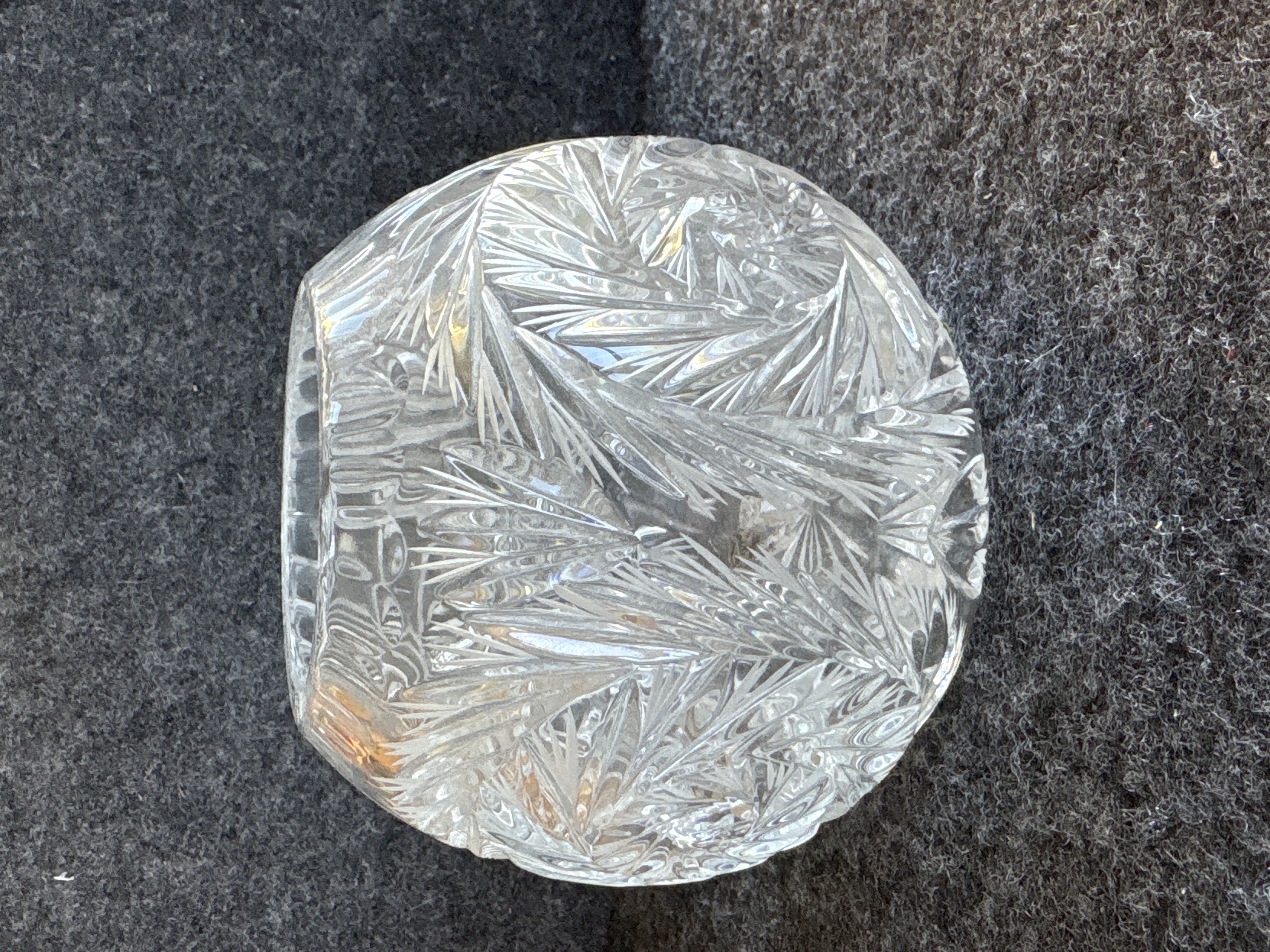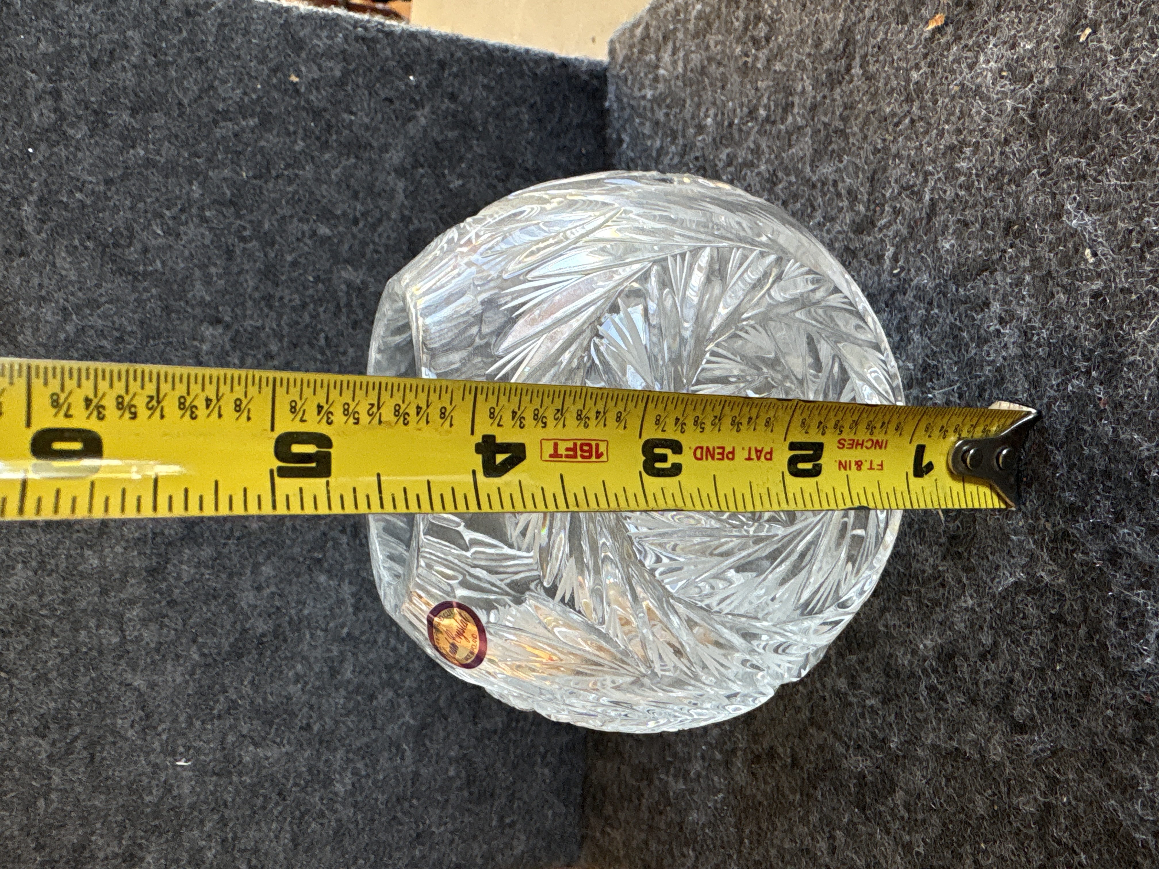 This hand-cut lead crystal bowl is manufactured by Olnah Crystal in Poland. The vessel is composed of 24 percent lead crystal, as indicated by the original manufacturer’s foil label. The bowl features a rounded, globular form with a constricted rim. The exterior is decorated with deep, overlapping hand-cut fan and starburst patterns. The base is finished with a large, multi-point radial star cut. The material exhibits high clarity and sharp mitre cuts. An oval purple and gold foil label is present on the side, reading 24 percent PbO, HAND CUT, Olnah Crystal, MADE IN POLAND.