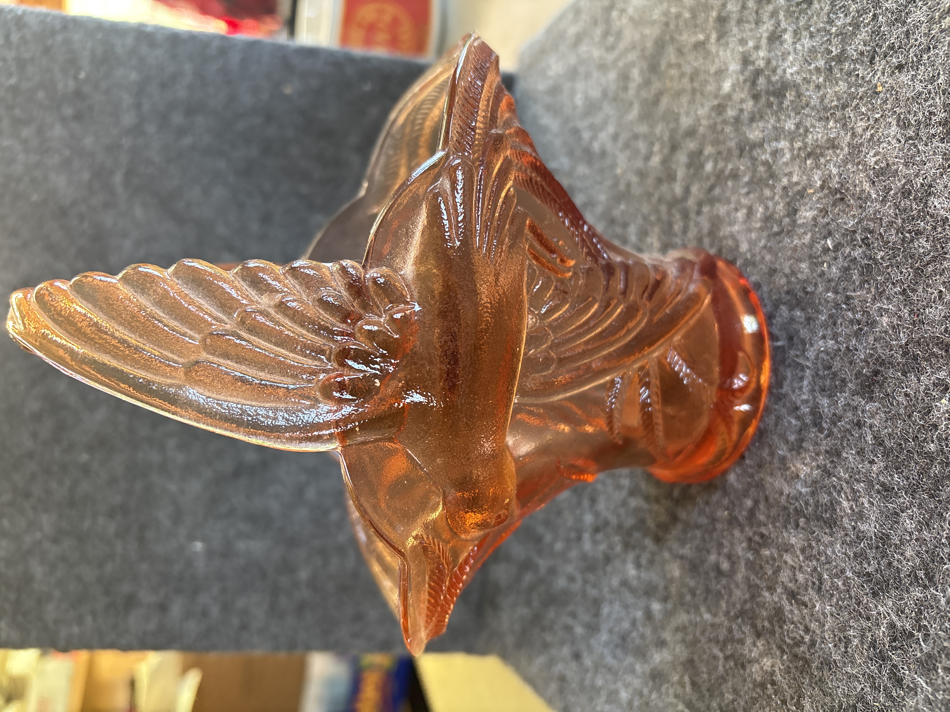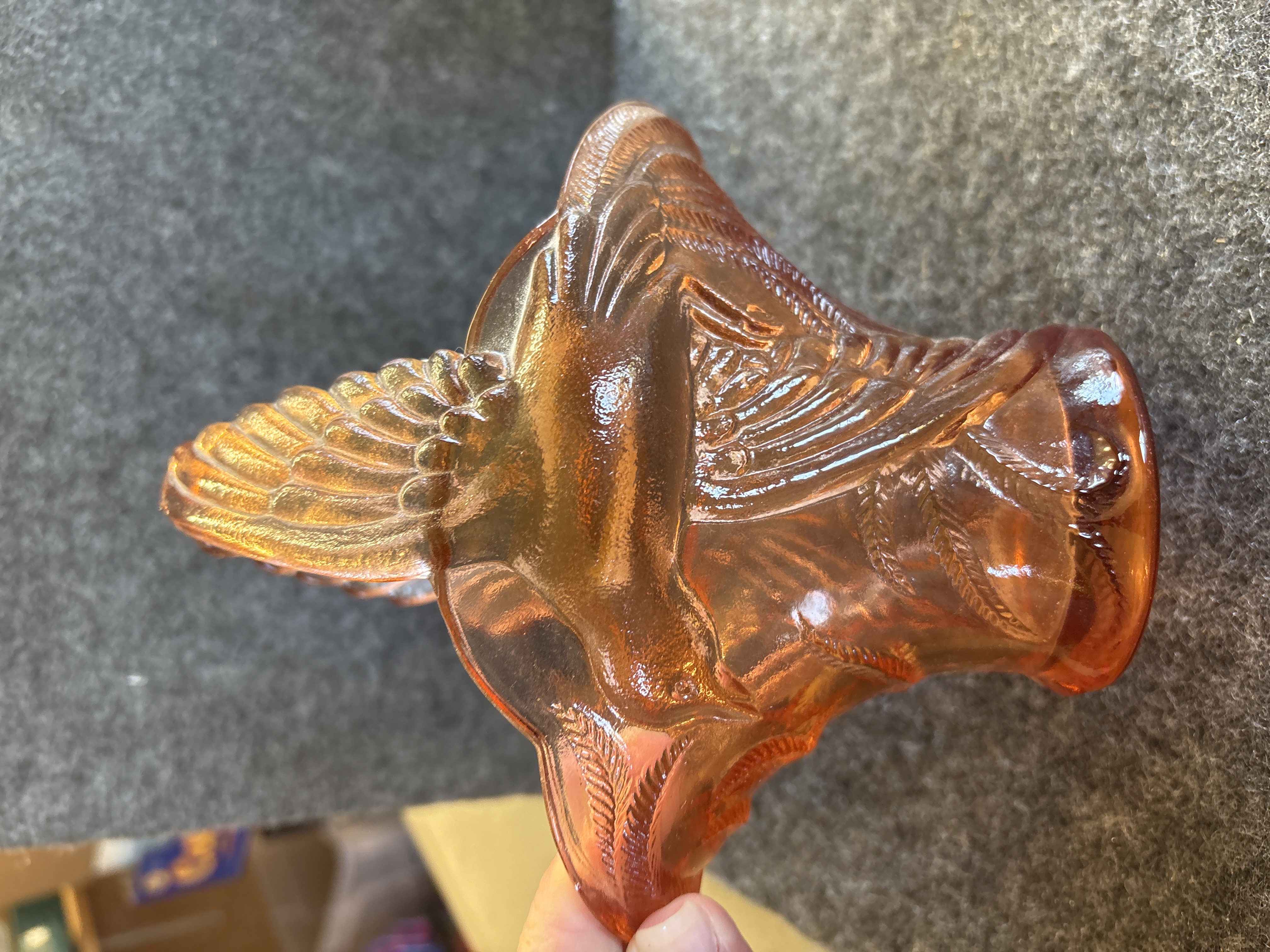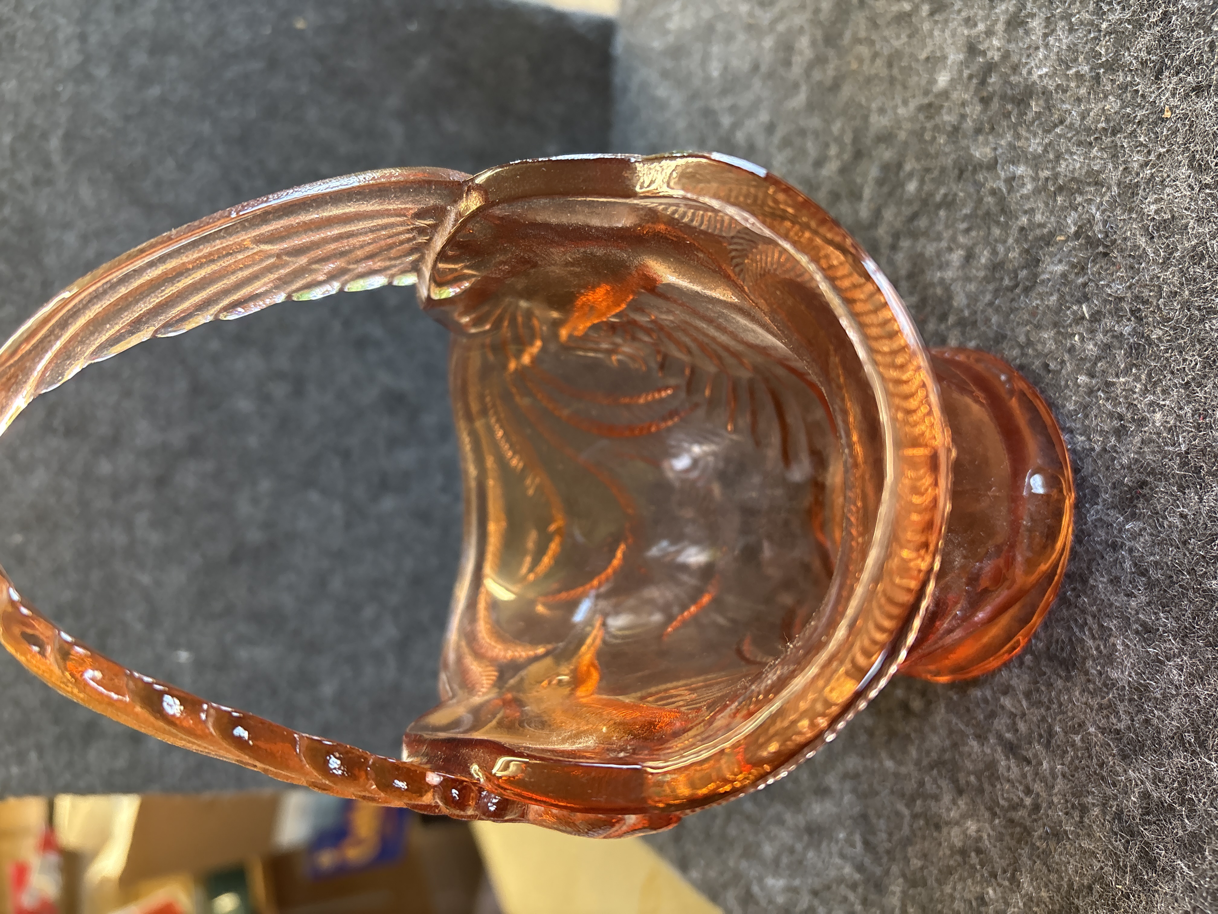 This decorative vessel is a pressed glass basket featuring a peach-colored hue. The design is characterized by two molded birds on opposite sides, whose outspread wings extend upward and join to form a single handle. The body of the basket is decorated with textured, stylized foliate and feather-like patterns. The piece is constructed from a single mold with a circular pedestal base. No maker marks or alphanumeric characters are present on the item. This design is consistent with mid-20th-century American glassware and is attributed to the Indiana Glass Company, specifically the Bird pattern often distributed by Tiara Exclusives.