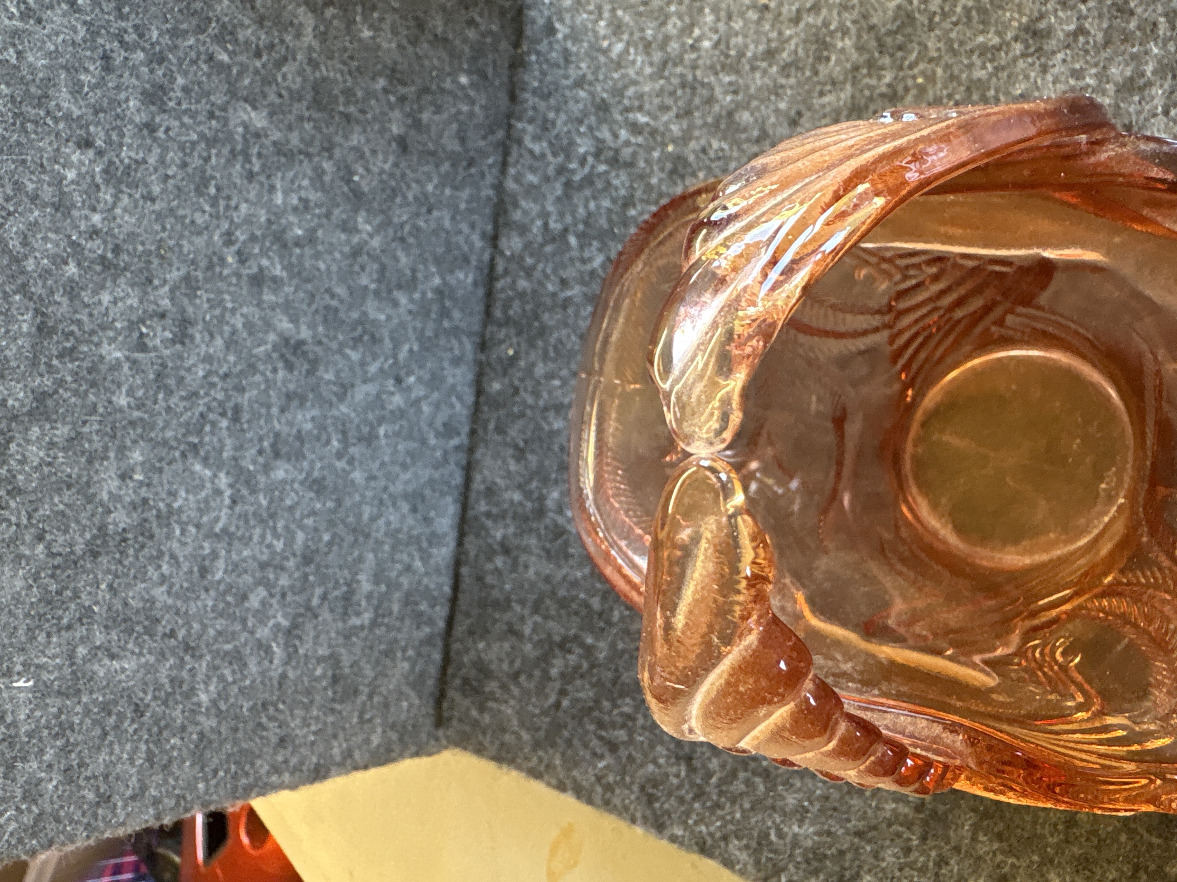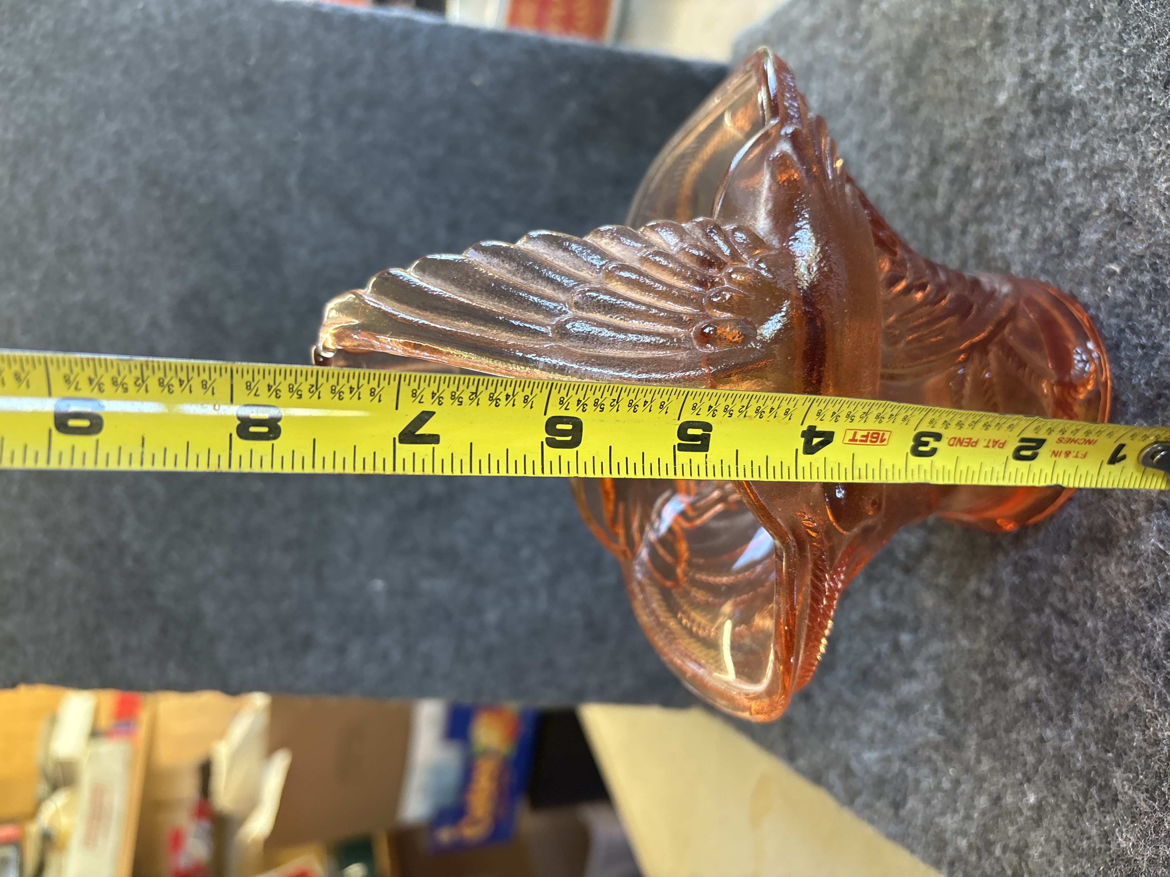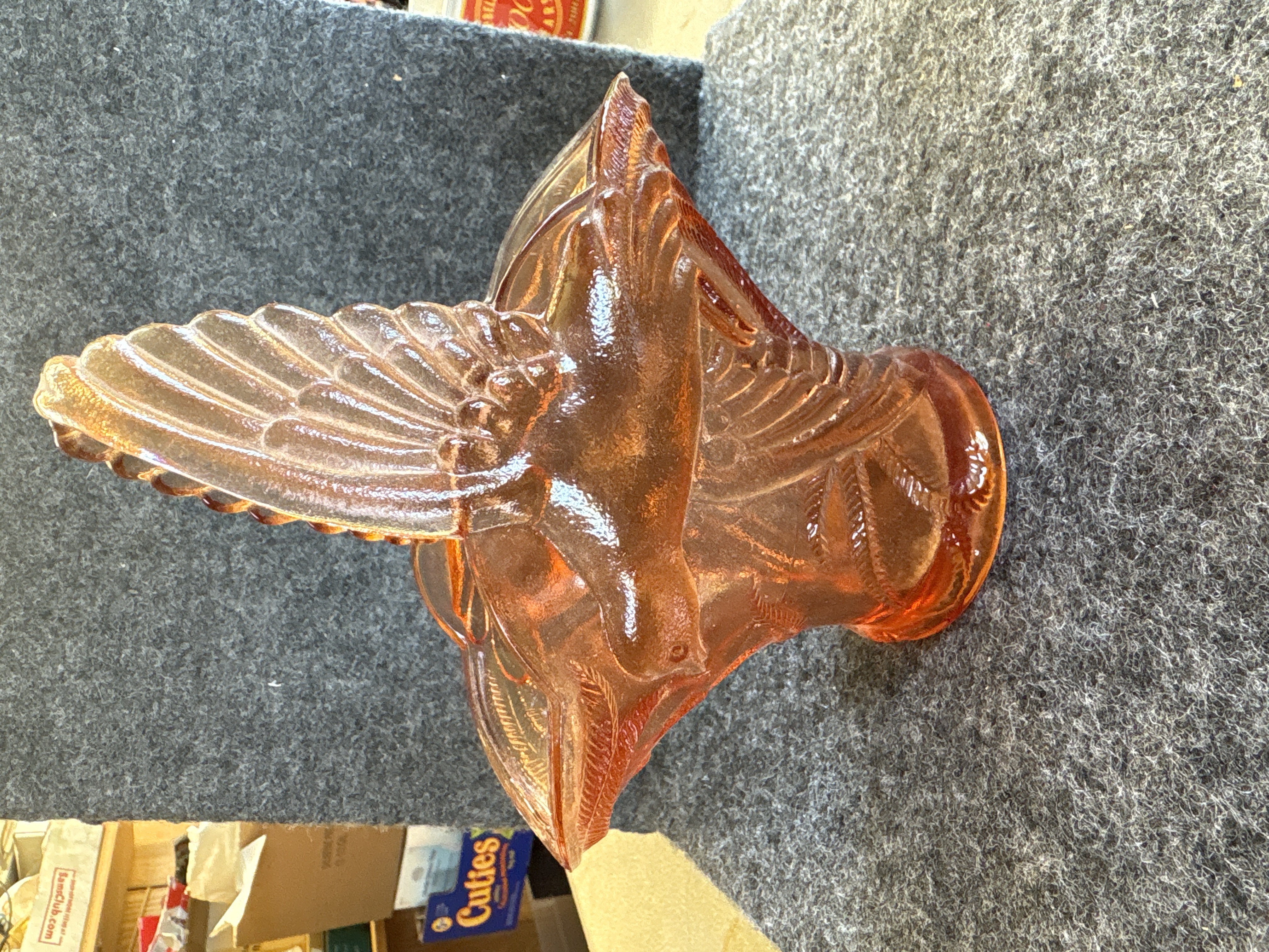 This decorative vessel is a pressed glass basket featuring a peach-colored hue. The design is characterized by two molded birds on opposite sides, whose outspread wings extend upward and join to form a single handle. The body of the basket is decorated with textured, stylized foliate and feather-like patterns. The piece is constructed from a single mold with a circular pedestal base. No maker marks or alphanumeric characters are present on the item. This design is consistent with mid-20th-century American glassware and is attributed to the Indiana Glass Company, specifically the Bird pattern often distributed by Tiara Exclusives.