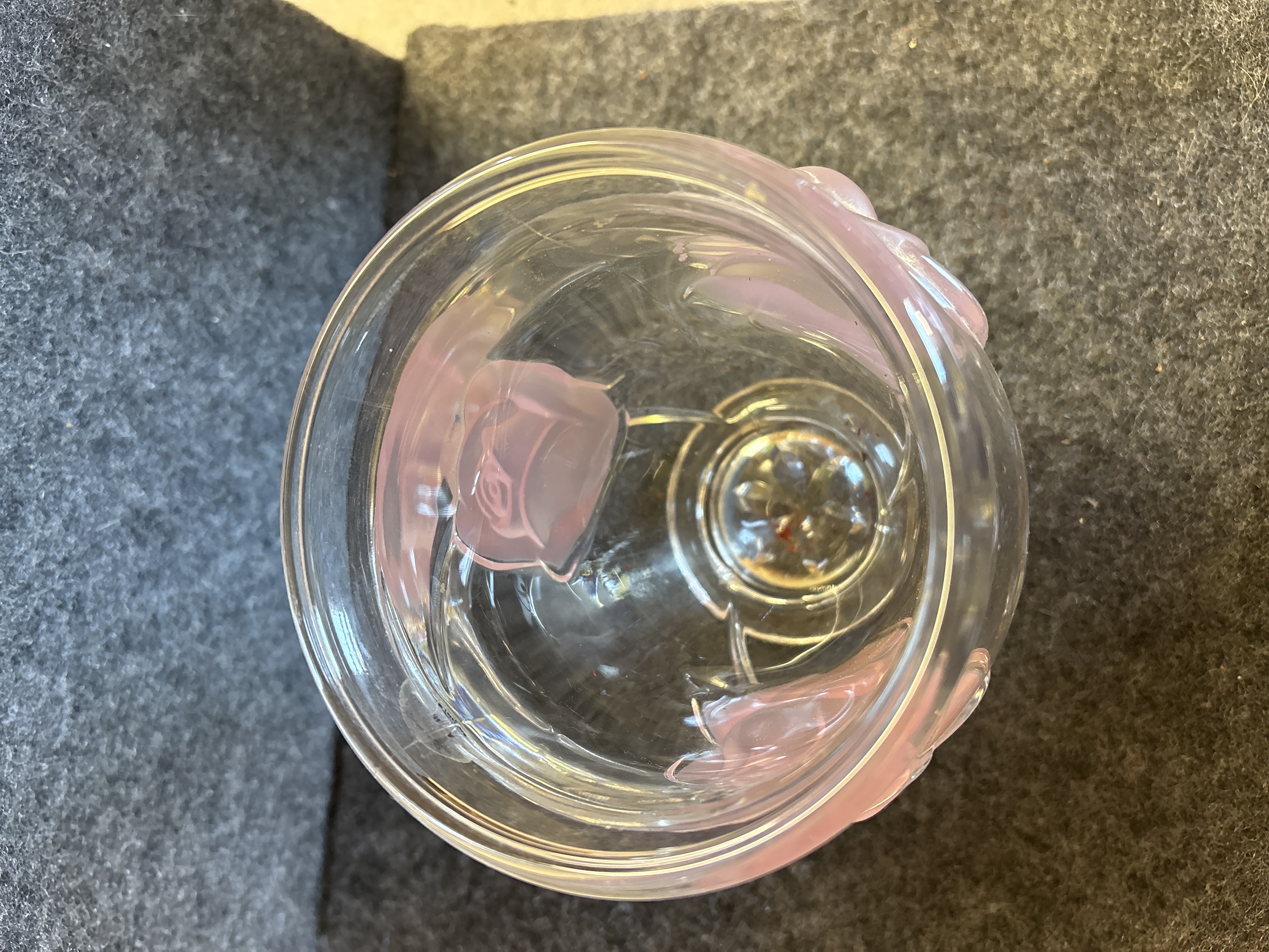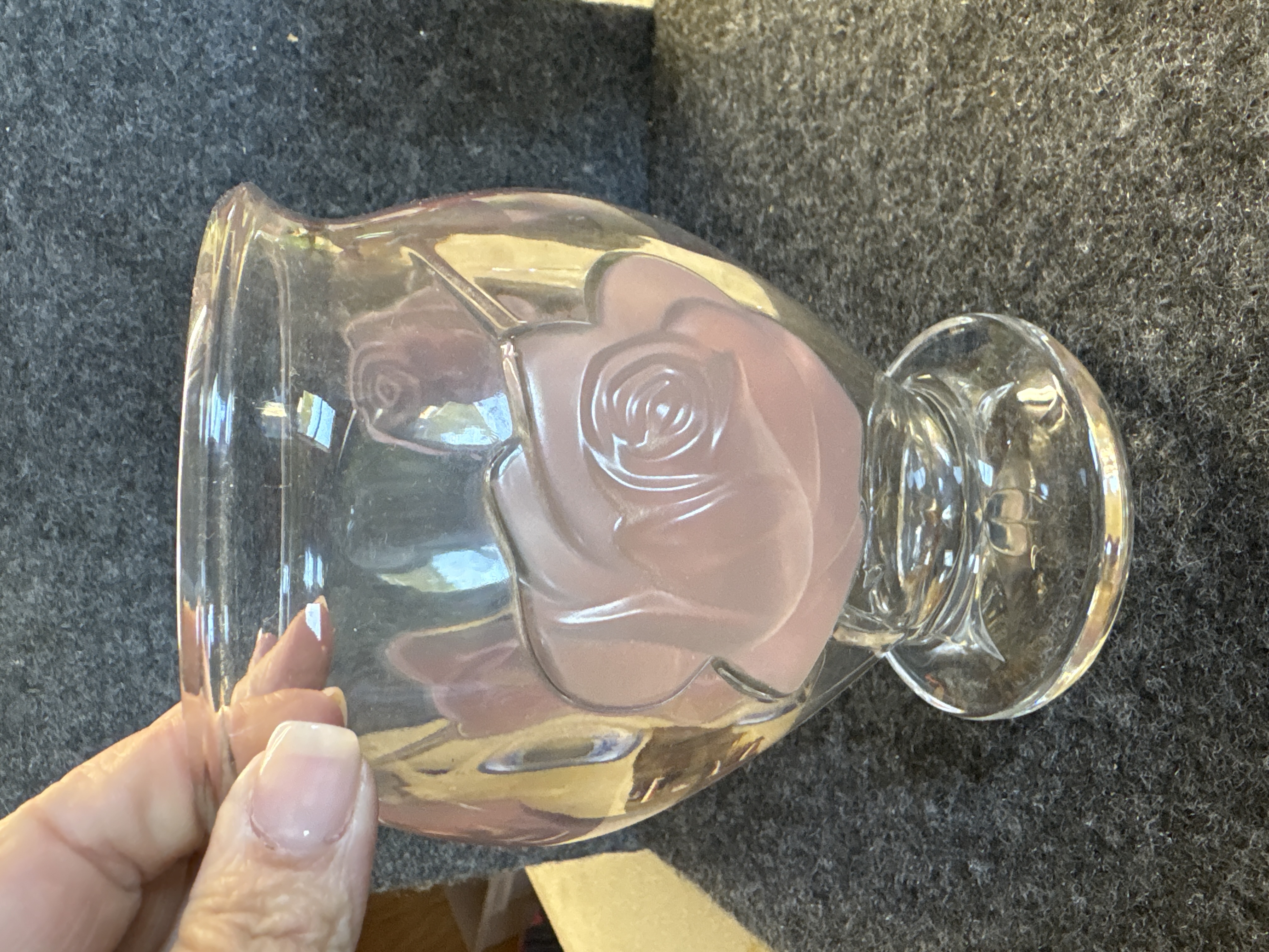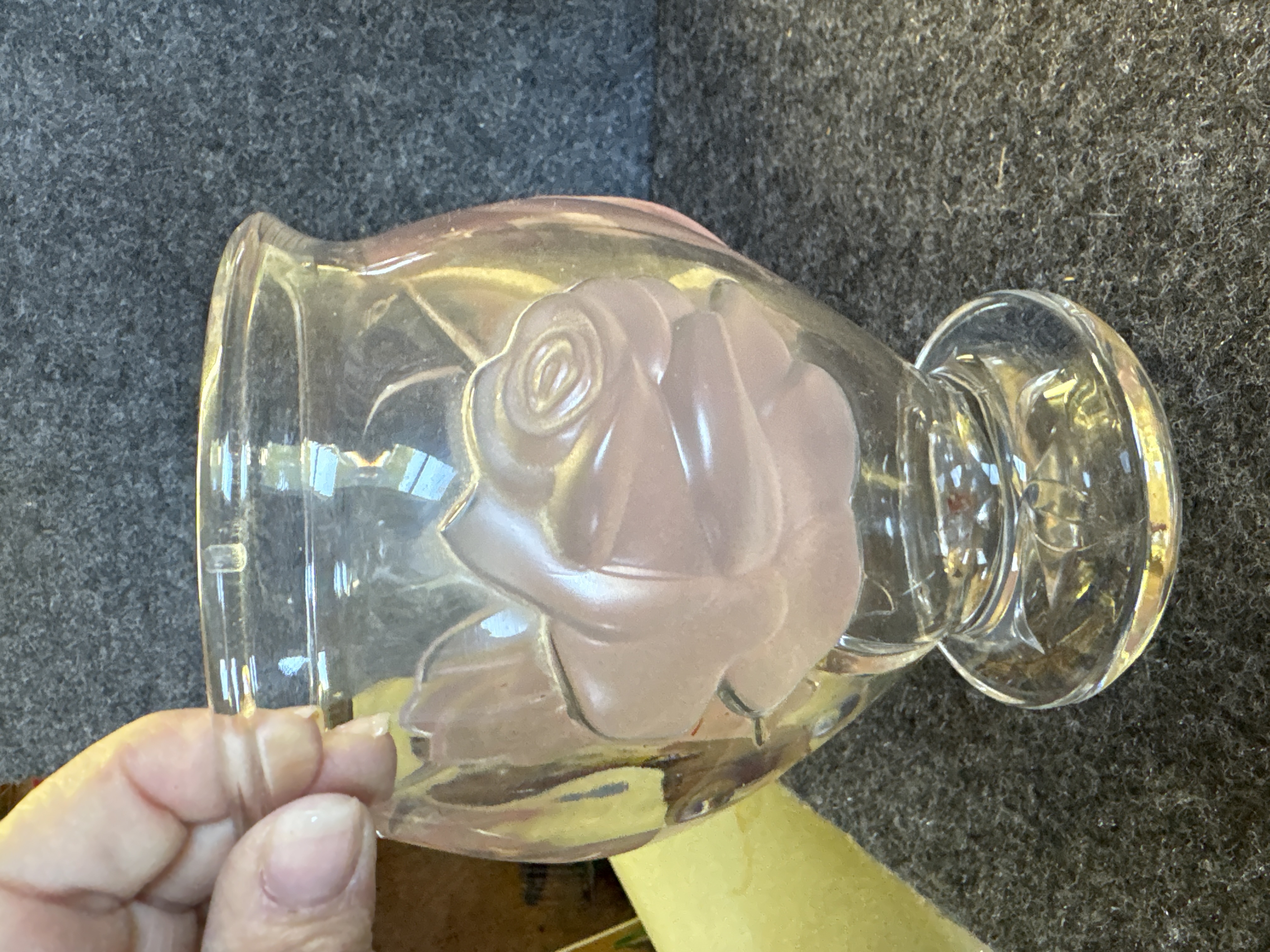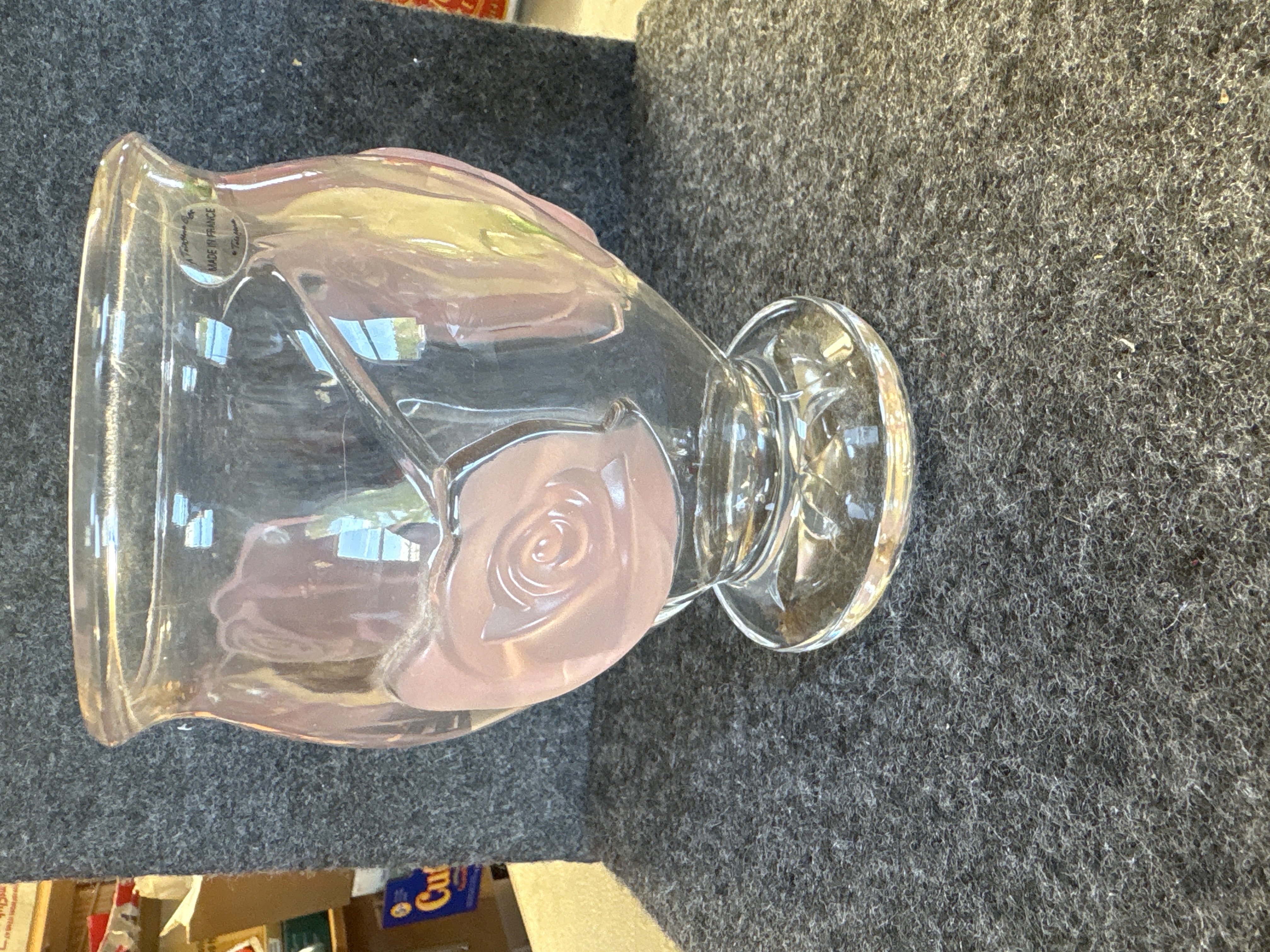 A clear glass pedestal vase manufactured in France for Teleflora. The vessel features three large, raised rose motifs executed in frosted glass with a soft pink tint. The design includes a wide, flared rim and a body that tapers toward a circular footed base. The underside of the base is decorated with a molded radial star pattern. A clear oval adhesive label is located on the upper body and is printed with the text A Taubman Exclusive, MADE IN FRANCE, and copyright Teleflora.