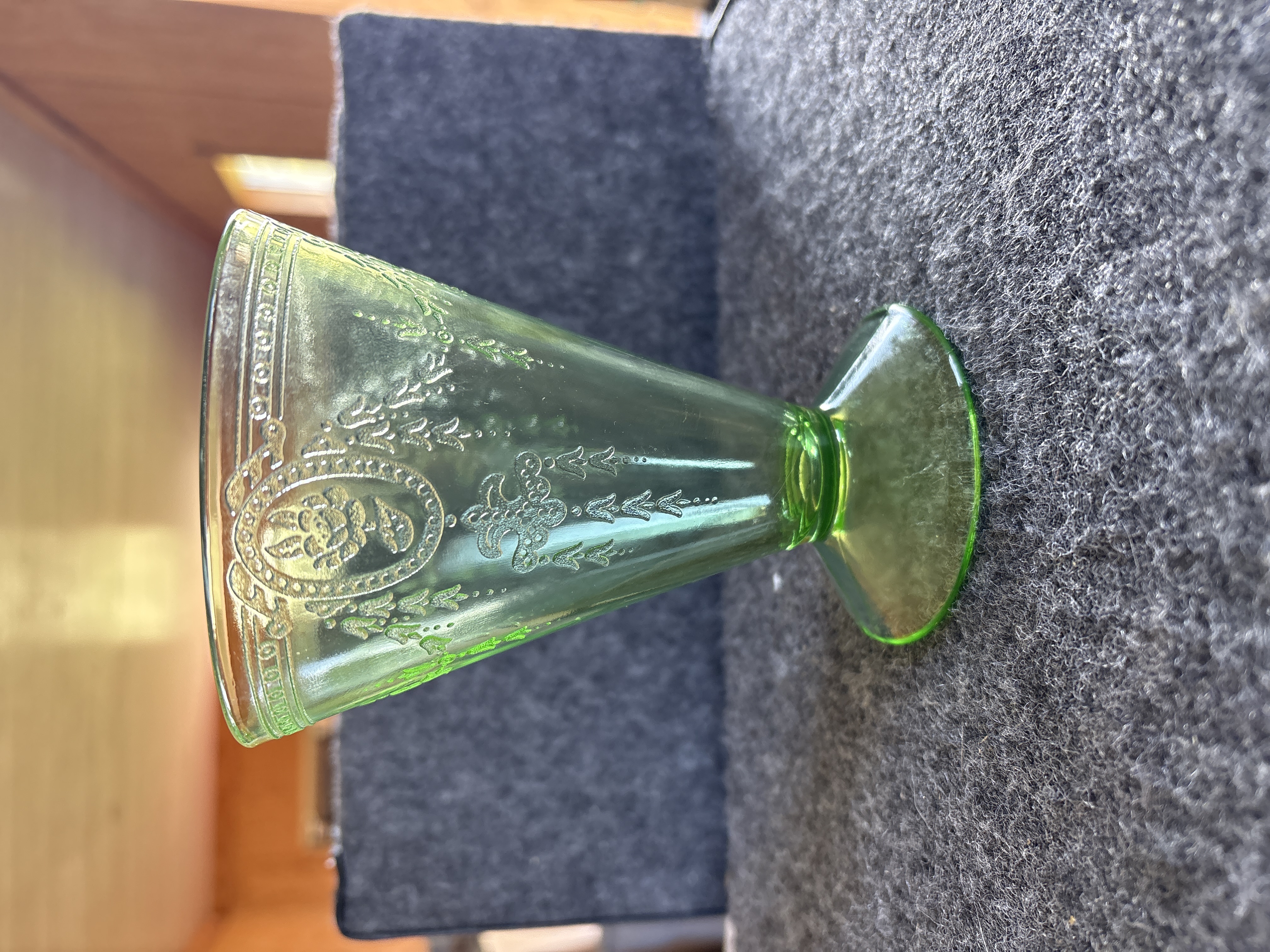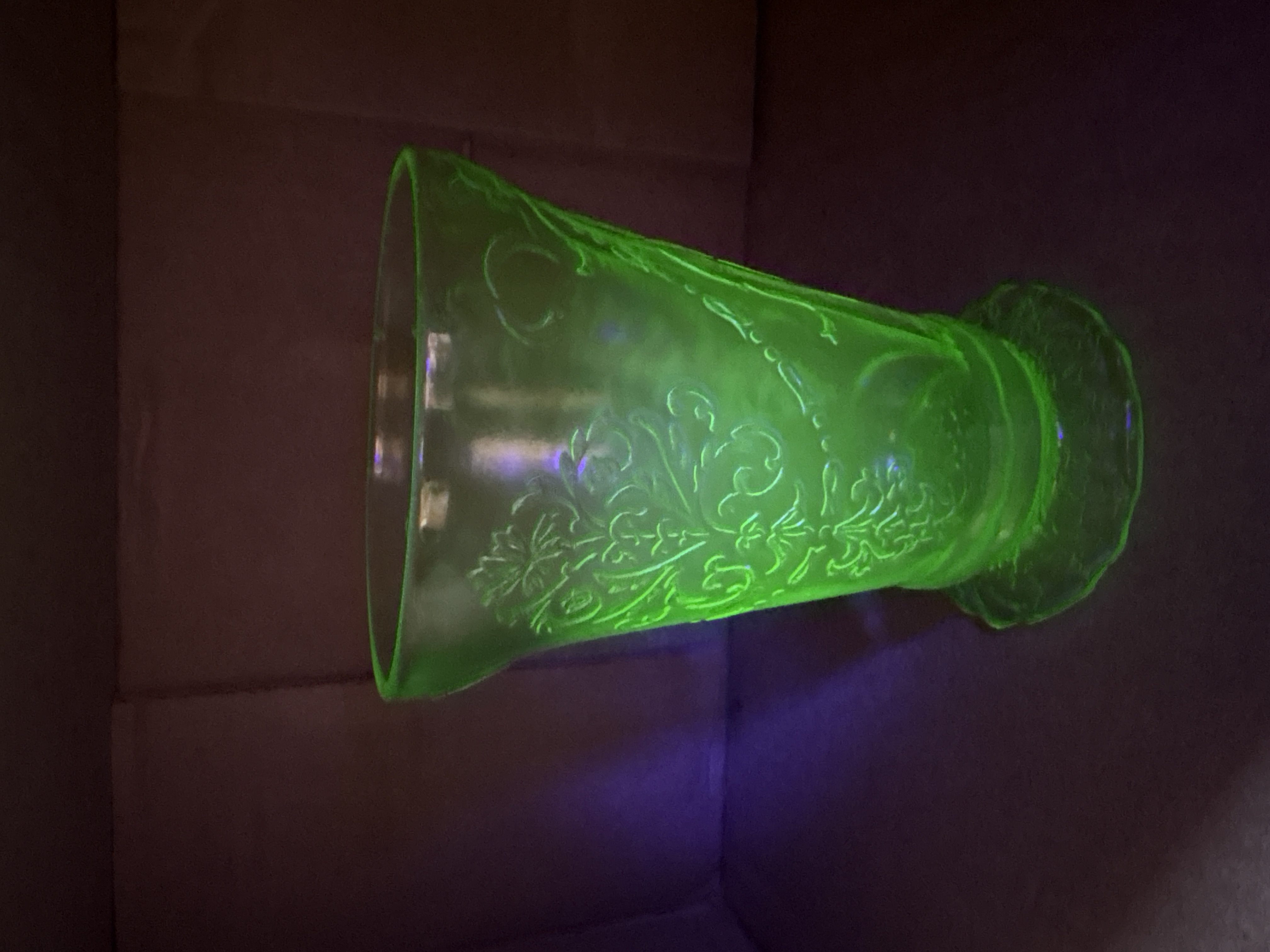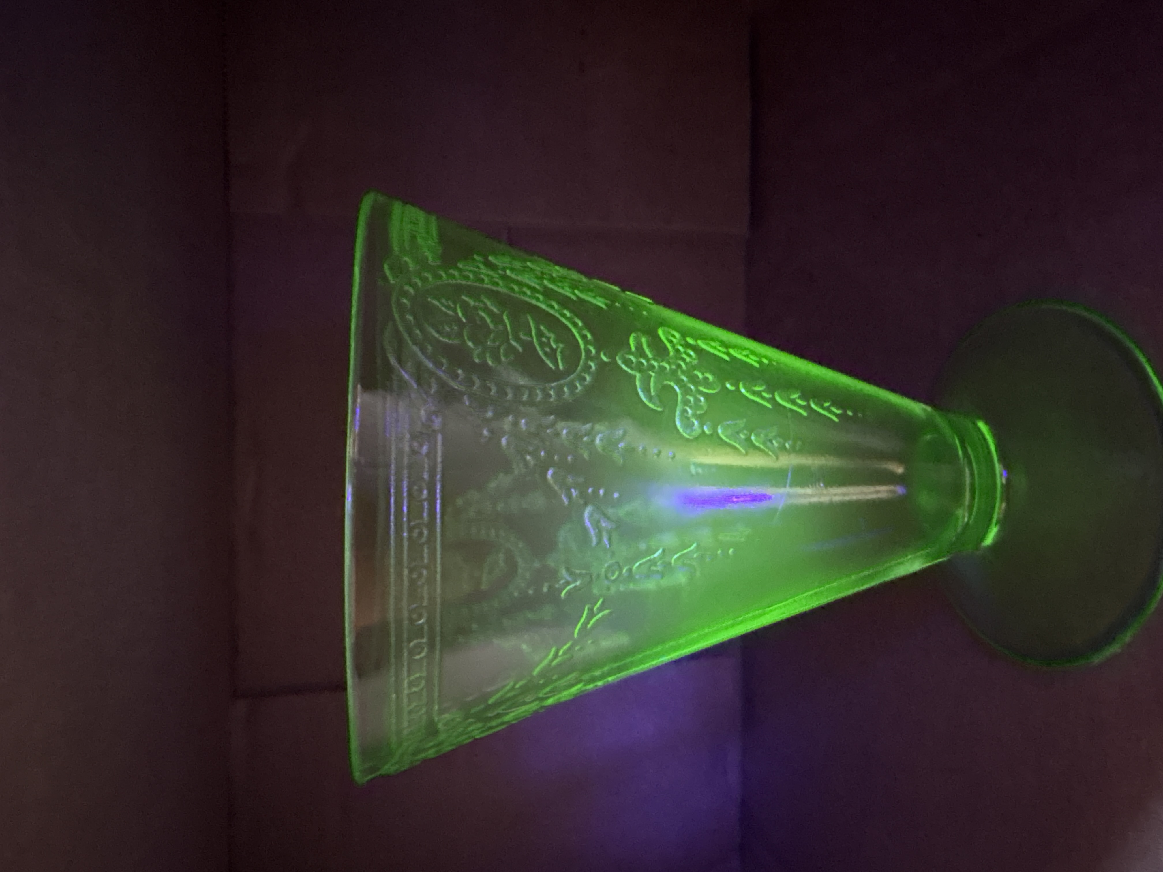 Two items of transparent green depression glass featuring patterns identified as Cameo and Princess. Both pieces exhibit strong neon green fluorescence under ultraviolet light, confirming the presence of uranium oxide in the glass melt. The first item is a footed tumbler featuring an embossed oval medallion with a dancing figure, beaded swags, and floral motifs, attributed to the Hocking Glass Company Cameo pattern, also known as Ballerina, produced circa 1930-1934. The second item is a flared vase with a pedestal base, featuring scrollwork crests and ribbon bow motifs with floral swags, attributed to the Hocking Glass Company Princess pattern, produced circa 1931-1935. Both items are manufactured using pressed glass techniques with visible mold lines and no pontil marks.
