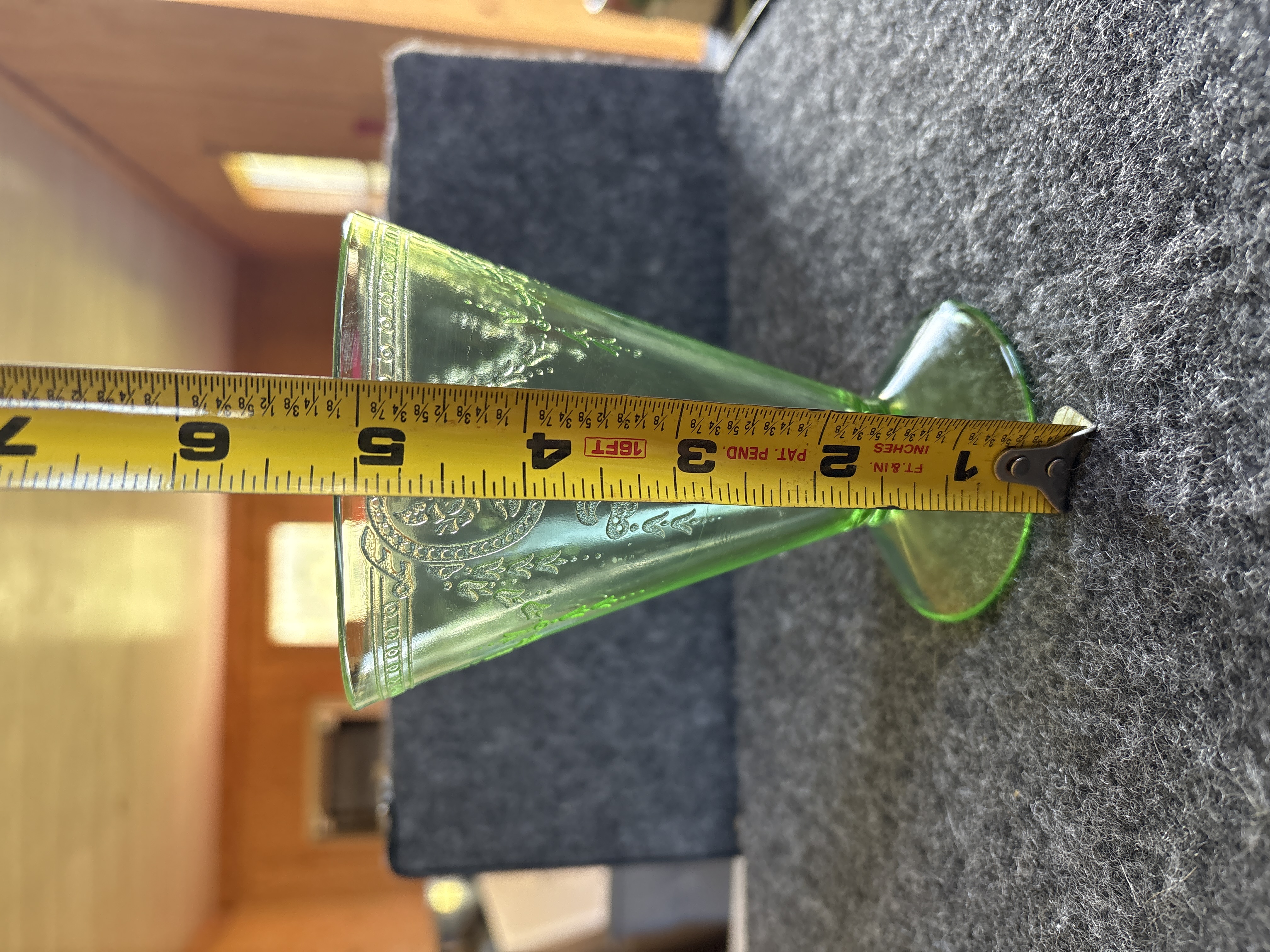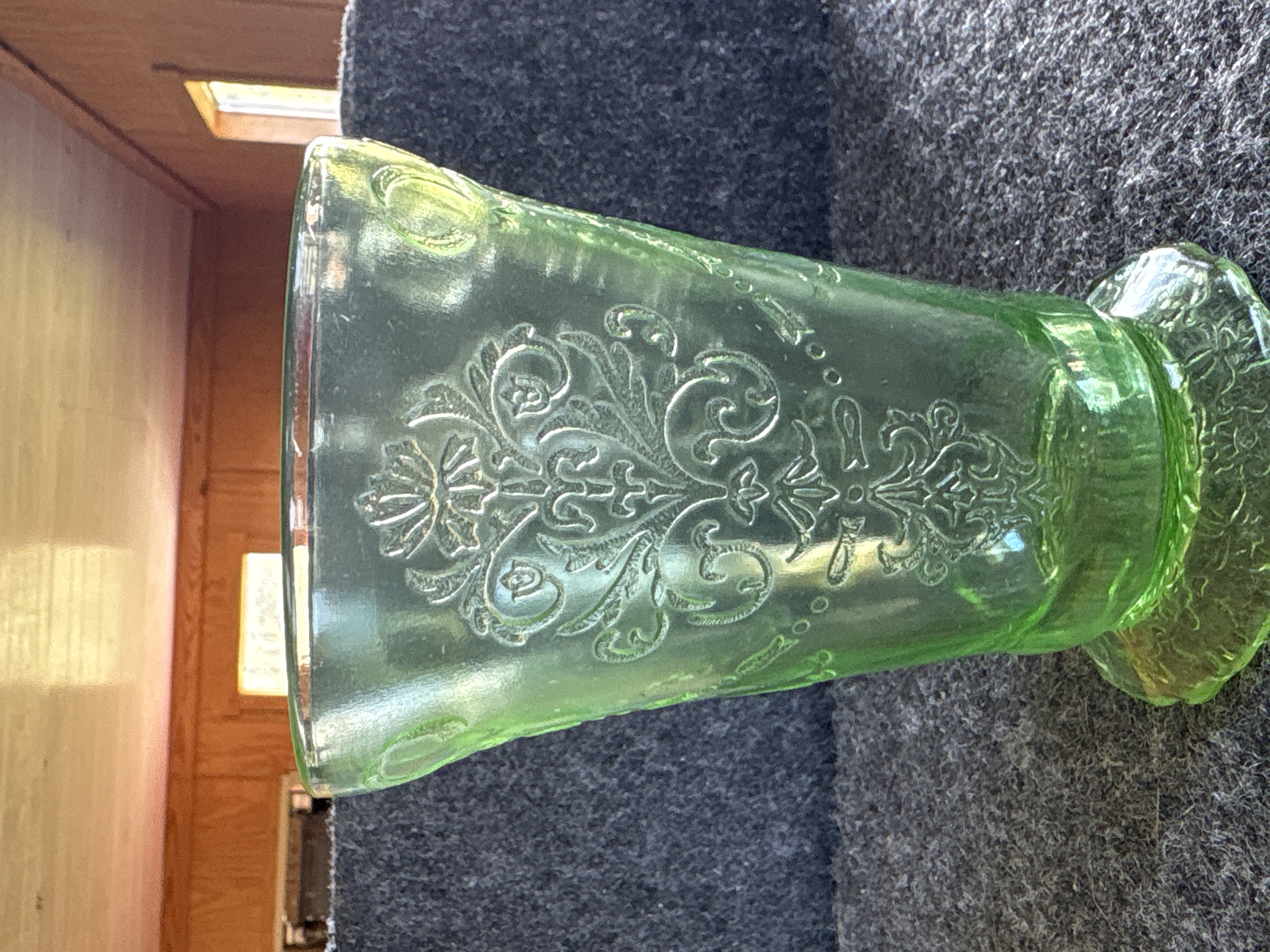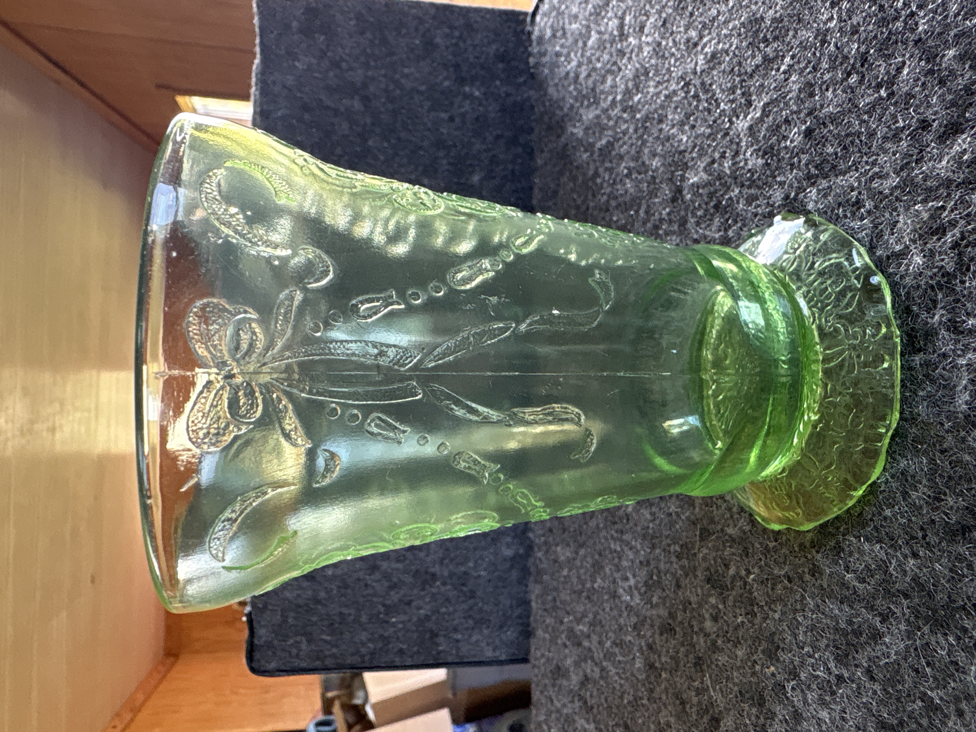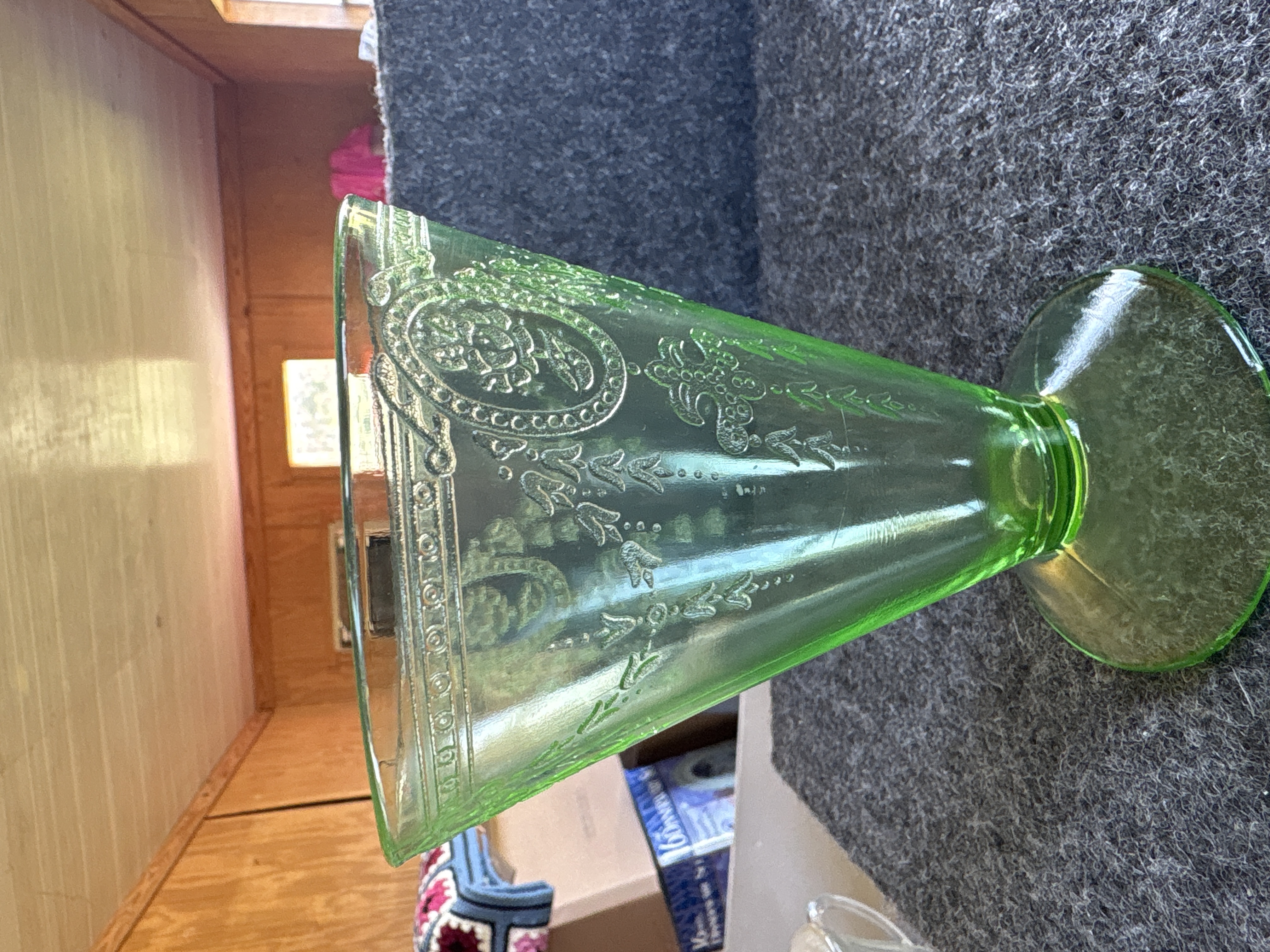 Two items of transparent green depression glass featuring patterns identified as Cameo and Princess. Both pieces exhibit strong neon green fluorescence under ultraviolet light, confirming the presence of uranium oxide in the glass melt. The first item is a footed tumbler featuring an embossed oval medallion with a dancing figure, beaded swags, and floral motifs, attributed to the Hocking Glass Company Cameo pattern, also known as Ballerina, produced circa 1930-1934. The second item is a flared vase with a pedestal base, featuring scrollwork crests and ribbon bow motifs with floral swags, attributed to the Hocking Glass Company Princess pattern, produced circa 1931-1935. Both items are manufactured using pressed glass techniques with visible mold lines and no pontil marks.