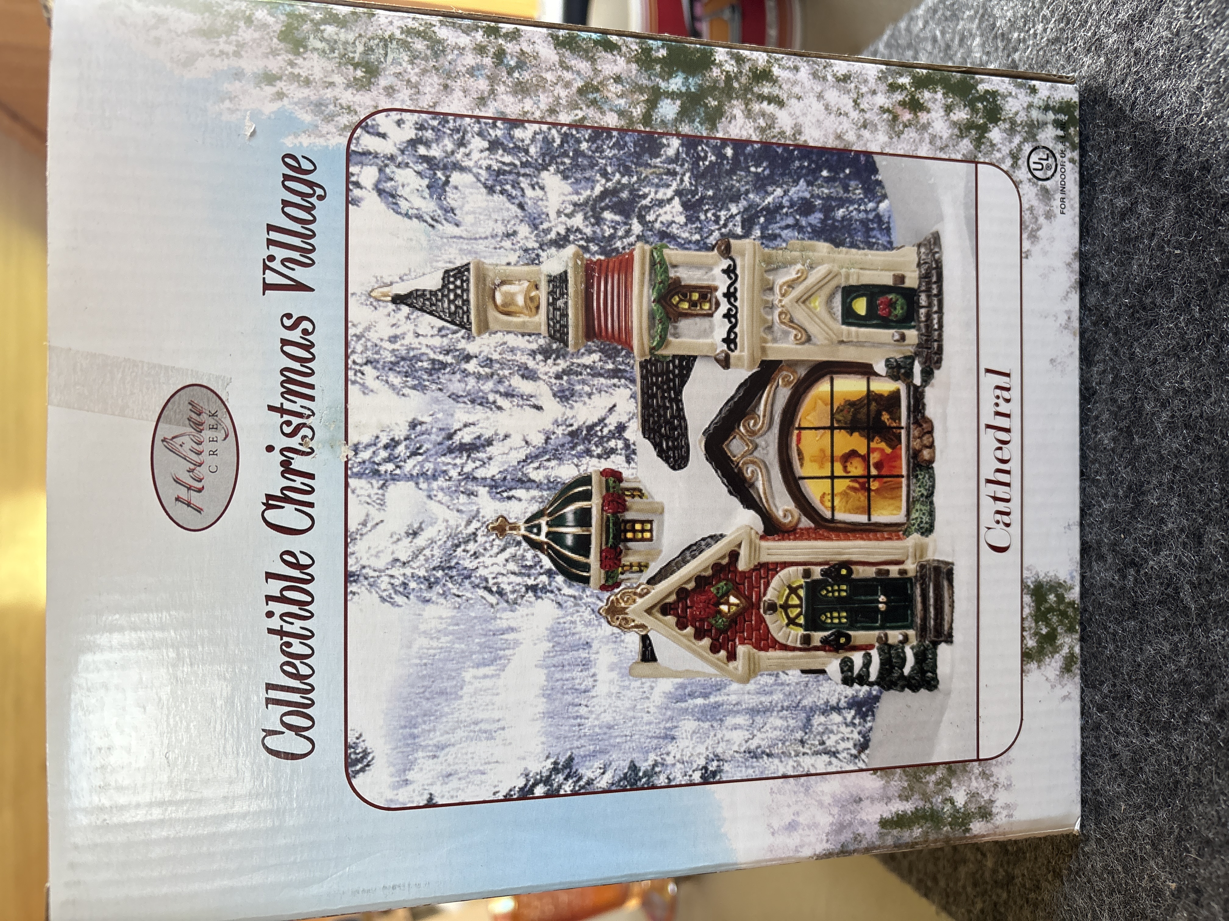 This hand-painted porcelain cathedral is part of the Holiday Creek Collectible Christmas Village series. The architectural miniature features multiple steeples, a bell tower, and a large arched glass window that reveals an internal scene. The exterior is decorated with festive wreaths and garland accents. The item is designed as a lighted house and includes a power cord and bulb. The packaging displays the Holiday Creek logo and a UL safety certification mark for the North American market.