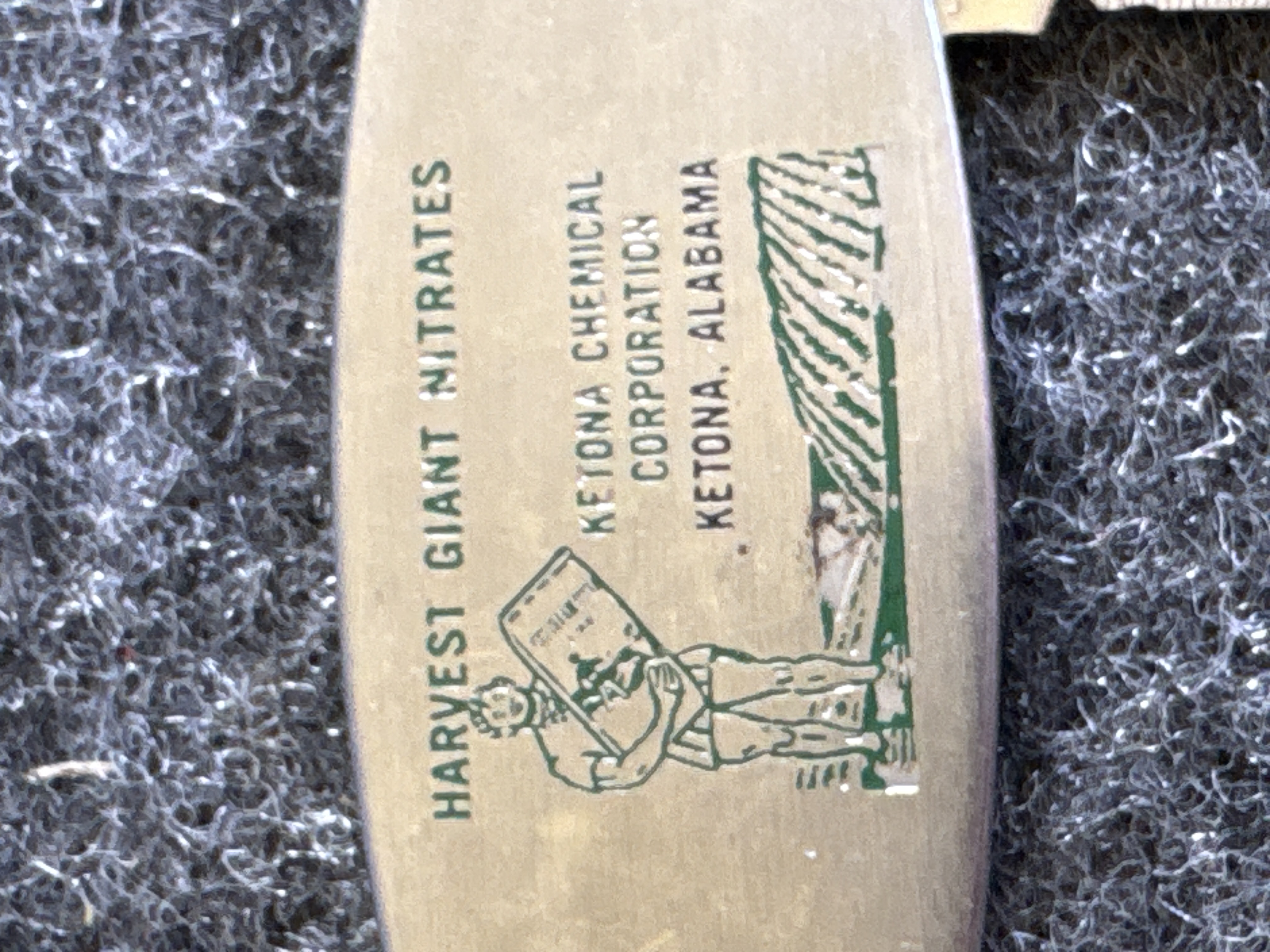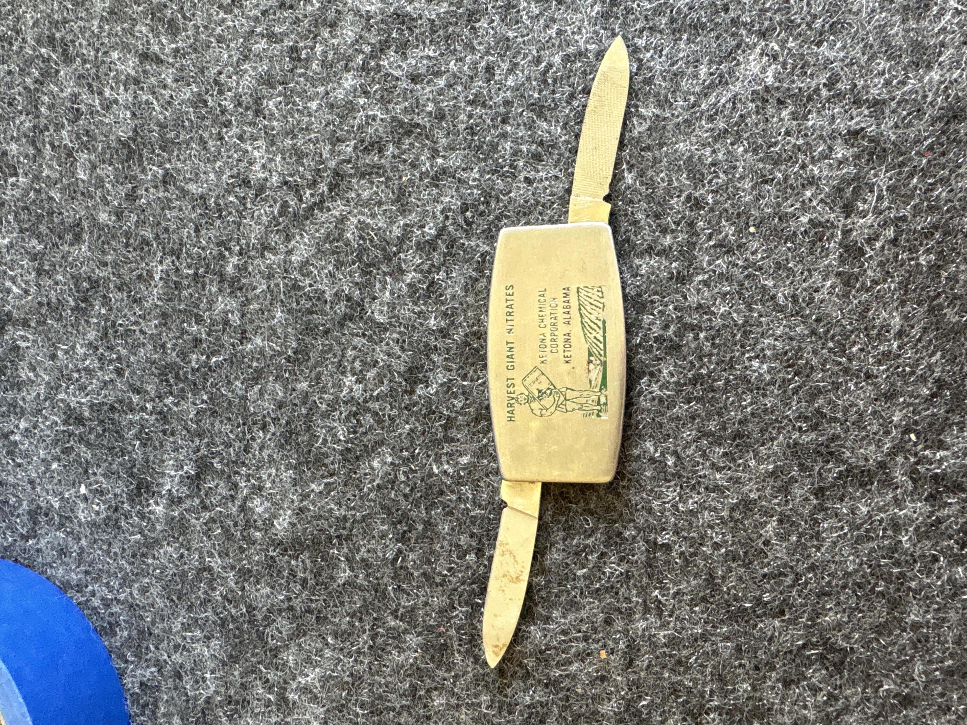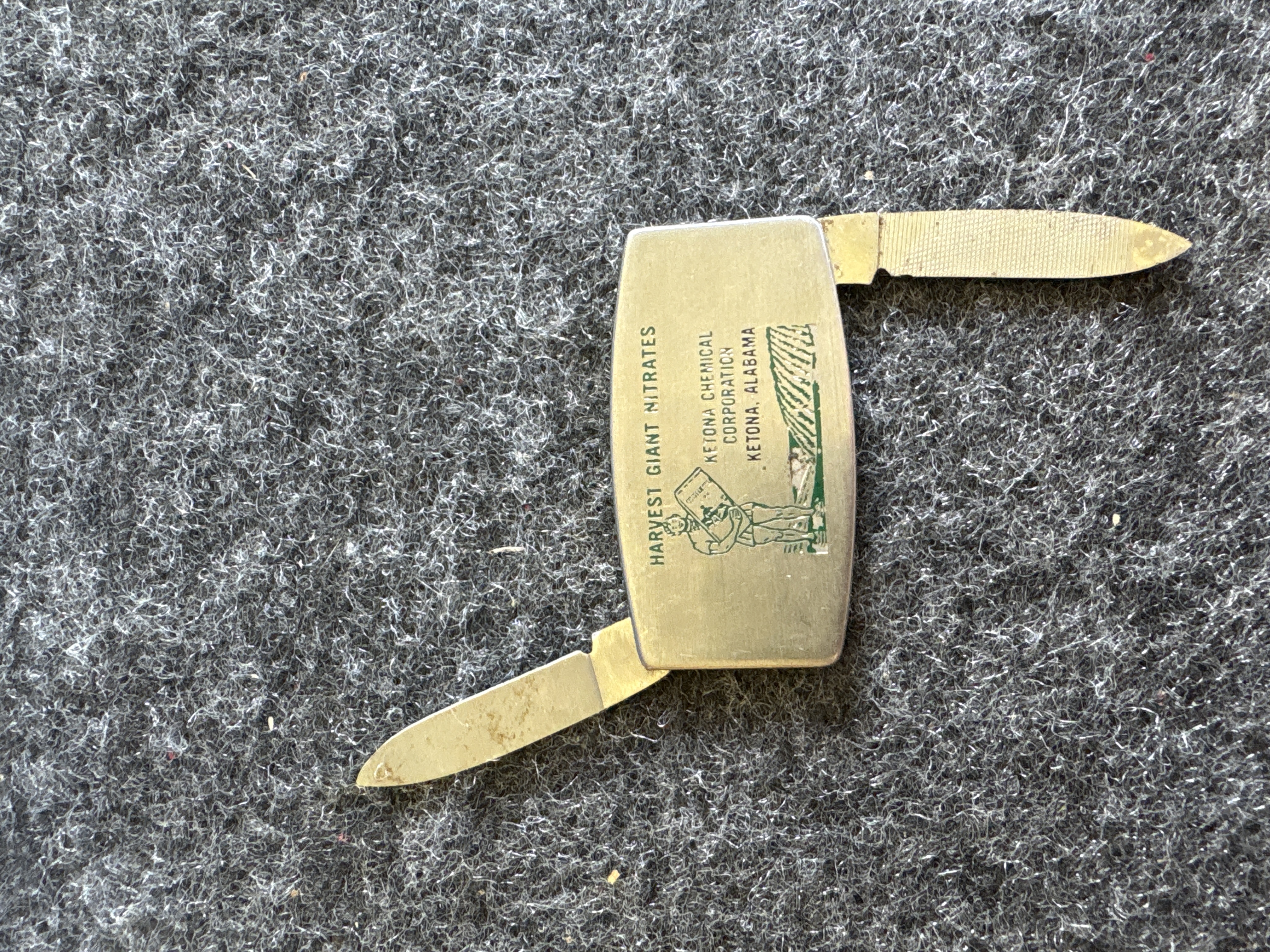 A vintage two-blade folding pocket knife manufactured by the Zippo Manufacturing Company in Bradford, Pennsylvania. The construction consists of brushed stainless steel handles housing two stainless steel components: a pen blade and a nail file blade with an integrated screwdriver tip. The obverse handle features a green and black silkscreened advertisement for Harvest Giant Nitrates, Ketona Chemical Corporation, Ketona, Alabama, including a graphic of a figure carrying a sack. The reverse handle is finished in plain brushed metal. The tang of the pen blade bears the stamp ZIPPO BRADFORD PA.