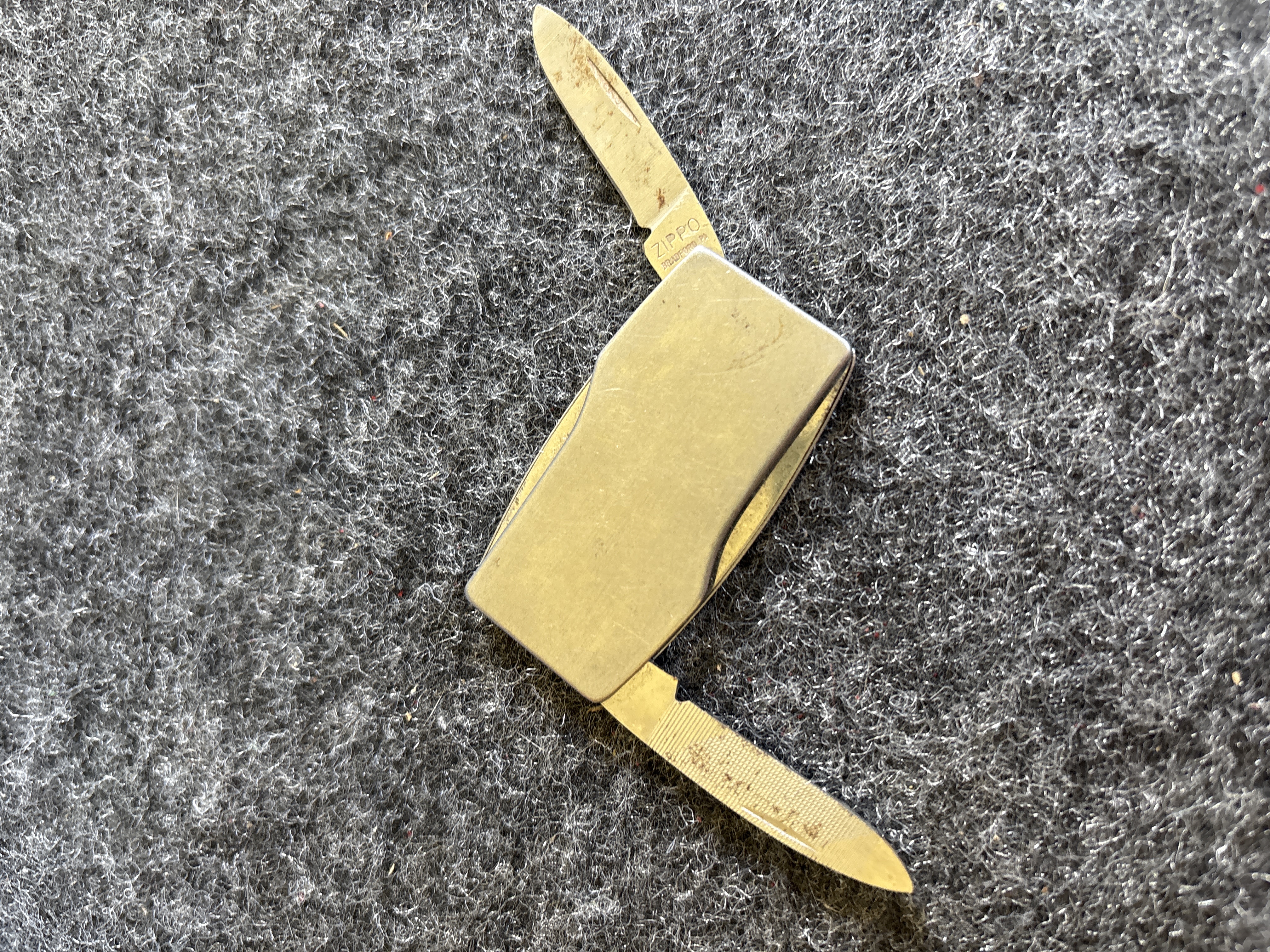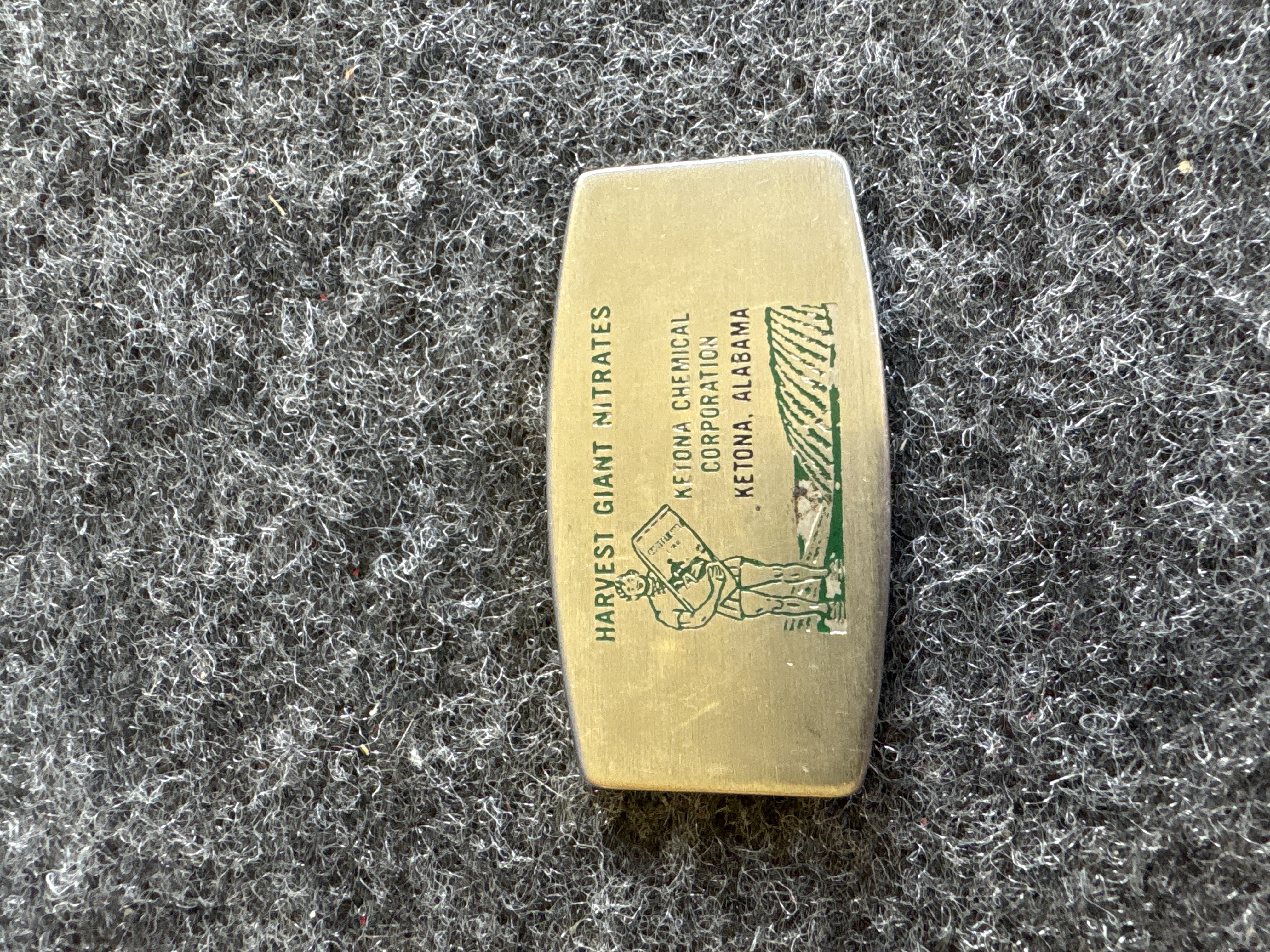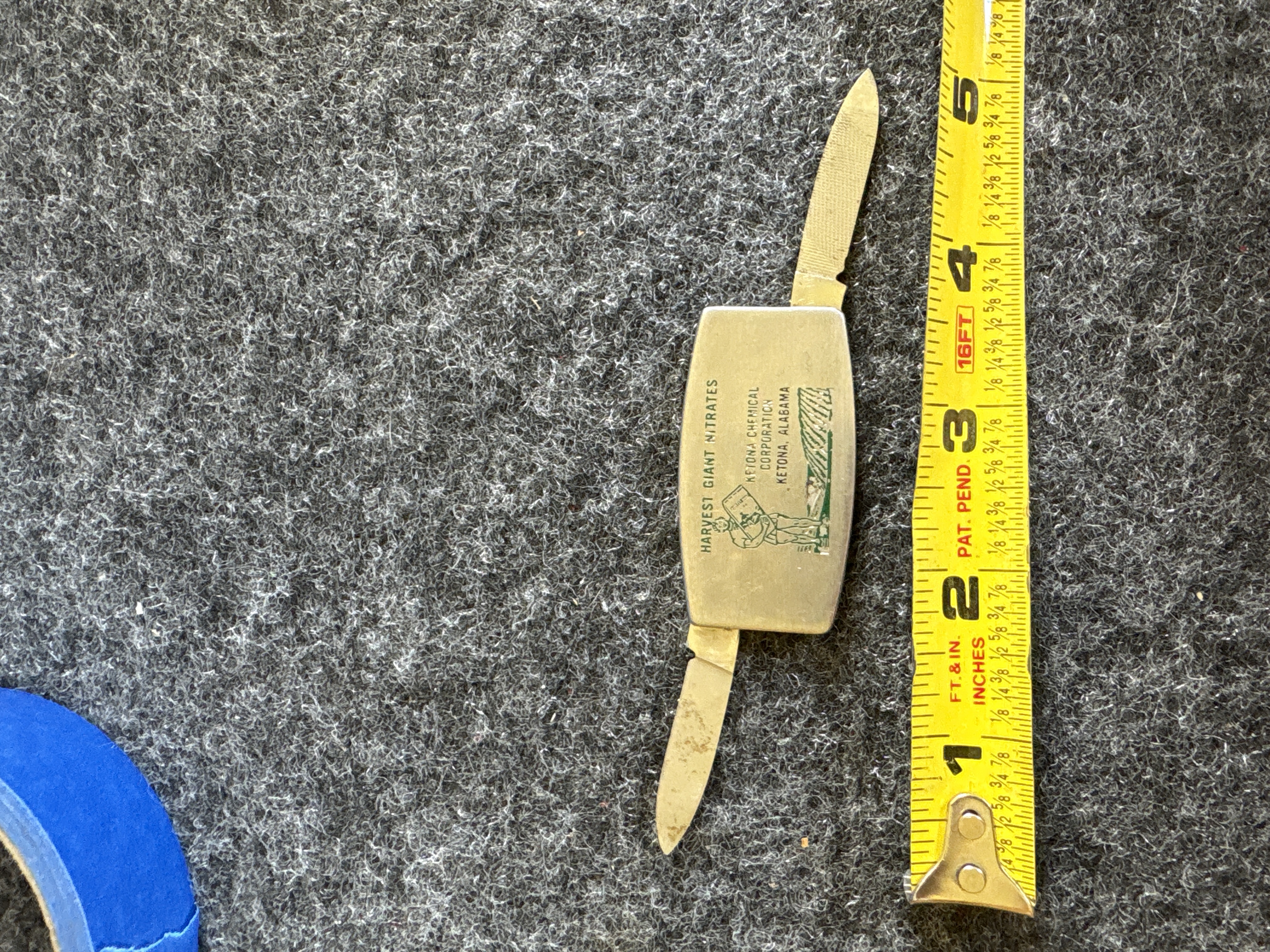 A vintage two-blade folding pocket knife manufactured by the Zippo Manufacturing Company in Bradford, Pennsylvania. The construction consists of brushed stainless steel handles housing two stainless steel components: a pen blade and a nail file blade with an integrated screwdriver tip. The obverse handle features a green and black silkscreened advertisement for Harvest Giant Nitrates, Ketona Chemical Corporation, Ketona, Alabama, including a graphic of a figure carrying a sack. The reverse handle is finished in plain brushed metal. The tang of the pen blade bears the stamp ZIPPO BRADFORD PA.