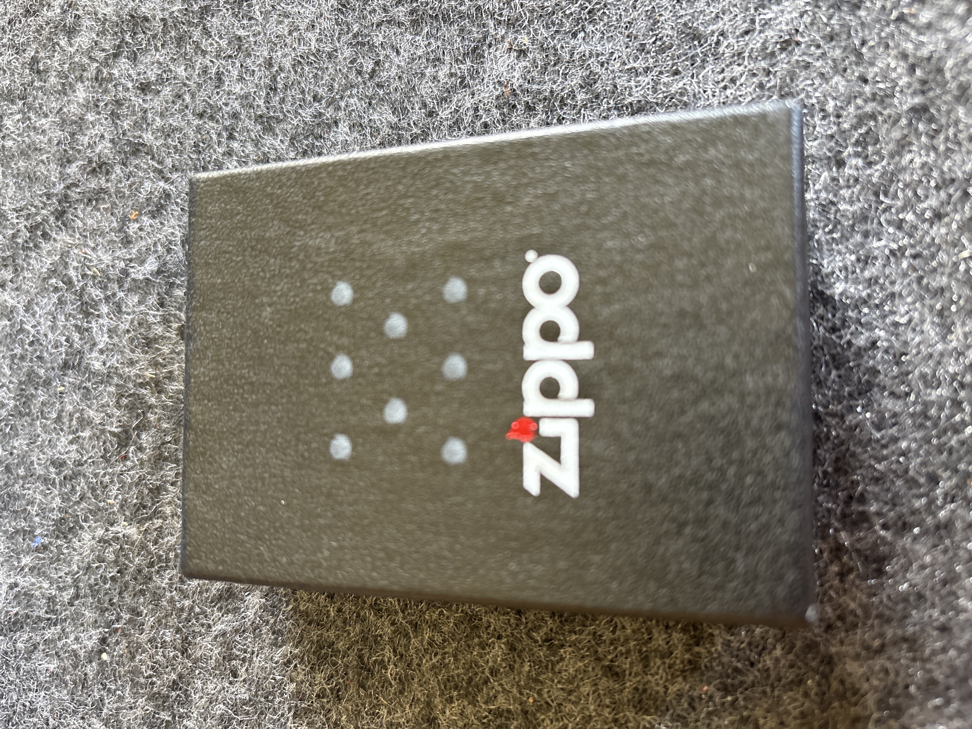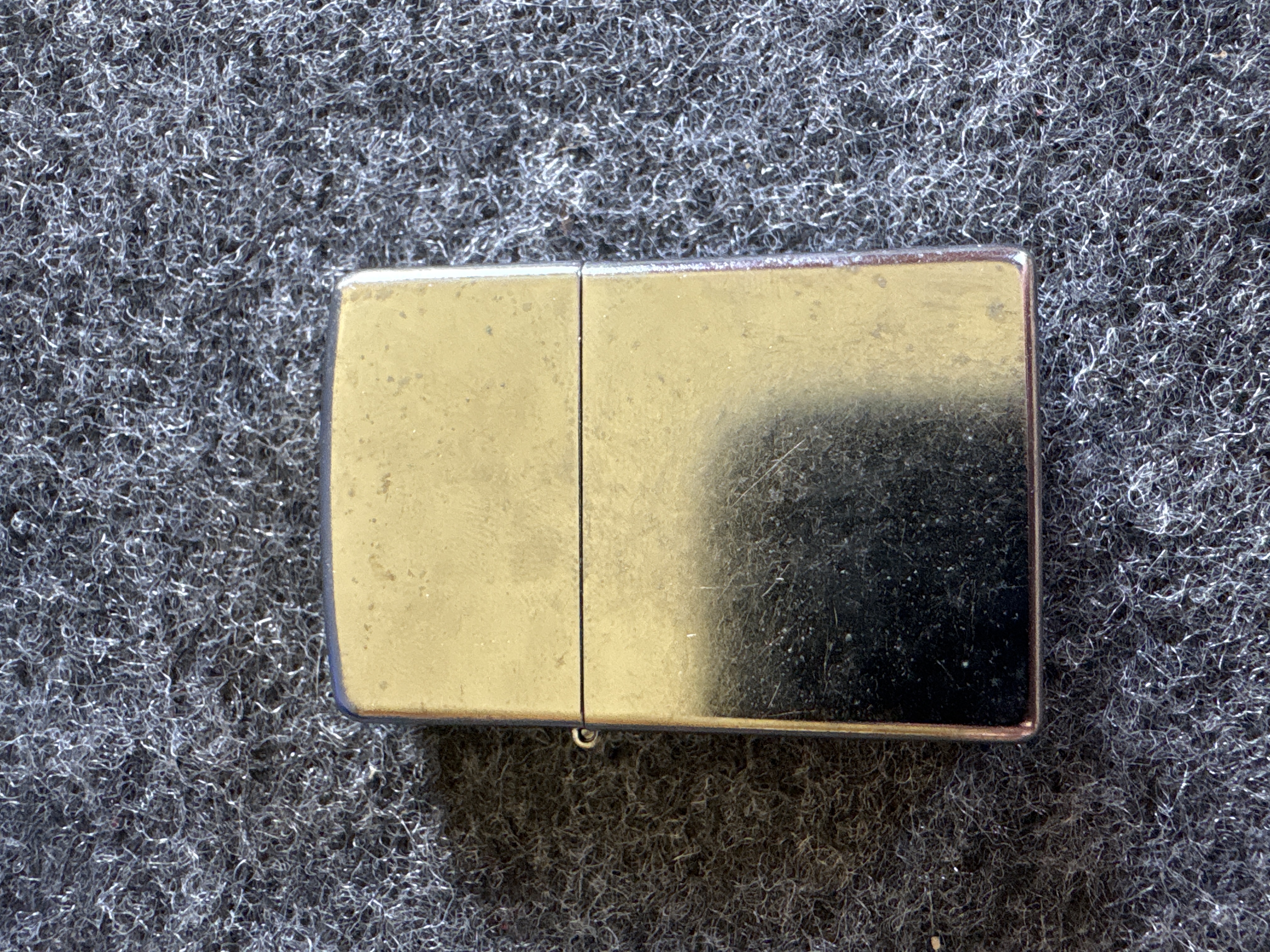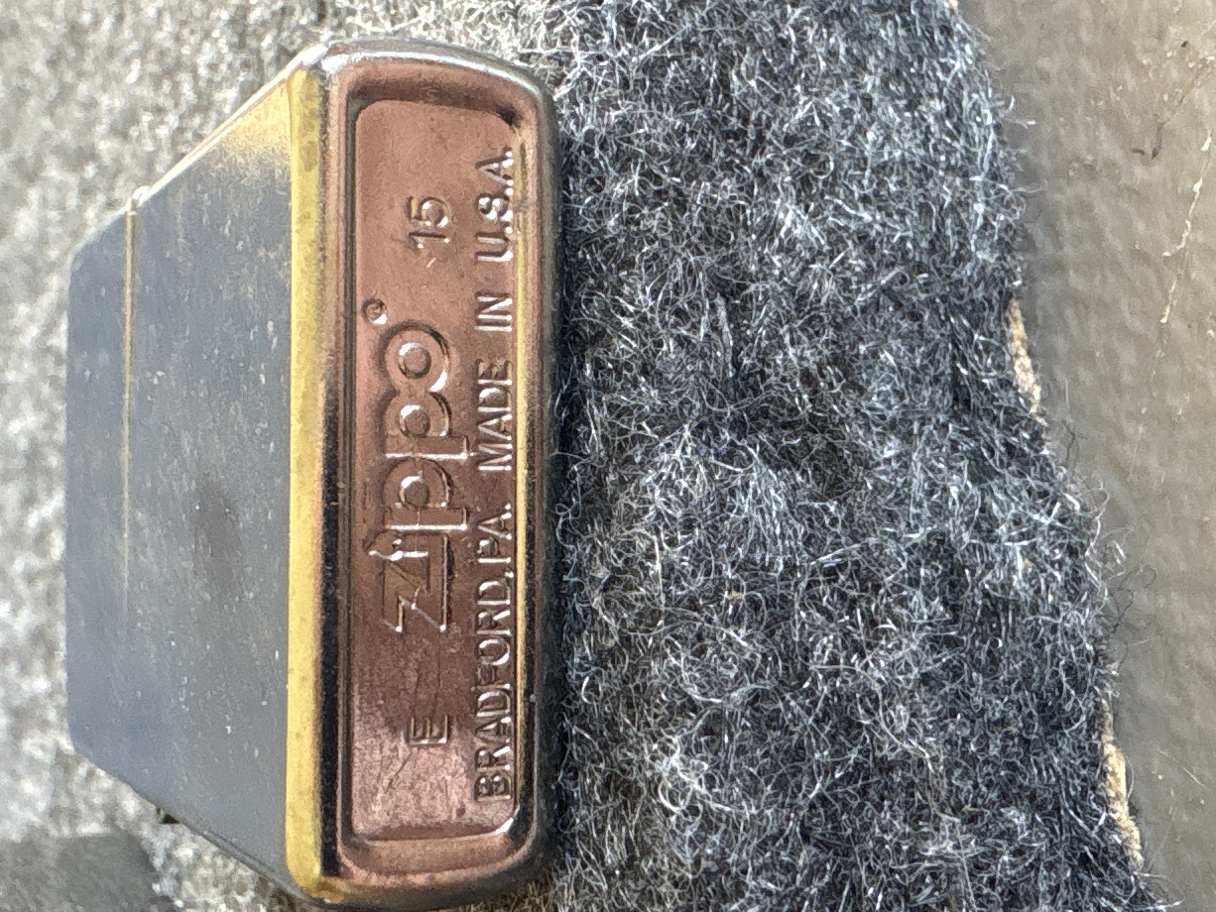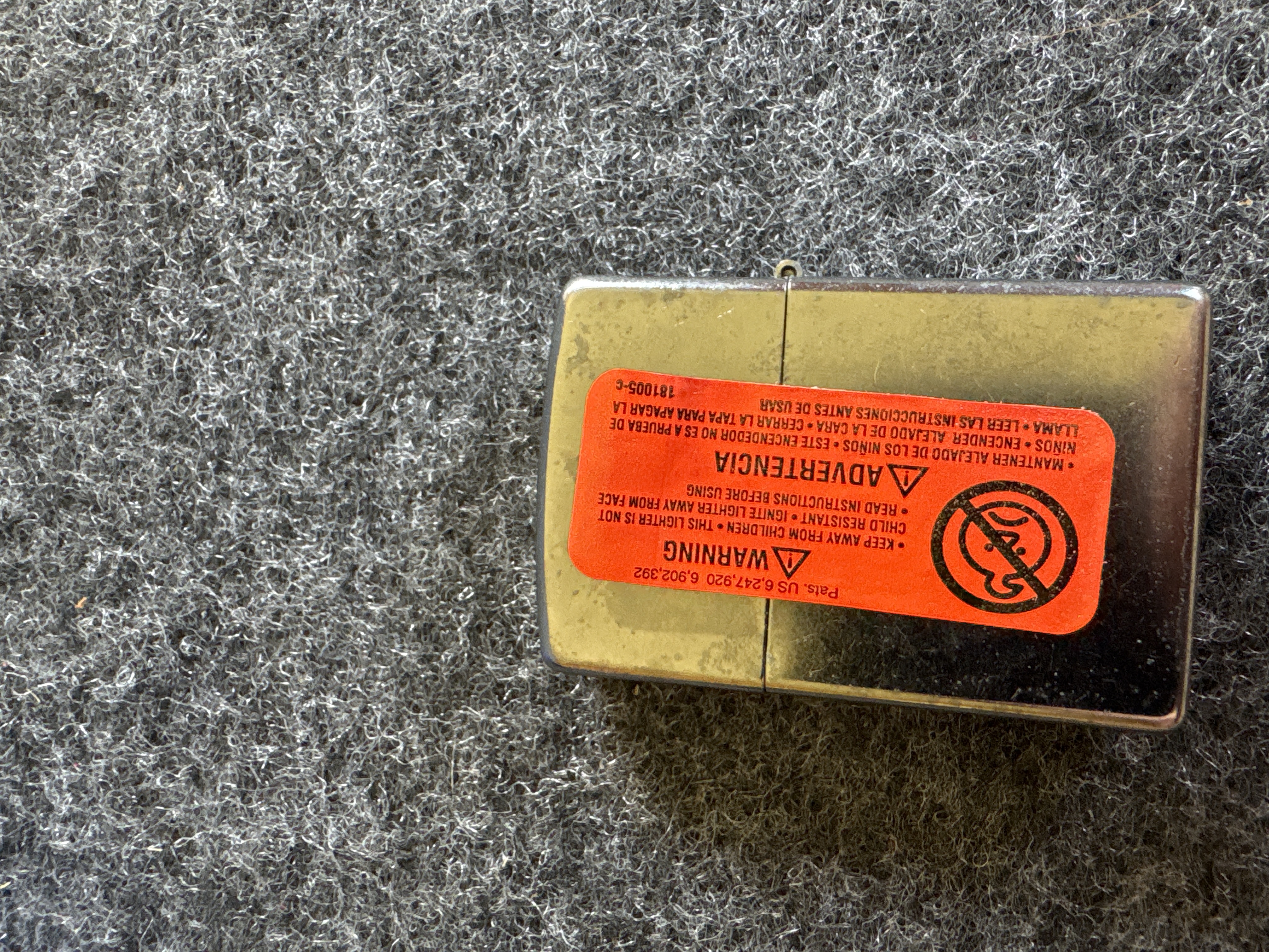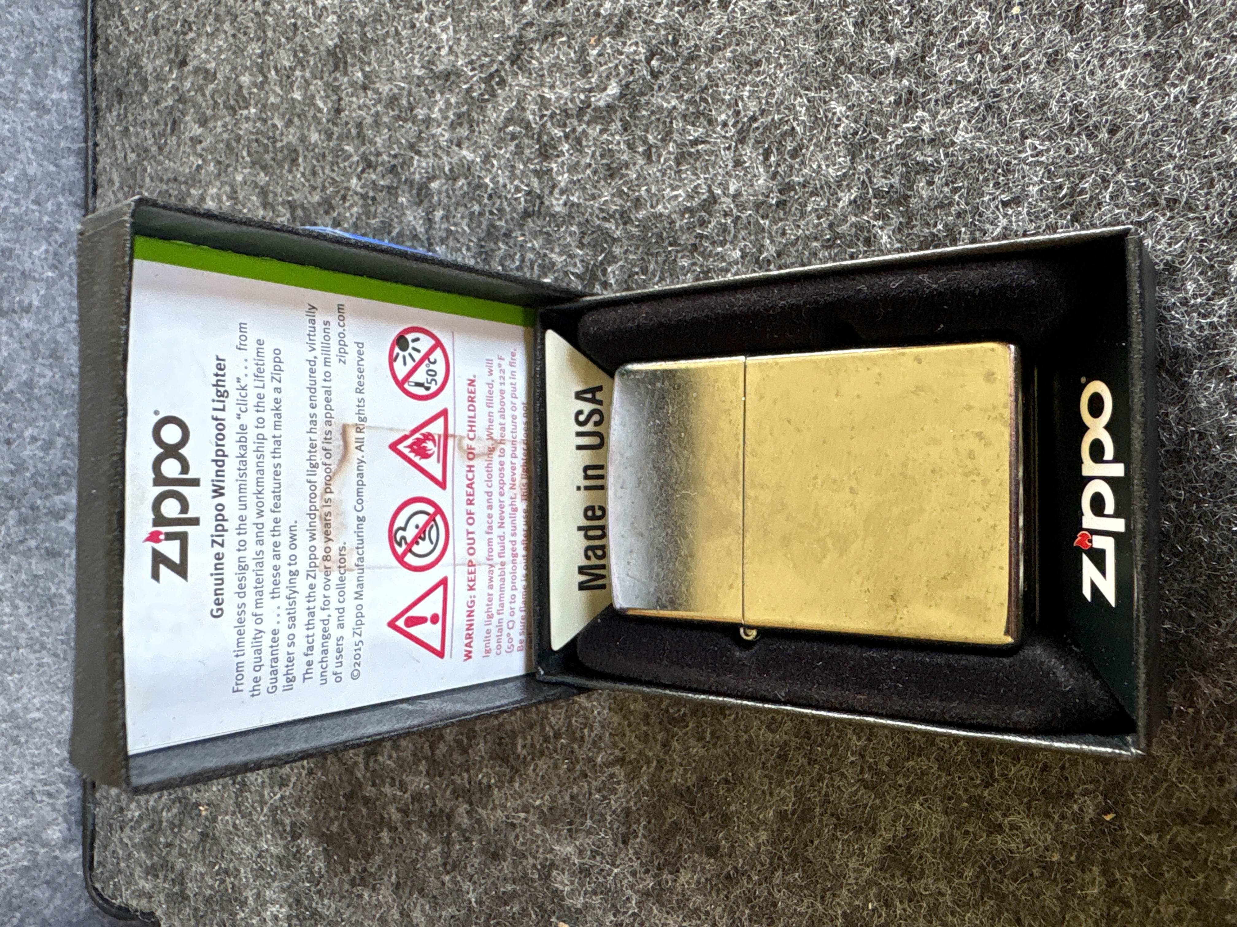 A Zippo Classic Street Brass windproof pocket lighter featuring a gold-toned metal finish. The base of the case is stamped with the letter E and the number 15 surrounding the Zippo logo, identifying the manufacture date as May 2015 in Bradford, Pennsylvania. The reverse side of the lighter retains the original orange safety warning sticker printed in English and Spanish, which includes US patent numbers 6,247,920 and 6,902,392. The item is housed in its original black cardboard retail box with a white Zippo logo and dot pattern. The interior includes a white cardboard insert marked Made in USA and a paper instructional lining with a 2015 copyright.