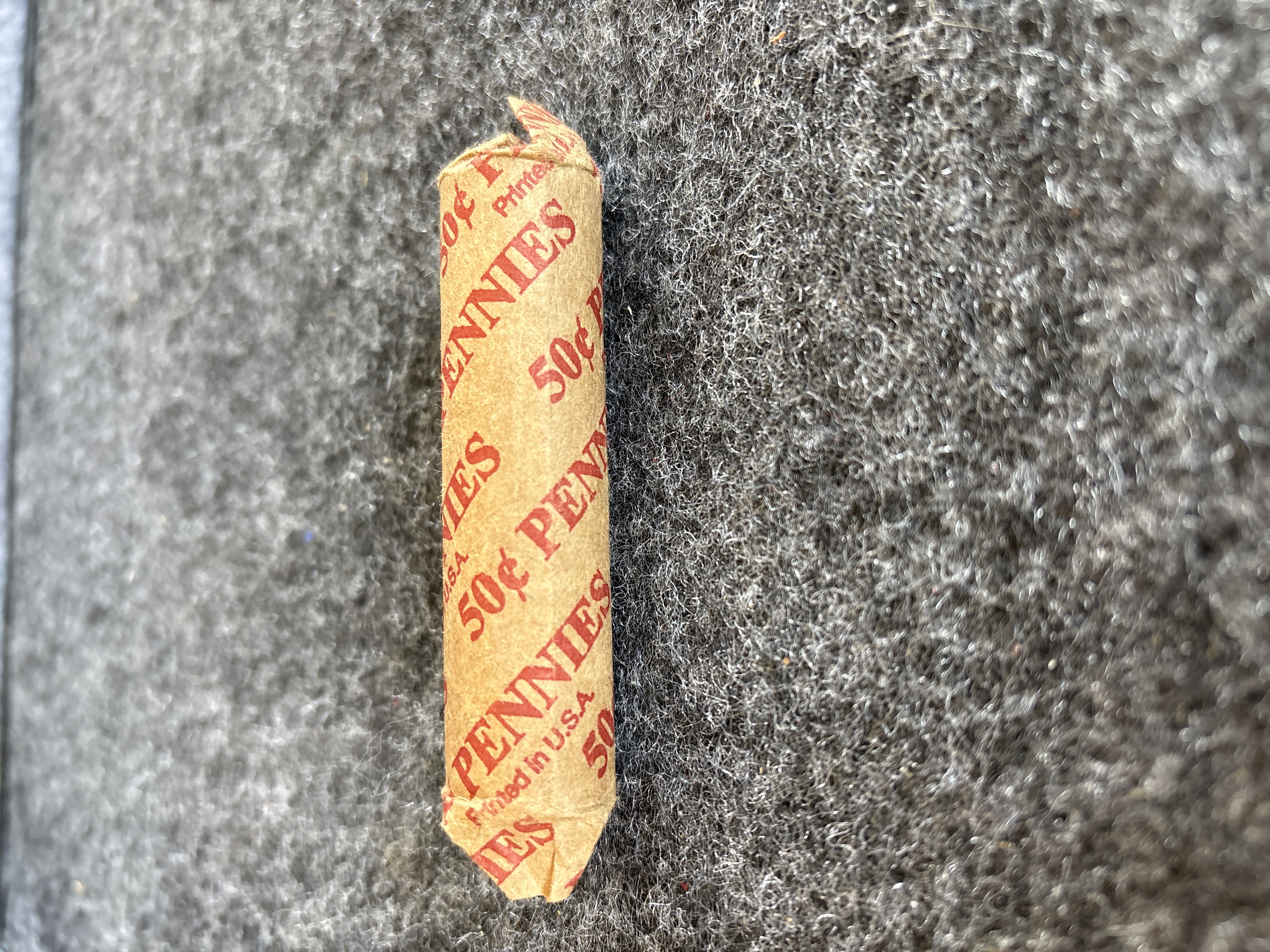 A collection of US Lincoln Wheat Cent coins struck in bronze. This group of pennies features the Lincoln obverse and Wheat Cent reverse design. Visible dates include 1941, 1944, 1948, 1950, 1951, 1953, 1956, and 1958. Denver Mint issues are identified by the D mint mark. All coins possess plain edges. The lot includes a paper coin wrapper printed in red with 50c PENNIES.