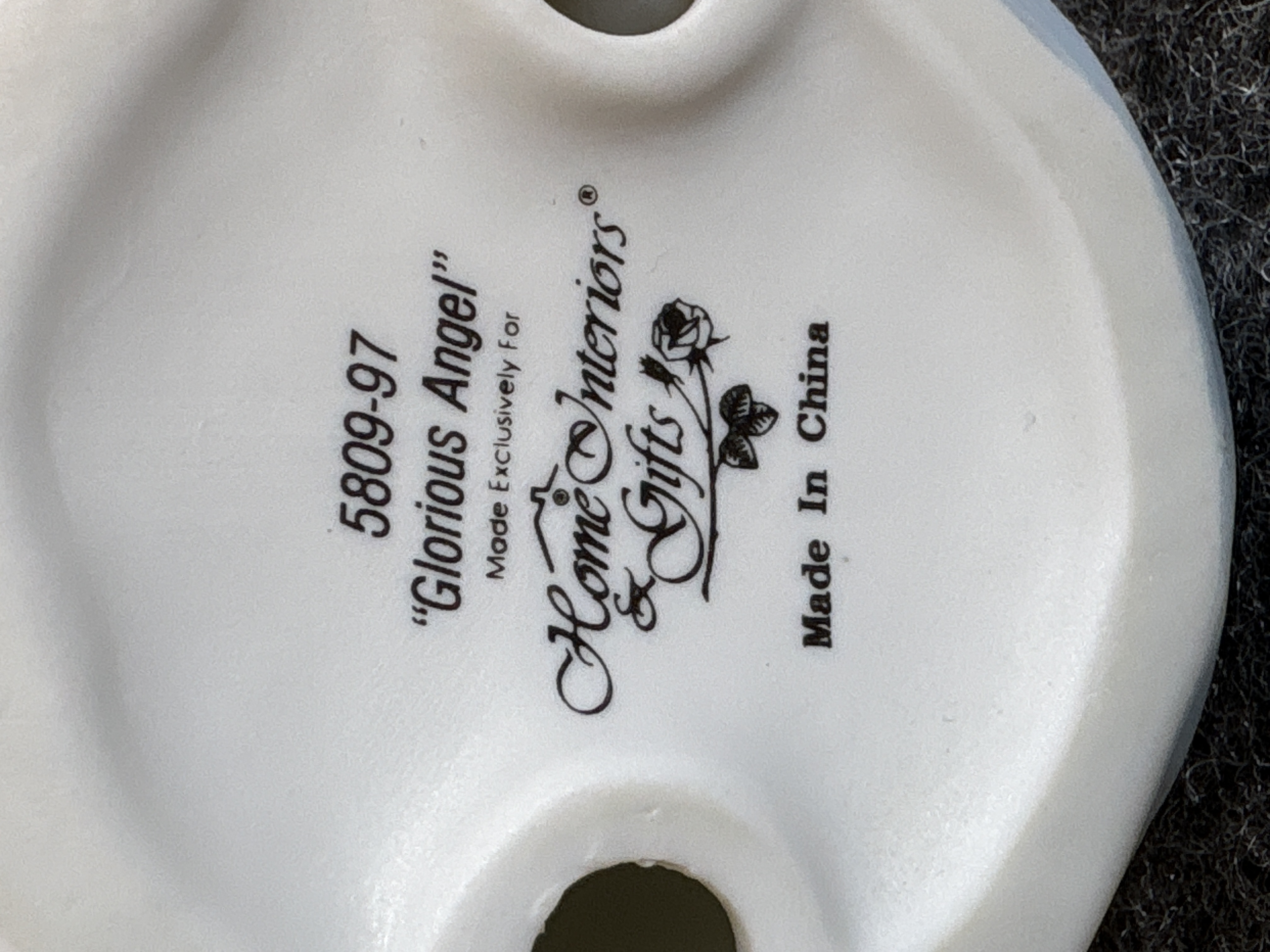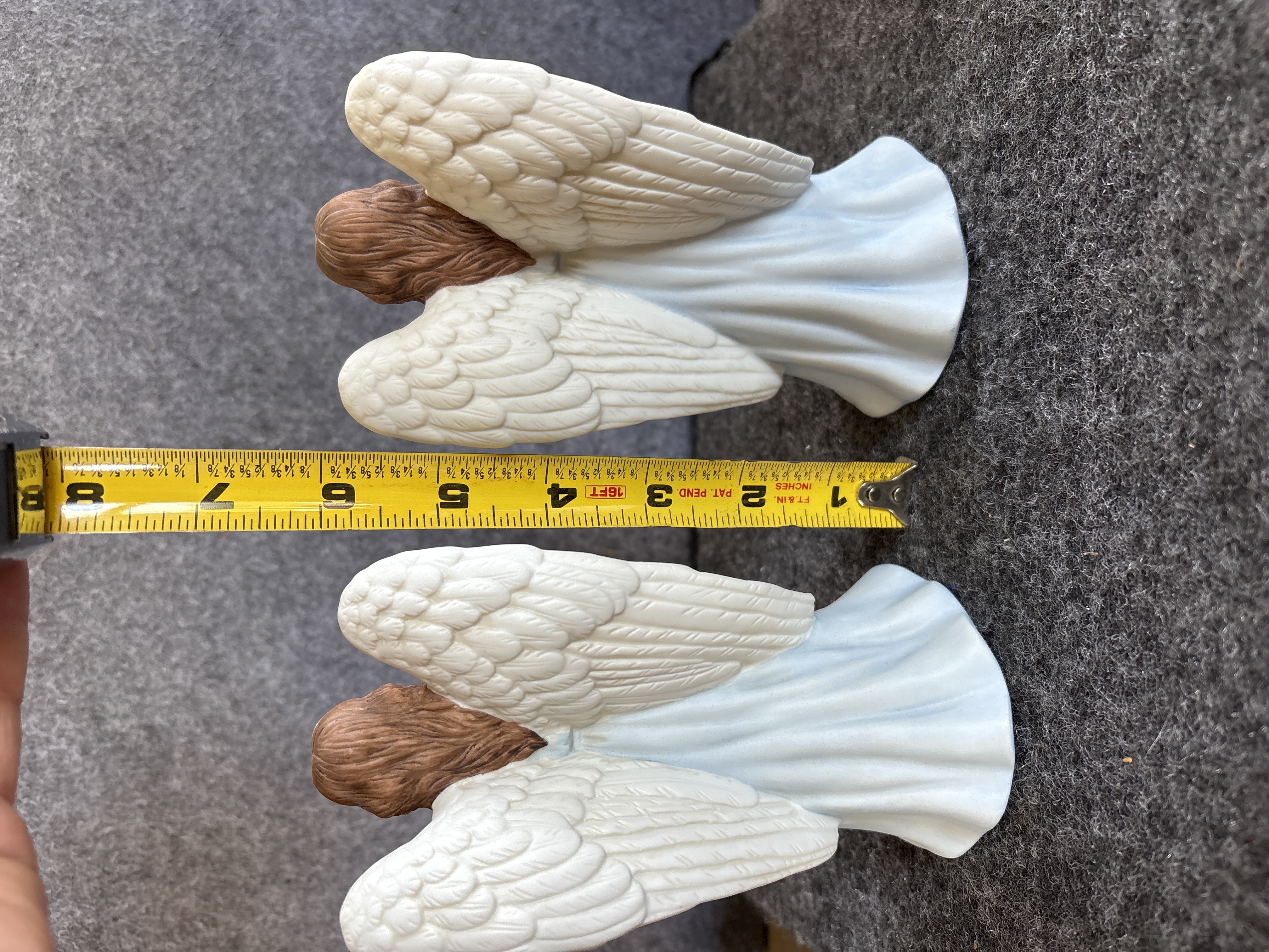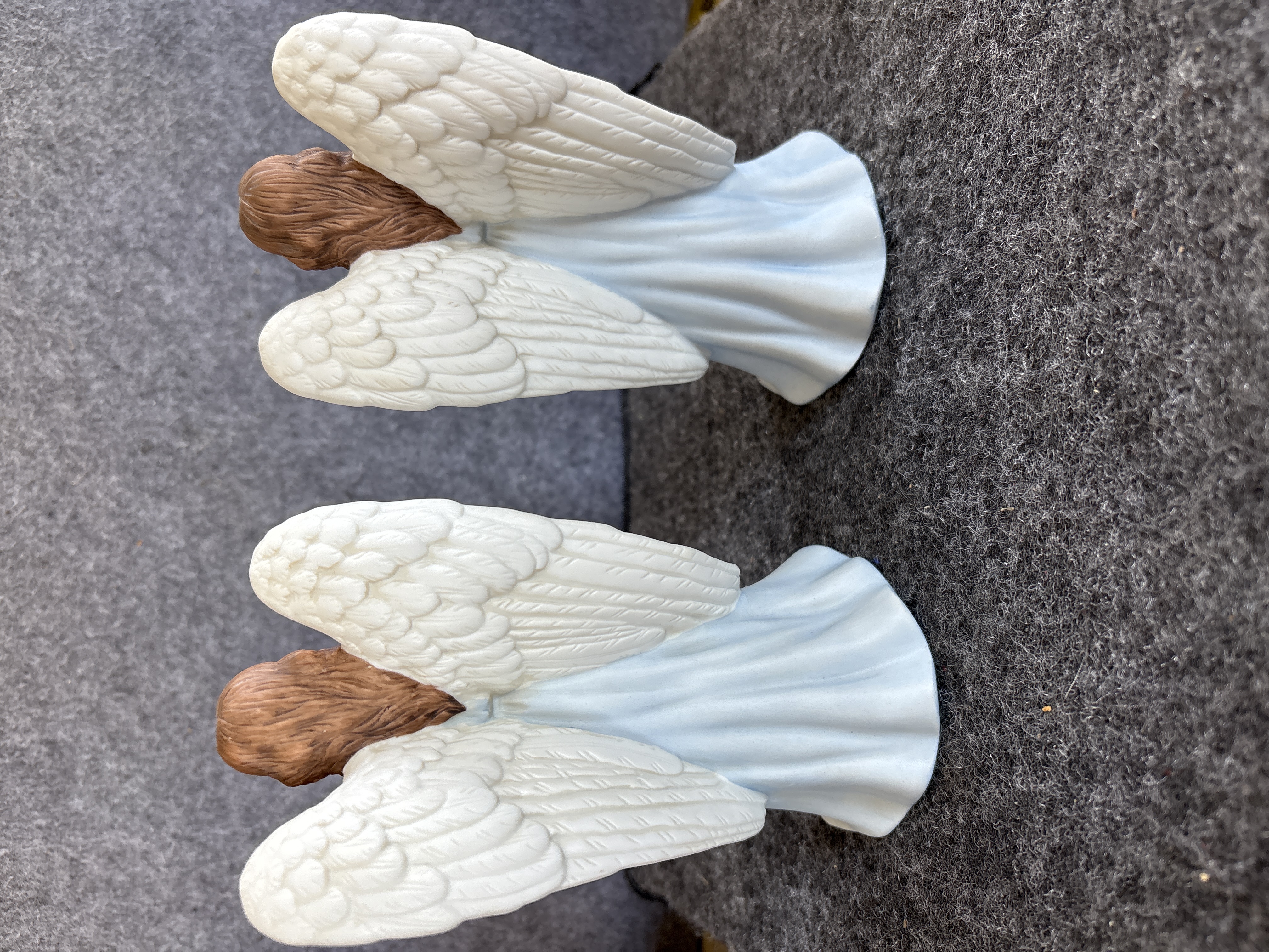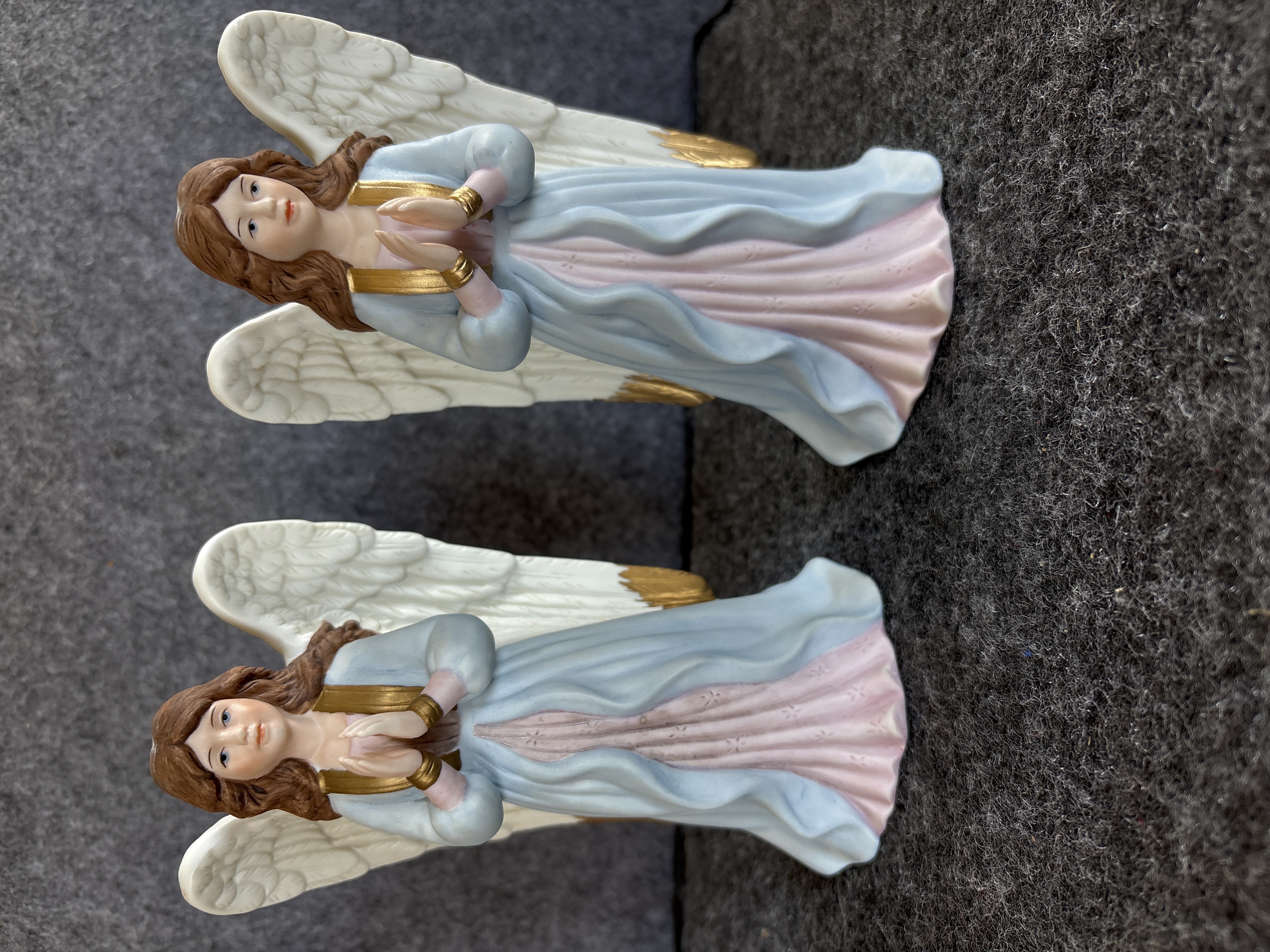 This pair of matching angel figurines is produced from matte-finished bisque porcelain. Each figure is depicted in a standing, prayerful pose with hands clasped at the chest. The angels feature long, wavy brown hair and large white wings with gold-tone accents at the upper tips. They are dressed in flowing, pale blue outer robes over light pink undergarments that display subtle, embossed floral patterns. The base of each figurine is printed in black with the model number 5809-97 and the title Glorious Angel. The mark includes the Home Interiors and Gifts script logo with a stylized house and rose graphic, and states Made in China.