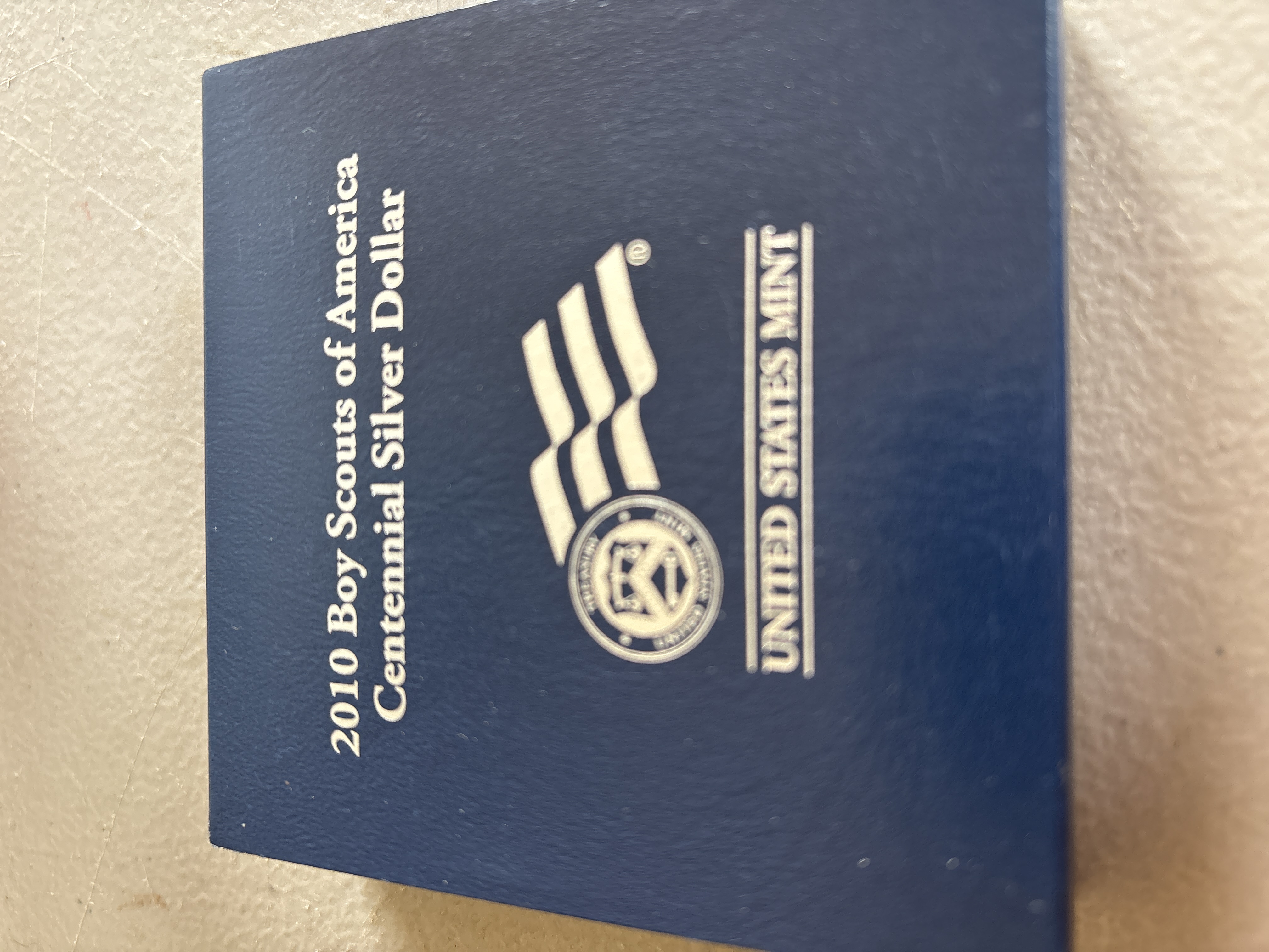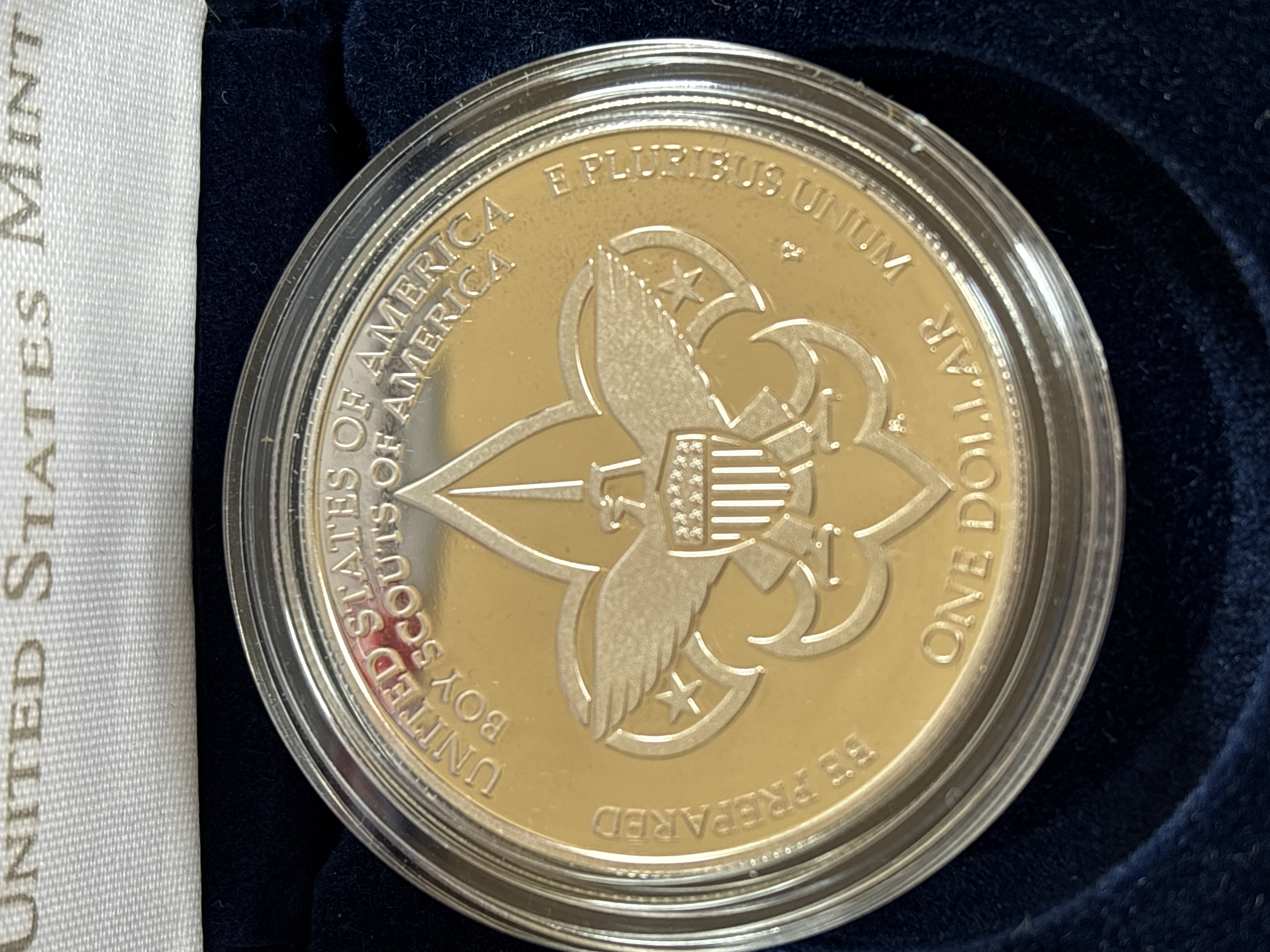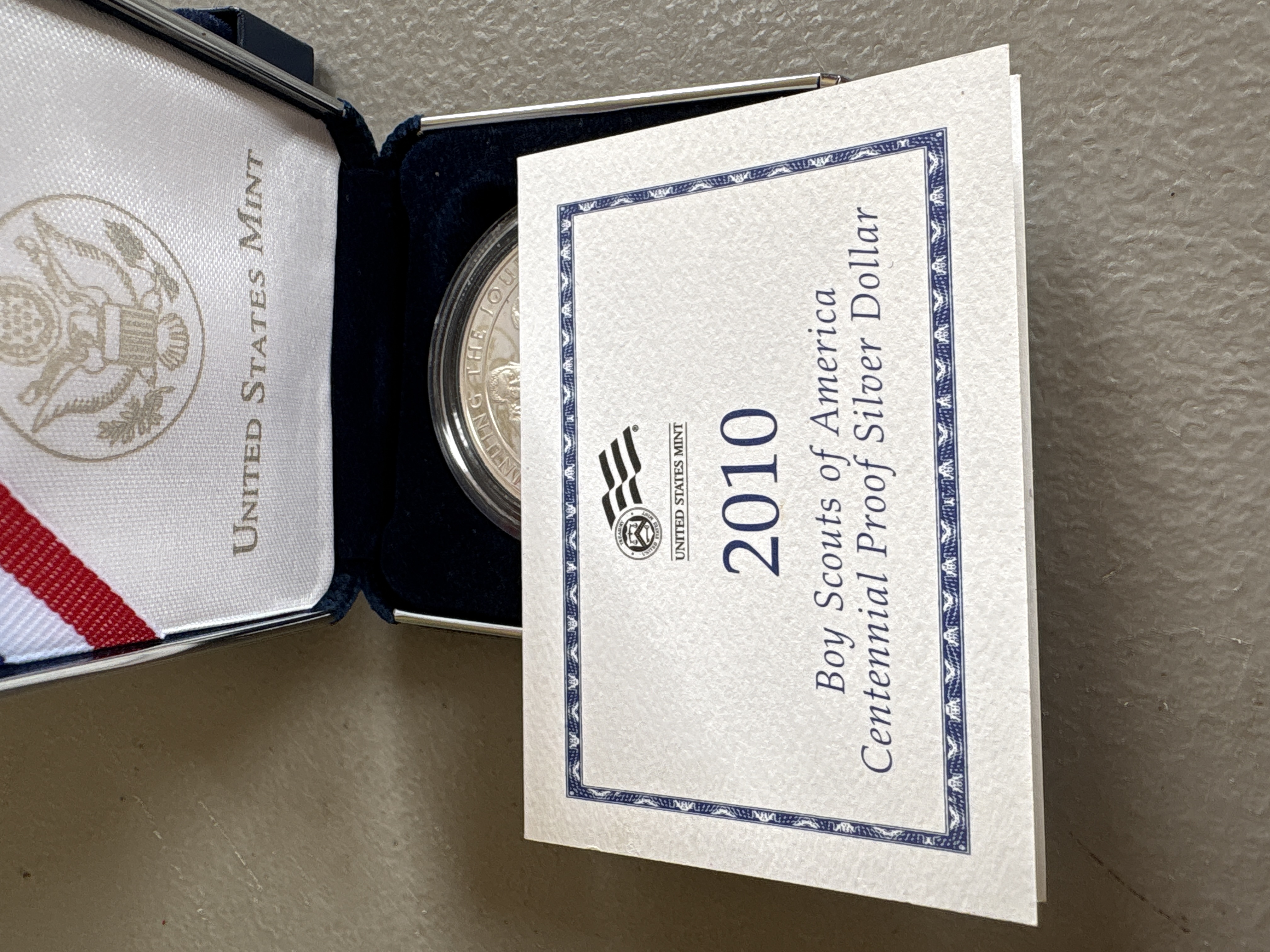 2010-P US Boy Scouts of America Centennial commemorative silver dollar. This coin was struck at the Philadelphia Mint with a proof finish, featuring frosted relief against mirror-like fields. The composition is .900 fine silver (90% silver and 10% copper). The obverse was designed by Donna Weaver and sculpted by Charles L. Vickers. The reverse was designed and sculpted by Jim Licaretz. The coin features a reeded edge and carries inscriptions including Liberty, In God We Trust, United States of America, E Pluribus Unum, and the denomination. This lot includes the original US Mint blue velvet presentation case, outer box, and Certificate of Authenticity.