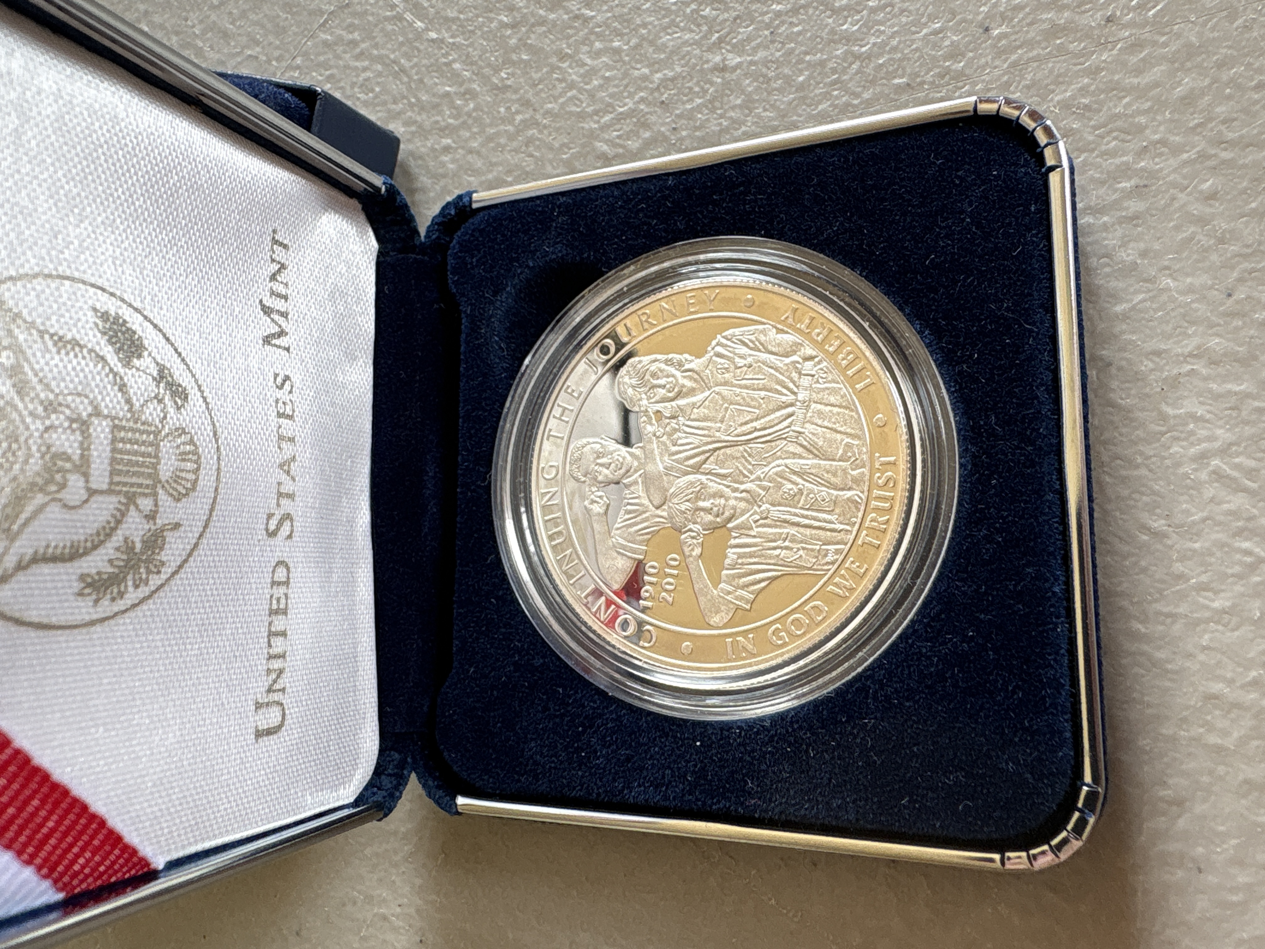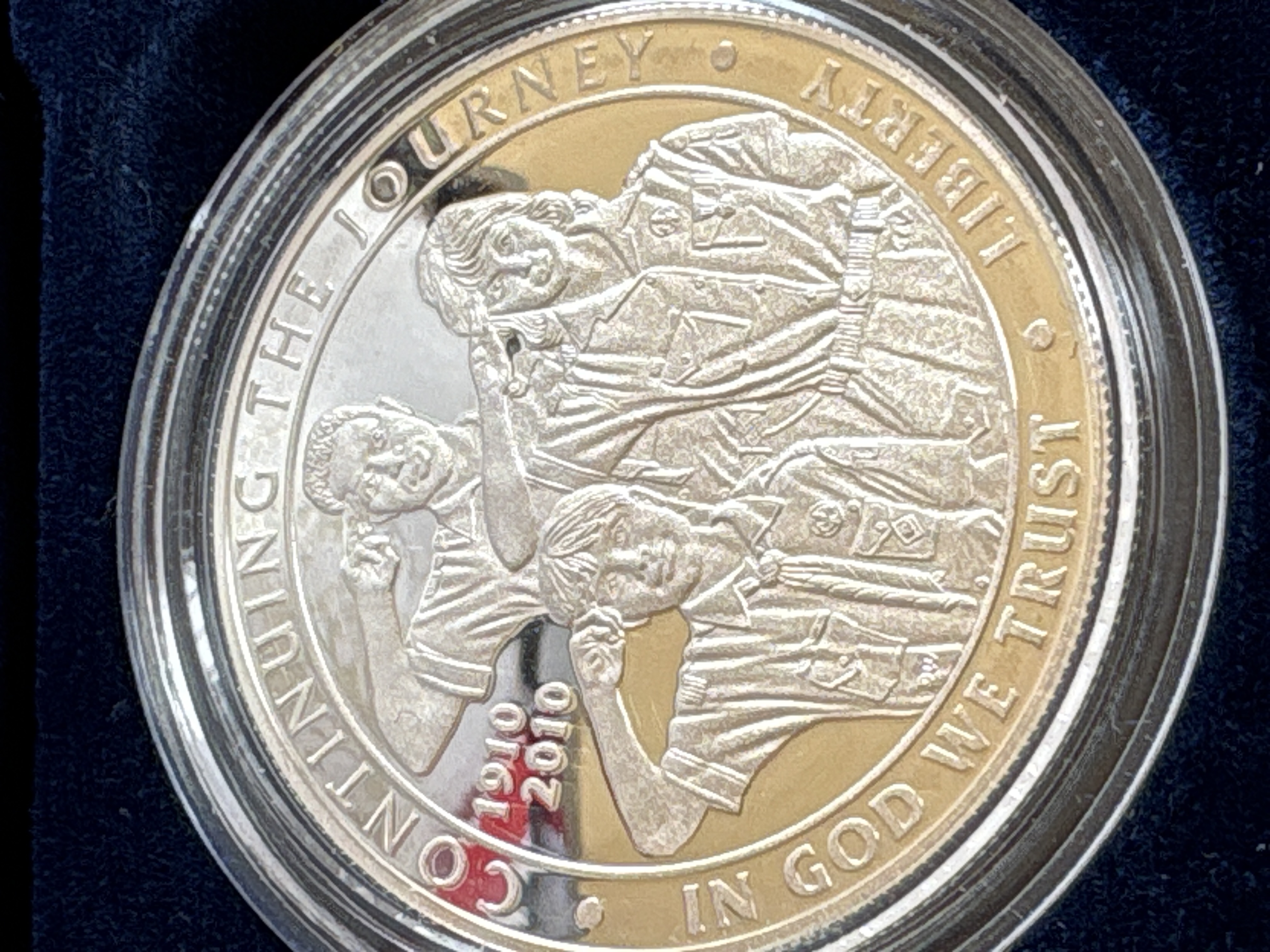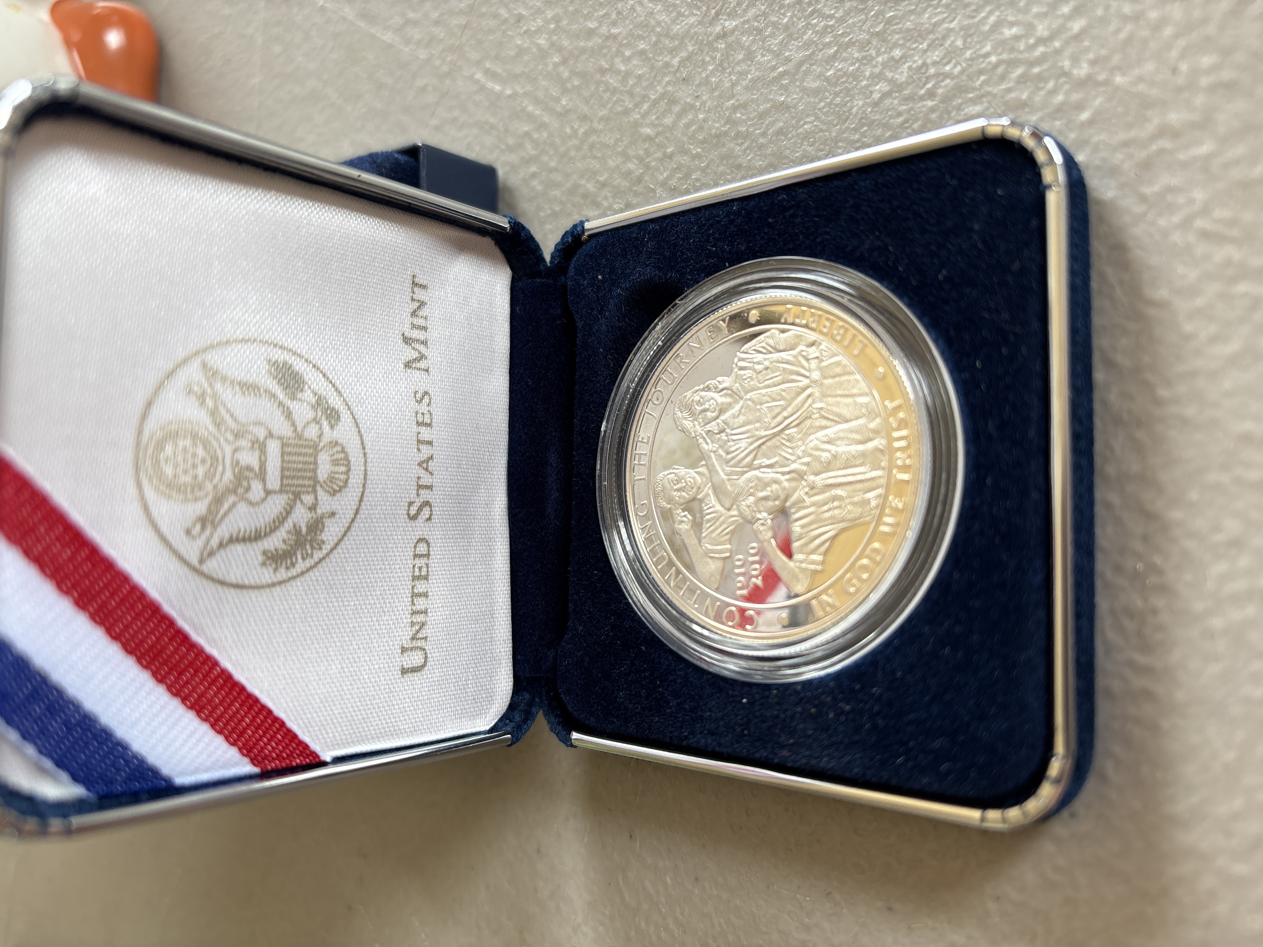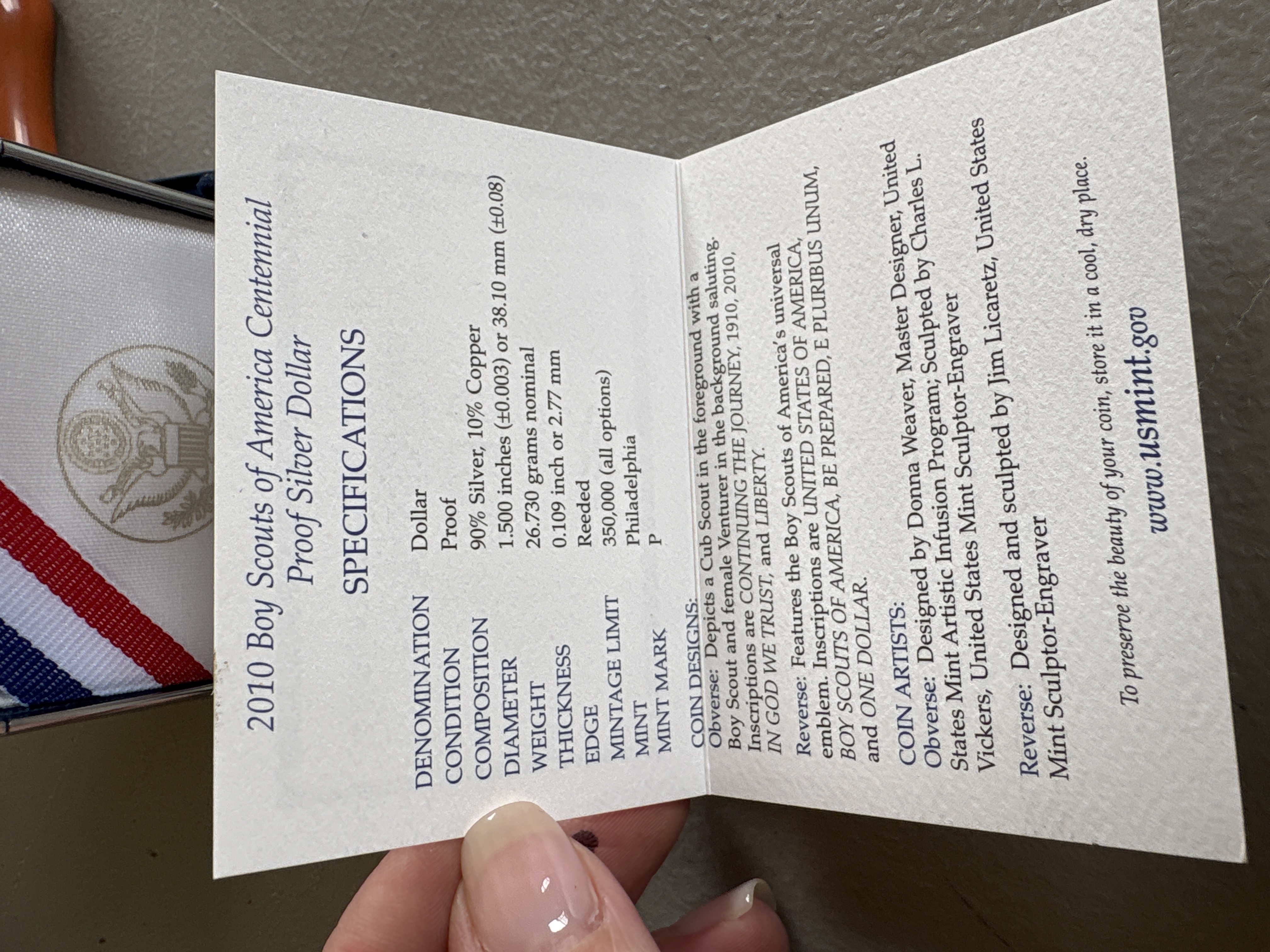 2010-P US Boy Scouts of America Centennial commemorative silver dollar. This coin was struck at the Philadelphia Mint with a proof finish, featuring frosted relief against mirror-like fields. The composition is .900 fine silver (90% silver and 10% copper). The obverse was designed by Donna Weaver and sculpted by Charles L. Vickers. The reverse was designed and sculpted by Jim Licaretz. The coin features a reeded edge and carries inscriptions including Liberty, In God We Trust, United States of America, E Pluribus Unum, and the denomination. This lot includes the original US Mint blue velvet presentation case, outer box, and Certificate of Authenticity.