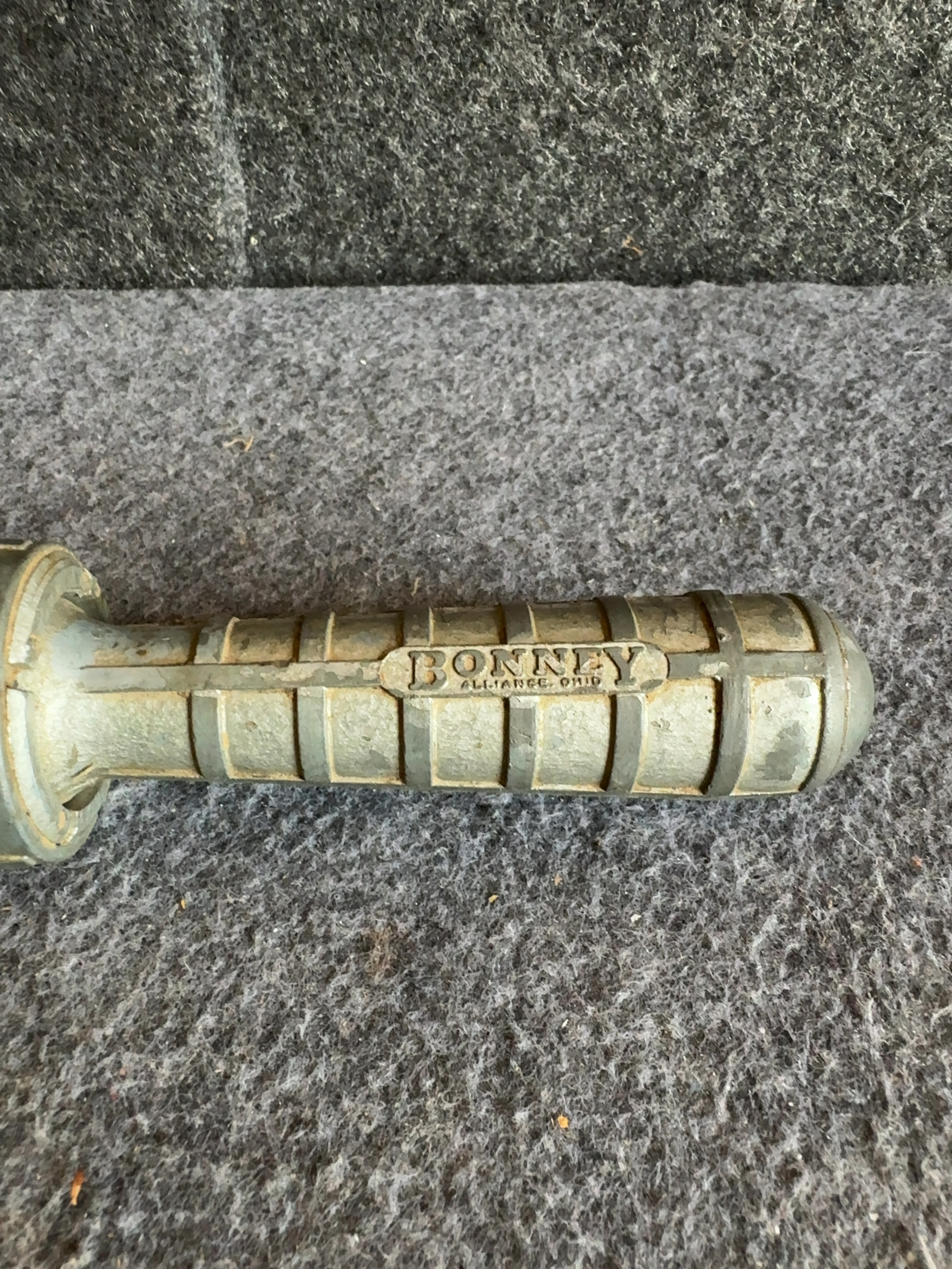 This vintage industrial hand tool is a jab saw or close-quarter hacksaw blade holder manufactured by Bonney. The tool was produced in Alliance, Ohio, as indicated by the cast markings on the handle. The construction consists of a cast metal handle featuring a ribbed, textured grip and a circular hand guard. One side of the handle is cast with the manufacturer name BONNEY and the location ALLIANCE, OHIO. The opposite side is cast with PAT. PEND., JAB SAW, and U.S.A. A steel support guide is fitted to the handle to hold a standard hacksaw blade, allowing for cutting in tight spaces. The steel guide is stamped with the text TEMPERED STEEL. The item includes a removable tempered steel blade with a blue finish.