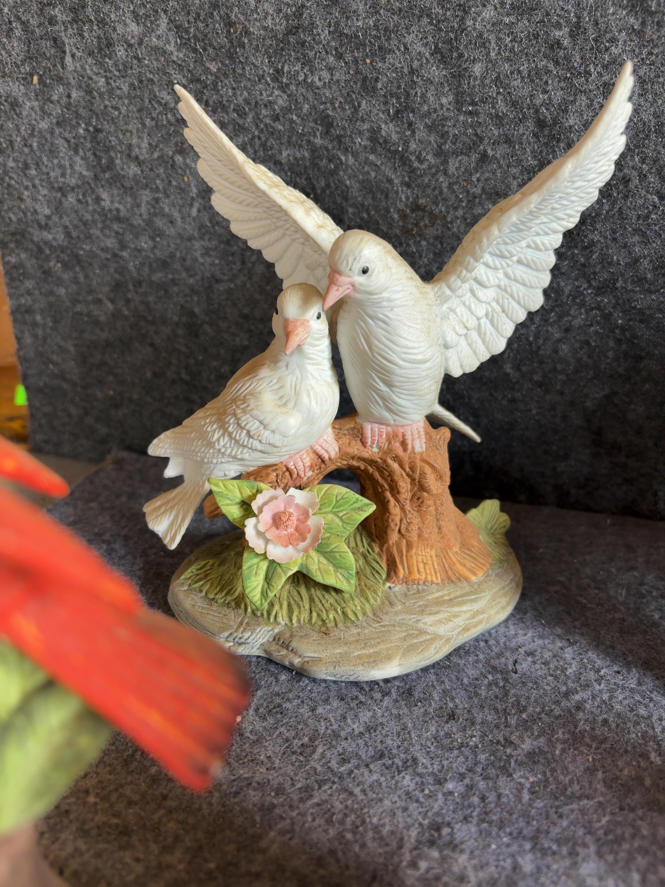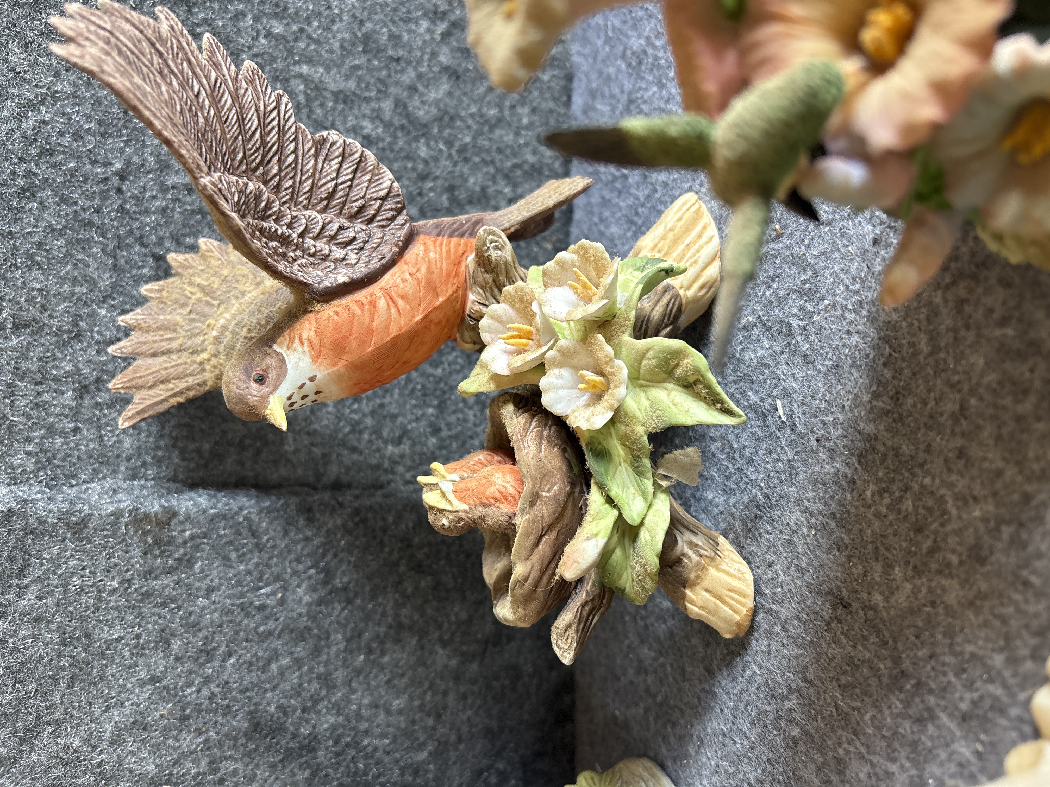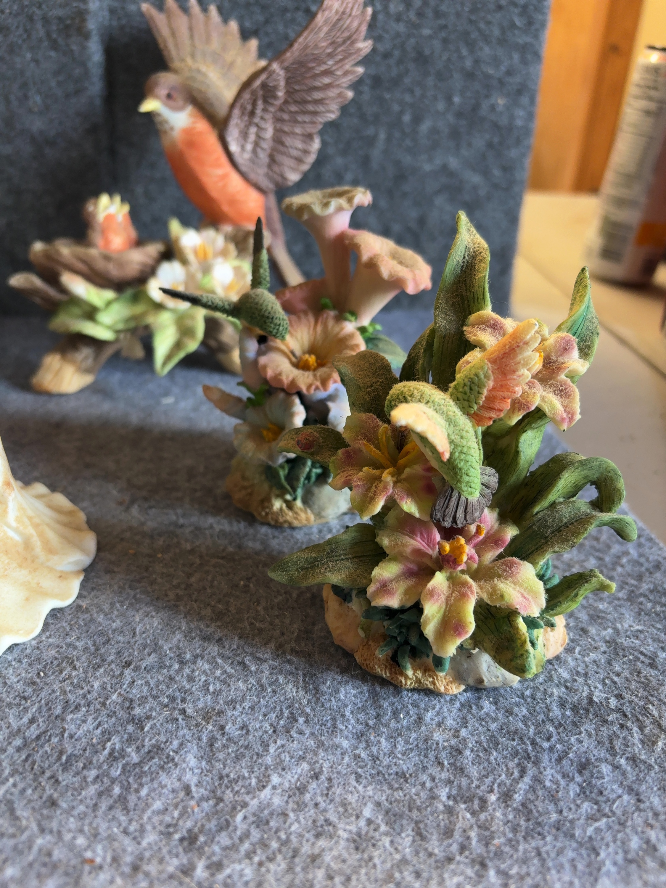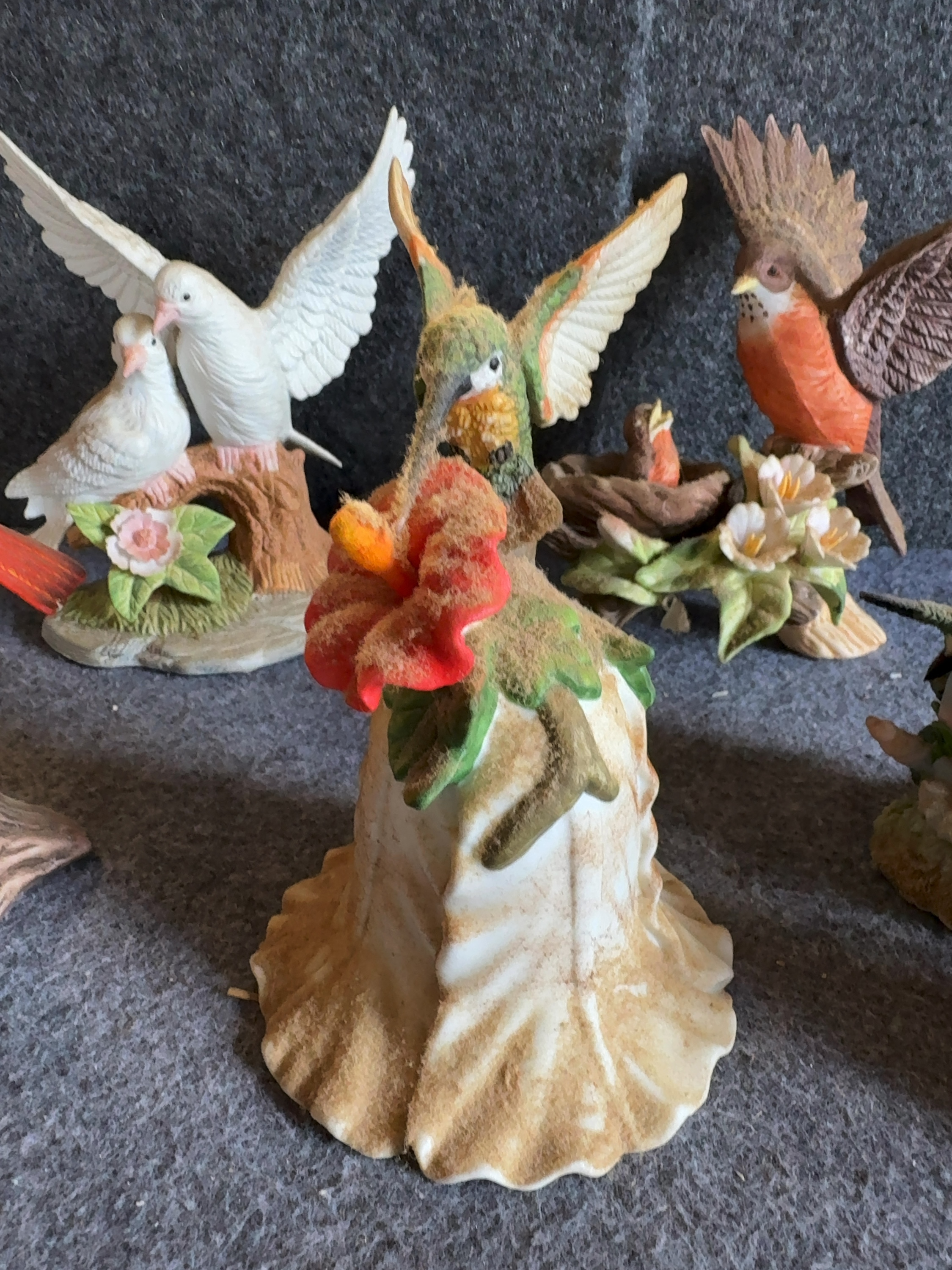 A collection of hand painted bisque porcelain bird figurines attributed to Andrea by Sadek. The group features various North American songbird species depicted in naturalistic settings. The collection includes a male Northern Cardinal perched above a nest with three speckled eggs, a pair of white doves on a branch with a pink flower, and a decorative bell with a hummingbird handle hovering over a red hibiscus. Also included are an American Robin in flight returning to a nest with two hatchlings and studies of hummingbirds hovering over various pink, yellow, and orange blossoms. Each piece is crafted from unglazed bisque porcelain with a matte finish and detailed hand painted accents. No manufacturer marks or signatures are visible on the exterior surfaces.