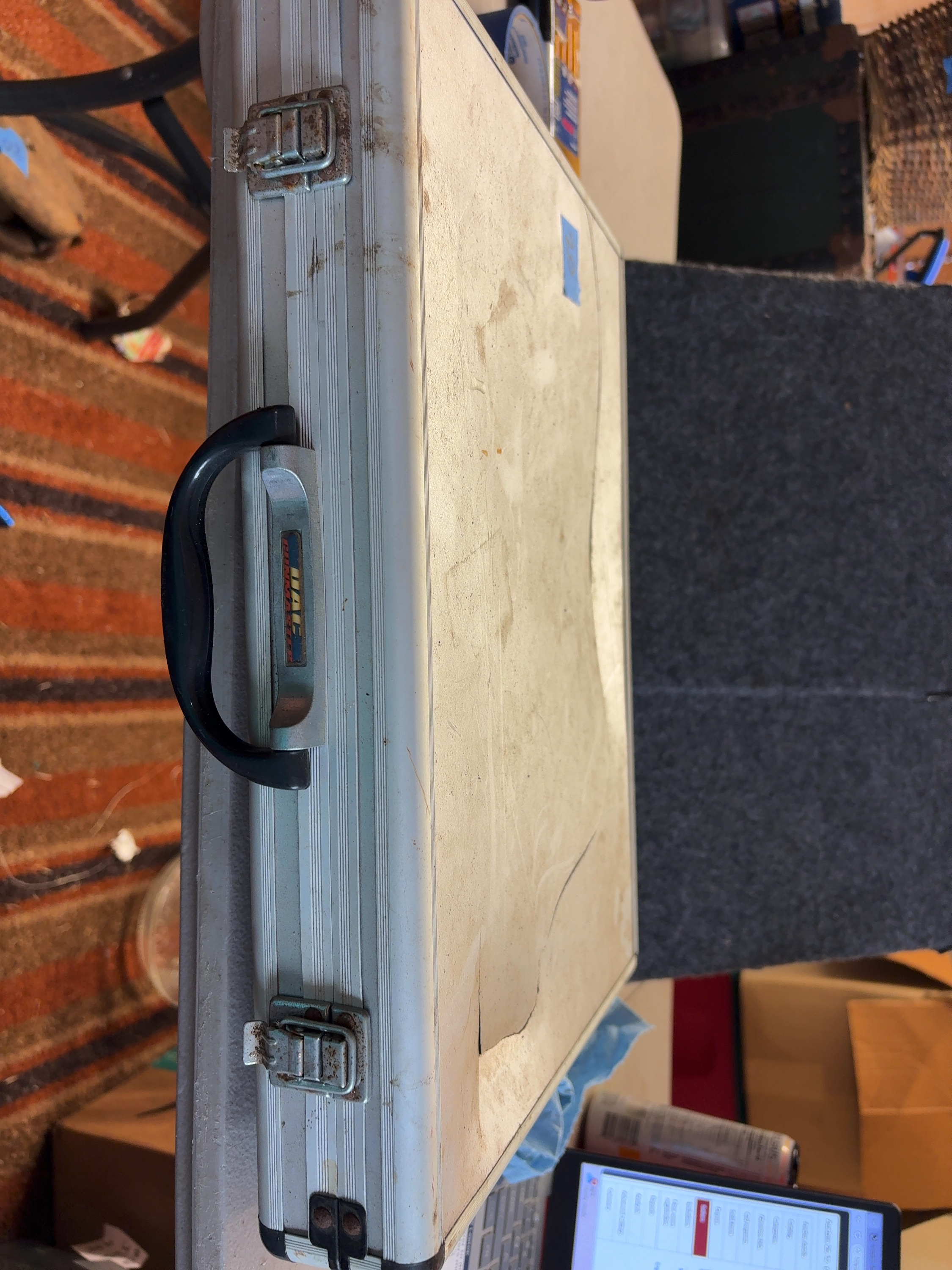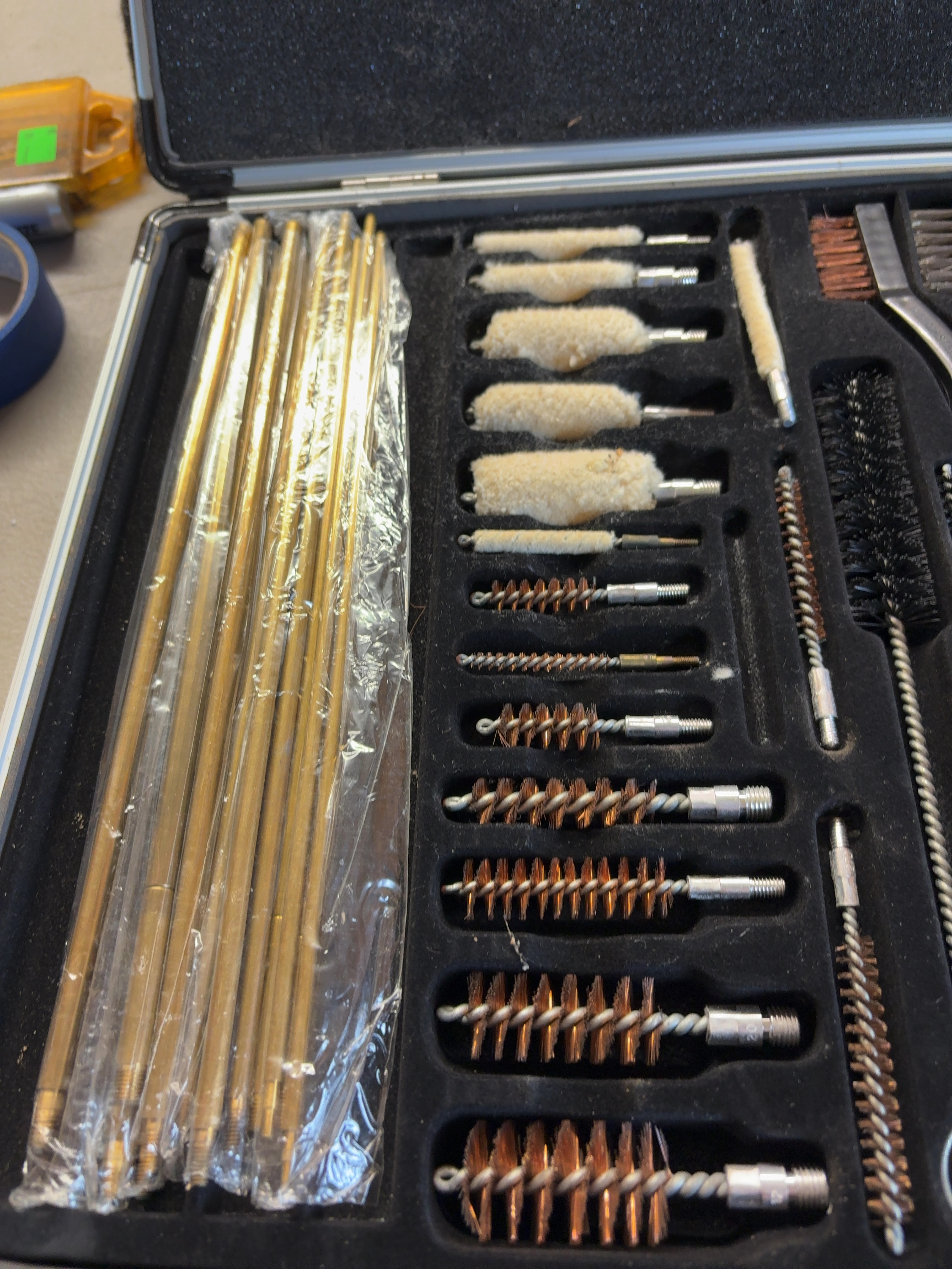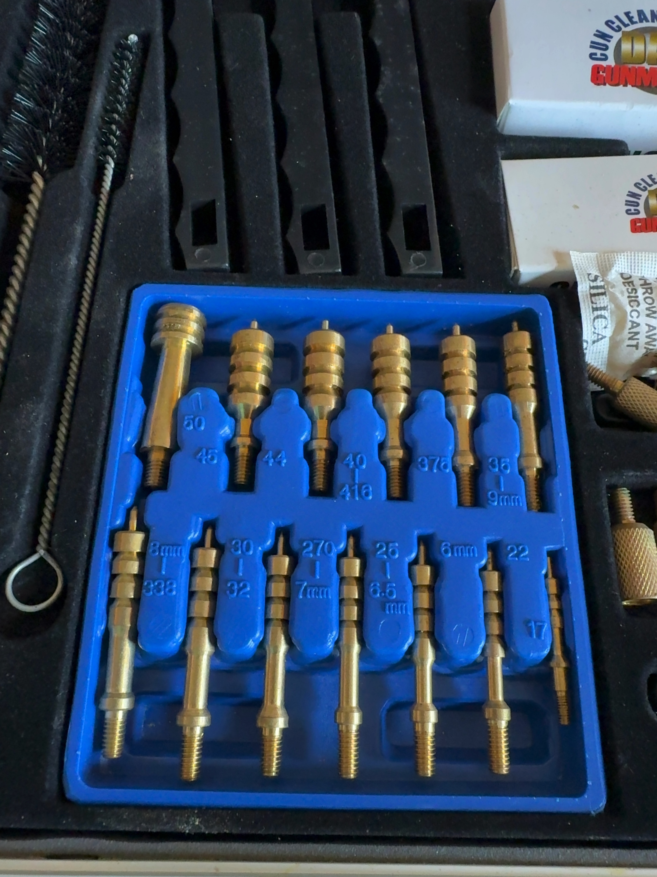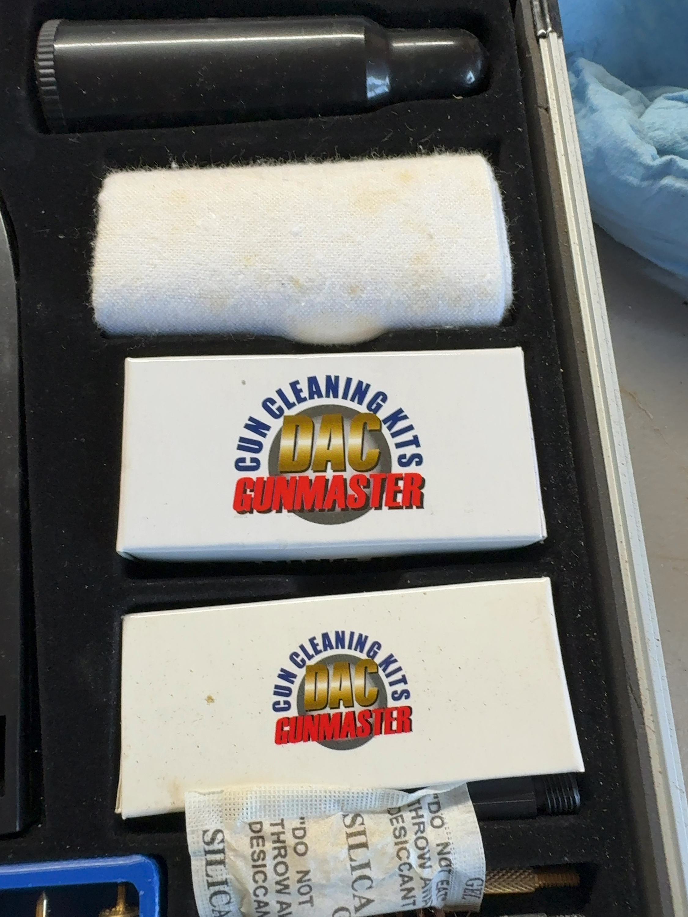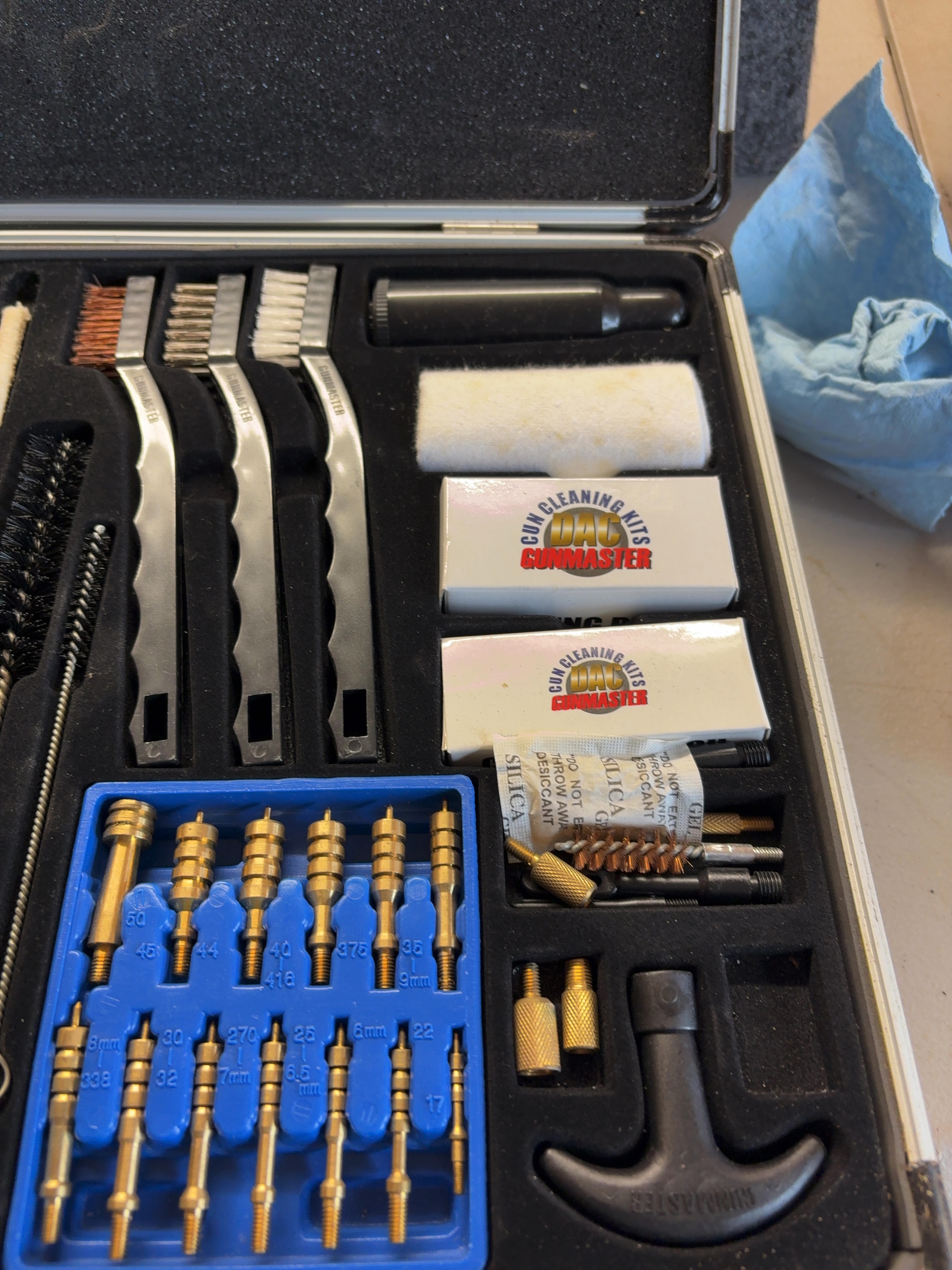 A DAC Gunmaster Deluxe Universal Gun Cleaning Kit housed in a silver-tone aluminum-style hard carry case with a black plastic handle and metal latches. The interior features a fitted foam organizer containing a comprehensive assortment of cleaning tools. Components include multiple brass cleaning rod sections, a black plastic T-handle marked Gunmaster, and a blue plastic organizer tray containing thirteen brass jags. The jags are labeled for various calibers including .50, .45, .44, .40/.416, .375, .35/9mm, 8mm/.338, .30/.32, .270/7mm, .25/6.5mm, 6mm, .22, and .17. The set further includes ten bronze bore brushes of varying sizes, six cotton mops, three double-ended utility brushes with nylon, steel, and bronze bristles, two long-reach brushes, and various brass adapters. Additional accessories comprise a small black plastic bottle for oil or solvent, two boxes of DAC Gunmaster cleaning patches, and a roll of cleaning cloth.