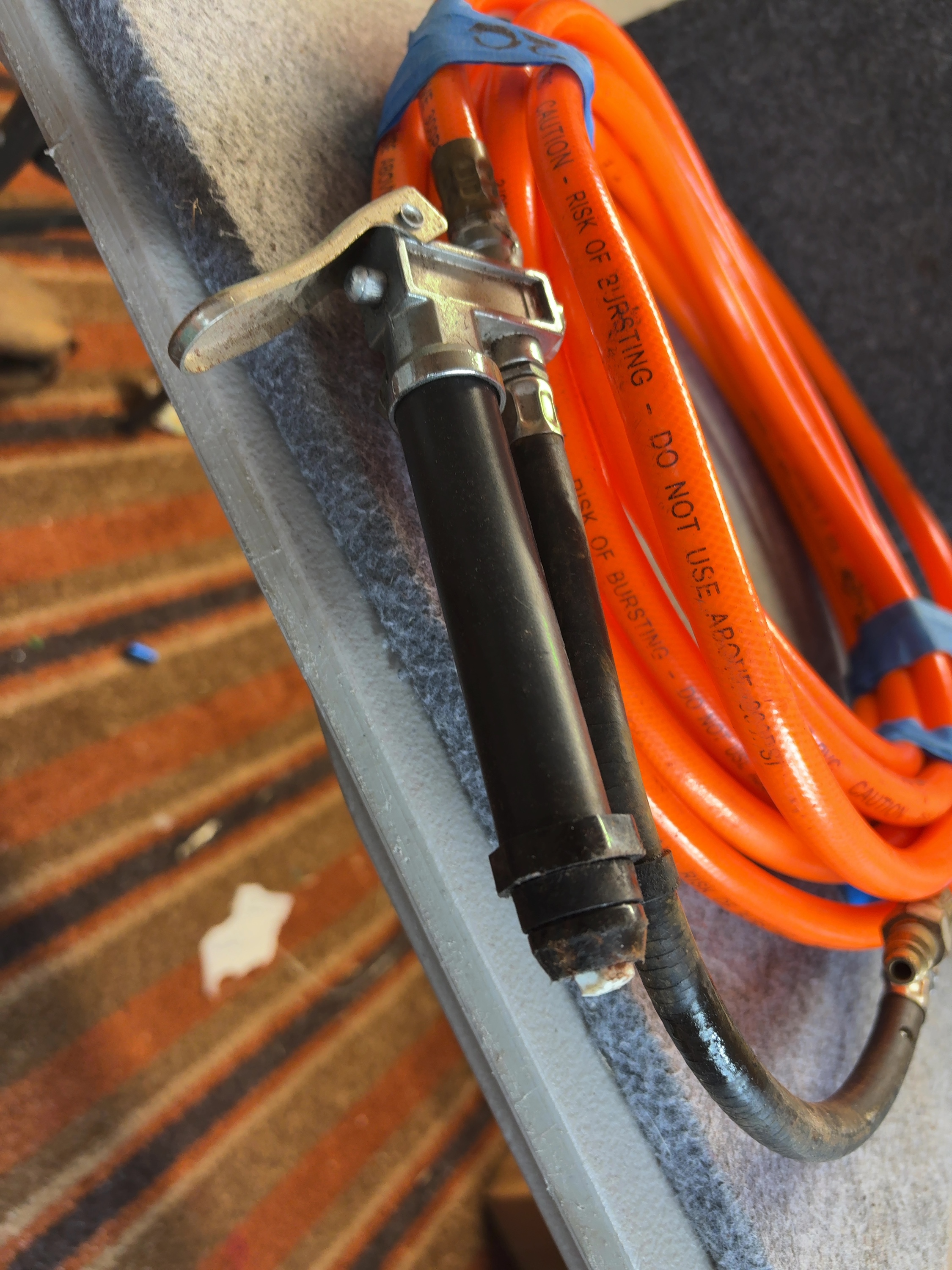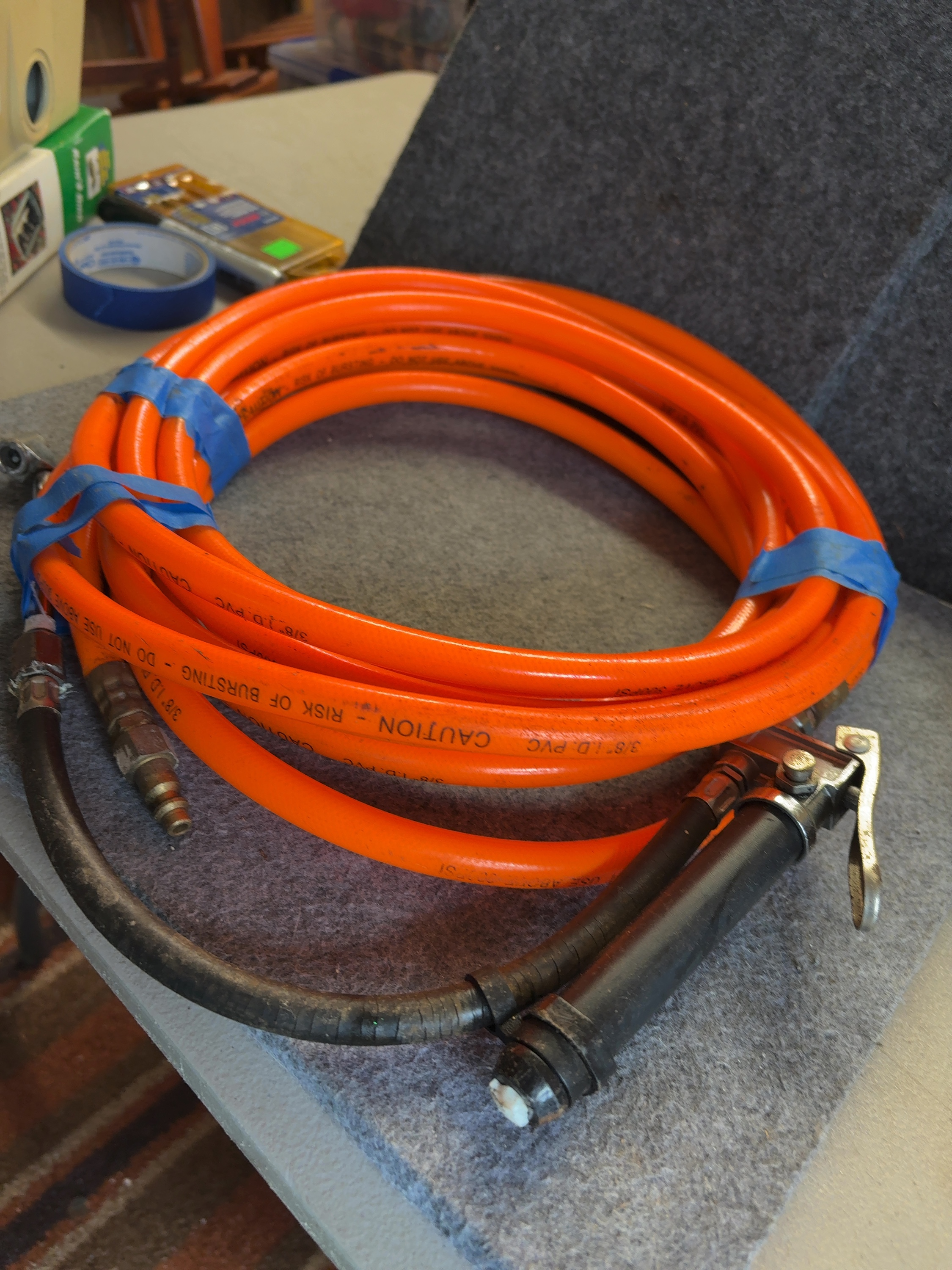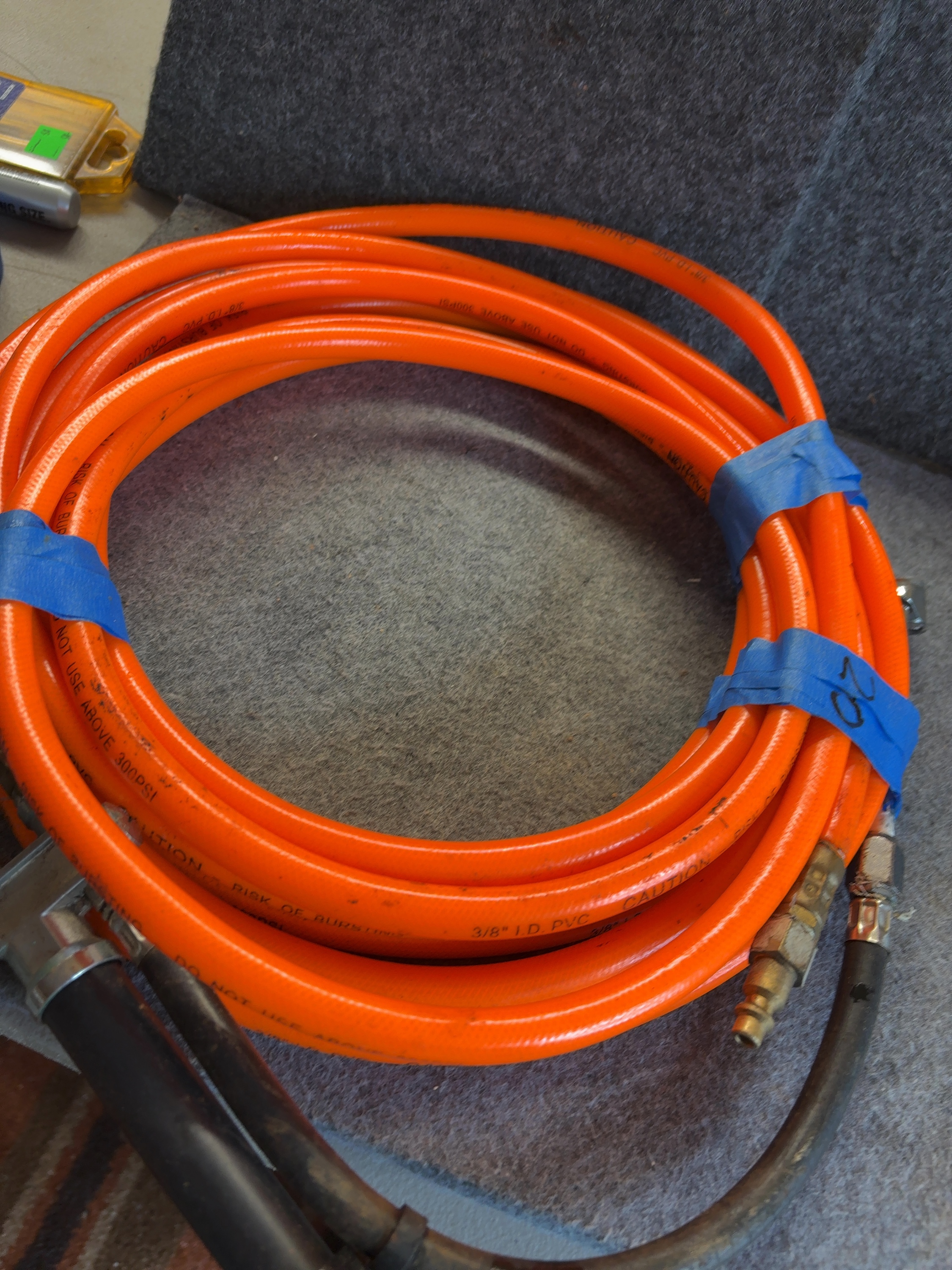 This pneumatic air hose assembly consists of a high-visibility orange PVC hose and various metal attachments. The hose is constructed with a 3/8-inch internal diameter and is rated for a maximum working pressure of 300 PSI. The assembly includes three primary attachments: a male quick-connect air plug, a dual-head air chuck designed for tire inflation, and a lever-operated air blow gun featuring a black handle and a short auxiliary hose extension. The fittings are composed of brass and zinc-plated steel. The hose body features printed technical specifications and safety warnings including 3/8 inch I.D. PVC and CAUTION – RISK OF BURSTING – DO NOT USE ABOVE 300PSI. A handwritten notation on the securing tape indicates the length.