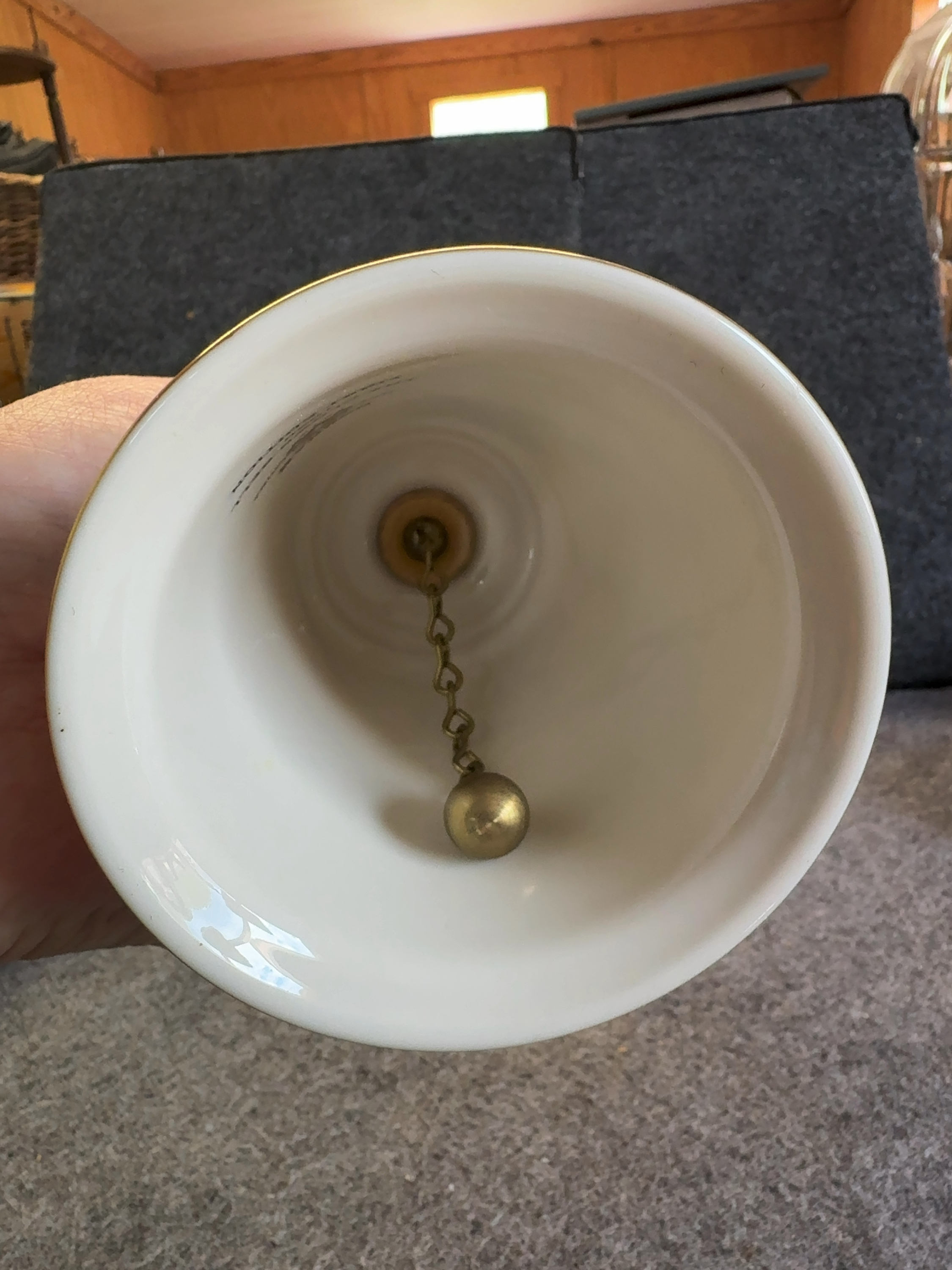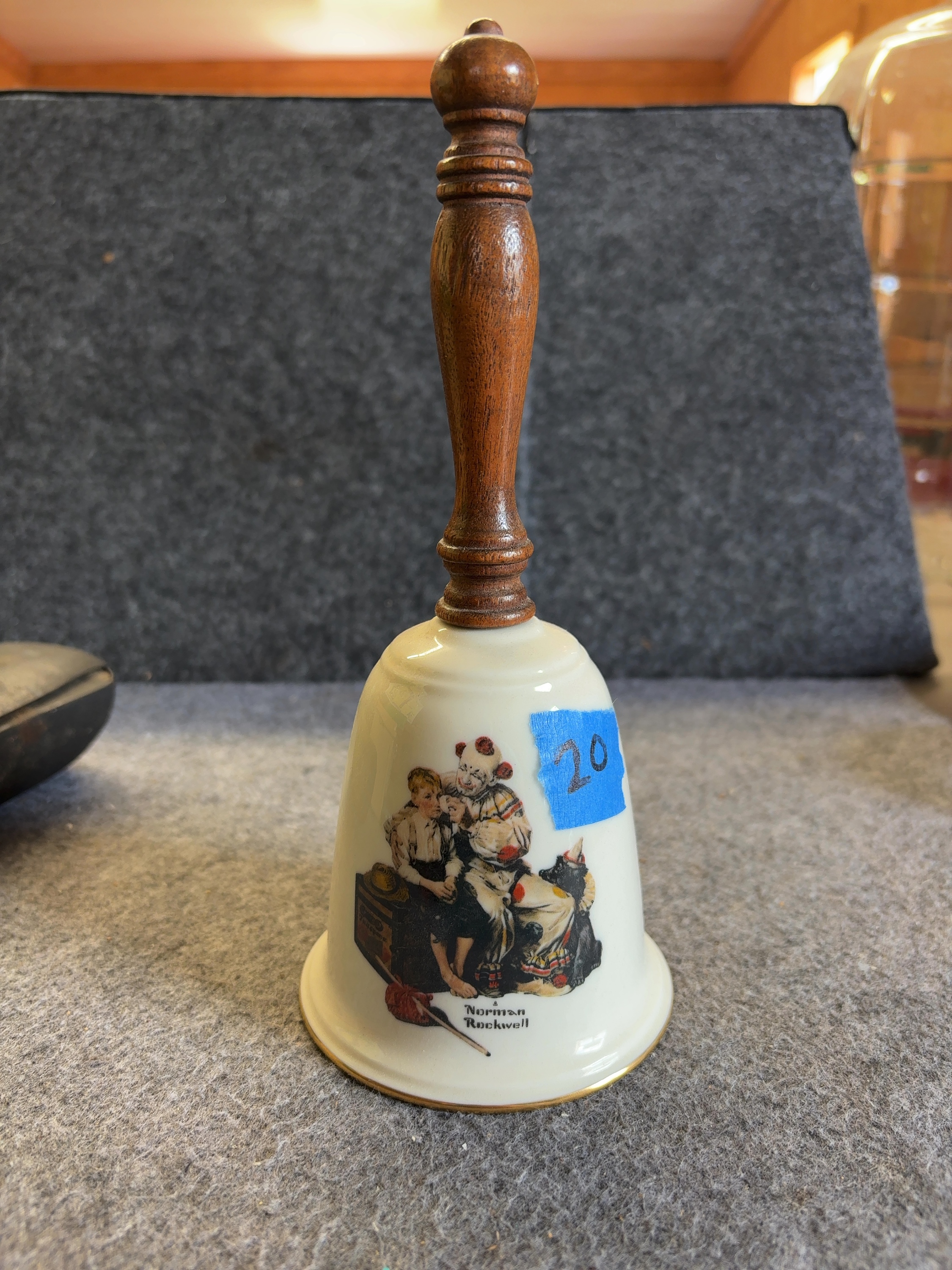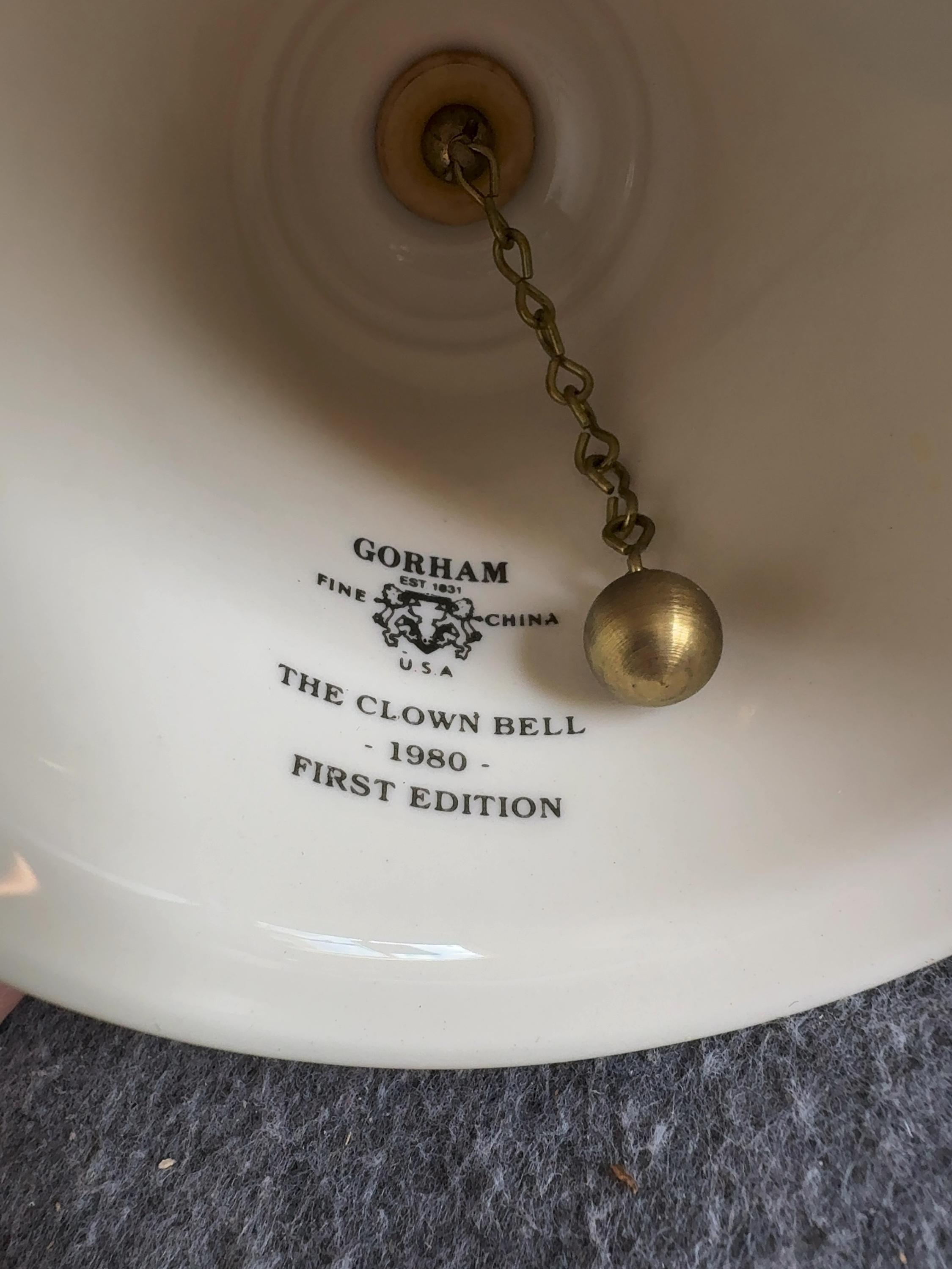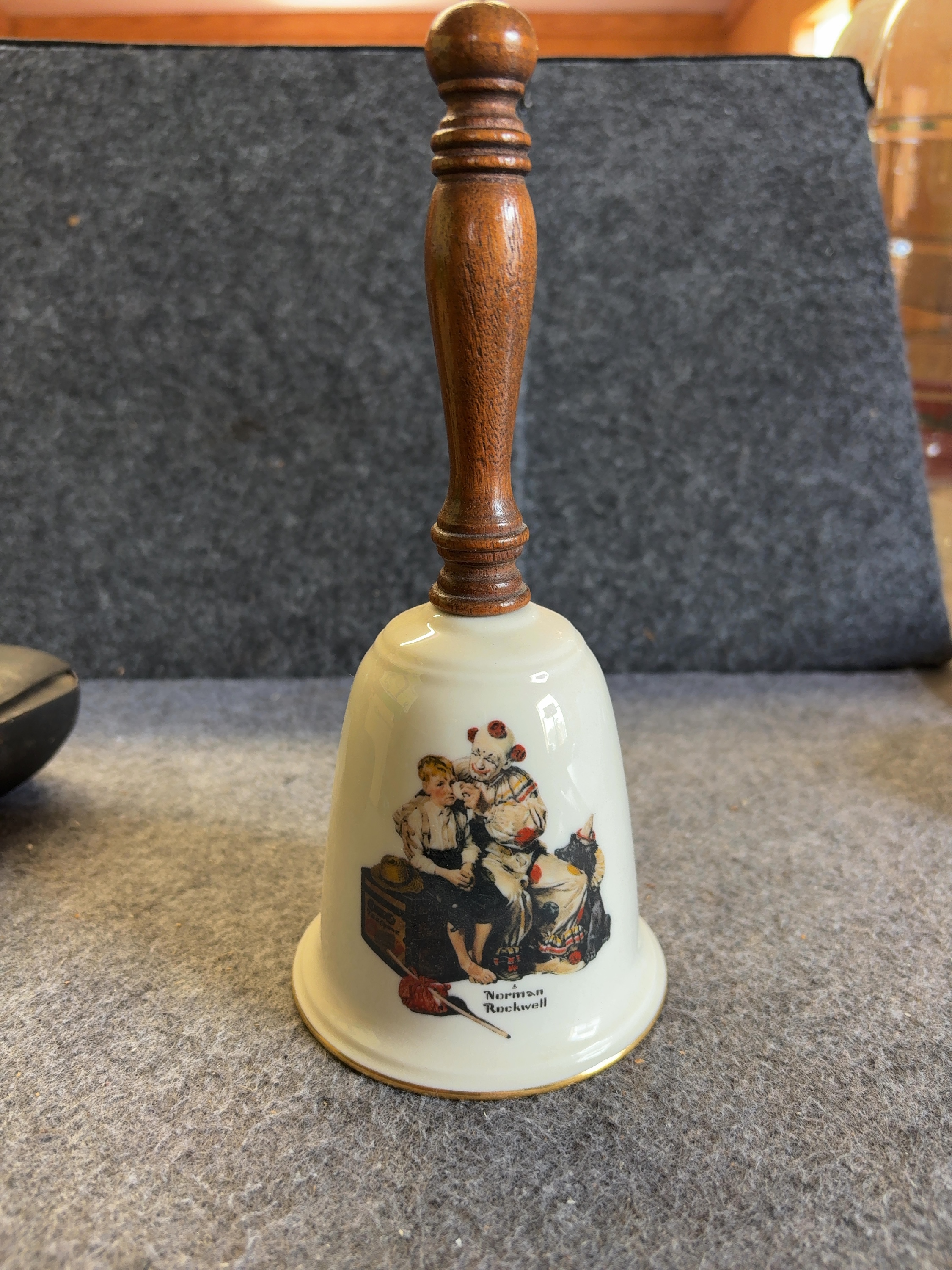 A fine china bell manufactured by Gorham in 1980. This item is identified as the First Edition of The Clown Bell. The bell features a porcelain body with a flared rim and a turned wood handle. The interior contains a metal clapper suspended by a chain. The exterior is decorated with a multi-colored transfer-printed illustration by Norman Rockwell, depicting a seated young boy and a clown. The base of the porcelain is finished with a gold-tone band. The interior of the bell is printed with the Gorham heraldic crest, EST 1831, FINE CHINA, U.S.A., THE CLOWN BELL, 1980, and FIRST EDITION. The artist signature, Norman Rockwell, is printed on the exterior below the illustration.