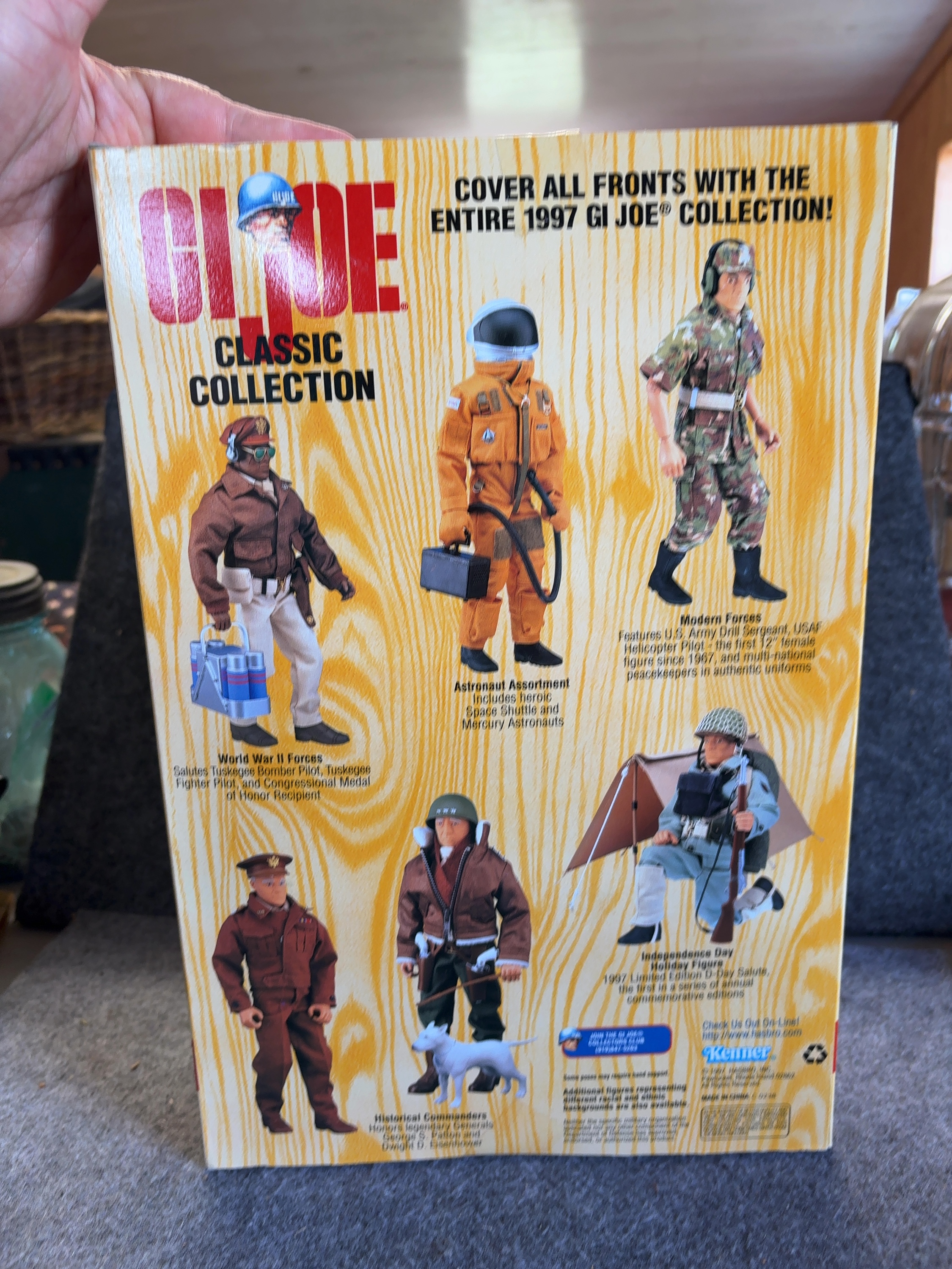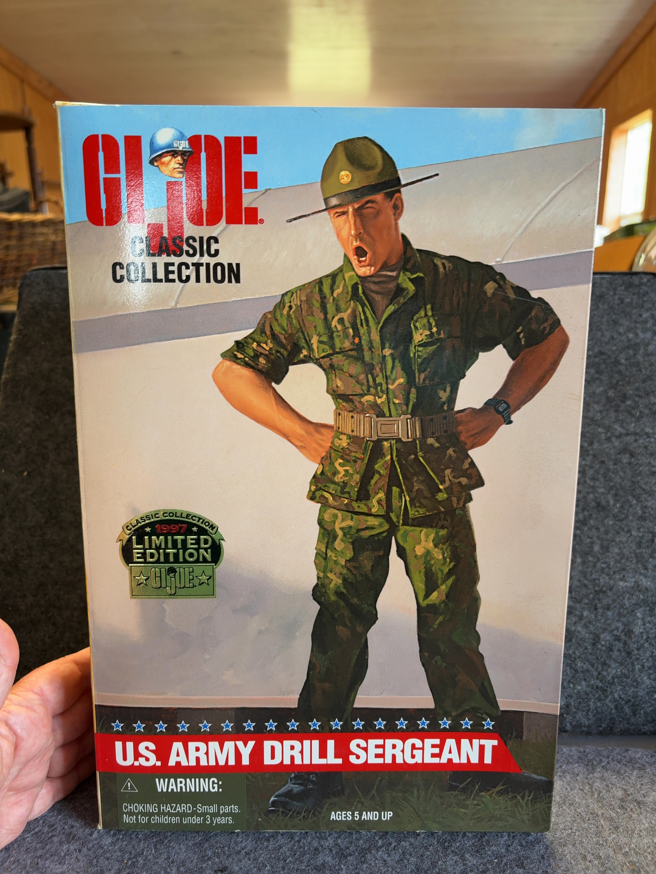 This 12-inch scale action figure is part of the 1997 G.I. Joe Classic Collection manufactured by Kenner for Hasbro, Inc. The figure is a Limited Edition release representing a U.S. Army Drill Sergeant. The articulated plastic figure is outfitted in a fabric woodland-style camouflage uniform featuring fabric patches with the transcriptions G.I. JOE and U.S. ARMY. The head sculpt is detailed with a shouting expression. Accessories contained within the packaging include a brown campaign hat, black headphones, a web belt with a silver-tone buckle, black combat boots, and a camouflage field cap. The figure is presented in its original window box with a Velcro-secured front flap. The interior of the flap contains biographical text regarding the role of a Drill Sergeant, while the exterior features a character illustration. The front of the box displays a gold-colored 1997 Limited Edition seal. The back of the box displays other figures from the 1997 assortment and bears the Kenner logo along with copyright information for 1997 Hasbro, Inc.