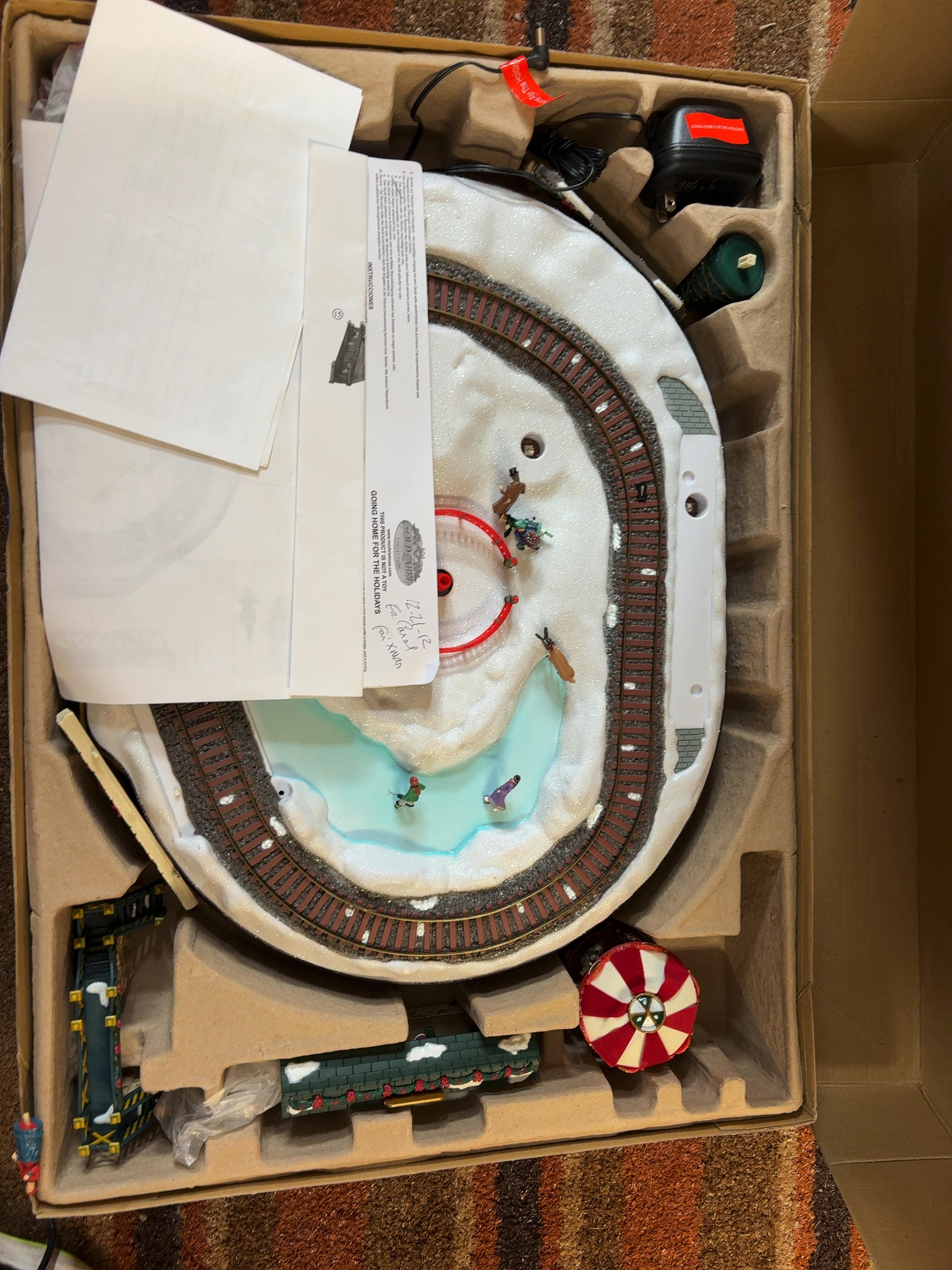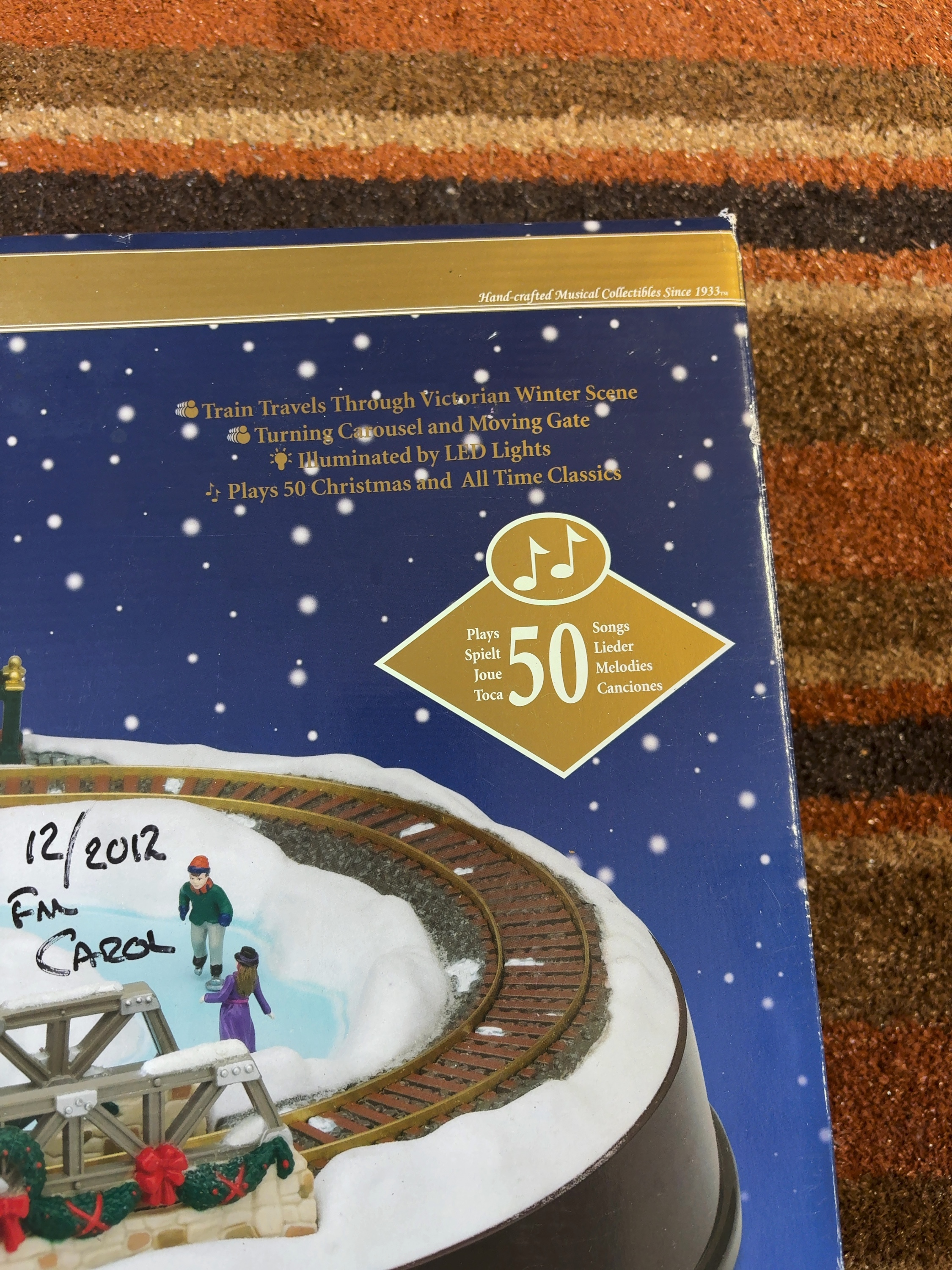 A Mr. Christmas Gold Label Collection animated musical holiday tabletop display titled Going Home for the Holidays. The piece is constructed from plastic, resin, and electronic components. The scene depicts a Victorian-style winter landscape featuring a train that travels on a circular track, a rotating carousel with a red-and-white striped canopy, and a moving railroad crossing gate. The display is illuminated by integrated LED lights and is programmed to play 50 different songs, including 25 Christmas carols and 25 classic melodies. The item is accompanied by its original retail box with molded internal protective inserts, the original instruction manual, and the original AC power adapter. The box is printed with the manufacturer’s branding and the series title, including the text Hand-crafted Musical Collectibles Since 1933. A handwritten inscription in black ink on the front of the box reads 12/2012 FM CAROL. The internal instruction manual bears a similar handwritten inscription reading 12-21-12 For Carol for Xmas.