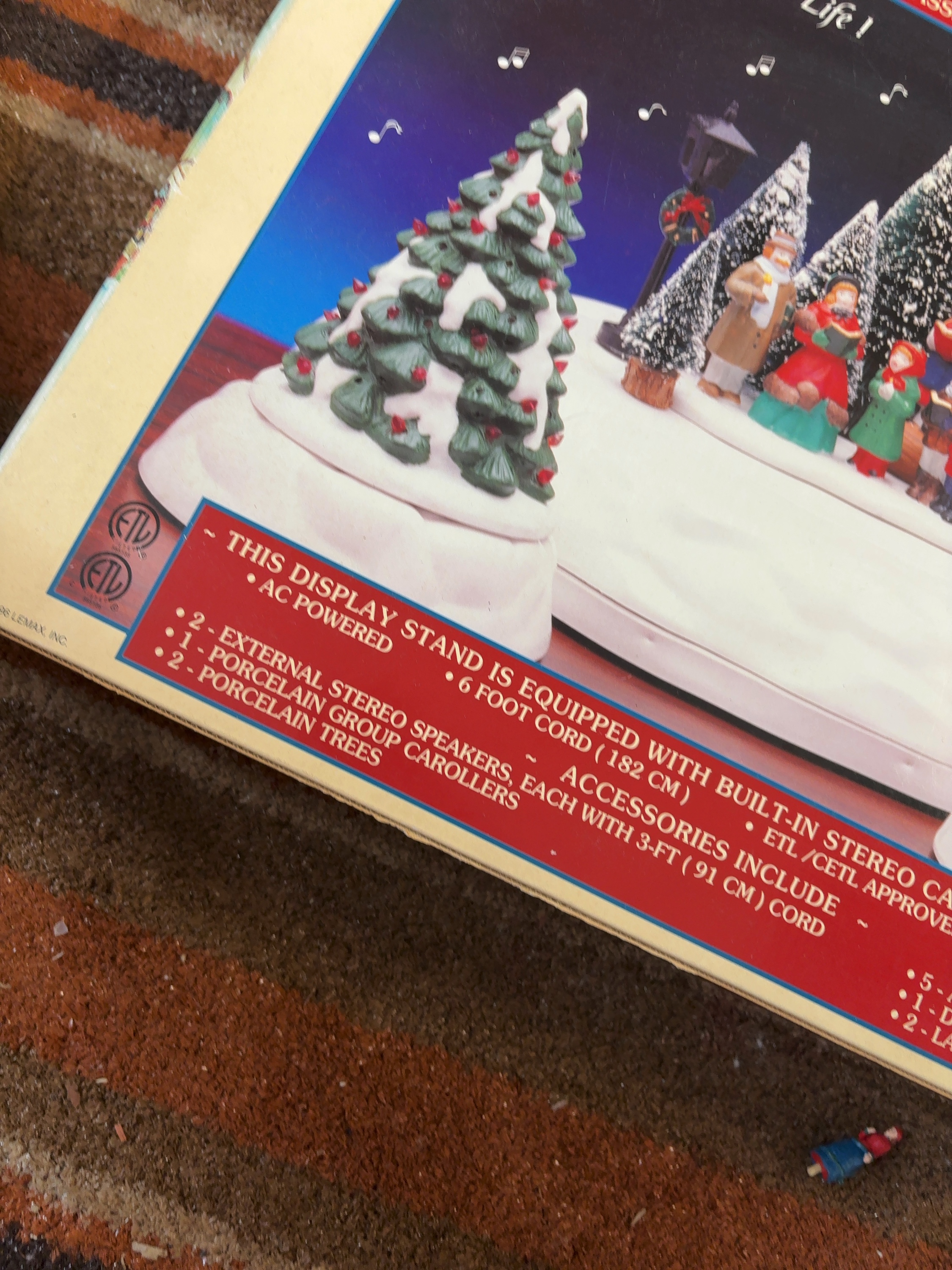 A Lemax Village Collection holiday accessory set featuring a built-in stereo cassette tape player. Produced by Lemax, Inc. and copyrighted in 1996, this set is designed as a decorative display stand for a miniature village. The central component is an AC-powered display base with an integrated auto-reverse cassette player. The set includes two external stereo speakers housed within porcelain tree figures, one porcelain group caroller figurine, five assorted bristle trees, one dry tree, and two lamp posts. The components are constructed from porcelain, plastic, and mixed synthetic materials. The packaging identifies the manufacturer as Lemax, Inc. and lists the item as number 66080.