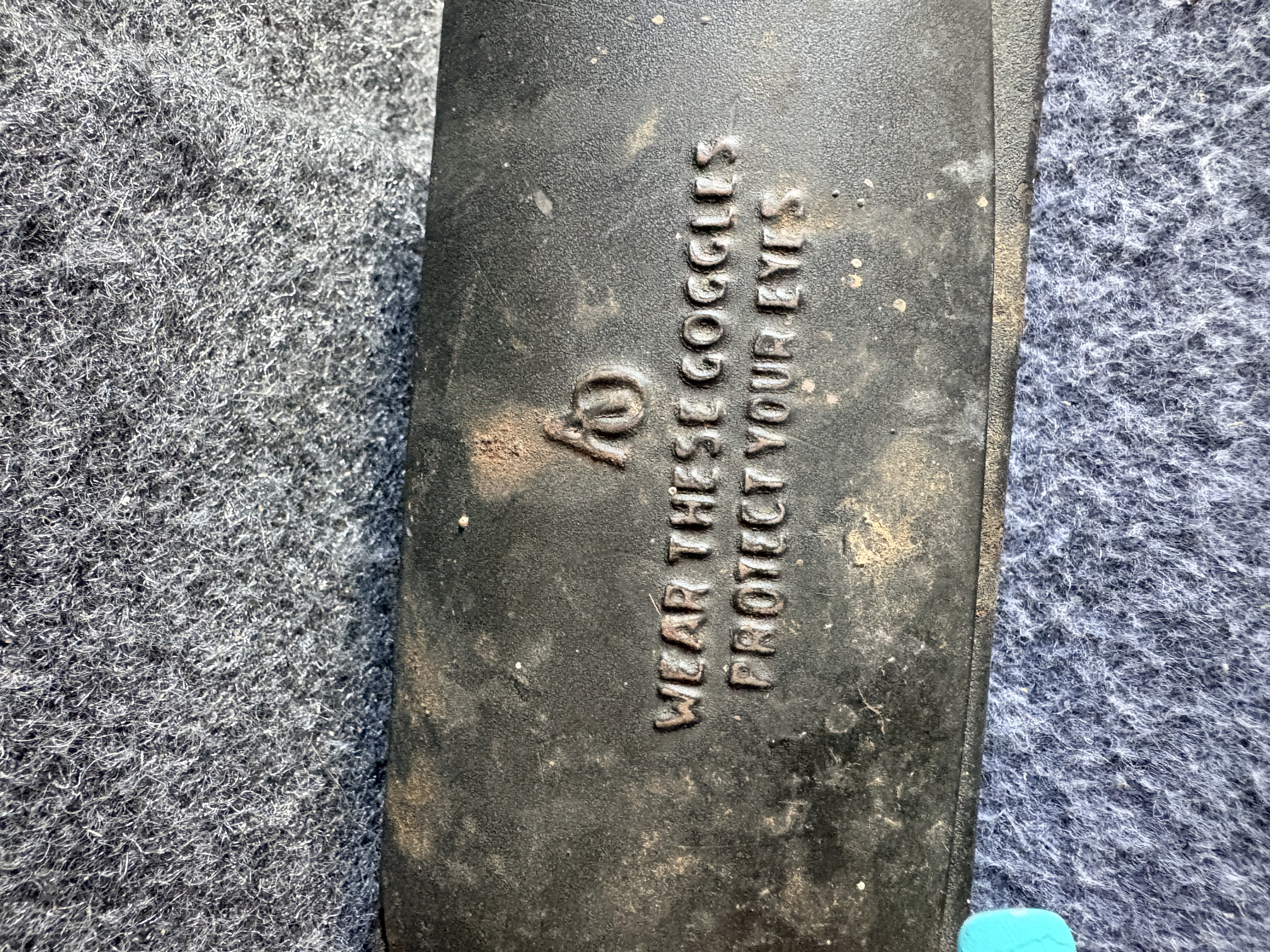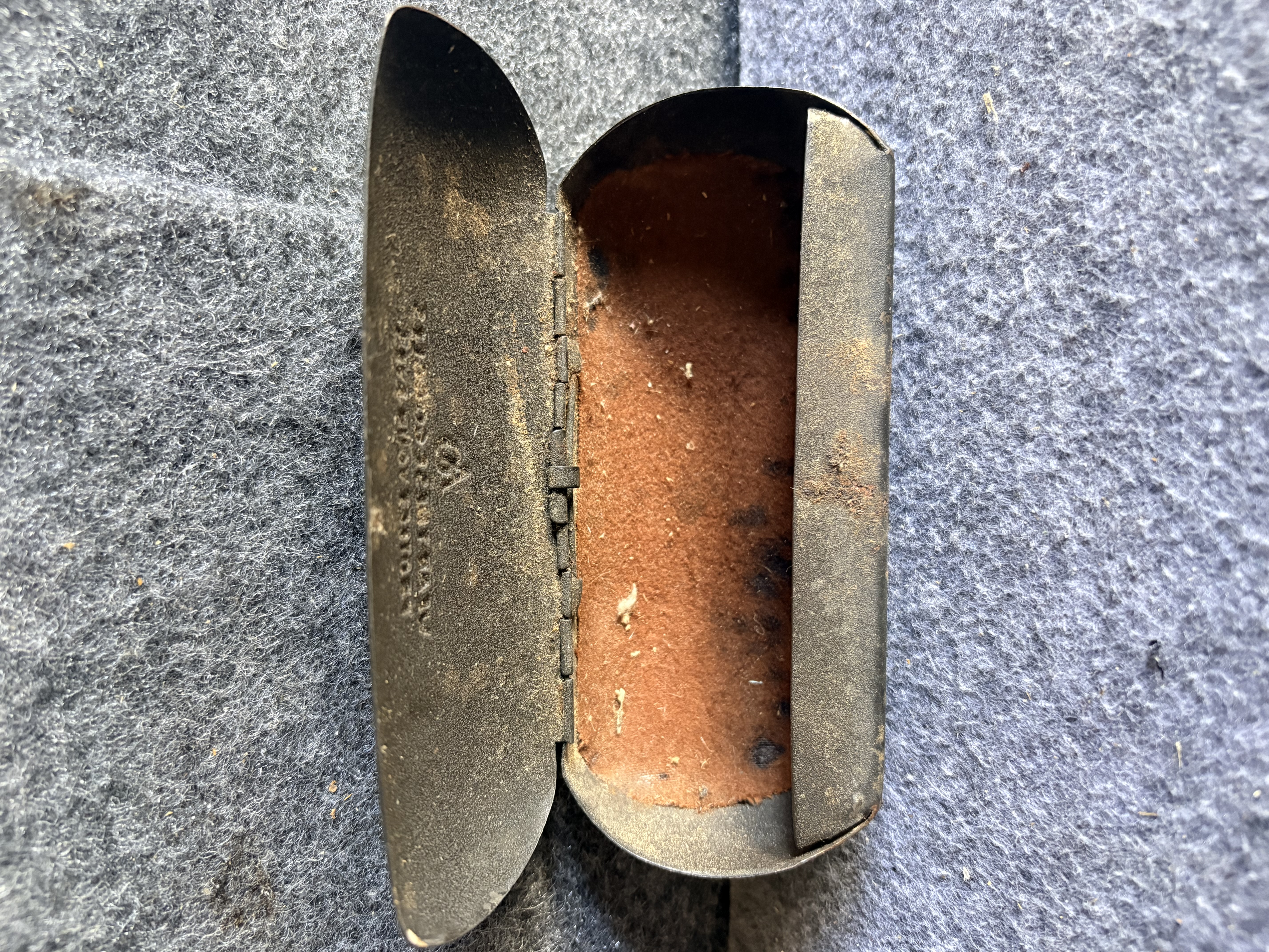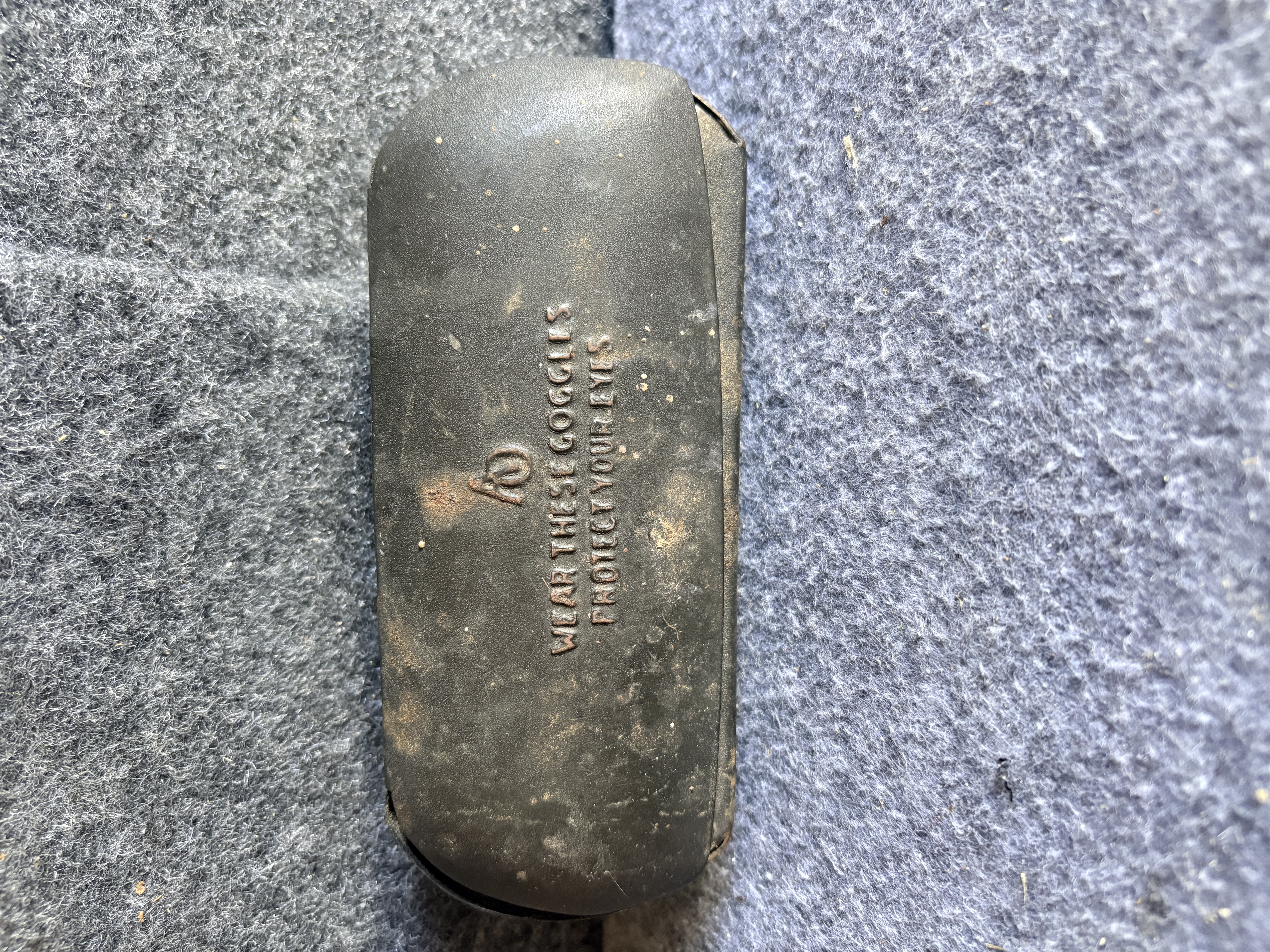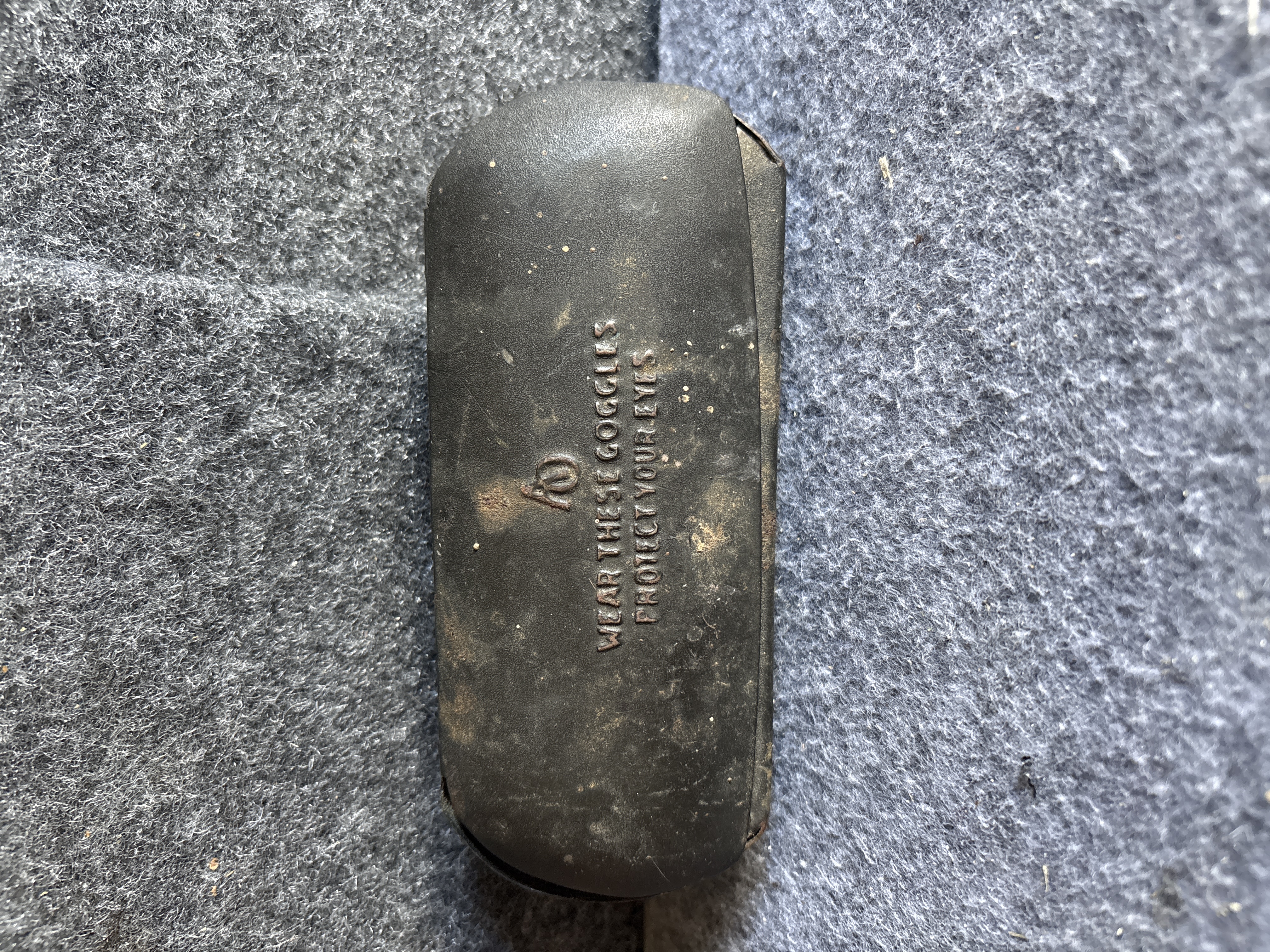 A vintage industrial safety goggle case manufactured by American Optical (AO). The case features a rigid hard-shell construction, likely consisting of a metal core with a textured black exterior finish. The top of the lid is embossed with the American Optical AO monogram. Below the monogram, the lid is further embossed with the instructional text WEAR THESE GOGGLES and PROTECT YOUR EYES in block capital letters. The case is designed with a rounded rectangular form and a hinged closure.