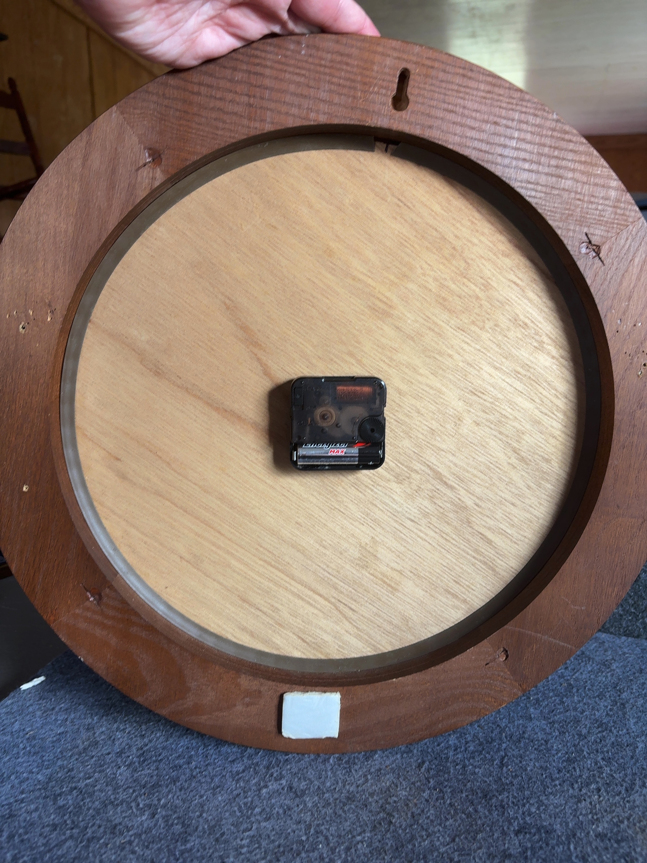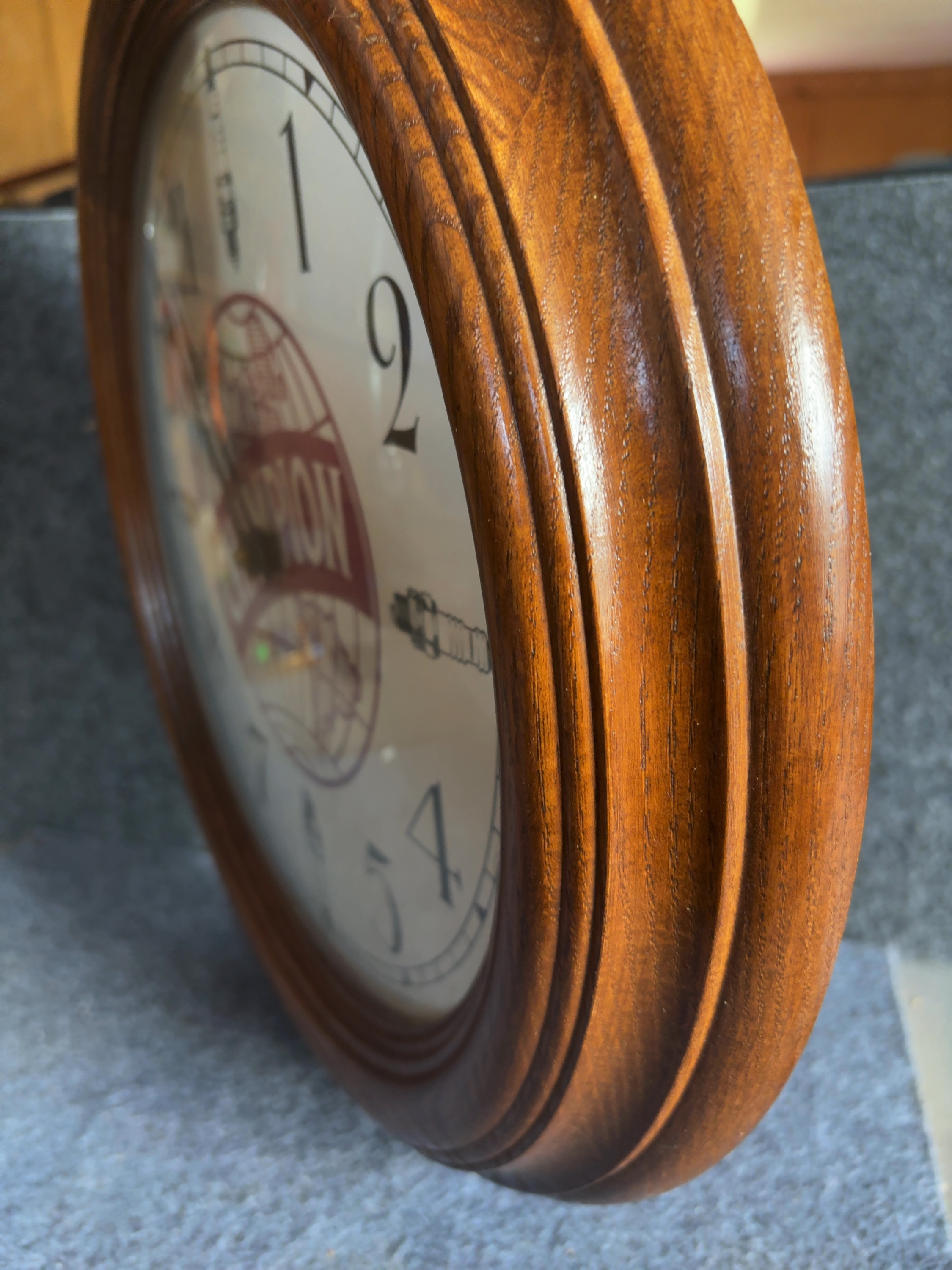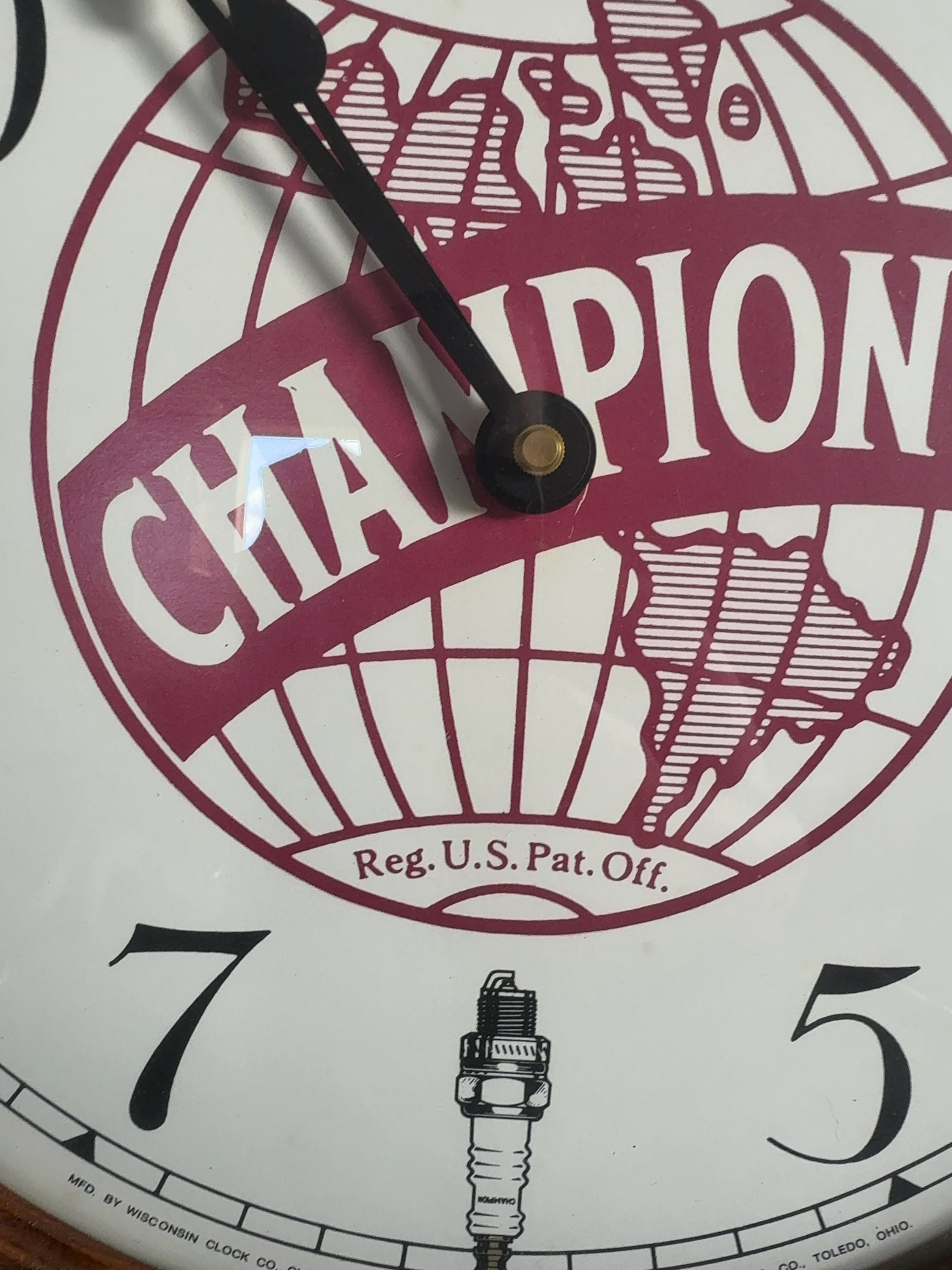 This advertising wall clock was manufactured by the Wisconsin Clock Co. of Clintonville, Wisconsin, for the Champion Spark Plug Co. of Toledo, Ohio. The clock features a multi-tiered circular frame with an oak-finished wood grain. The cream-colored dial is protected by a glass face and displays the Champion globe logo in red and white at the center, including the text Reg. U.S. Pat. Off. The hour positions at 12, 3, 6, and 9 o’clock are marked with black and white illustrations of spark plugs, while the remaining hours are indicated by black serif numerals. The clock is equipped with black decorative metal hour and minute hands and a thin black second hand. The lower edge of the dial includes printed manufacturer attributions to the Wisconsin Clock Co. on the left and the Champion Spark Plug Co. on the right. The reverse side consists of a plywood backing with a centered plastic quartz movement powered by a single AA battery.