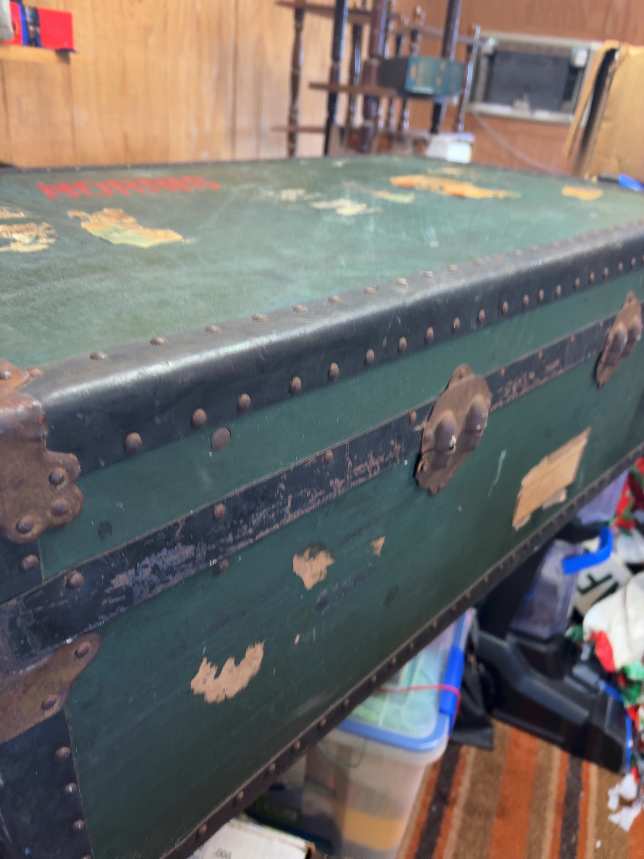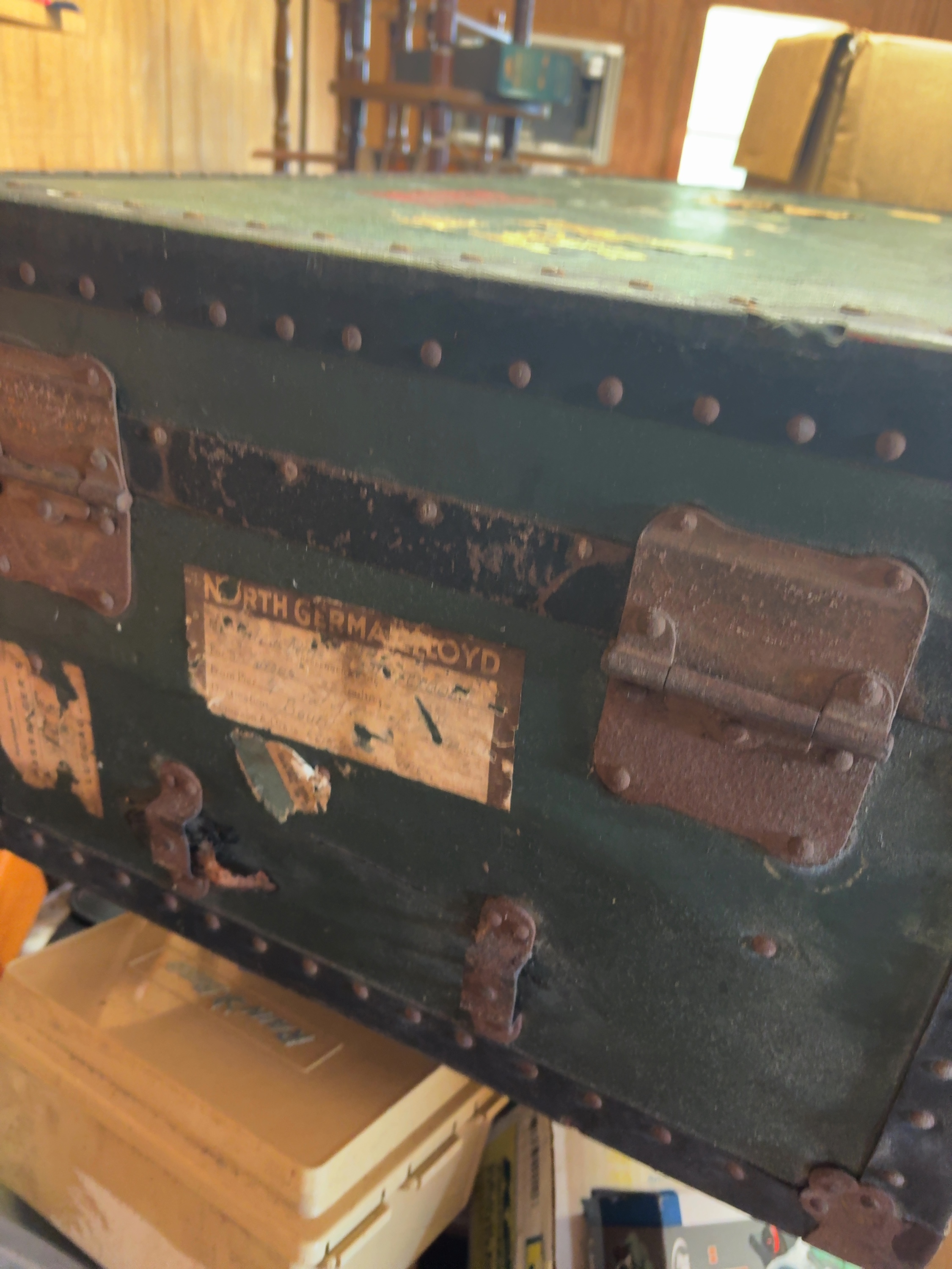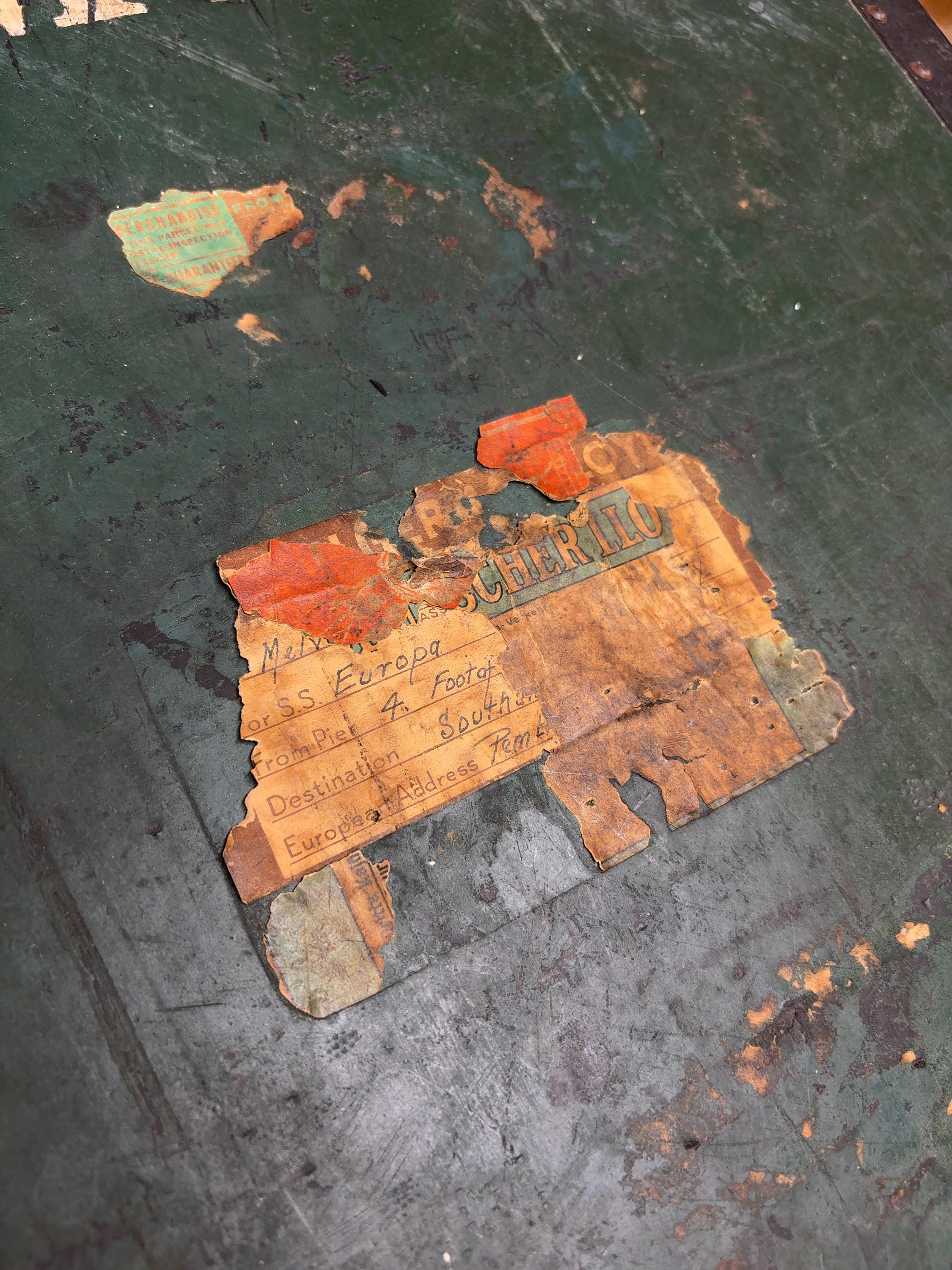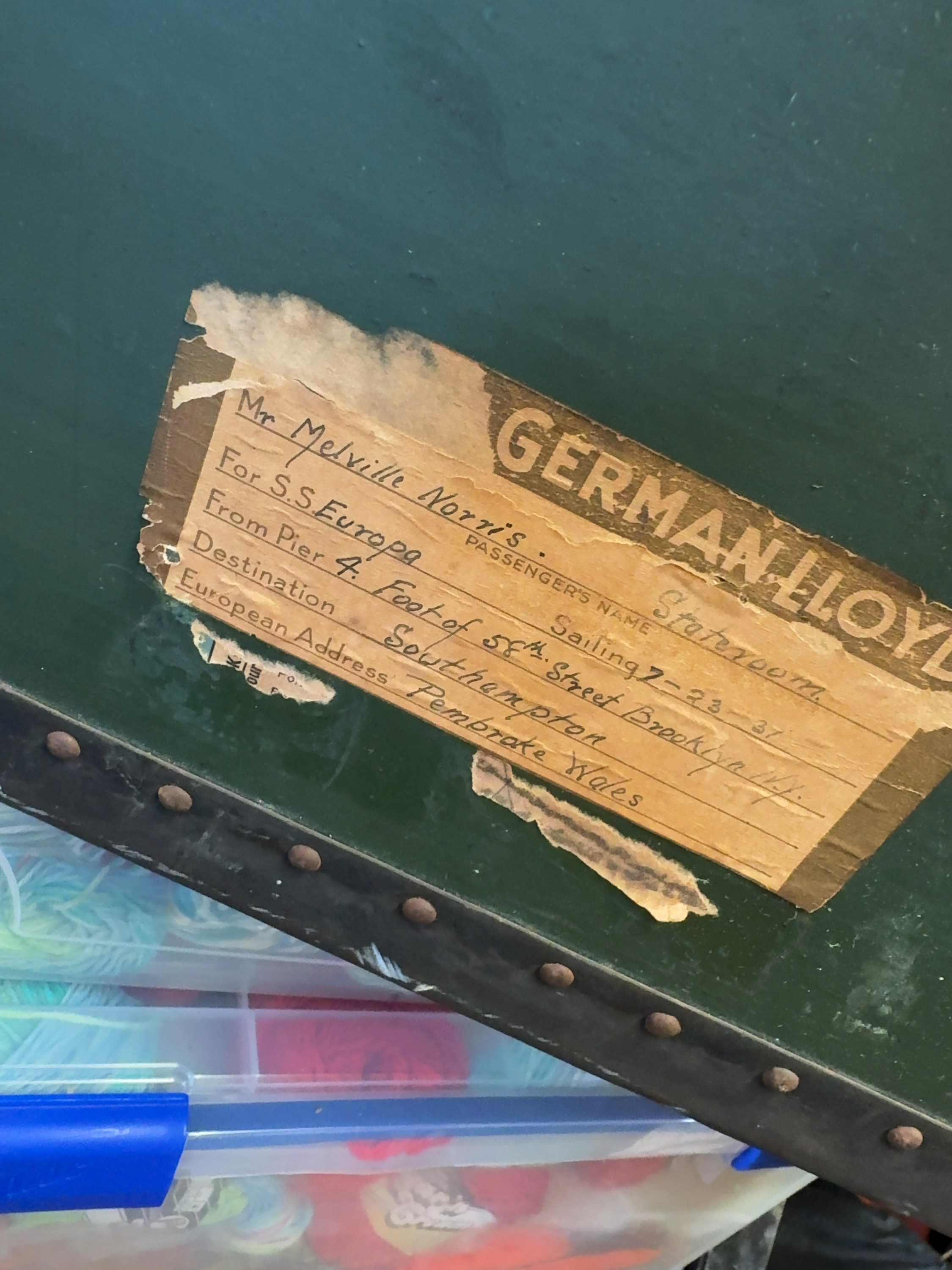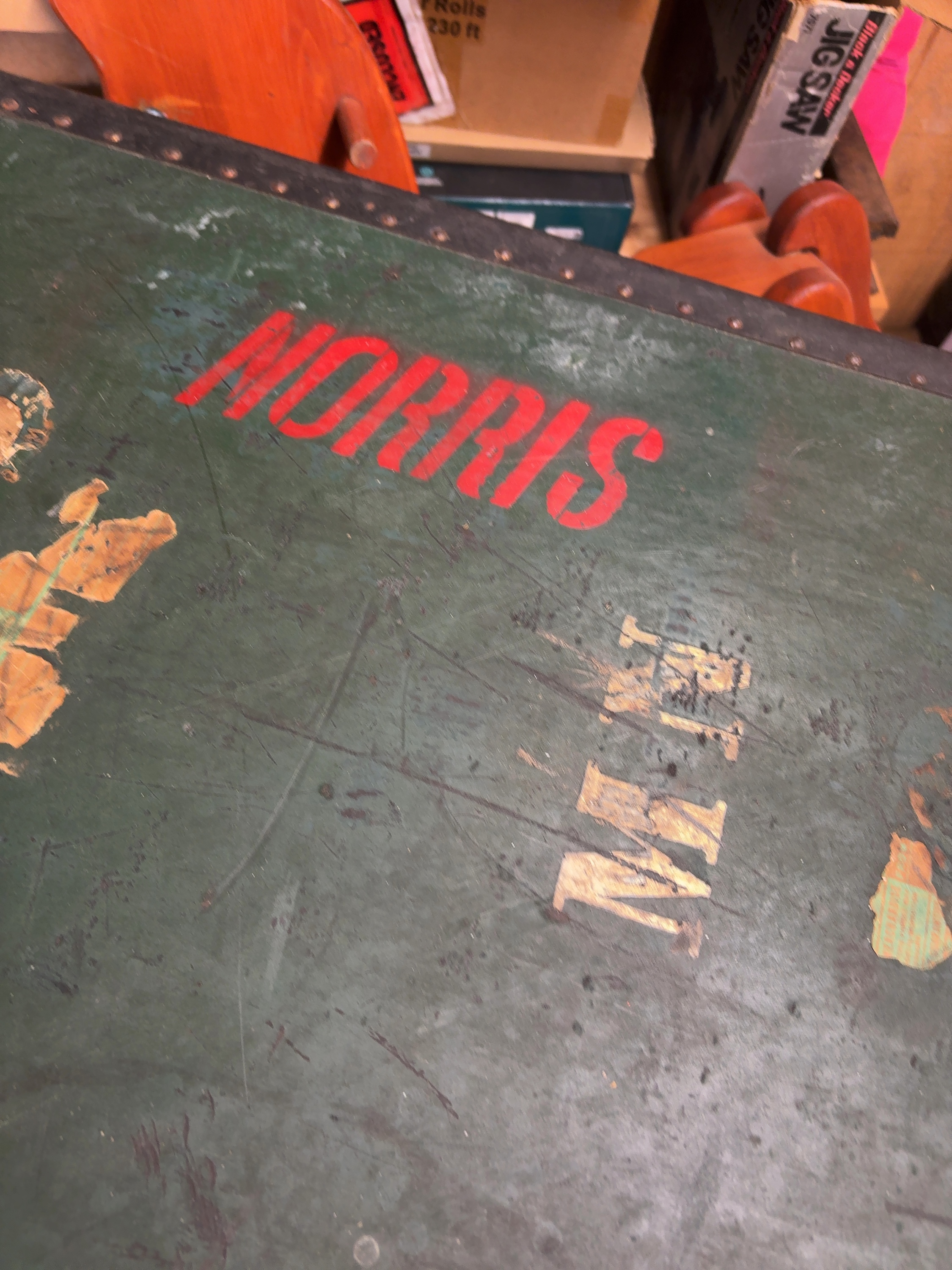 This vintage steamer trunk features a green-painted body reinforced with black metal banding and numerous rivets. The top is marked with red stenciled letters reading MORRIS and white/yellow stenciled initials M N. Several distressed and partially torn paper shipping labels from the North German Lloyd line are affixed to the surface. One label identifies the passenger as Mr. Melville Norris for a sailing on the S.S. Europa from Pier 4 in Brooklyn, New York, to Southampton, with a sailing date of 7-23-37 and a final destination of Pembroke, Wales. The trunk is fitted with heavy metal latches and decorative corner guards.