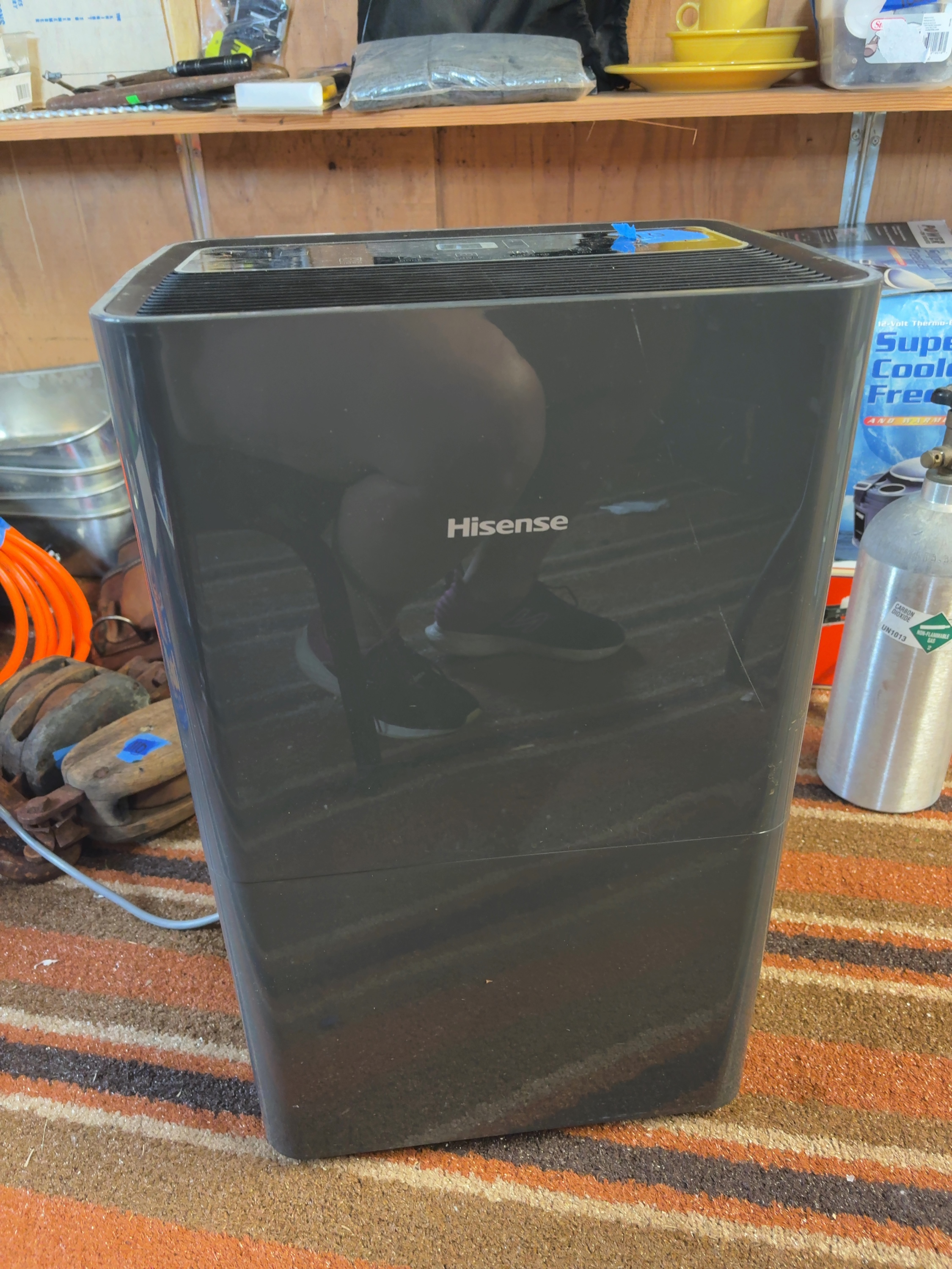 This Hisense dehumidifier is a 50-pint capacity appliance featuring an integrated internal pump system for continuous drainage. The unit is housed in a dark charcoal gray plastic cabinet with a top-mounted digital control interface. The control panel includes an Energy Star certification logo and provides settings for a programmable timer, three operation modes (Auto Dry, Continuous, and Manual Set), and three fan speeds (Auto, High, and Low). It also features a Clean Filter alert and a dedicated Pump button. The unit is equipped with a digital display that indicates the current relative humidity percentage. The Hisense brand name is printed on the front face of the cabinet.