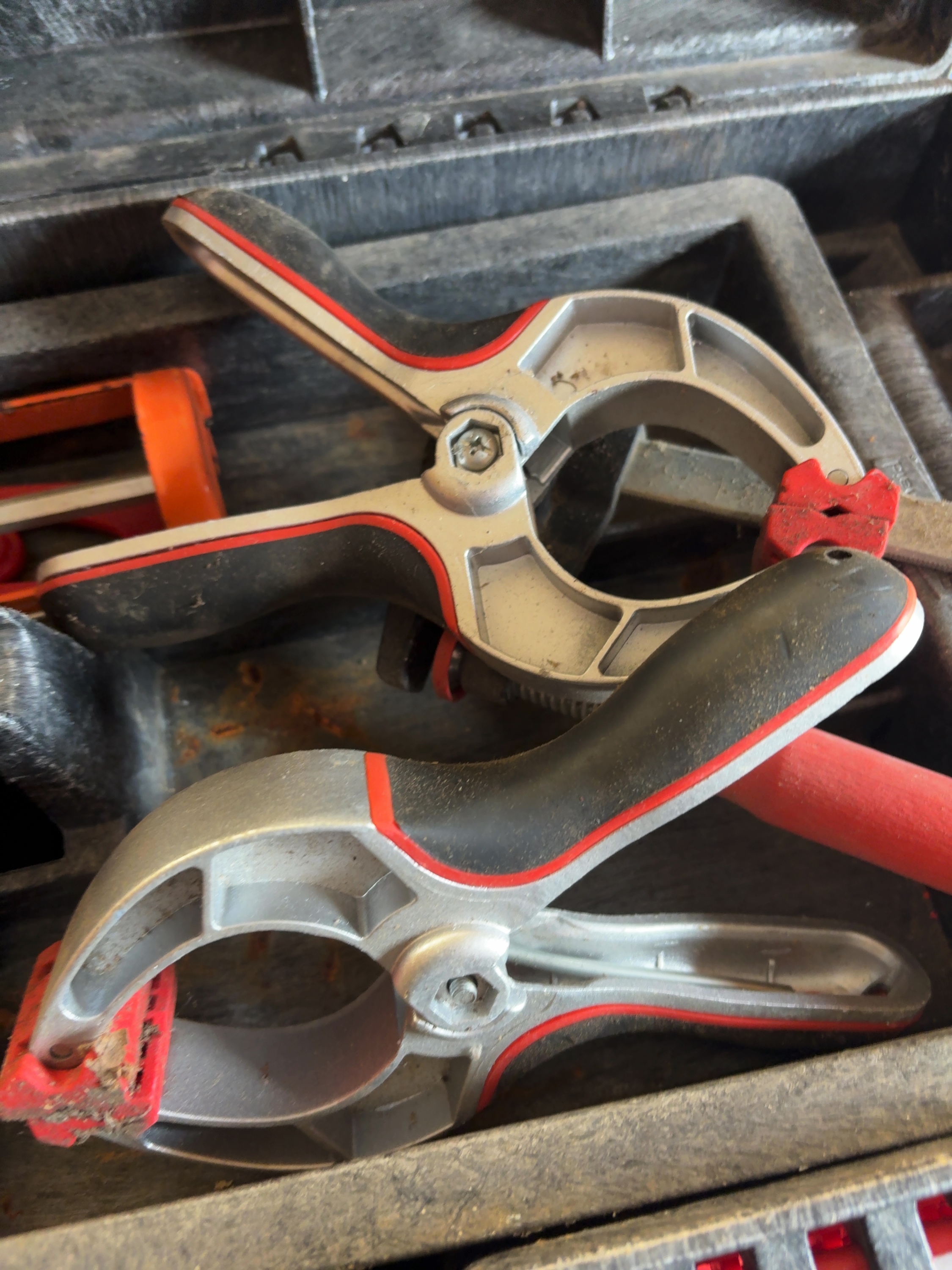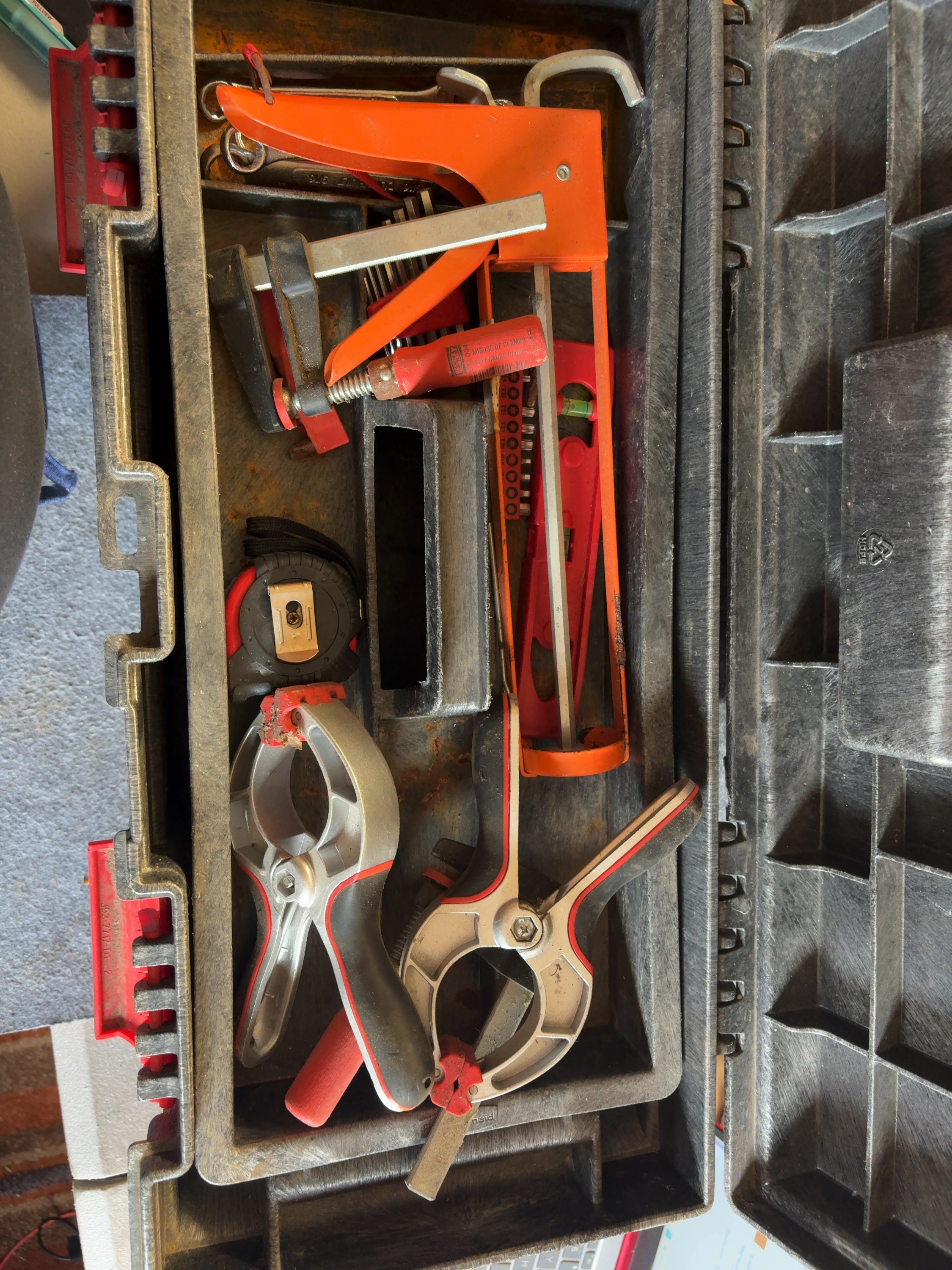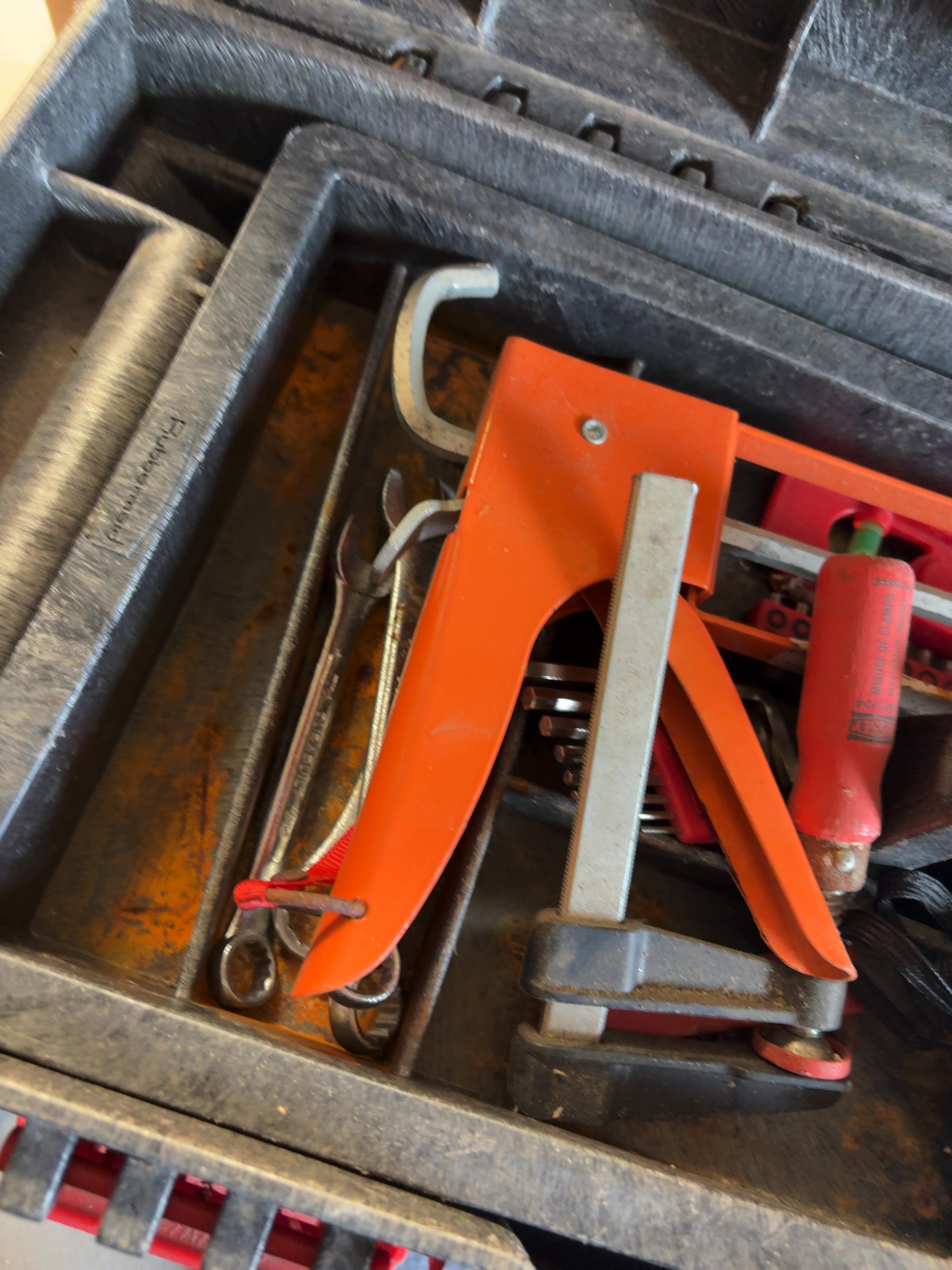 This lot features a Rubbermaid model 7717 professional series toolbox constructed from heavy-duty black molded structural foam. The exterior includes two red plastic secure-snap latches and a central red logo plate, both bearing the Rubbermaid maker mark. The lid is equipped with a large-format, top-folding carry handle. The interior contains a removable plastic organization tray. This item dates to the late 20th or early 21st century. Included with the toolbox is an assortment of hand tools and workshop accessories. These items consist of a Bessey bar clamp with a red handle, two large composite spring clamps with black and red grips, a set of chrome-finished combination wrenches, and a set of hex keys on a ring. Additional accessories include an orange manual-drive caulking gun, a tape measure in a black and red case, a red torpedo level, and a partial set of screwdriver bits in a red plastic holder.
