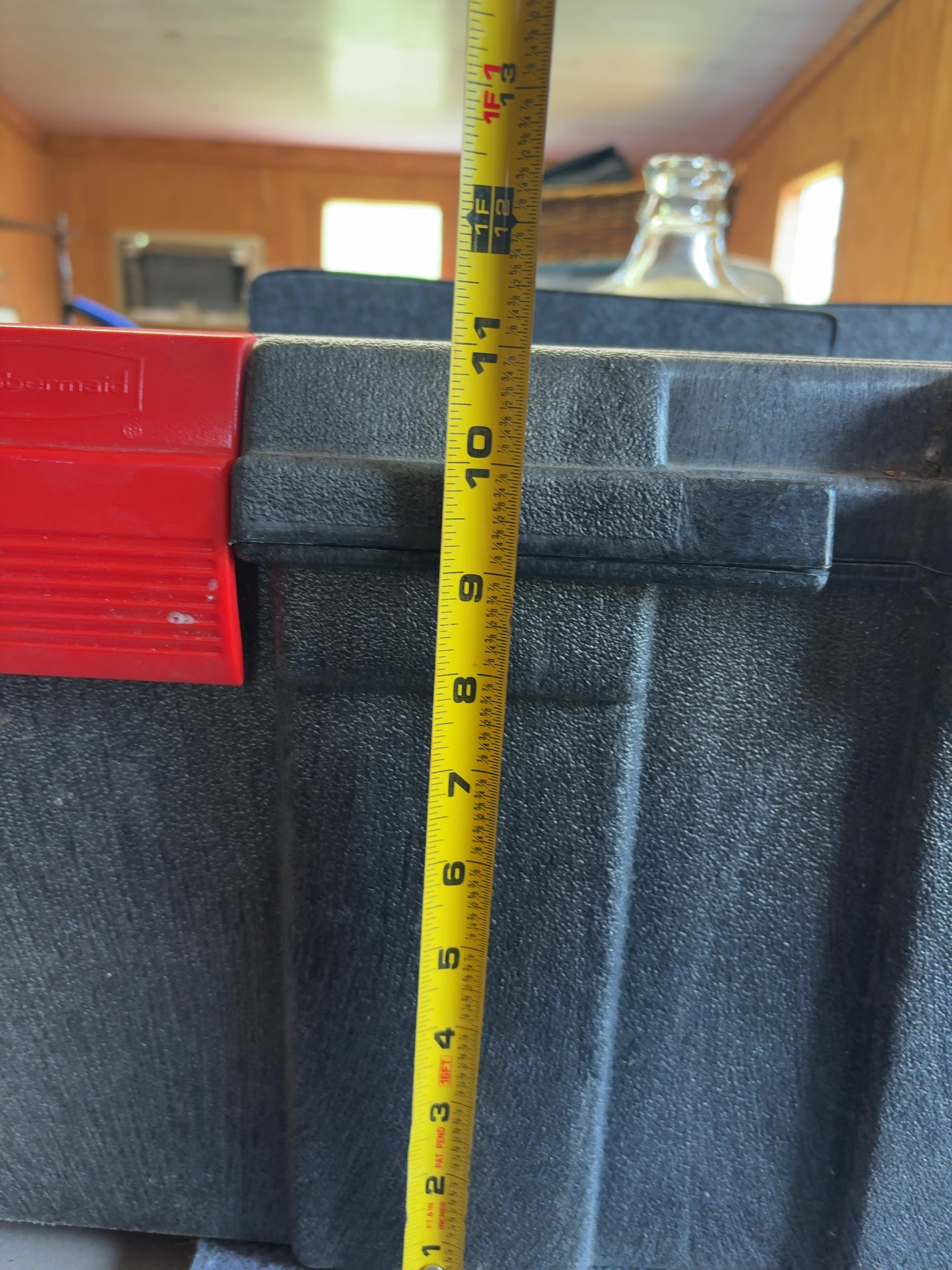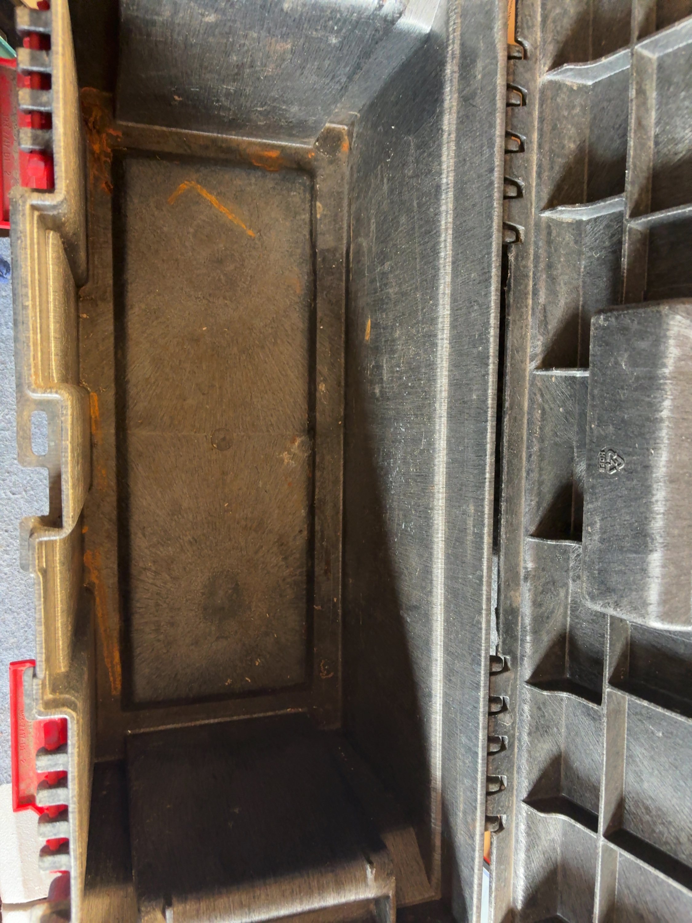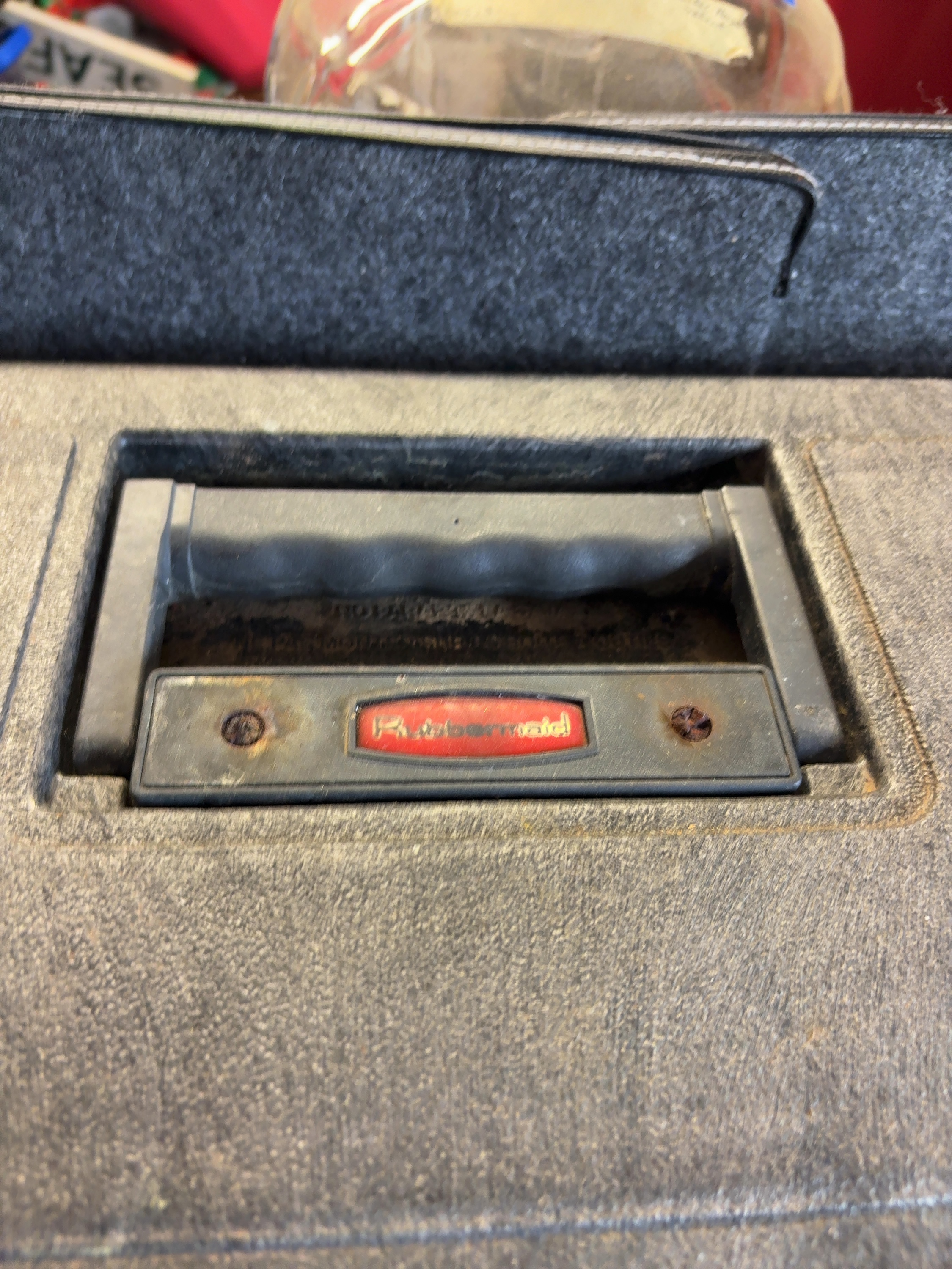 This lot features a Rubbermaid model 7717 professional series toolbox constructed from heavy-duty black molded structural foam. The exterior includes two red plastic secure-snap latches and a central red logo plate, both bearing the Rubbermaid maker mark. The lid is equipped with a large-format, top-folding carry handle. The interior contains a removable plastic organization tray. This item dates to the late 20th or early 21st century. Included with the toolbox is an assortment of hand tools and workshop accessories. These items consist of a Bessey bar clamp with a red handle, two large composite spring clamps with black and red grips, a set of chrome-finished combination wrenches, and a set of hex keys on a ring. Additional accessories include an orange manual-drive caulking gun, a tape measure in a black and red case, a red torpedo level, and a partial set of screwdriver bits in a red plastic holder.