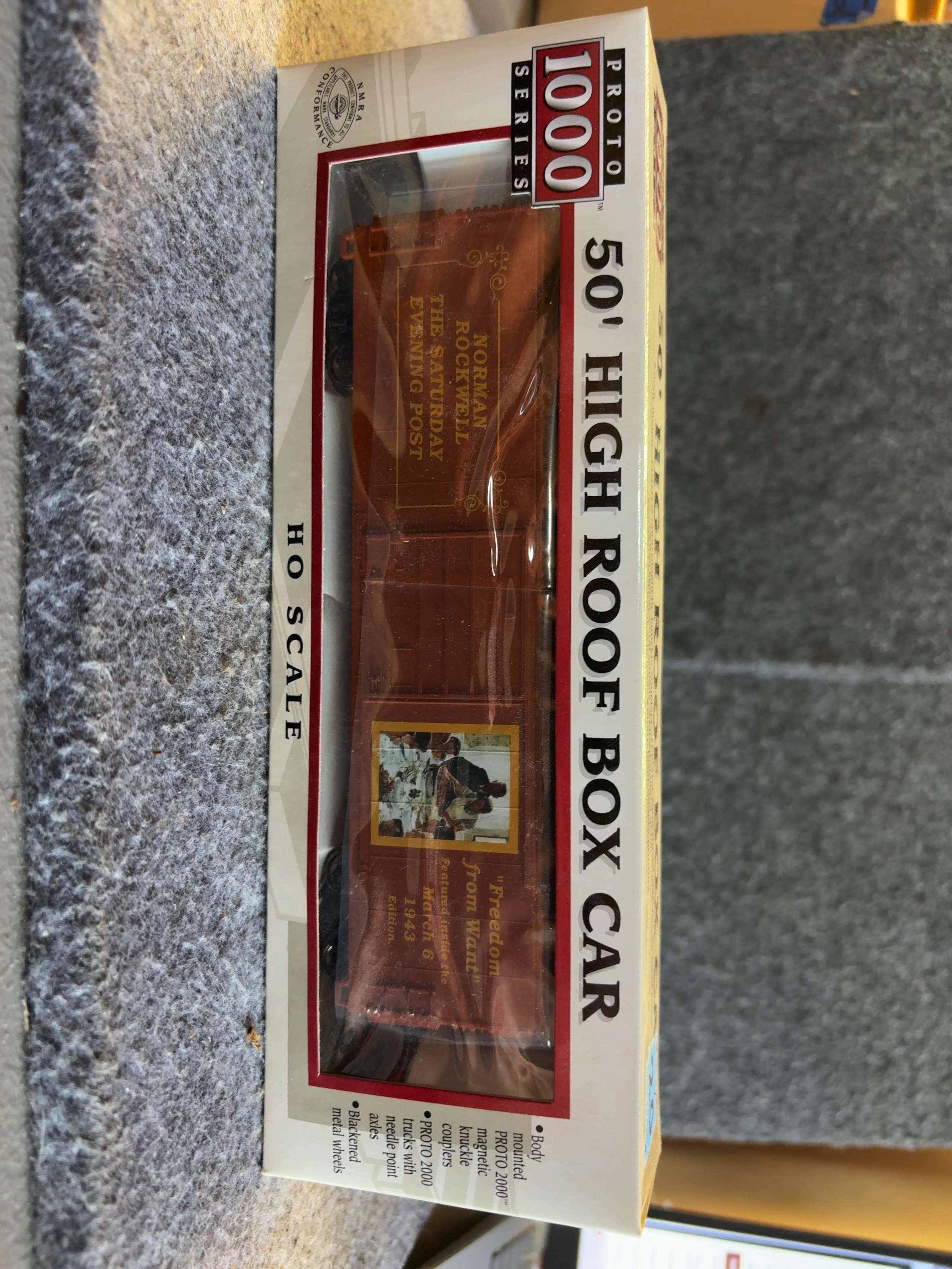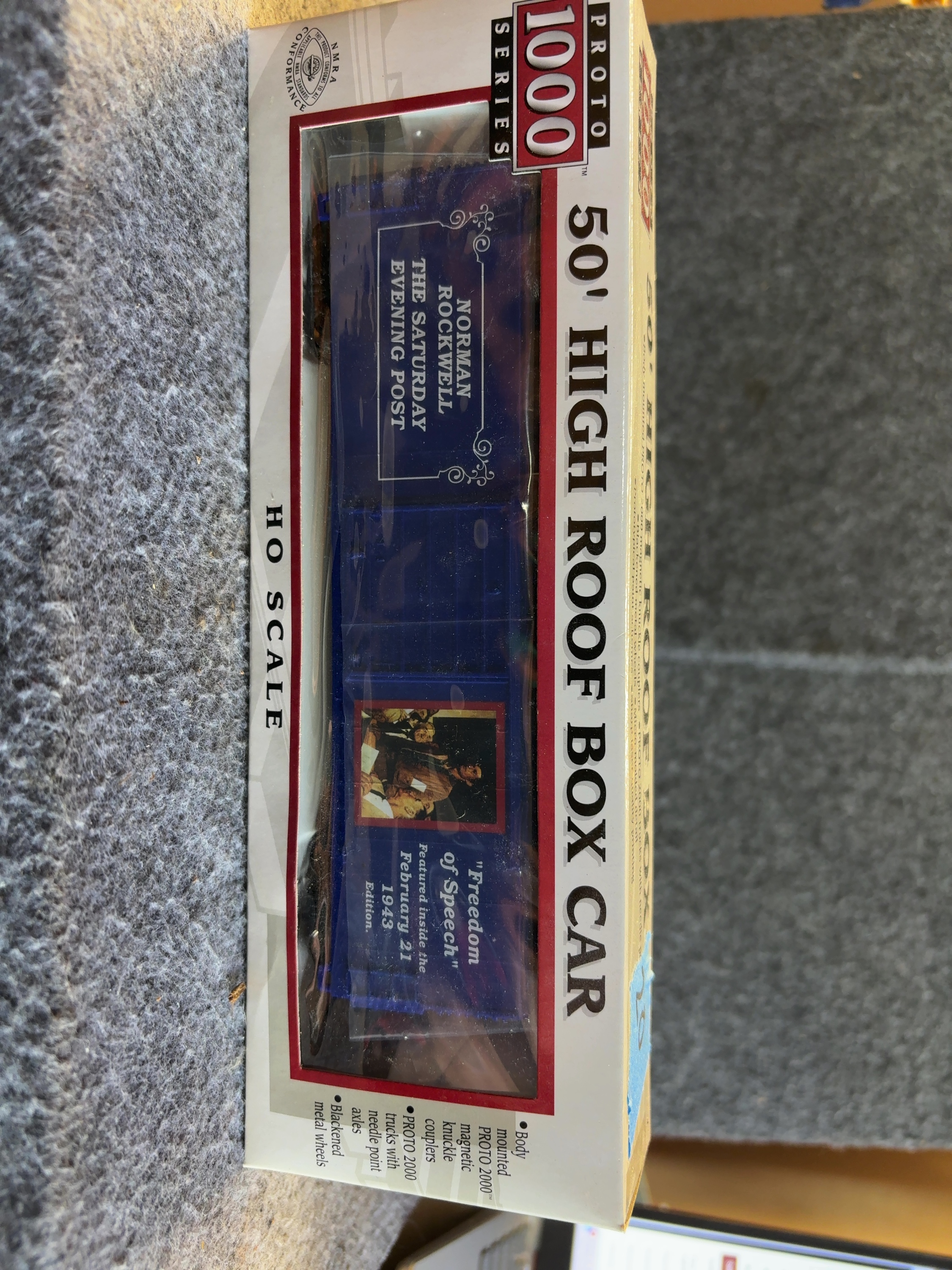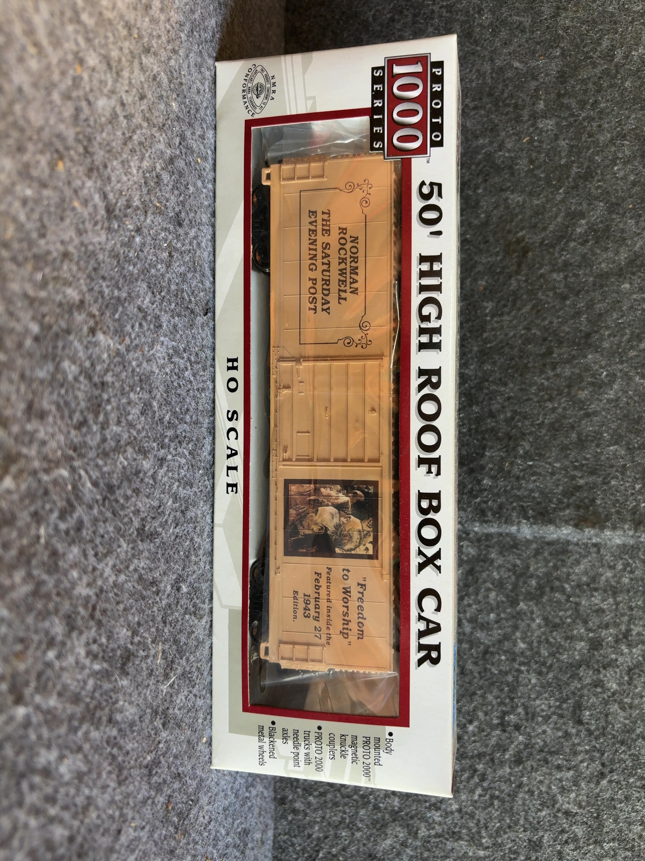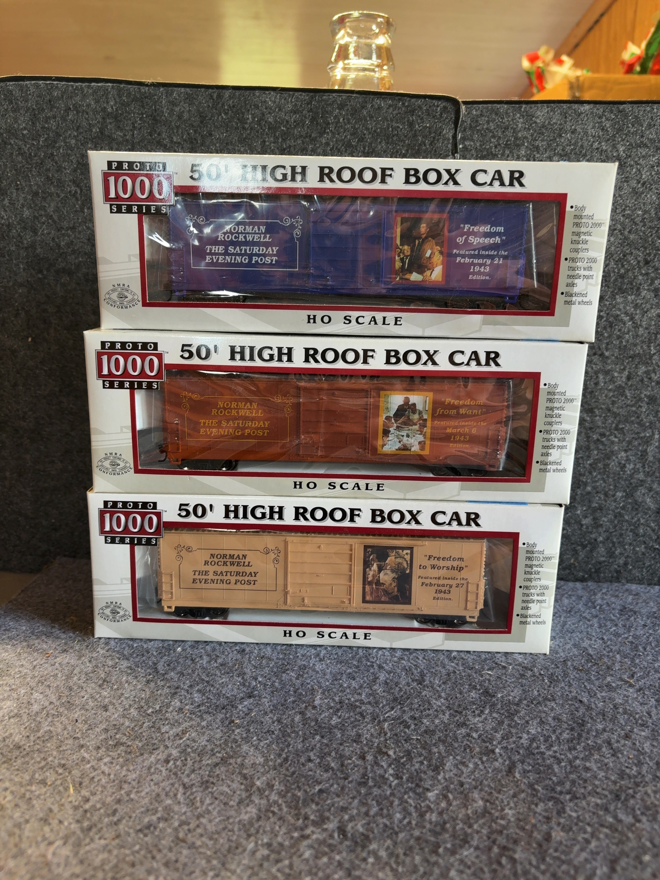 This lot consists of three HO scale model train box cars from the Proto 1000 Series by Life-Like Products, Inc. Each 50 foot high roof box car features commemorative artwork by Norman Rockwell from the Four Freedoms series originally published in The Saturday Evening Post. The cars are constructed with plastic bodies and feature blackened metal wheels. Technical specifications printed on the packaging include body mounted Proto 2000 magnetic knuckle couplers and Proto 2000 trucks with needle point axles. Each car bears the NMRA Conformance logo. The set includes a blue box car featuring the Freedom of Speech illustration, a brown box car featuring the Freedom from Want illustration, and a tan box car featuring the Freedom to Worship illustration. Each car includes text referencing the specific 1943 edition of The Saturday Evening Post in which the artwork appeared.
