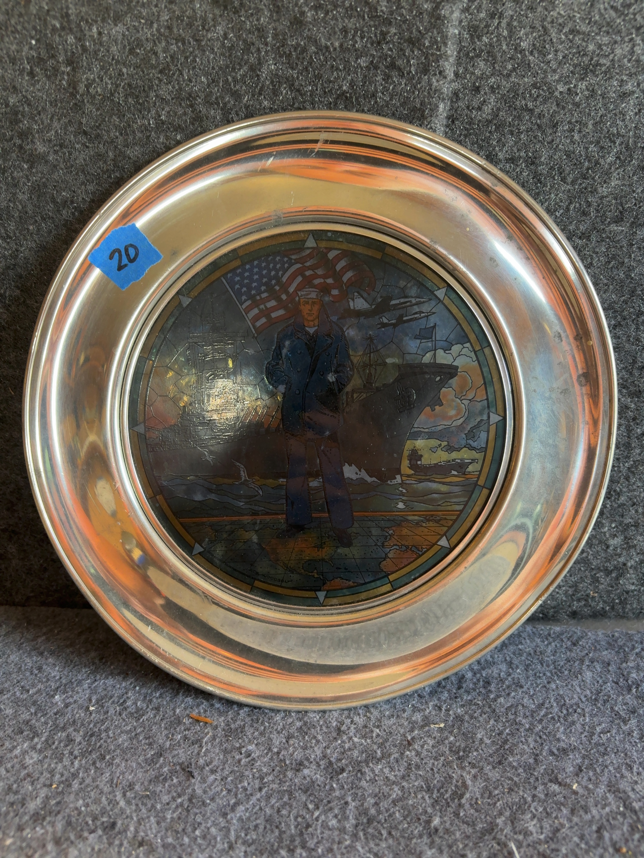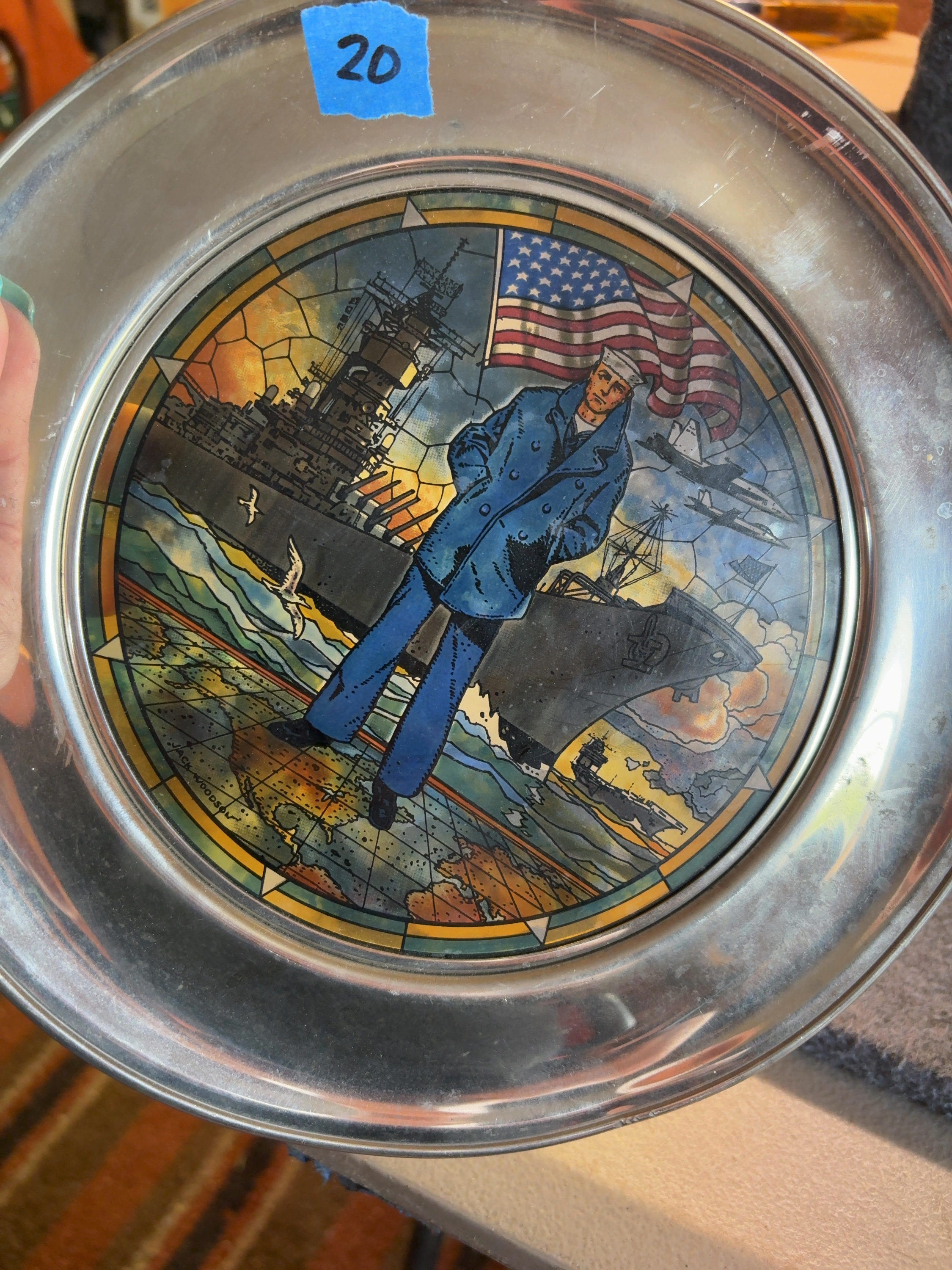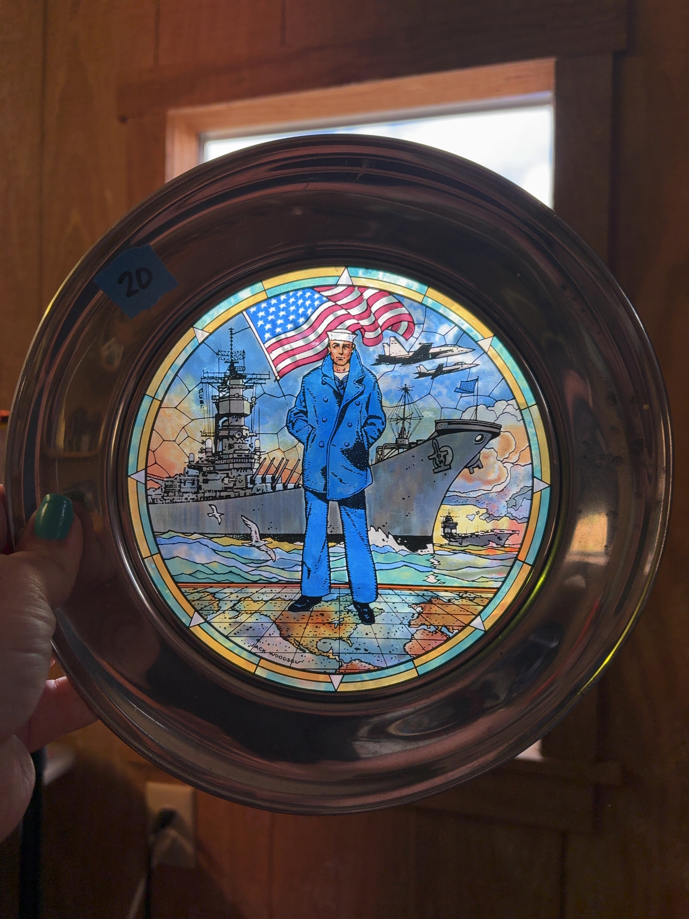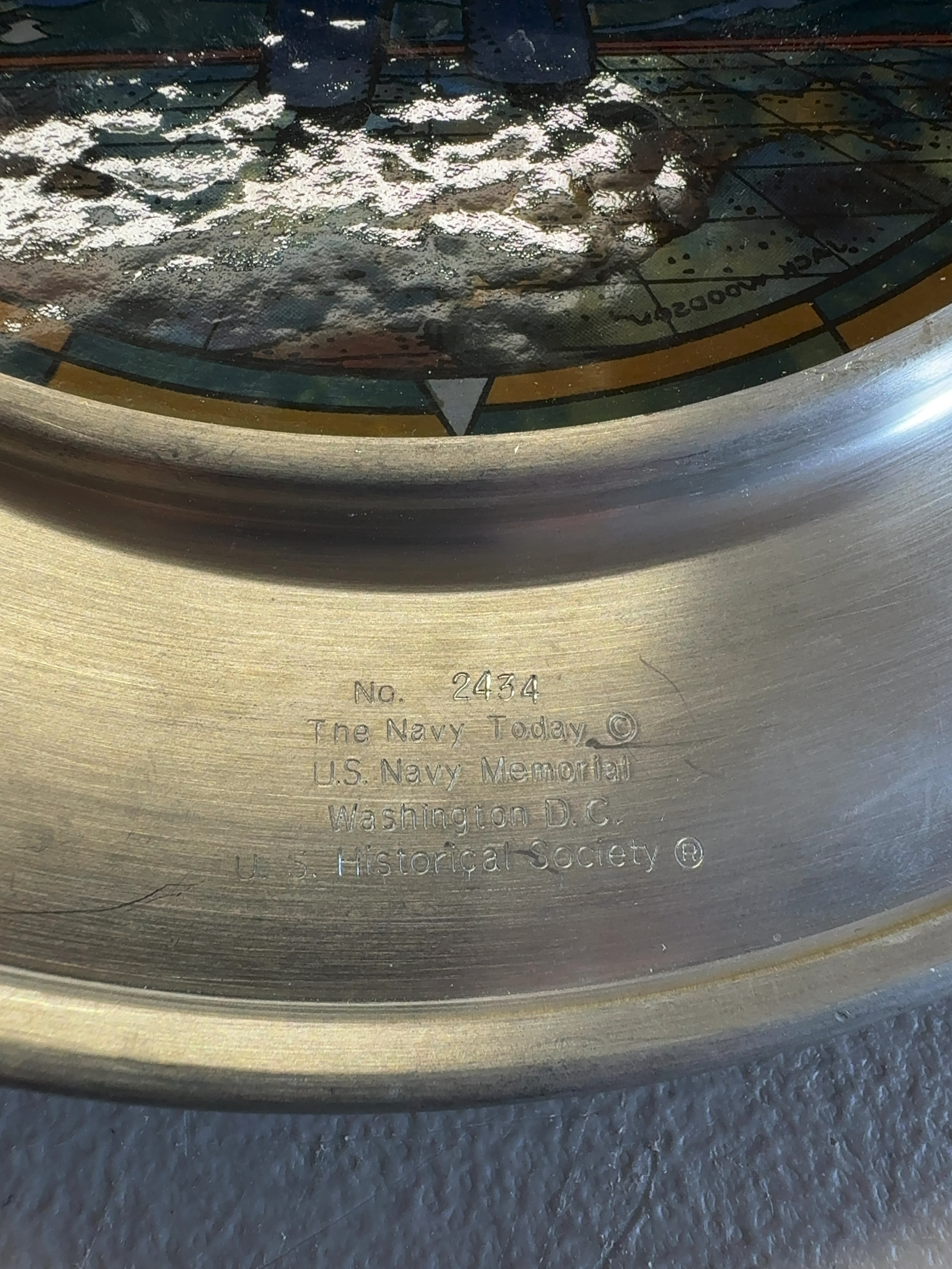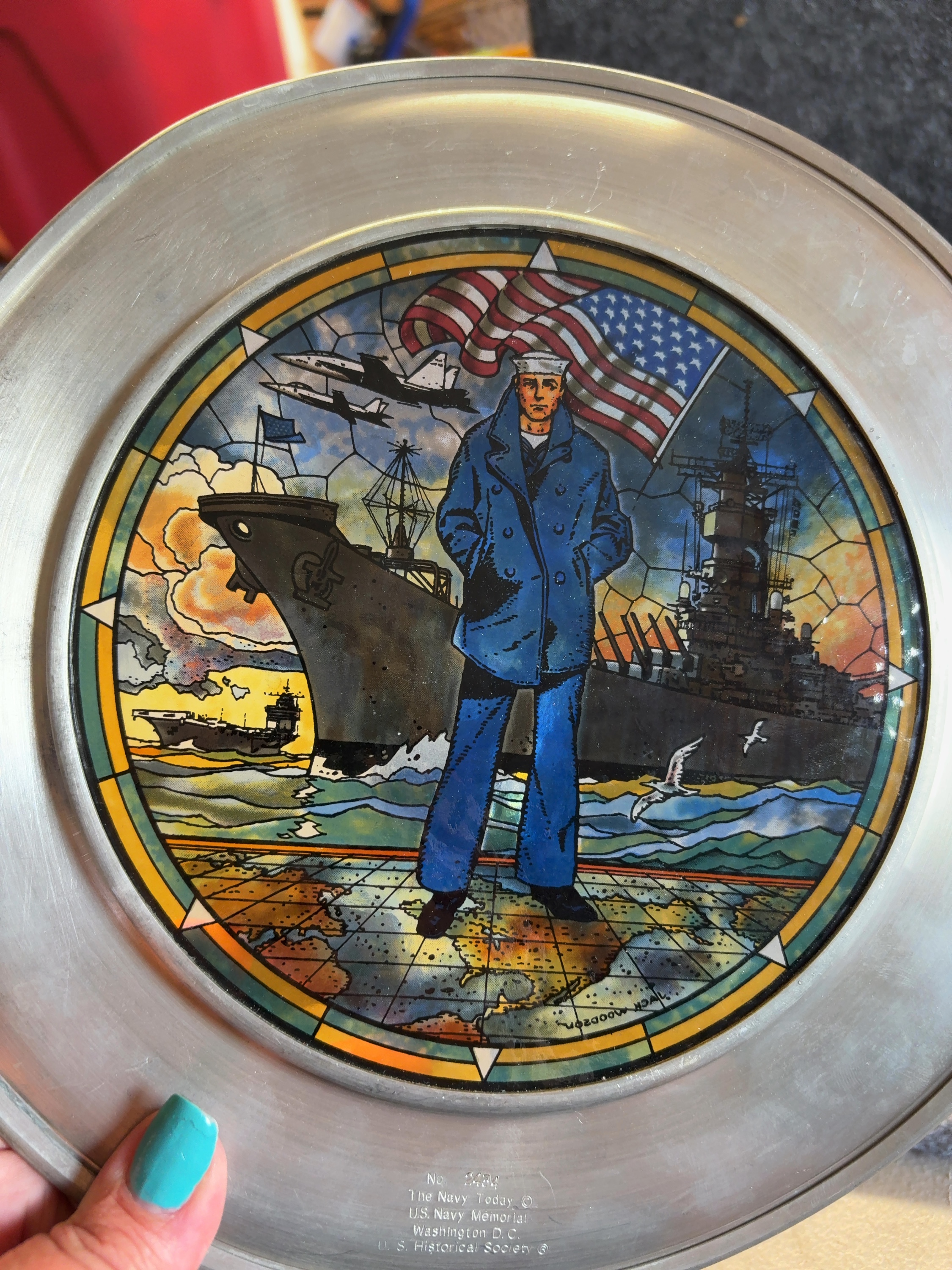 This commemorative plate, titled The Navy Today, was produced by the U.S. Historical Society in cooperation with the U.S. Navy Memorial in Washington, D.C. The item features a central circular translucent insert designed in a stained-glass style with artwork by Jack Woodson. The illustration depicts a United States Navy sailor in a traditional blue peacoat and white dixie cup cover standing before a waving American flag. The background shows a progression of naval vessels including a battleship, an aircraft carrier, and a support ship, with modern jet aircraft flying above. The scene is set over a stylized map of the world. The central insert is mounted within a wide, polished metal rim composed of a pewter-style alloy. The lower front of the metal rim is stamped with the following text: No. 2434, The Navy Today ©, U.S. Navy Memorial, Washington D.C., and U.S. Historical Society ®. The artwork within the insert contains the printed signature JACK WOODSON in the lower-left quadrant.