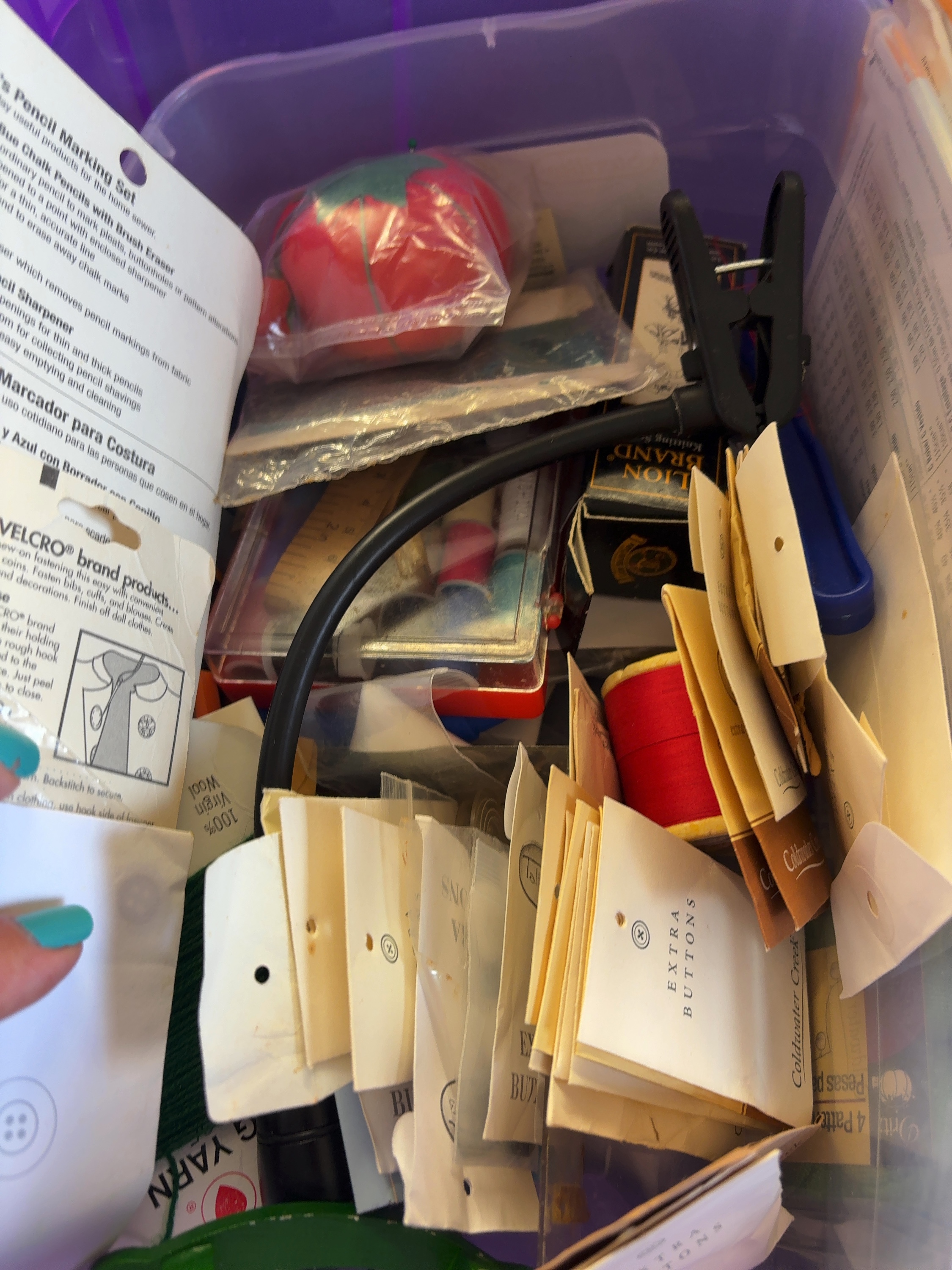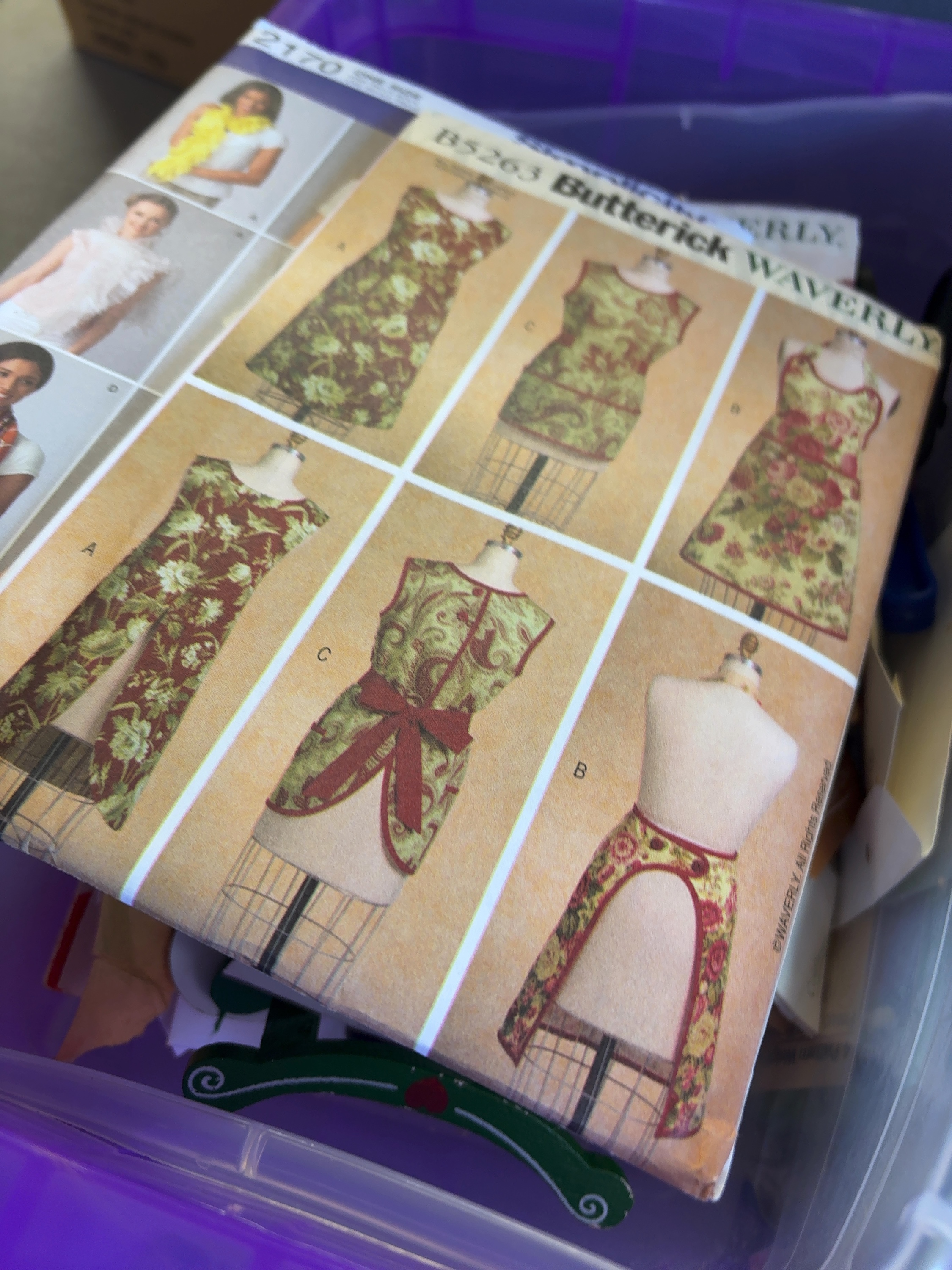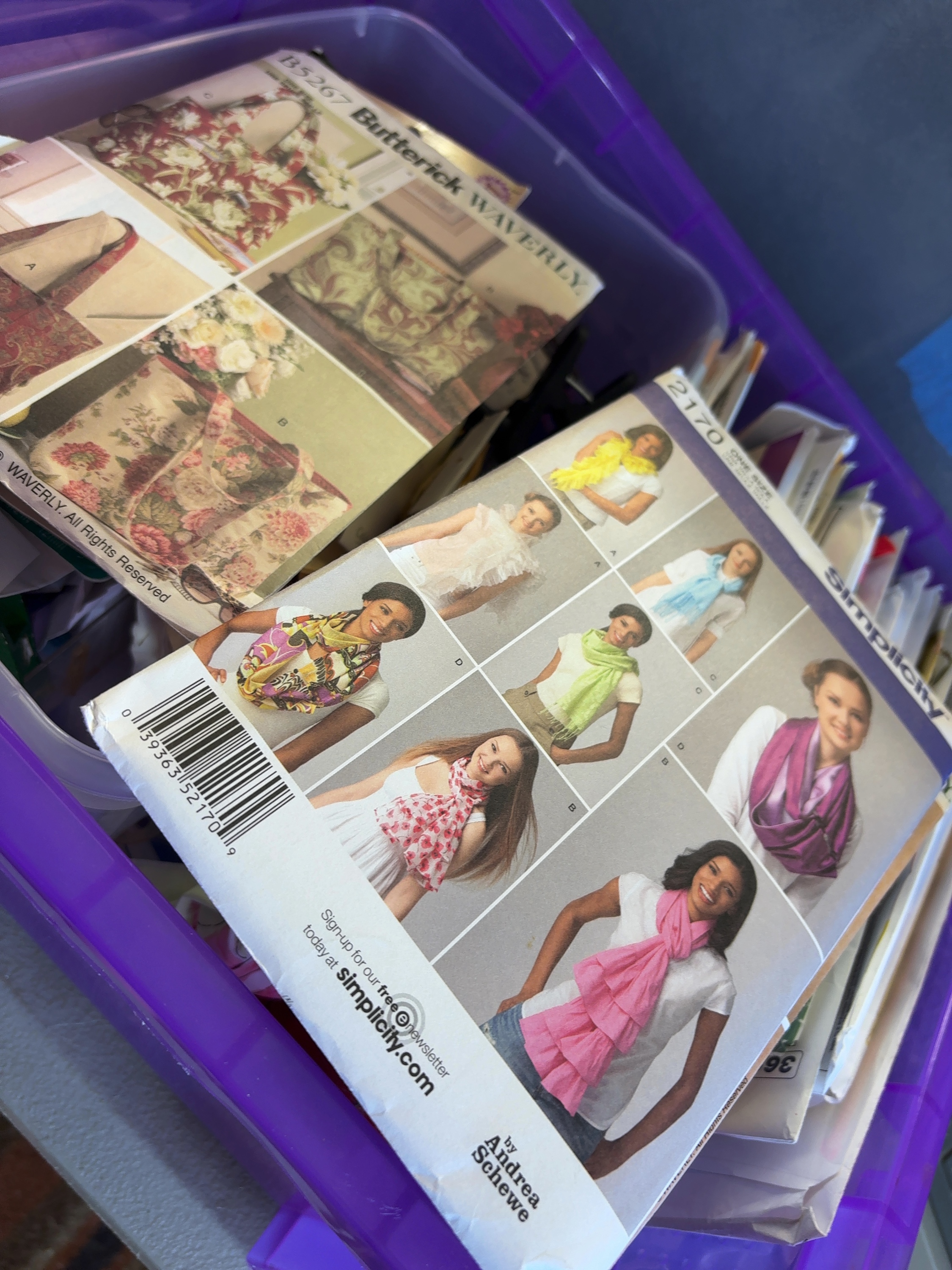 This collection consists of a variety of paper sewing patterns and sewing notions. The patterns, primarily from the late 20th to early 21st century, include designs from Simplicity, Butterick, and Kwik Sew. Identified patterns include Simplicity 2170 (scarf and wrap designs by Andrea Schewe), Butterick B5263 (Waverly collection aprons), and Butterick B5267 (Waverly collection home decor). Other patterns present include Simplicity 6874 and 3628. The notions include a Dritz Sewer’s Pencil Marking Set in its original blister pack, multiple retail-carded buttons from Coldwater Creek, and various spools of thread including Coats & Clark’s Dual Duty Plus (Art. C.67). The lot also features a tomato-style pin cushion, plastic sewing clips, Velcro brand products, a box of Lion Brand yarn, and fabric remnants. The items are contained within a purple plastic storage bin with a clear lid.