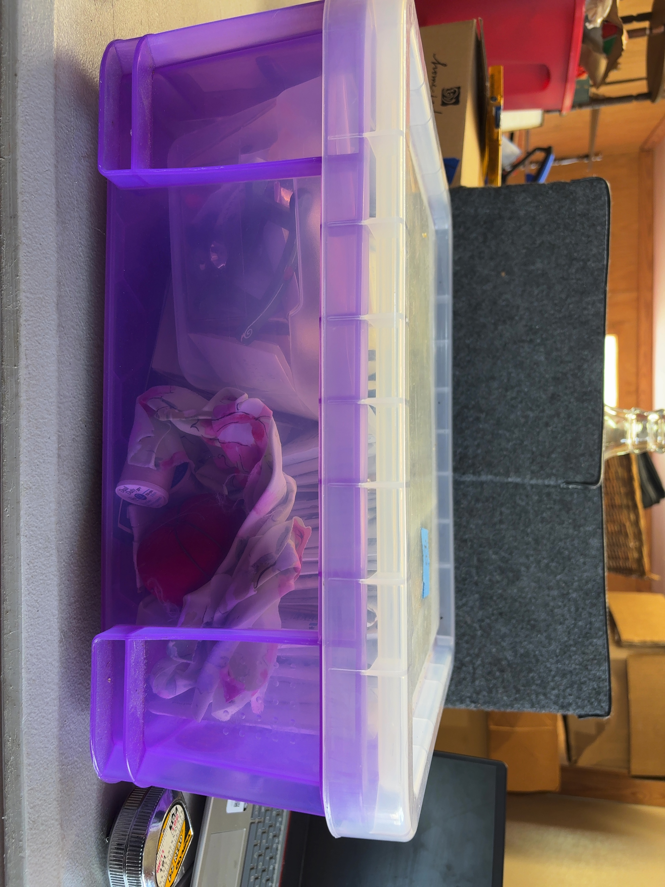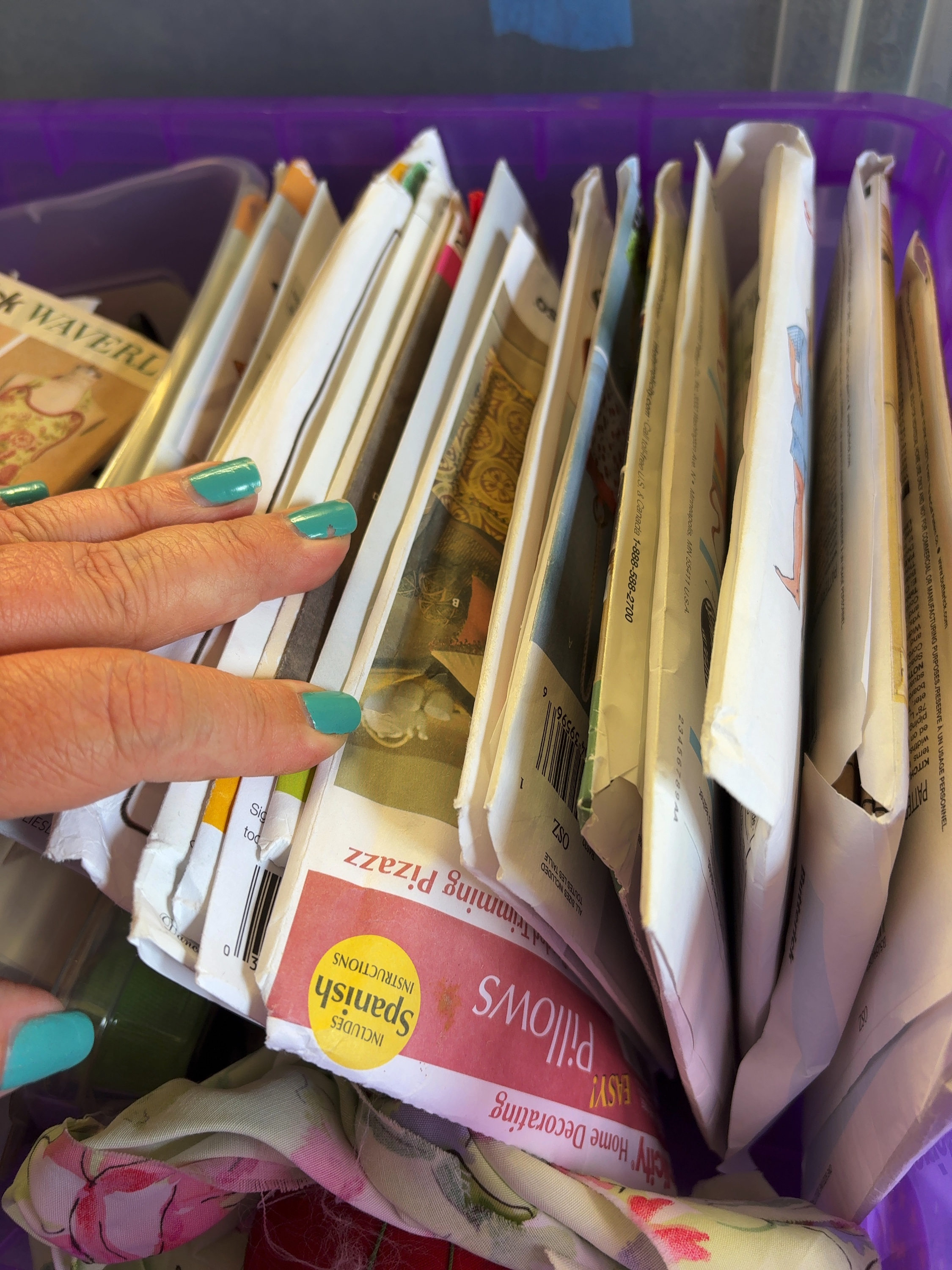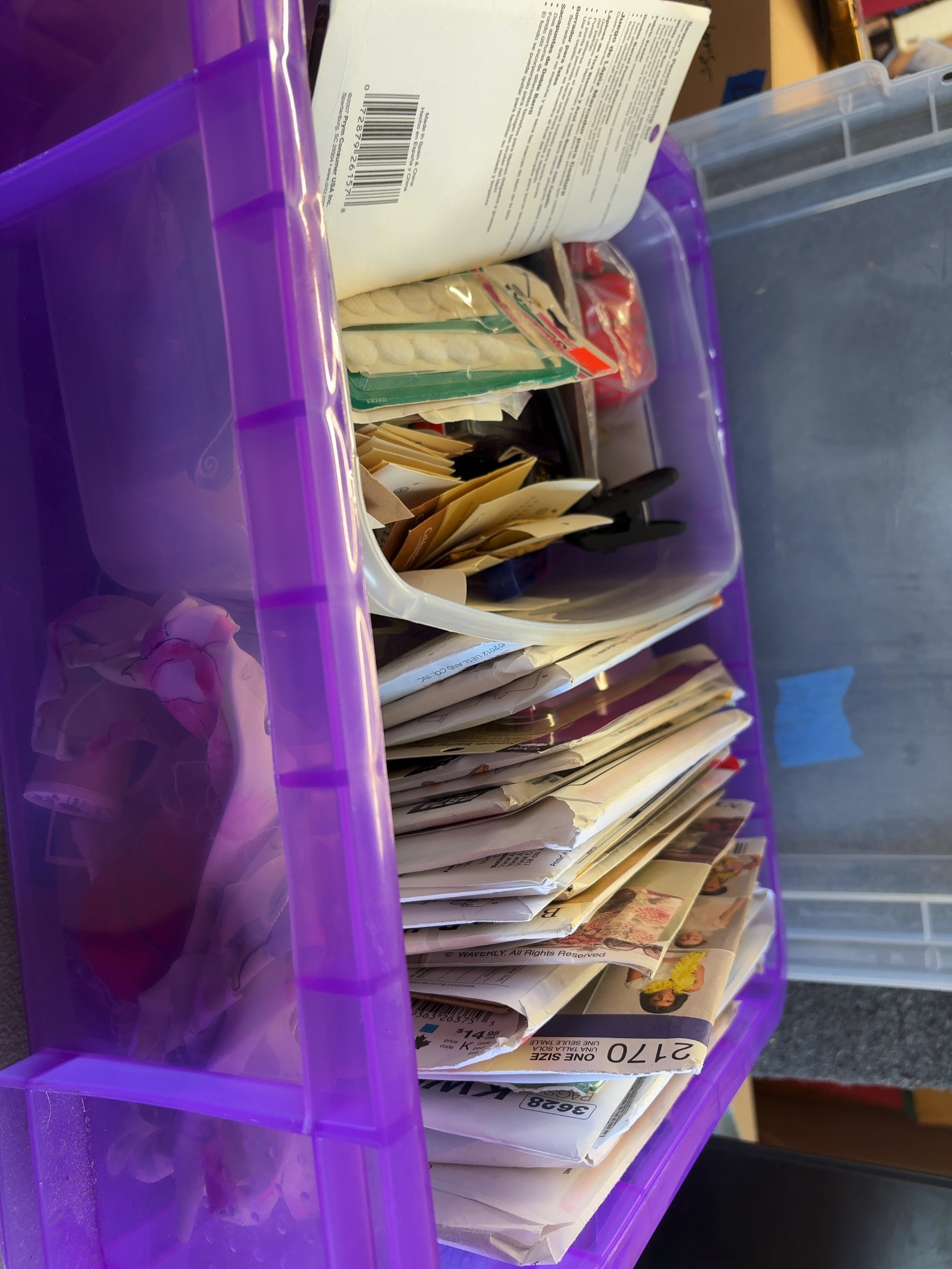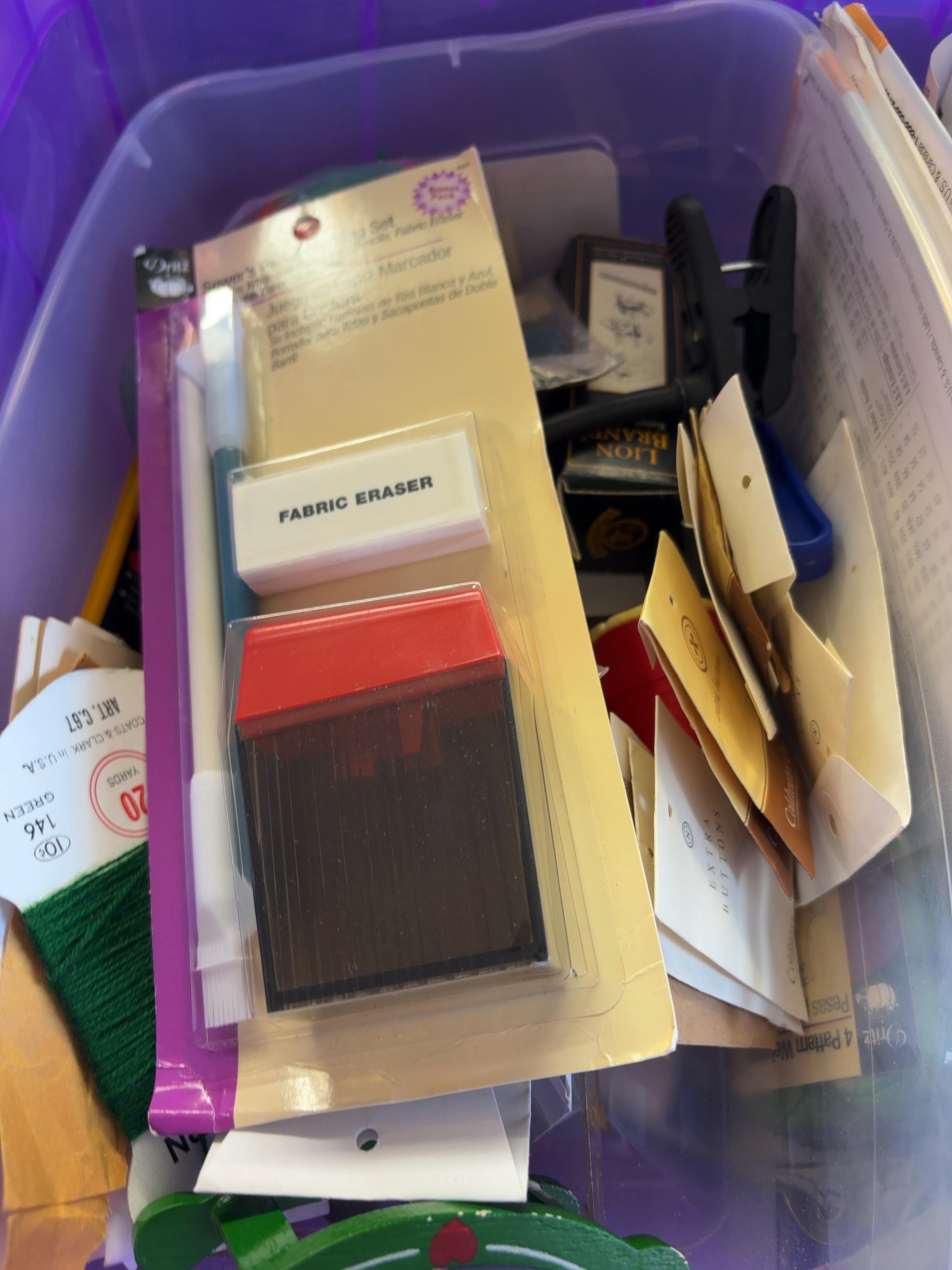 This collection consists of a variety of paper sewing patterns and sewing notions. The patterns, primarily from the late 20th to early 21st century, include designs from Simplicity, Butterick, and Kwik Sew. Identified patterns include Simplicity 2170 (scarf and wrap designs by Andrea Schewe), Butterick B5263 (Waverly collection aprons), and Butterick B5267 (Waverly collection home decor). Other patterns present include Simplicity 6874 and 3628. The notions include a Dritz Sewer’s Pencil Marking Set in its original blister pack, multiple retail-carded buttons from Coldwater Creek, and various spools of thread including Coats & Clark’s Dual Duty Plus (Art. C.67). The lot also features a tomato-style pin cushion, plastic sewing clips, Velcro brand products, a box of Lion Brand yarn, and fabric remnants. The items are contained within a purple plastic storage bin with a clear lid.