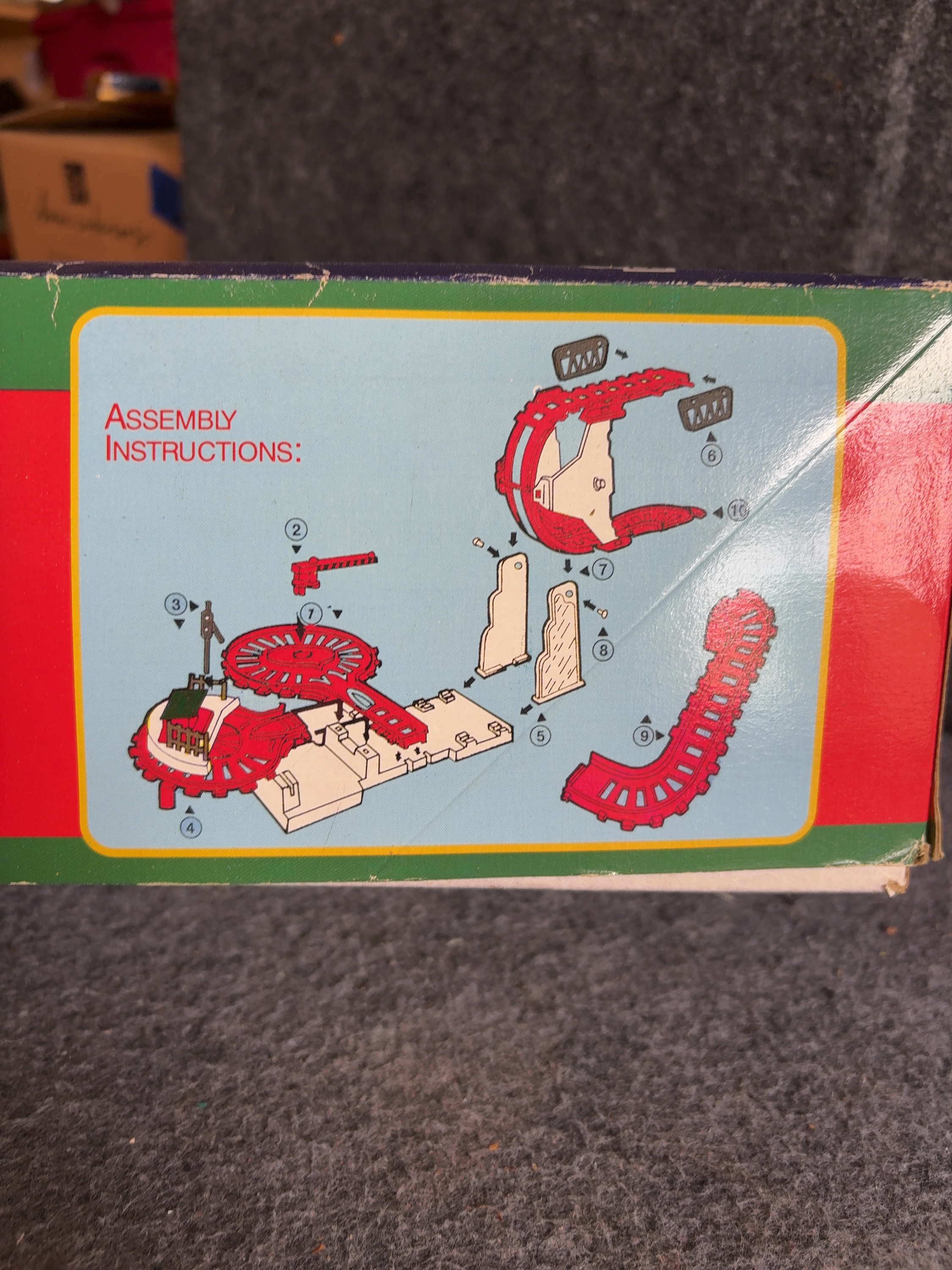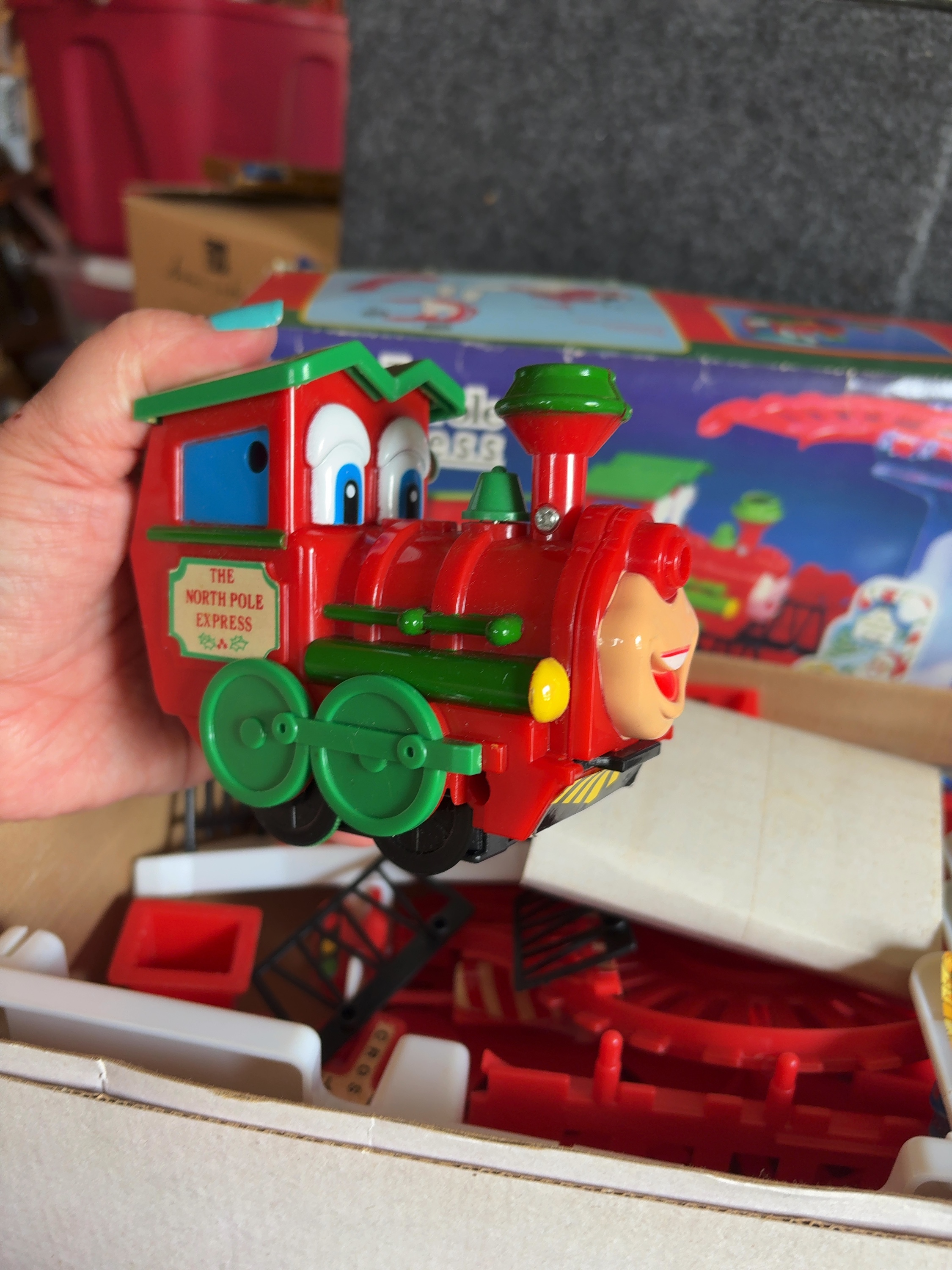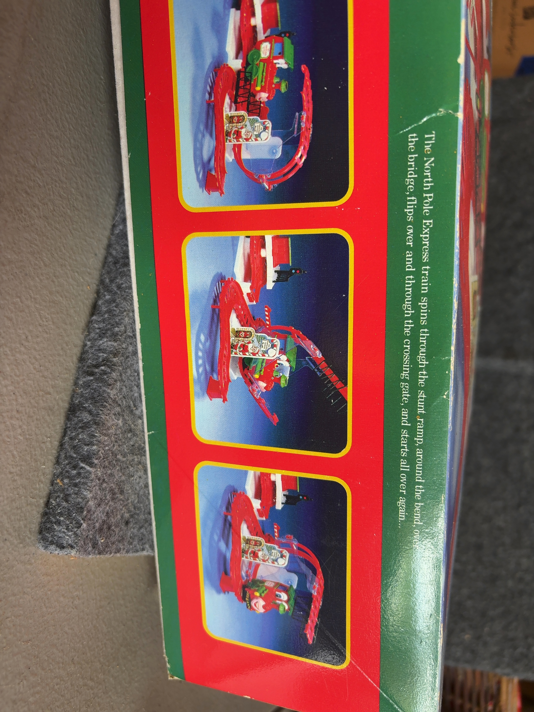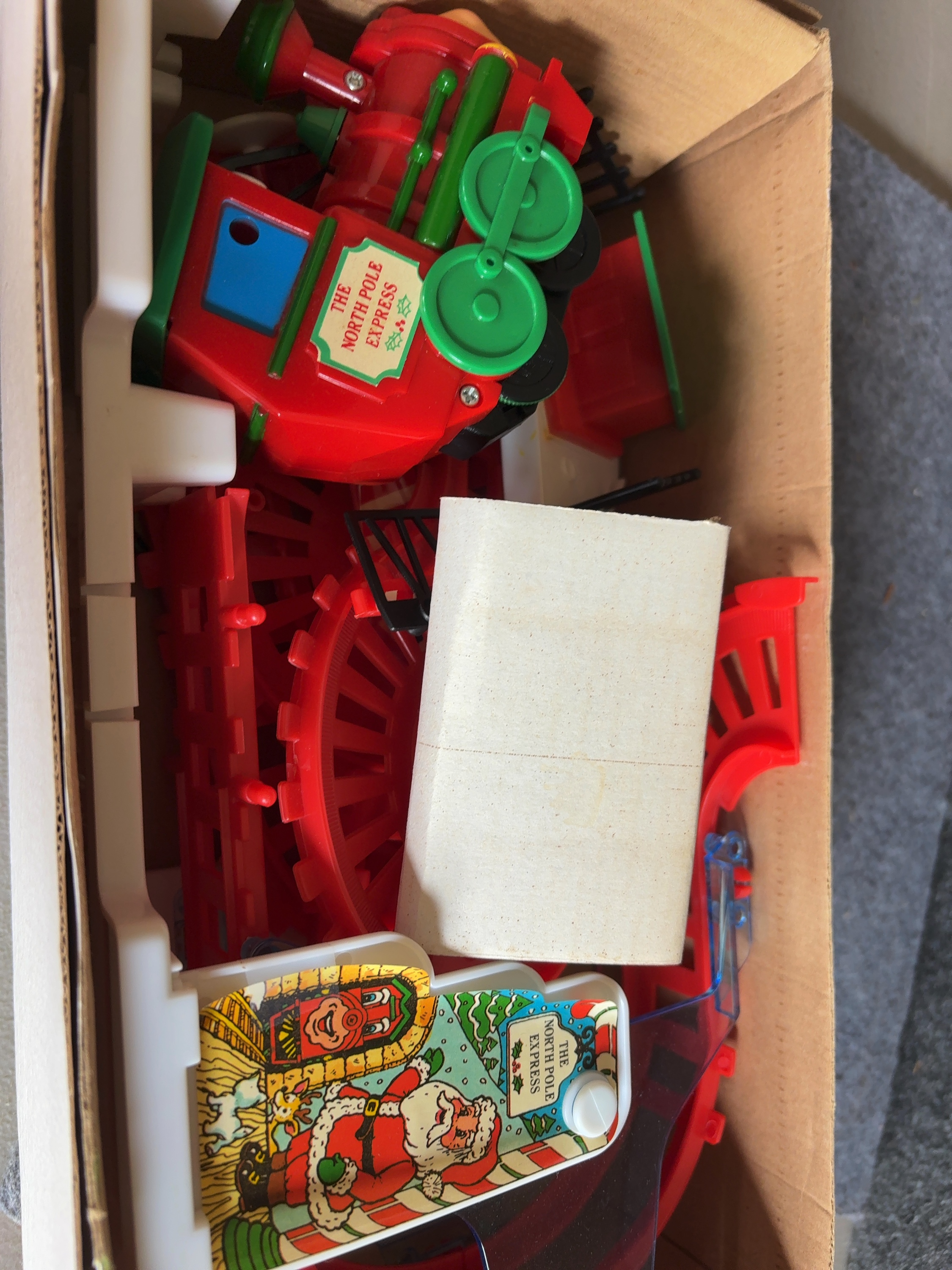 This battery-operated stunt train track set was manufactured by Kurt S. Adler under the Santa’s World brand and is titled The North Pole Express. The set is constructed from molded plastic components in red, green, and white. The locomotive features a character face on the front and side stickers labeled The North Pole Express with holly leaf graphics. The track assembly is designed to allow the locomotive to travel through a stunt ramp, perform a flip, and pass through a crossing gate. Included components consist of the locomotive, various red plastic track sections, white support structures, and decorative signage such as a Santa Claus-themed crossing gate. The original box features an assembly diagram on the back panel. The toy is designed to produce sounds of a train engine and a whistle during operation.