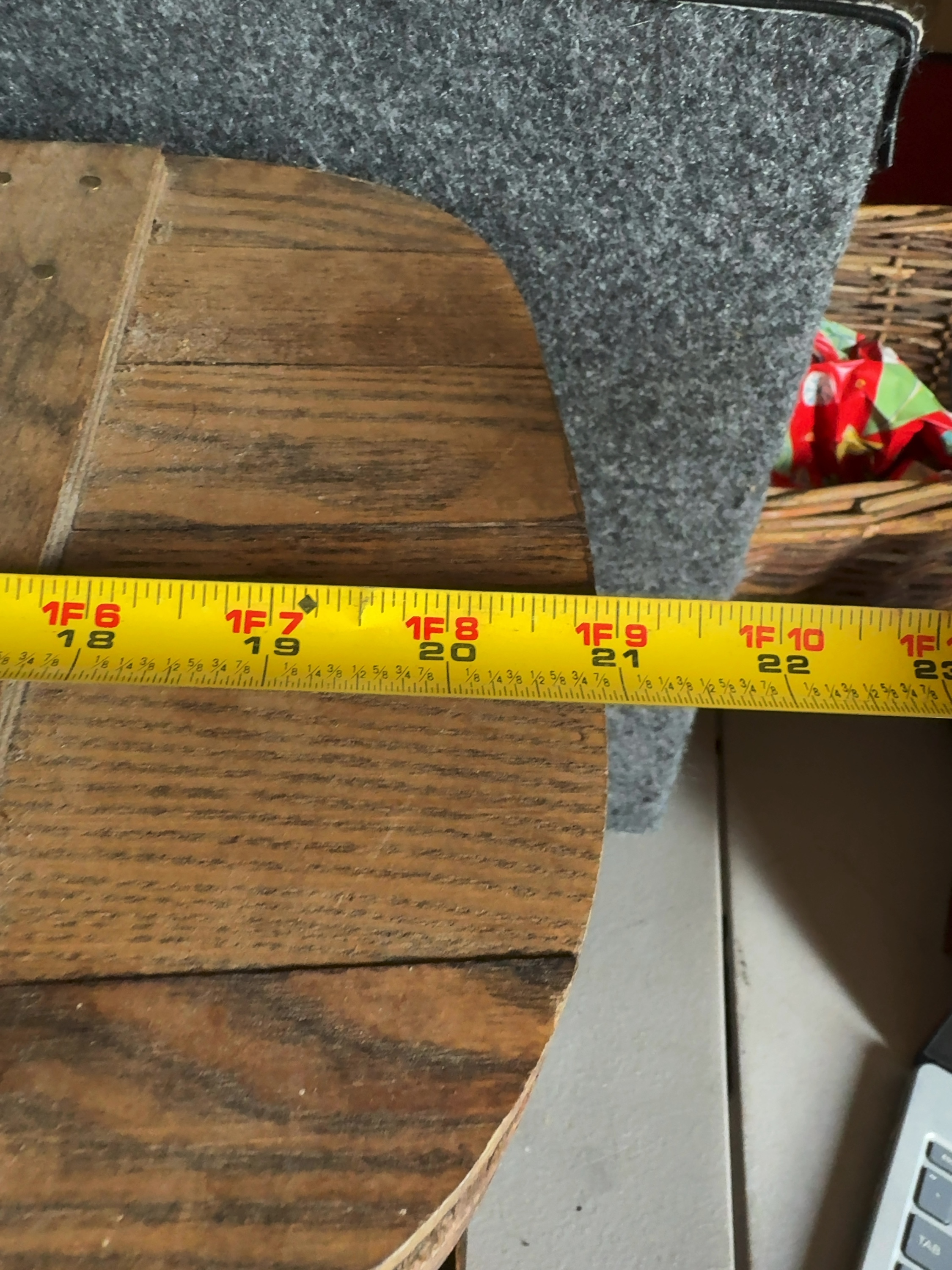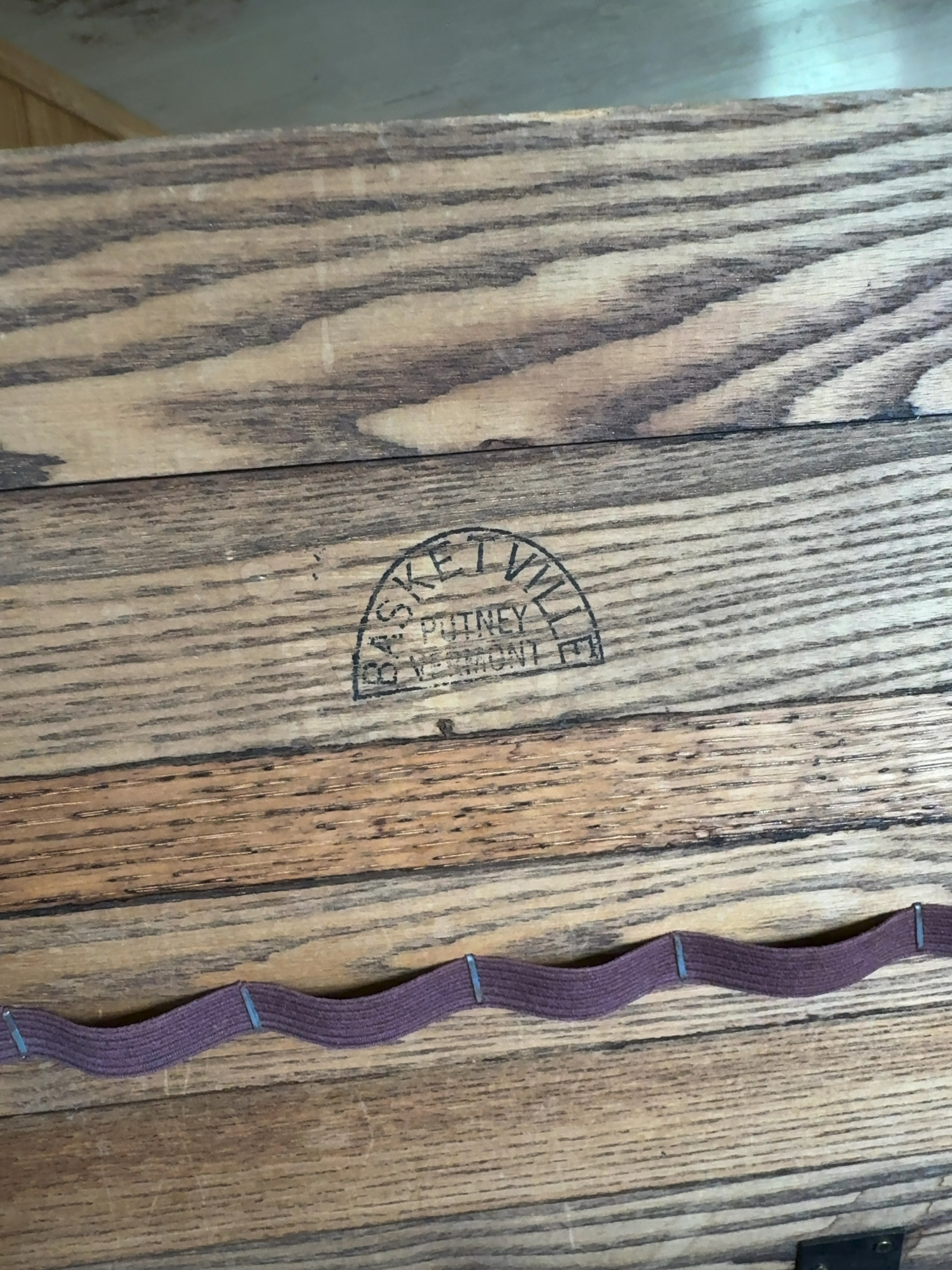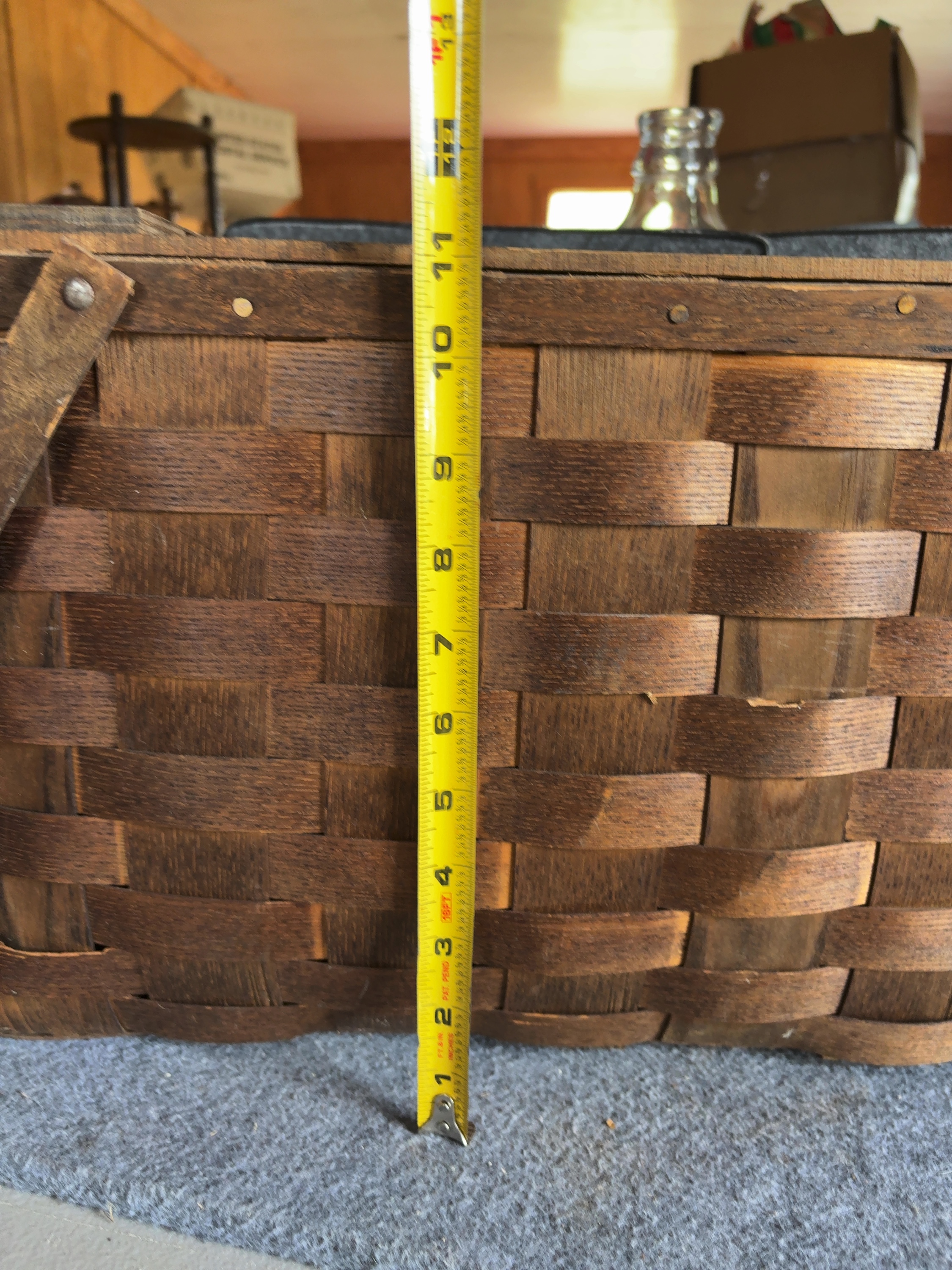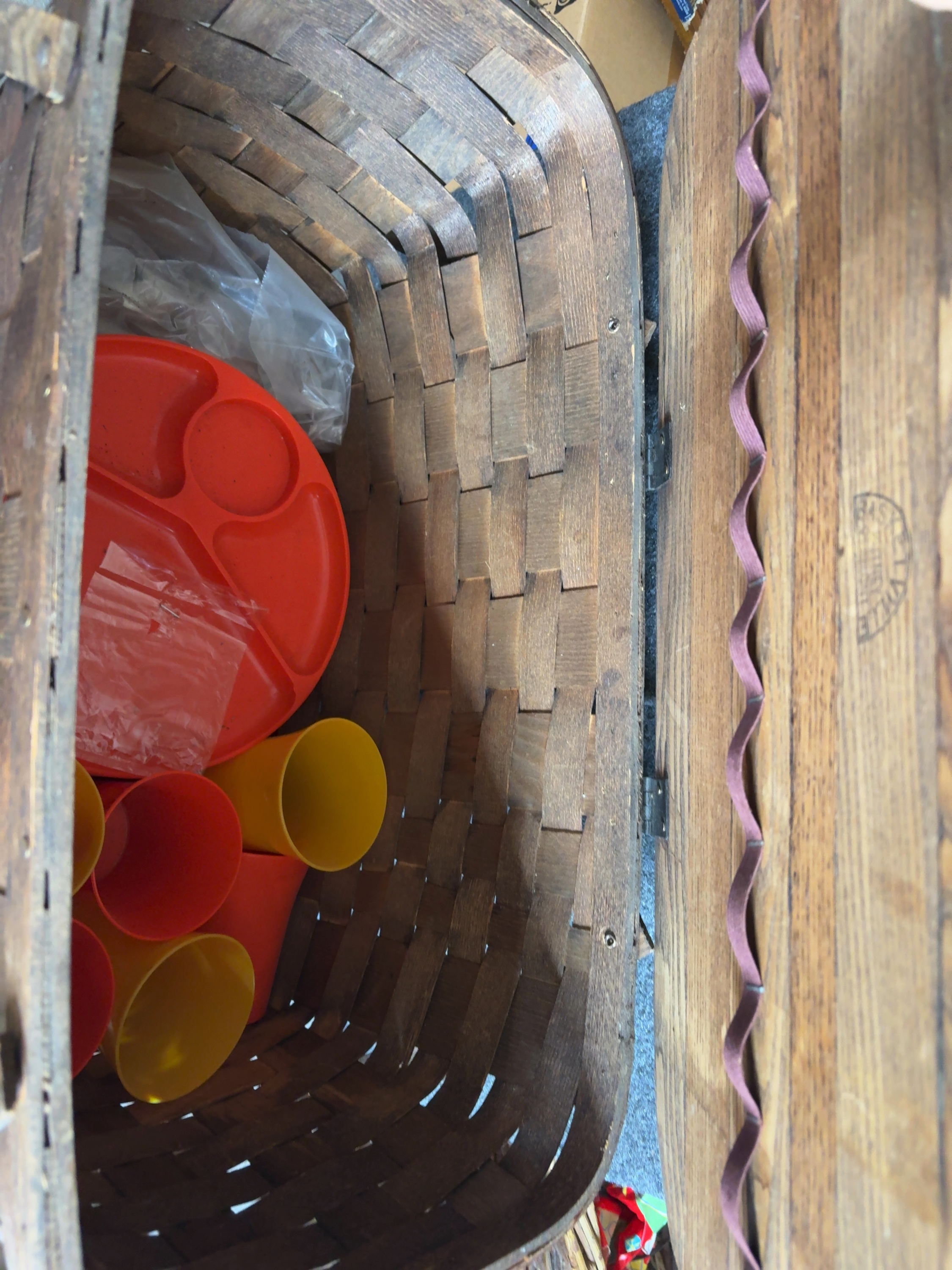 A picnic basket manufactured by Basketville of Putney, Vermont, featuring woven wood splint construction with a dark-stained finish. The basket is designed with a solid wood plank lid and base, with the lid secured by metal hinges. The interior underside of the lid contains a wavy elastic band for utensil storage and bears a black ink stamp reading BASKETVILLE / PUTNEY / VERMONT. Included with the basket is an assortment of plastic picnic ware, comprising a red divided plate and several red and yellow cups.