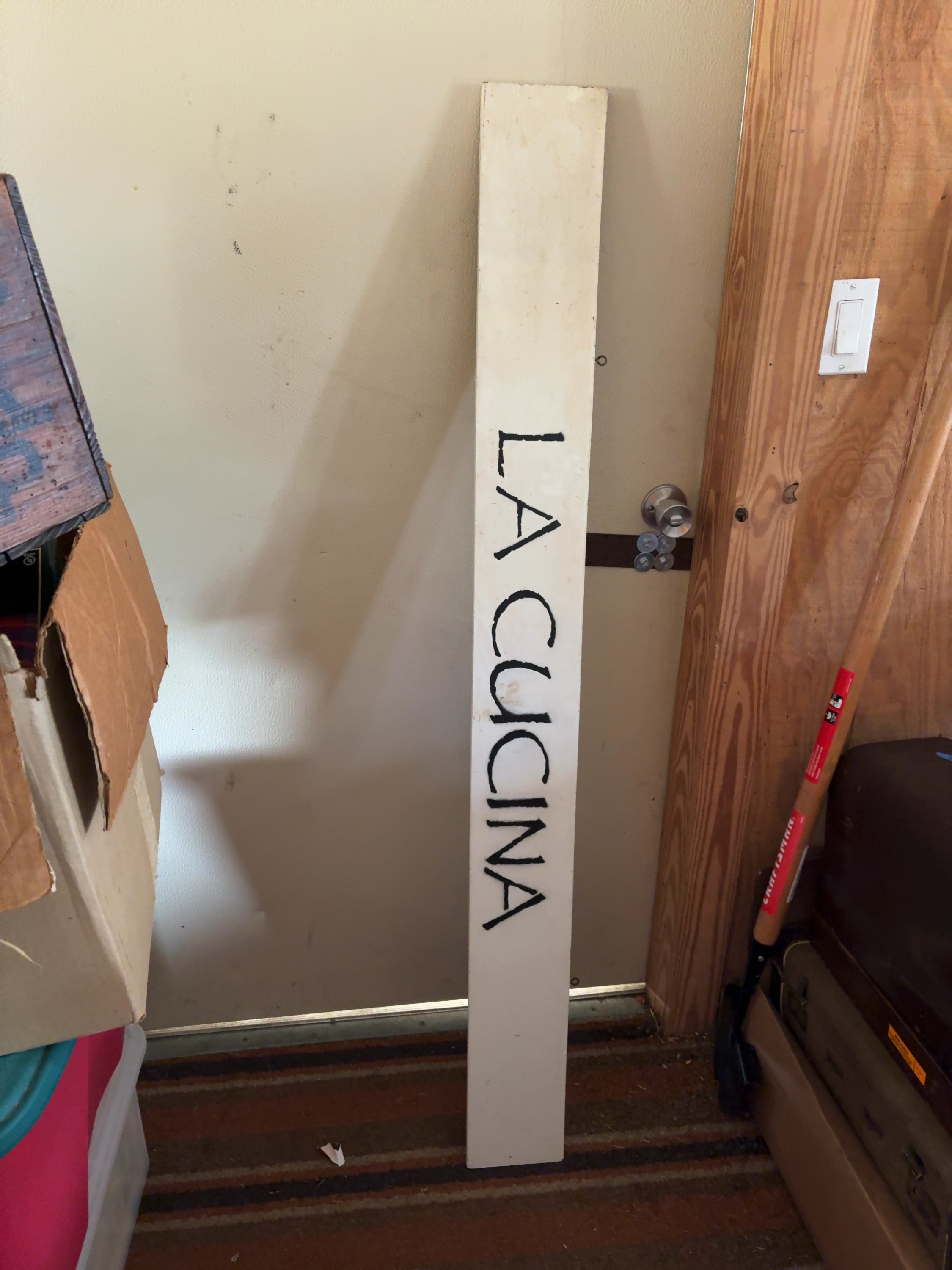 A mid-to-late 20th-century double-sided vertical advertising sign constructed from a painted board. Side A features vertically oriented dark green lettering on an off-white ground reading STEAKS followed by the word also in stylized script and SEAFOOD BUFFET at the base. The typography for the primary text is a bold sans-serif block font. Side B displays hand-painted black lettering reading LA CUCINA in a vertical orientation, indicating the sign was repurposed or modified at a later date. The sign includes a metal screw-eye hanging loop on one edge.