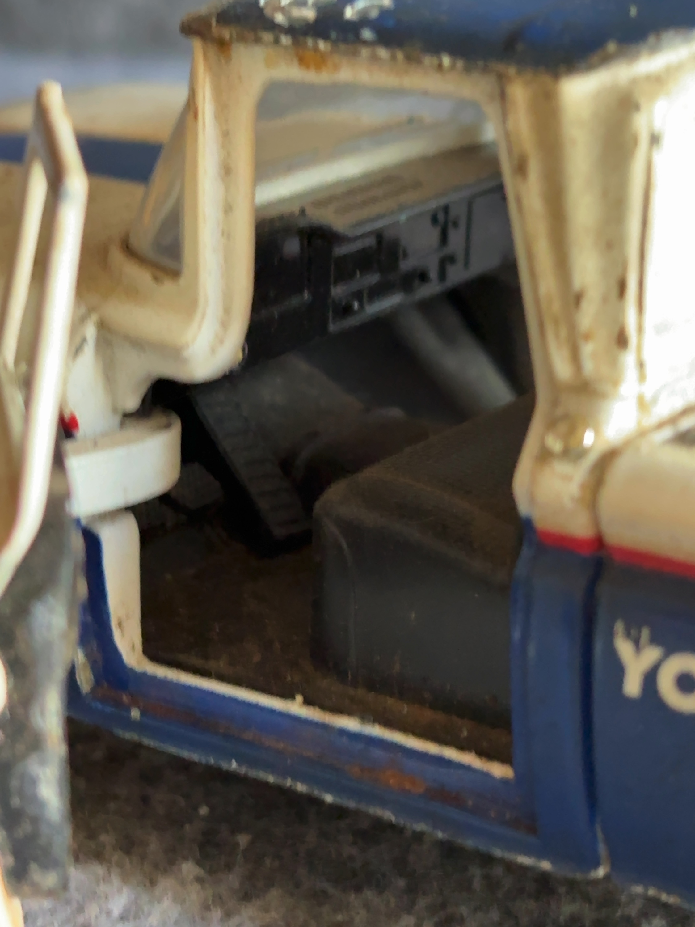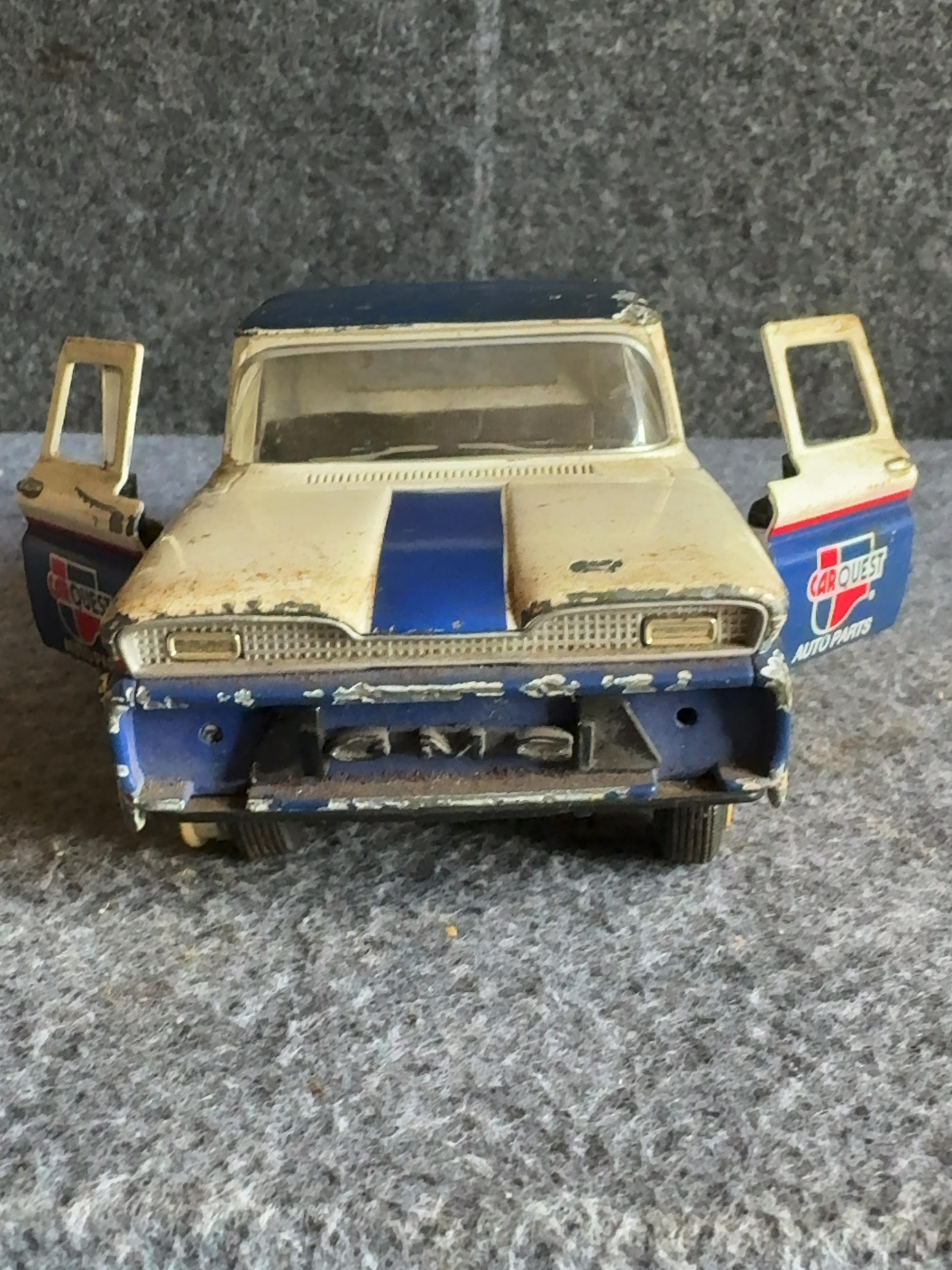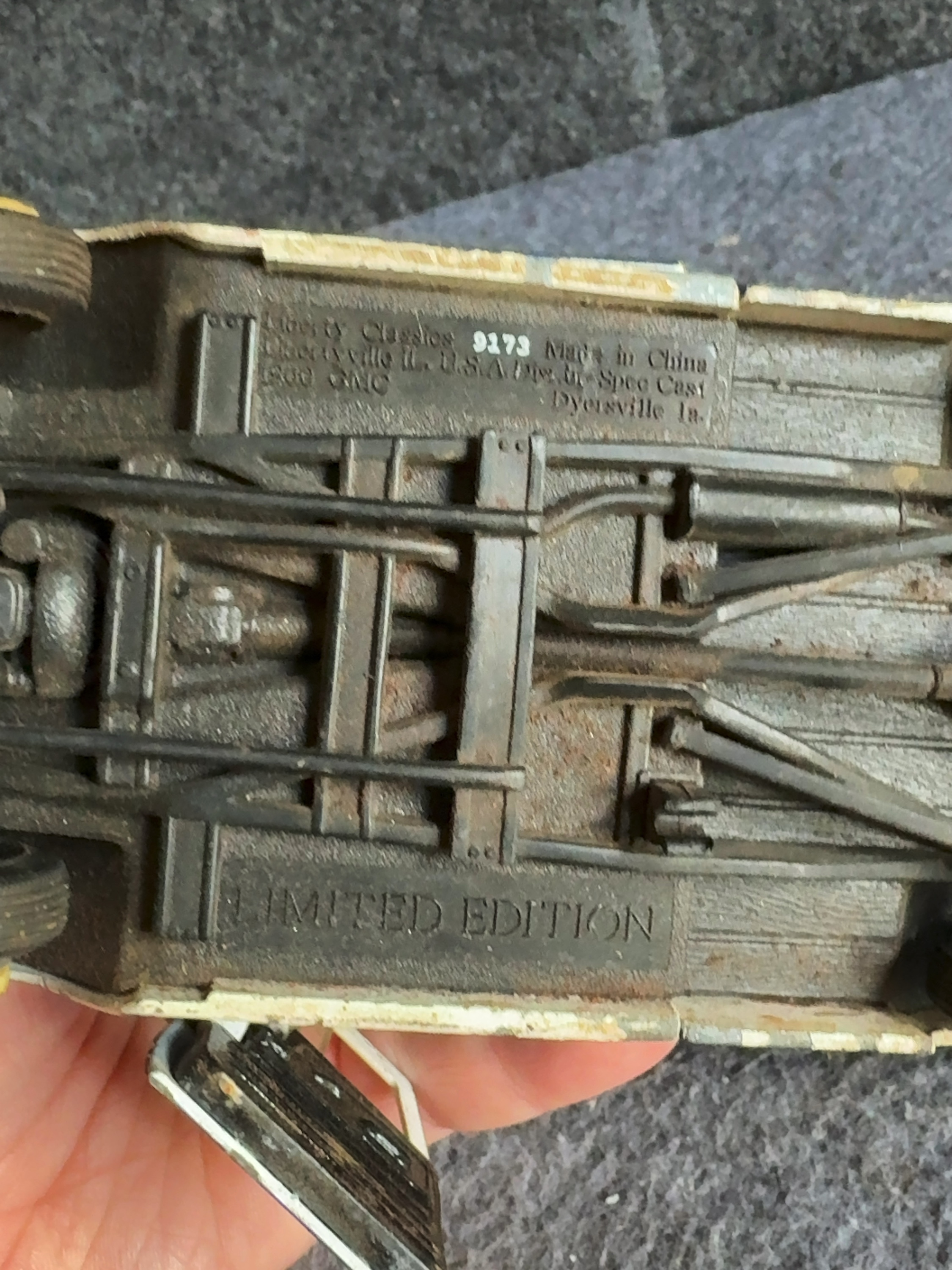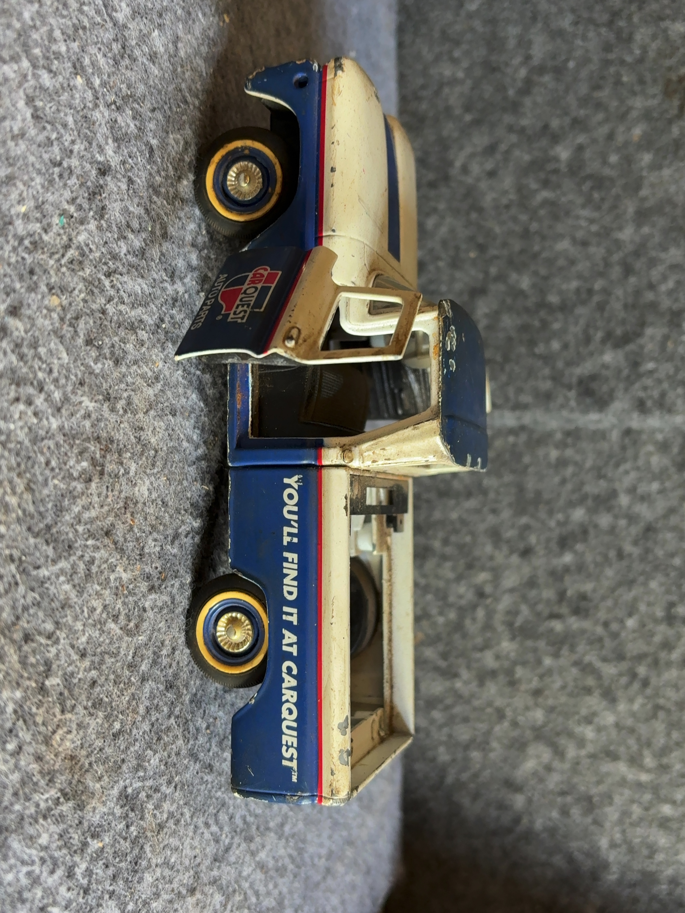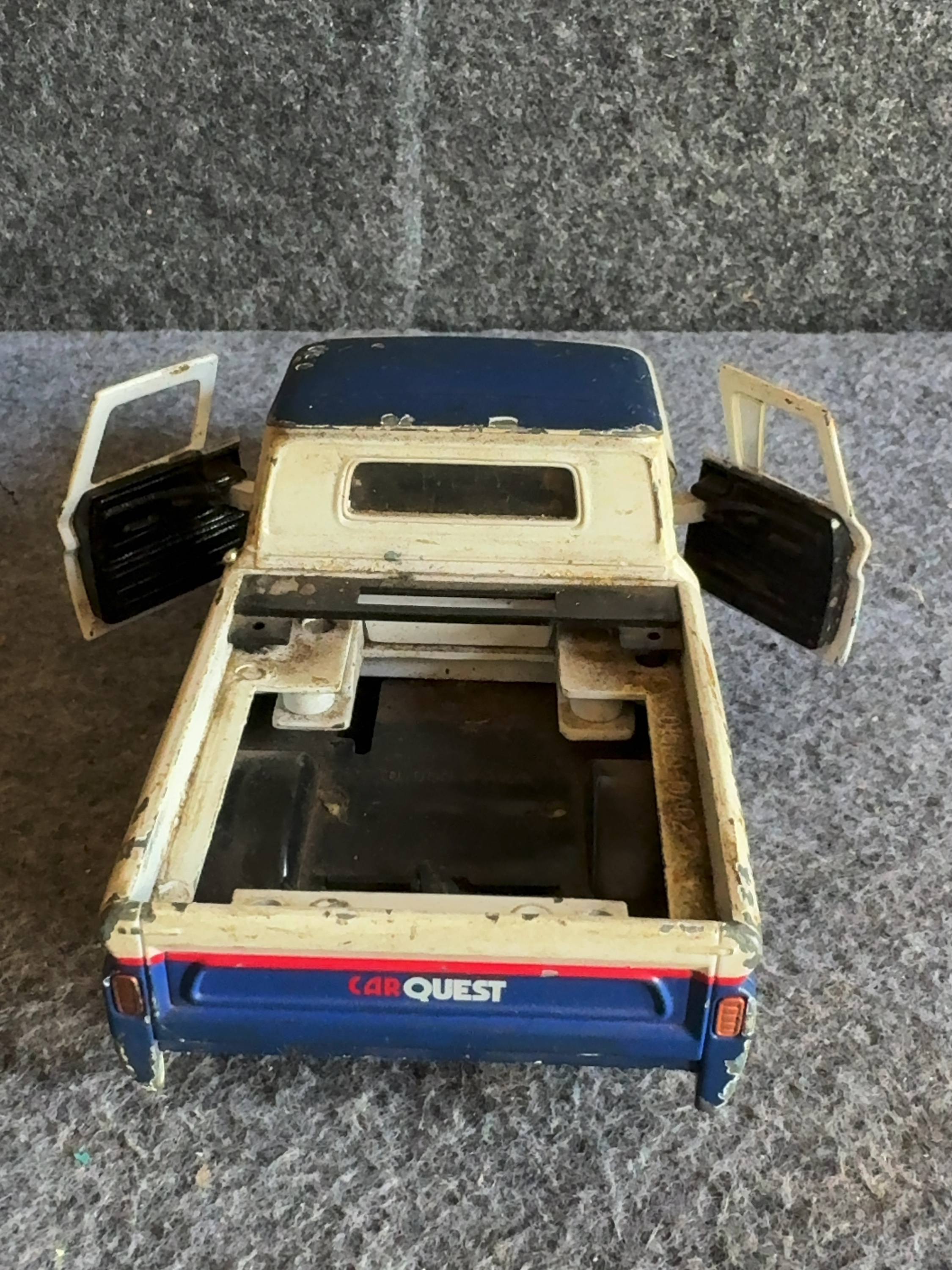 This promotional model of a 1960 GMC pickup truck was manufactured by Liberty Classics, a division of Spec Cast, for Carquest Auto Parts. The vehicle is constructed of die-cast metal with plastic components and features a two-tone white and blue paint scheme with red pinstriping. The exterior includes the Carquest Auto Parts logo on the doors and tailgate, with the slogan Youll Find It At Carquest printed on the bedside panels. The truck features opening driver and passenger doors, a black plastic interior, and rolling wheels with cream-colored sidewalls and detailed hubcaps. The underside of the chassis features raised lettering that reads: Liberty Classics, 9173, Made in China, Libertyville IL, U.S.A., Div. by Spec Cast, 1960 GMC, Dyersville Ia., and LIMITED EDITION. This item was originally produced as a collectible coin bank.