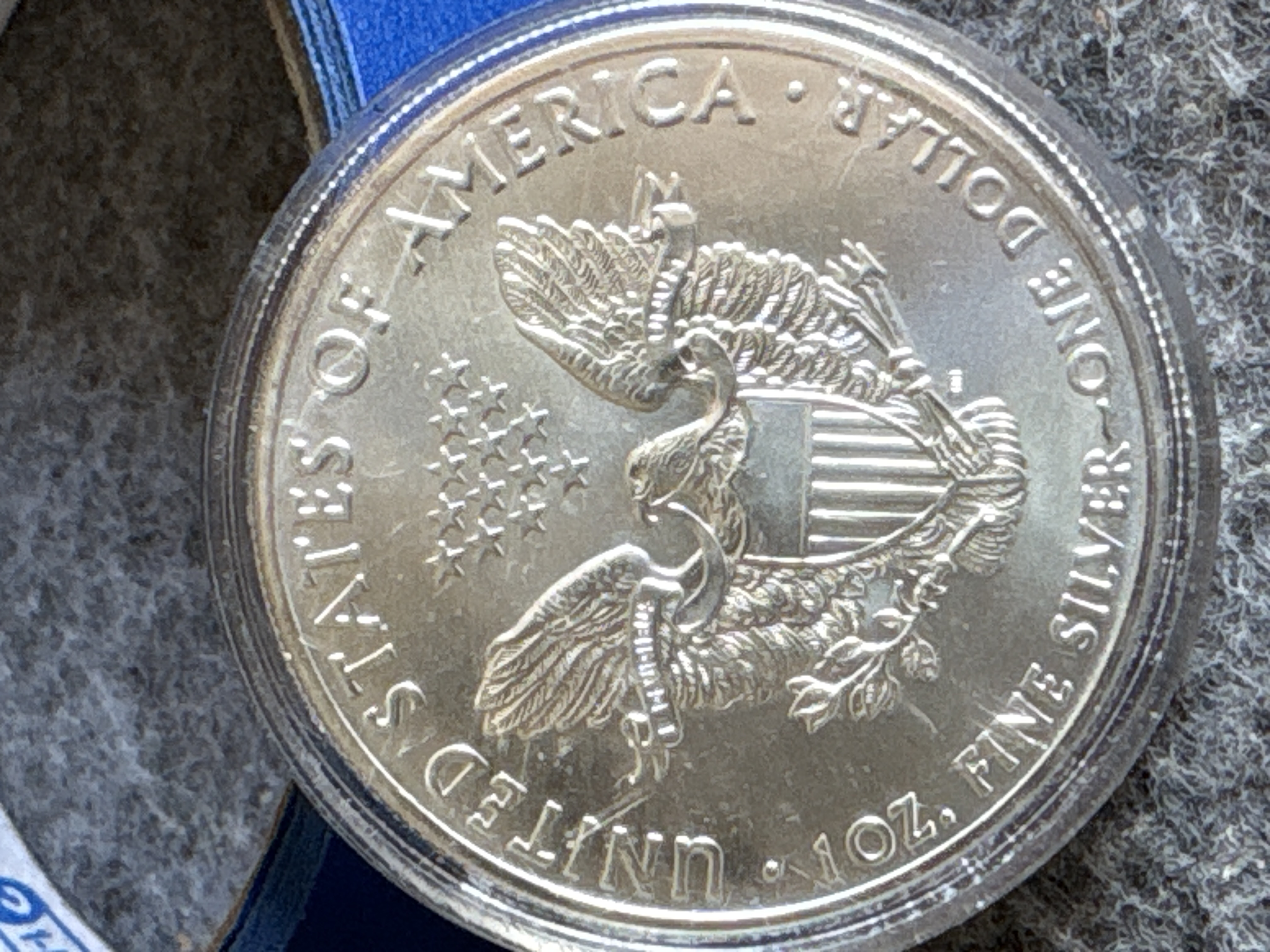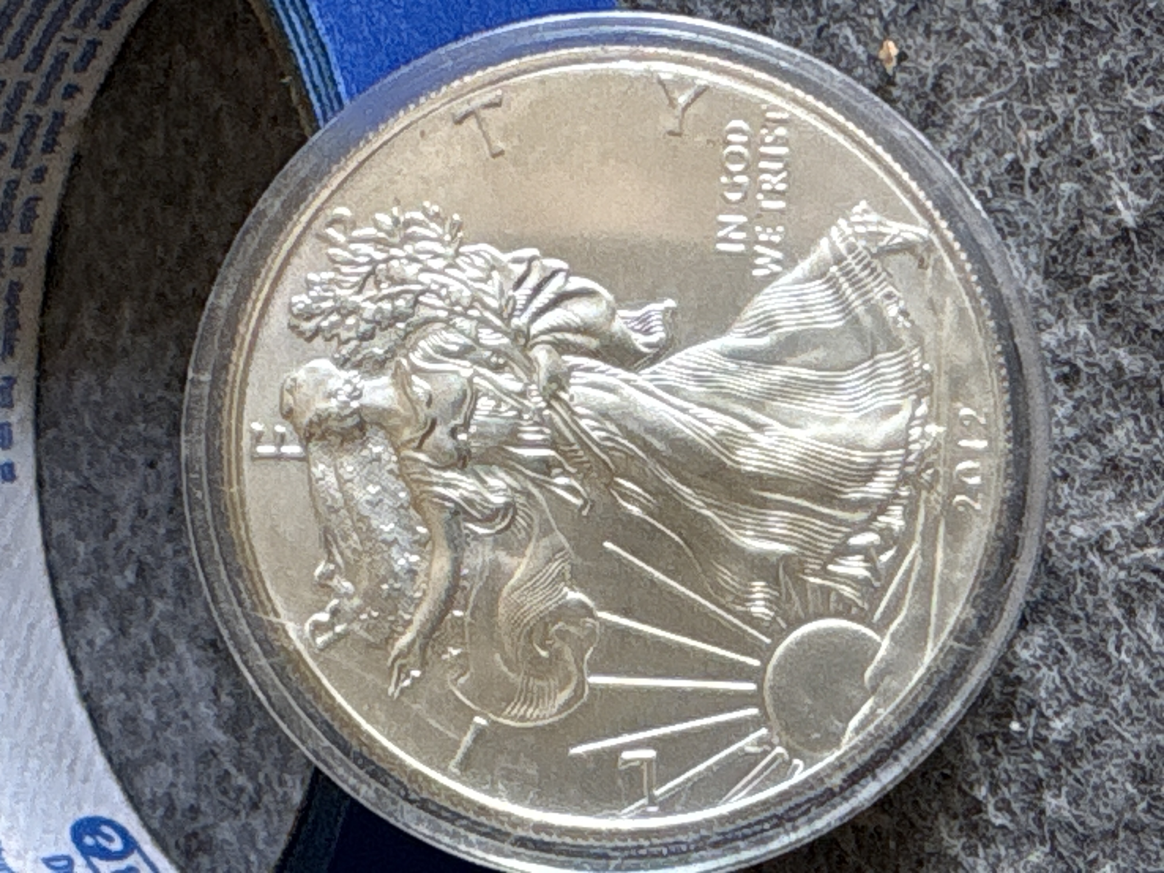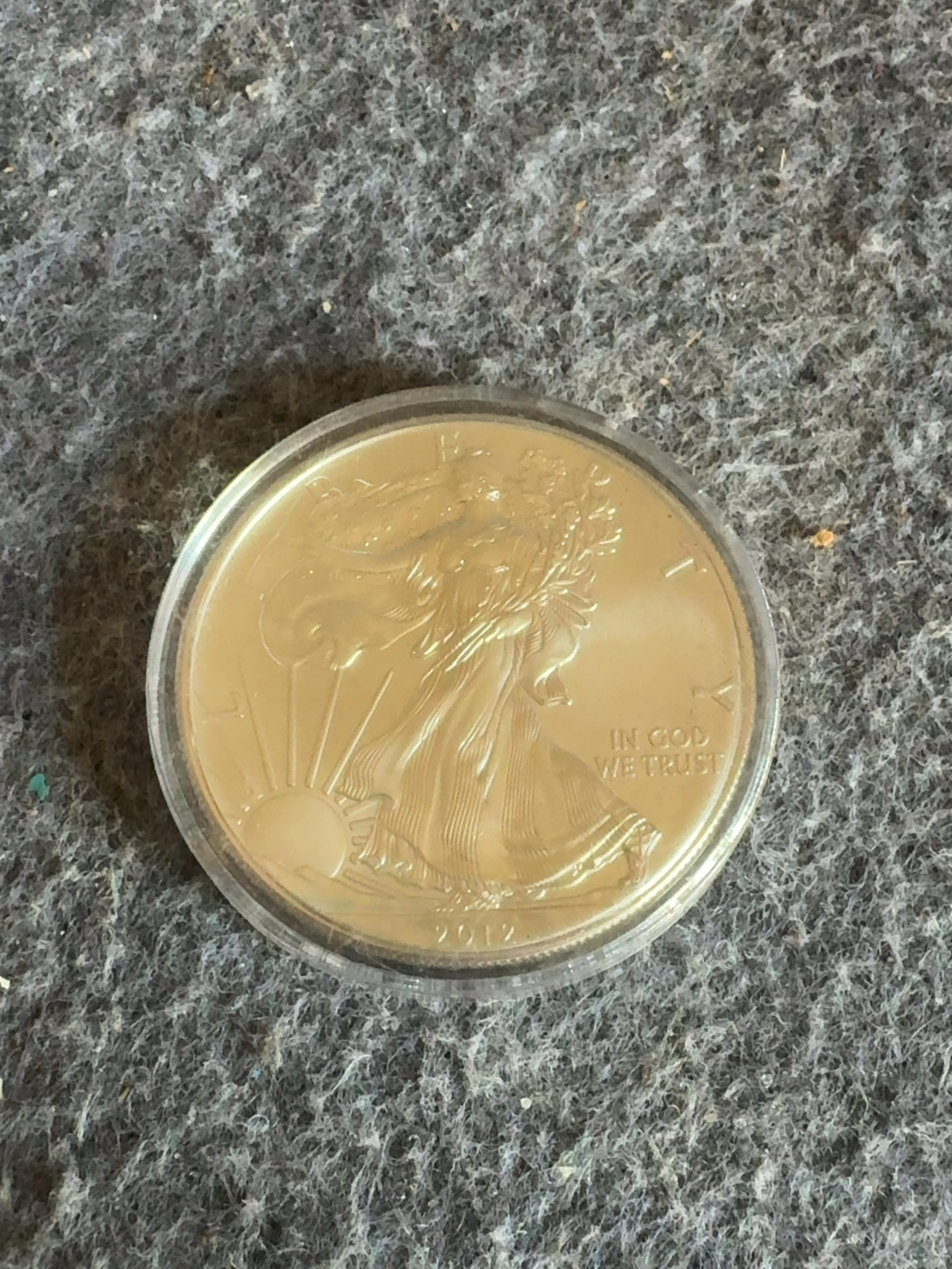 This 2012 US Silver Eagle is a one-dollar denomination bullion coin struck in one ounce of fine silver. The obverse features the Walking Liberty design with inscriptions for LIBERTY, IN GOD WE TRUST, and the date 2012. The reverse displays the heraldic eagle design with inscriptions for UNITED STATES OF AMERICA, 1 OZ. FINE SILVER, and ONE DOLLAR, along with the motto E PLURIBUS UNUM on a ribbon. The coin is housed in a generic clear plastic protective capsule. No mint mark is visible on the reverse. The American Silver Eagle was first released in 1986 and remains the official silver bullion coin of the United States.