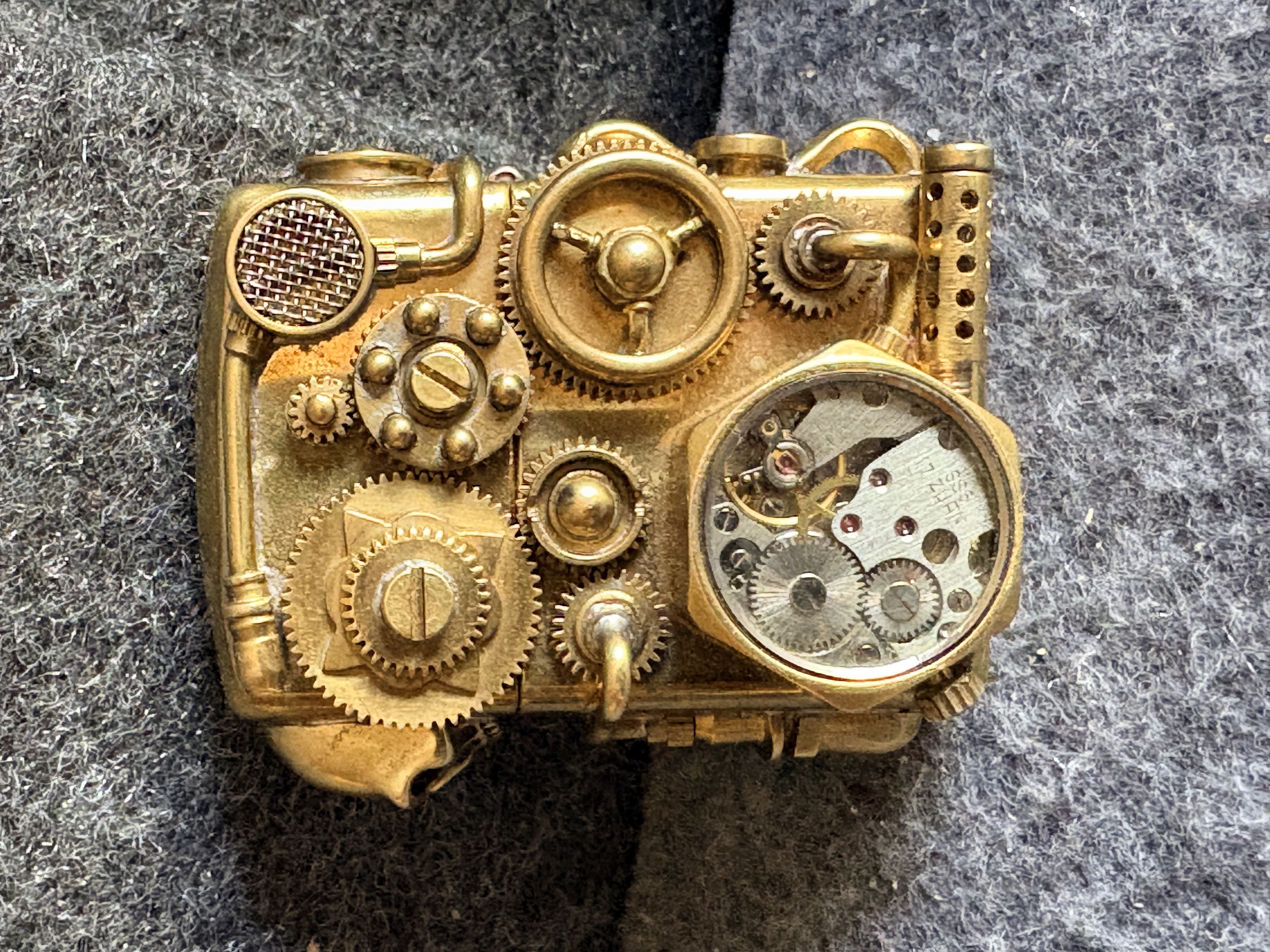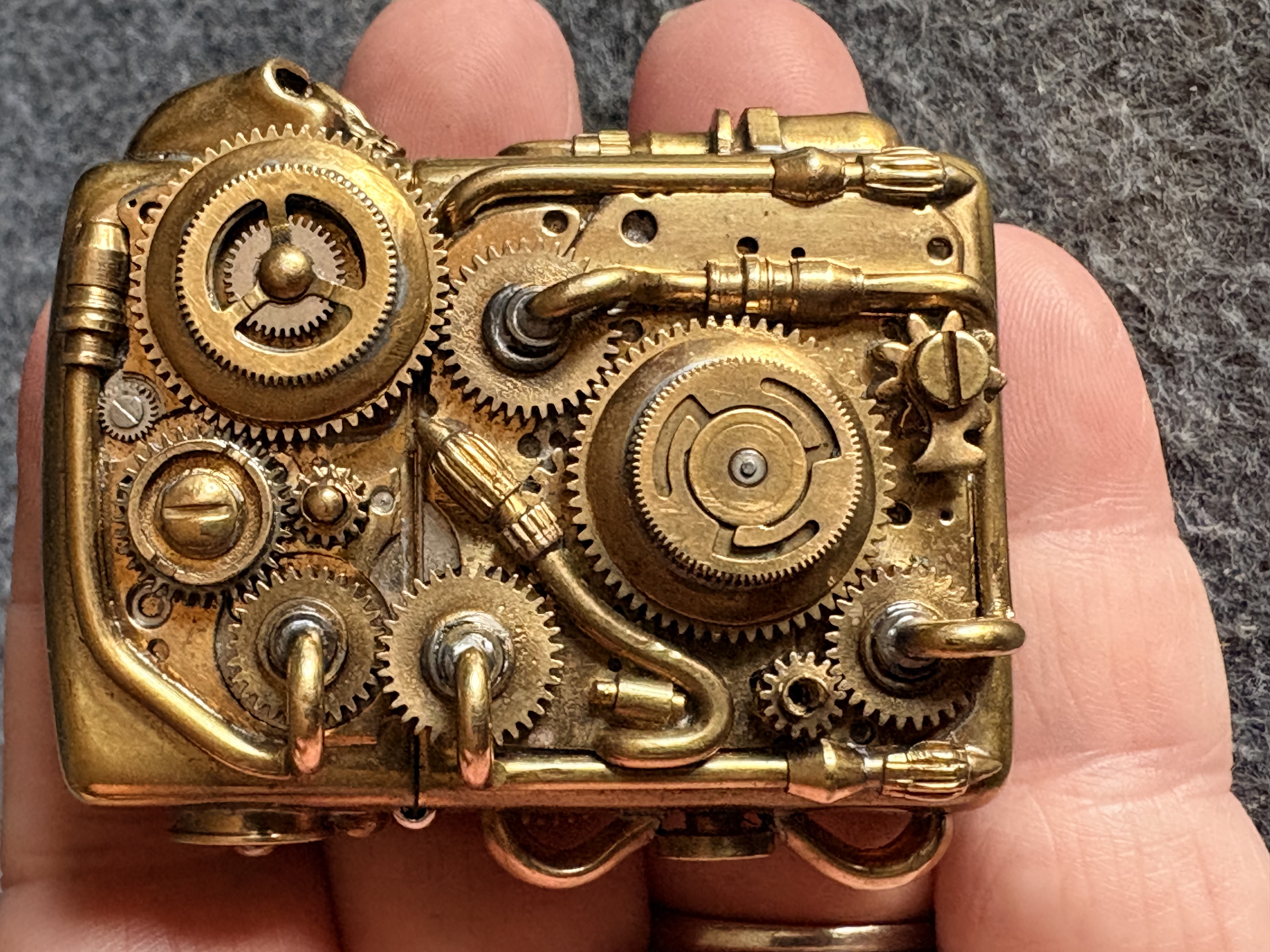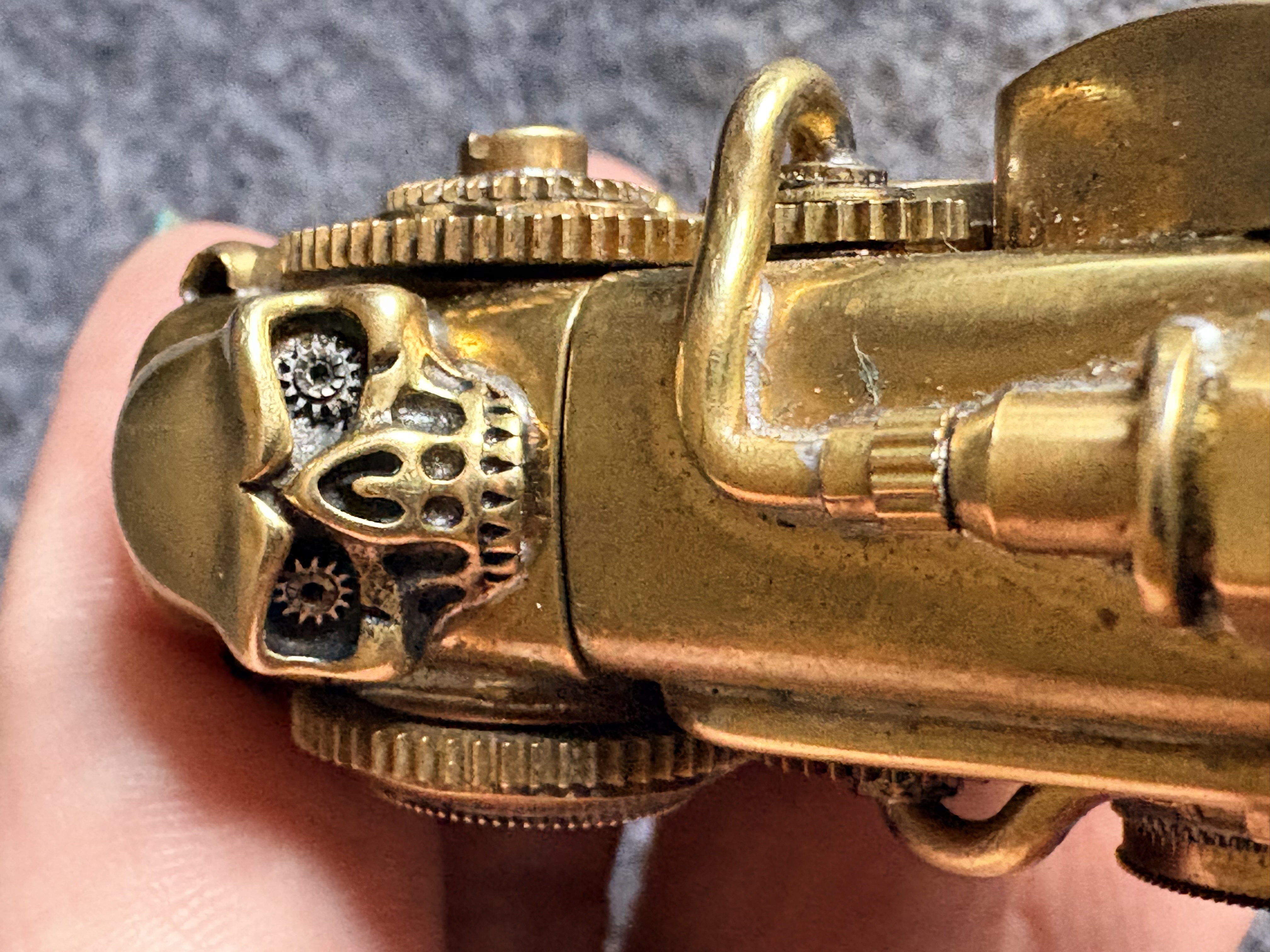 Experience the intricate mechanics and captivating design of this handmade steampunk lighter. This isn’t just a lighter; it’s a kinetic sculpture, a testament to steampunk ingenuity. This brass lighter features a striking skull head, intricate copper tubing, and a mesmerizing double-sided gear system that actually runs! The visible gears on both sides create a captivating display of mechanical artistry.